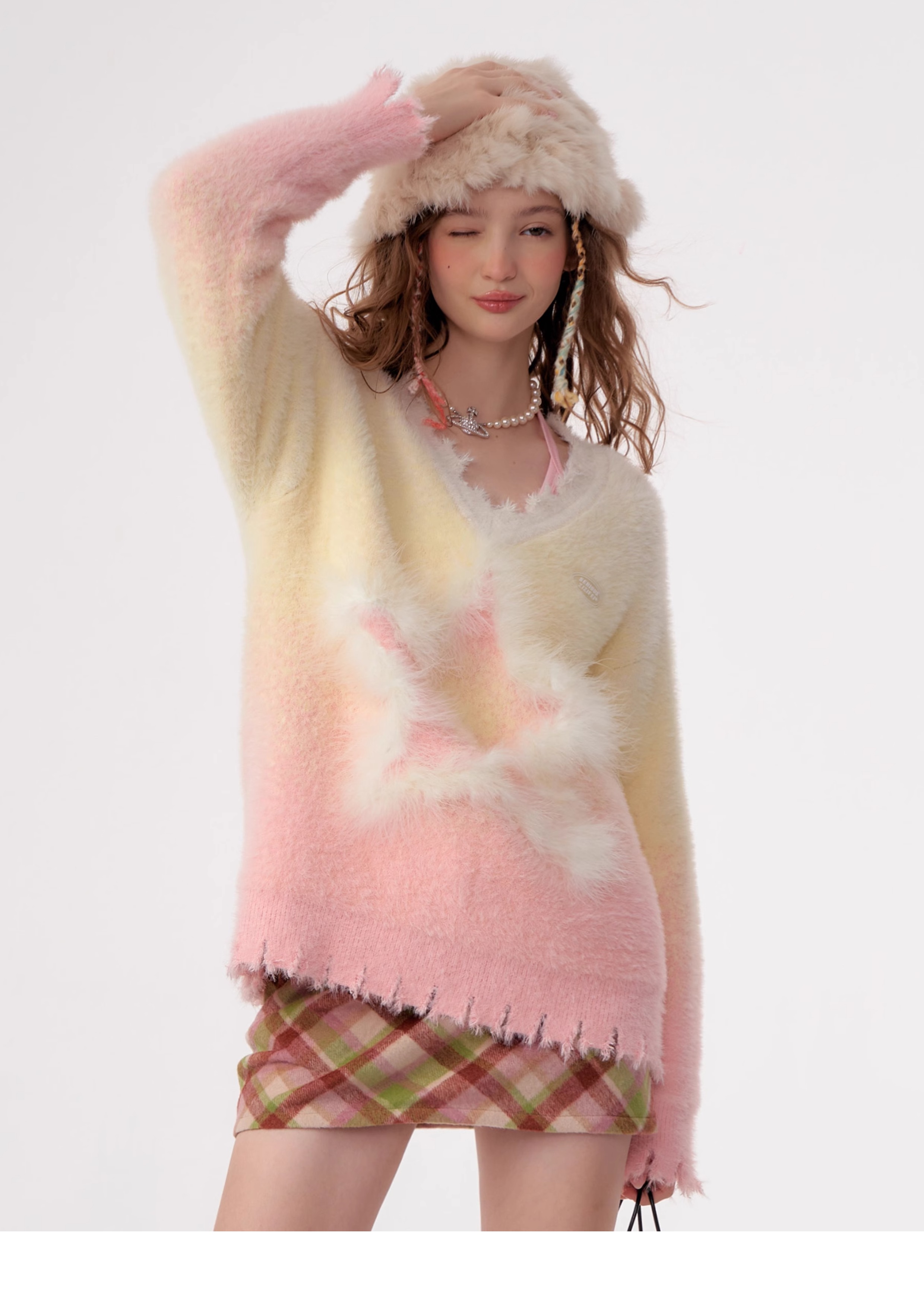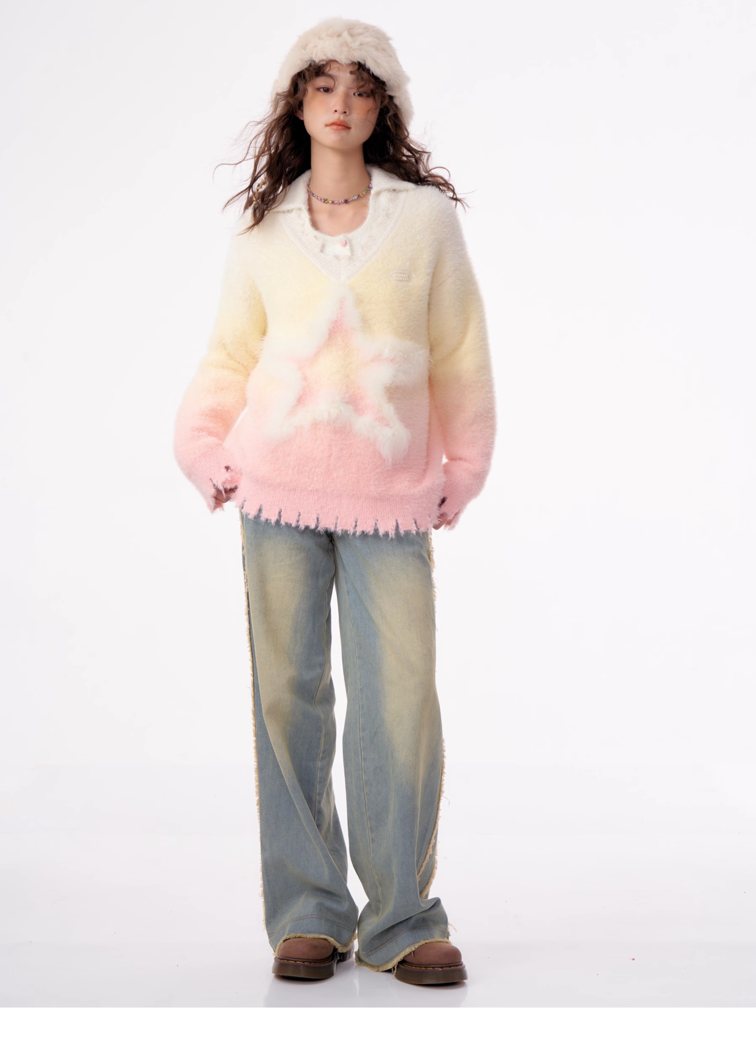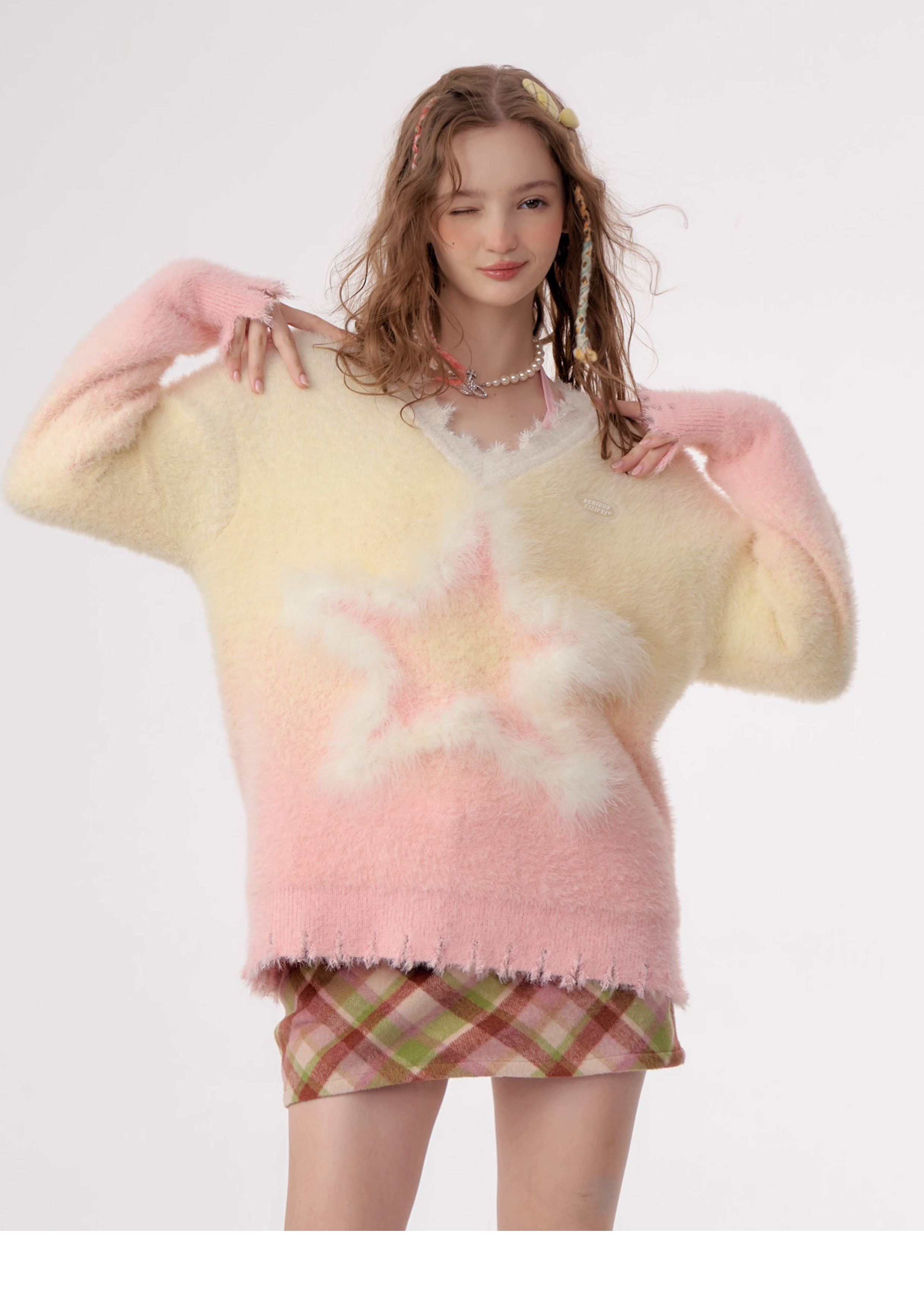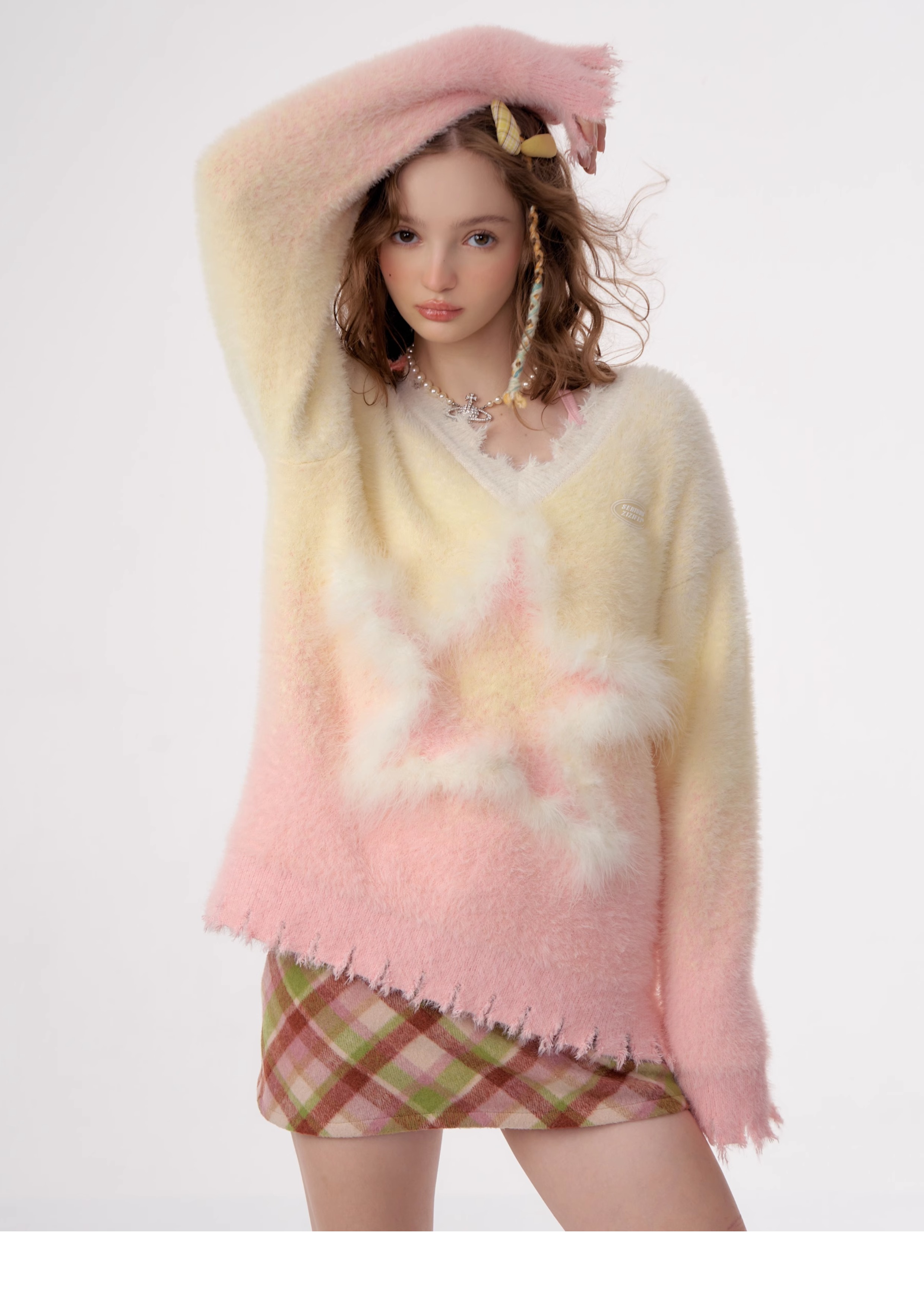 Automne/Hiver Essentiel | Pull à Col en V en Mohair à Motif Étoile Dégradé