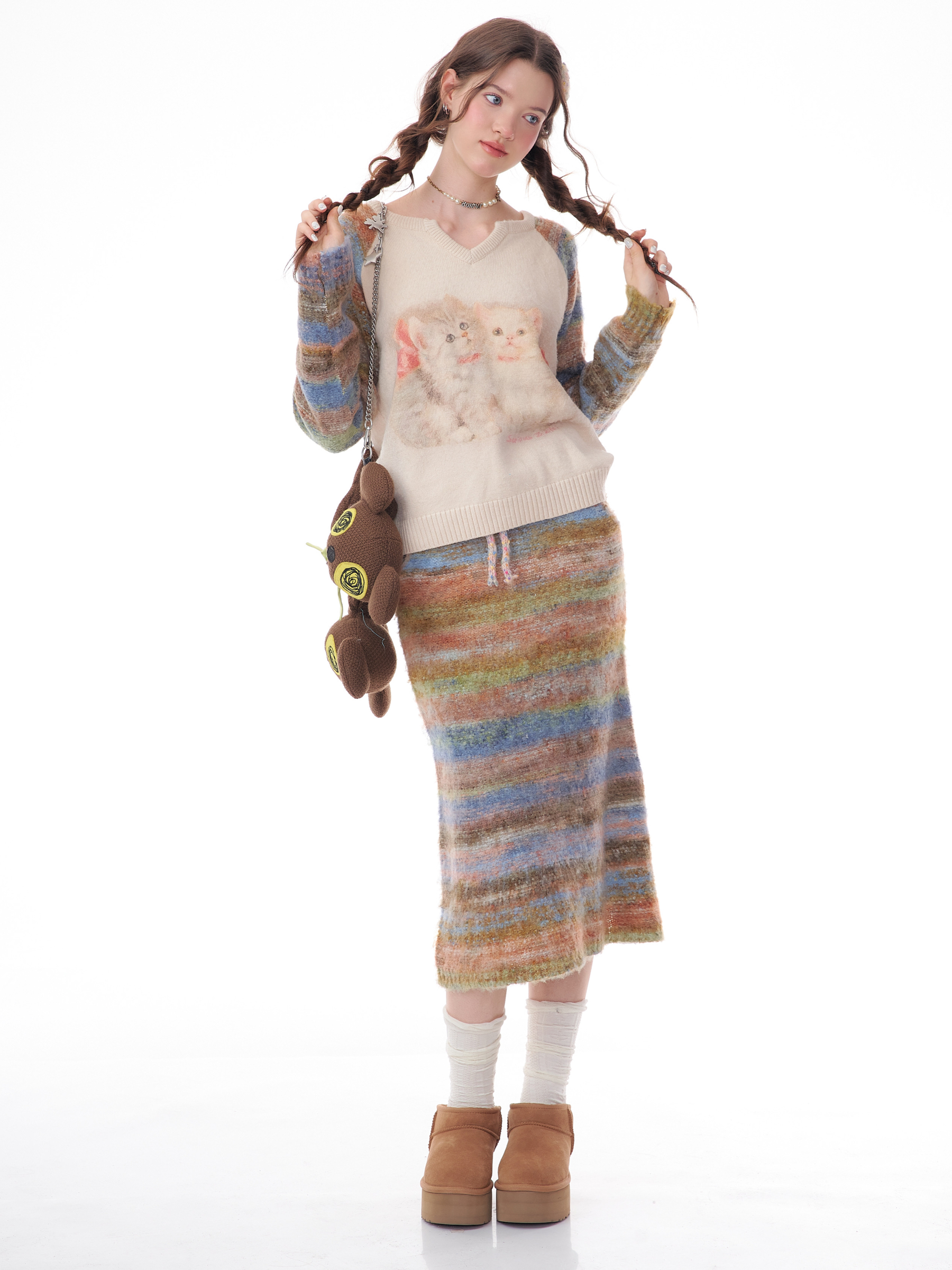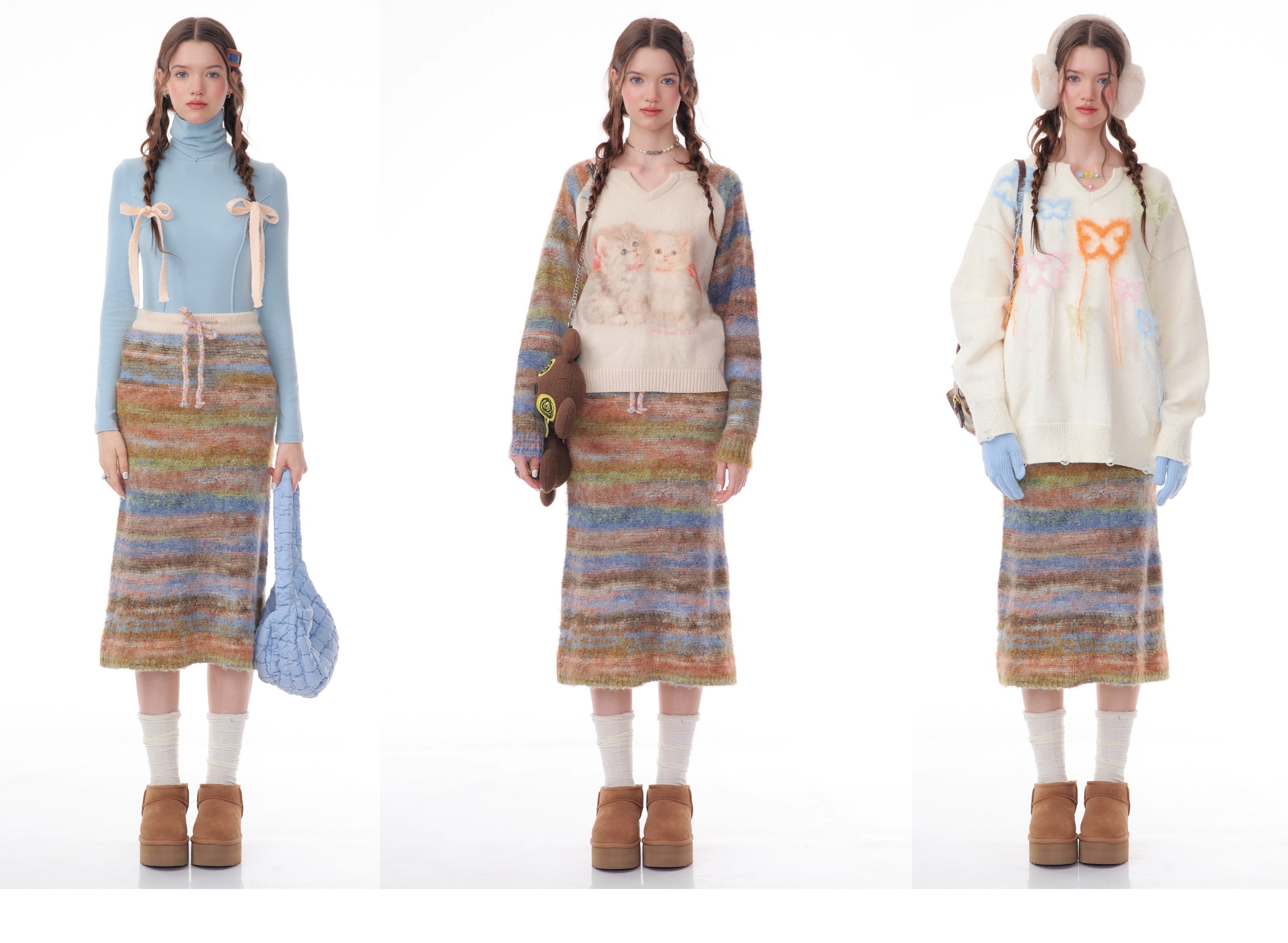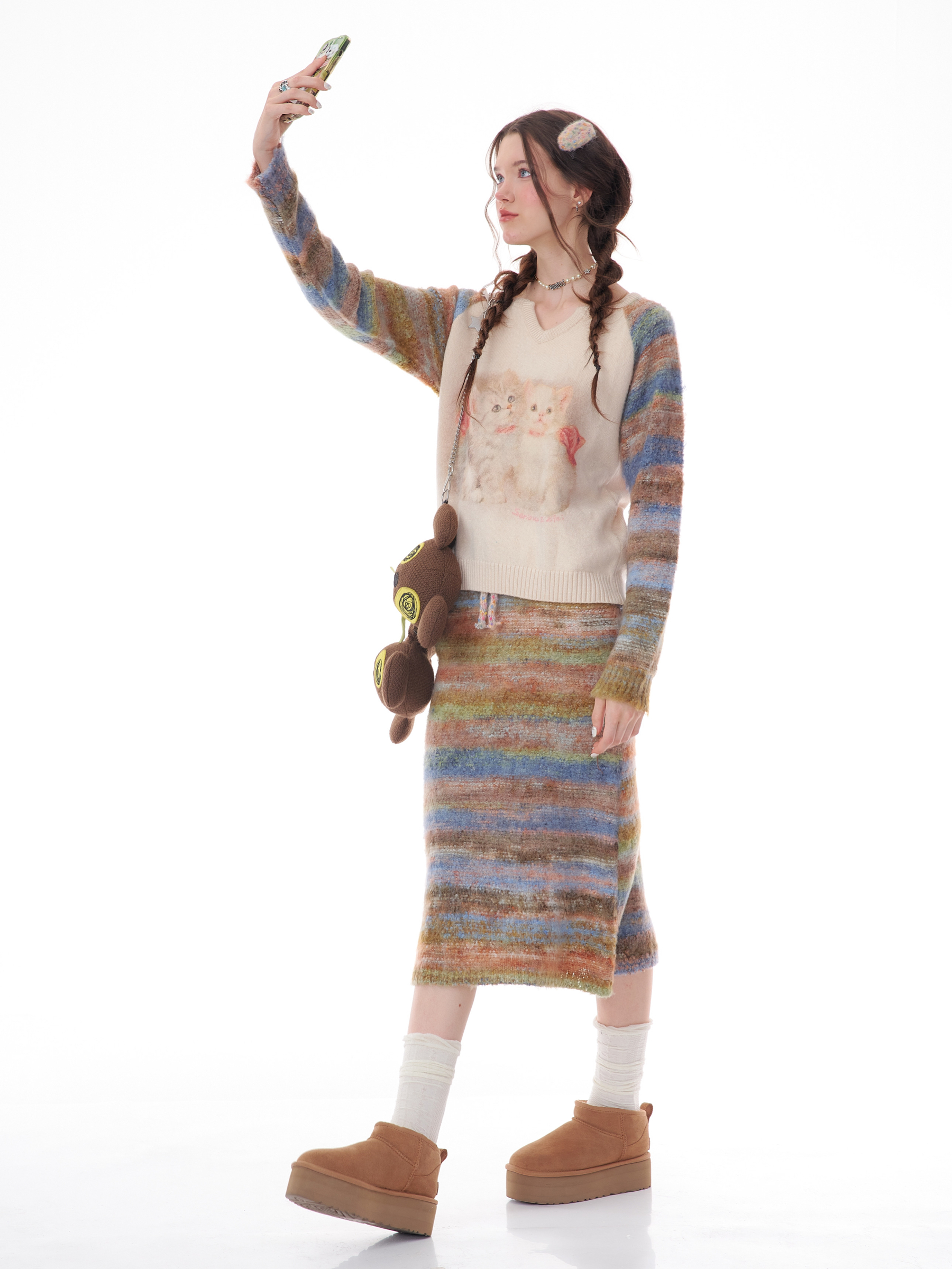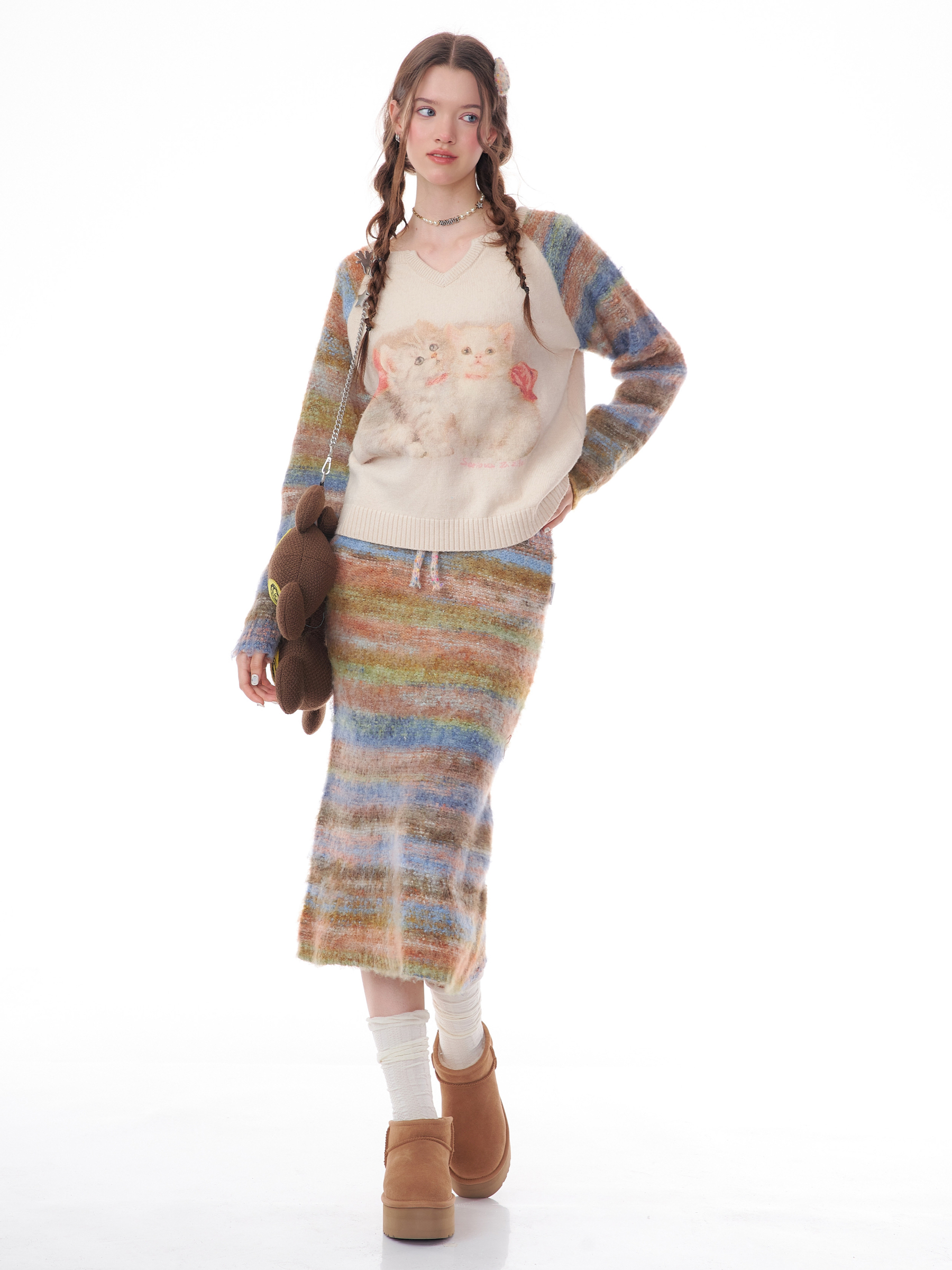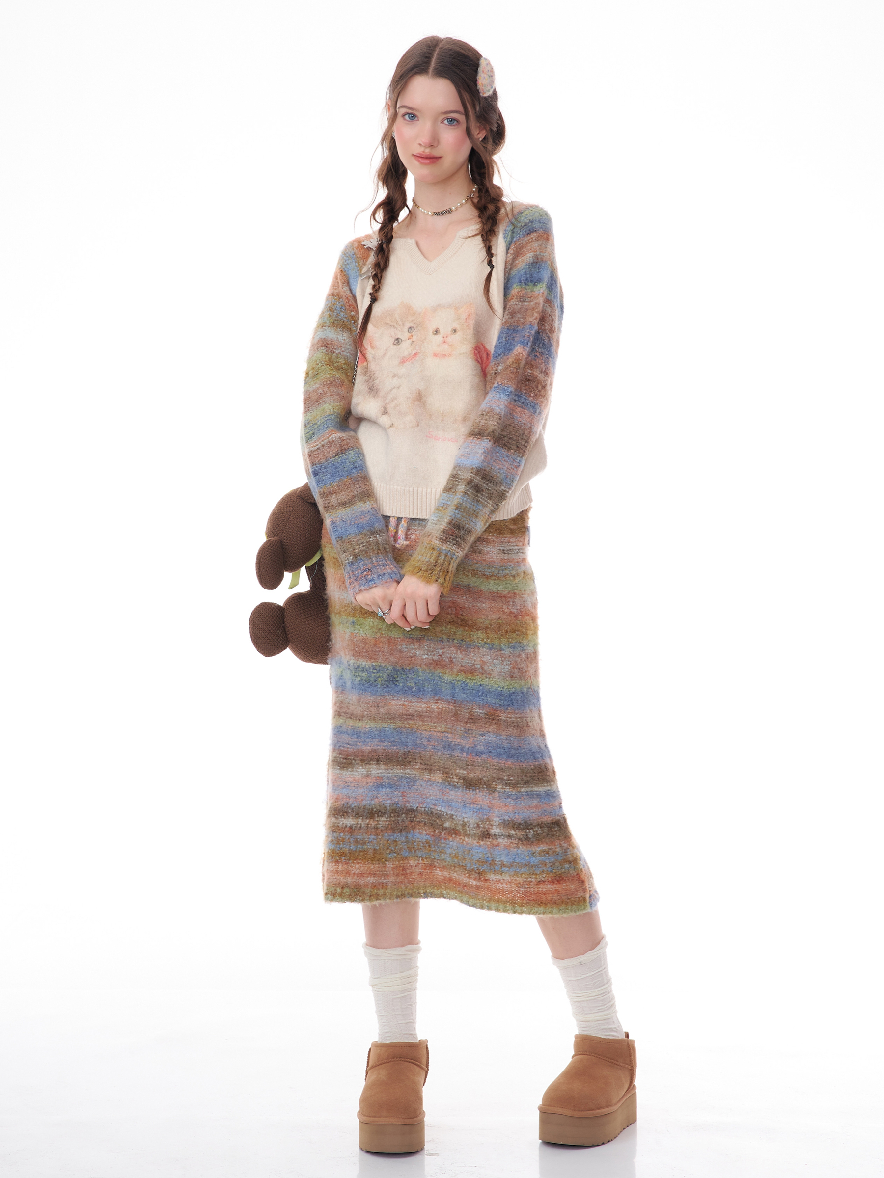 Jupe demi-queue de poisson tricotée à rayures rétro | Coupe ajustée, taille haute, pour l'automne/hiver