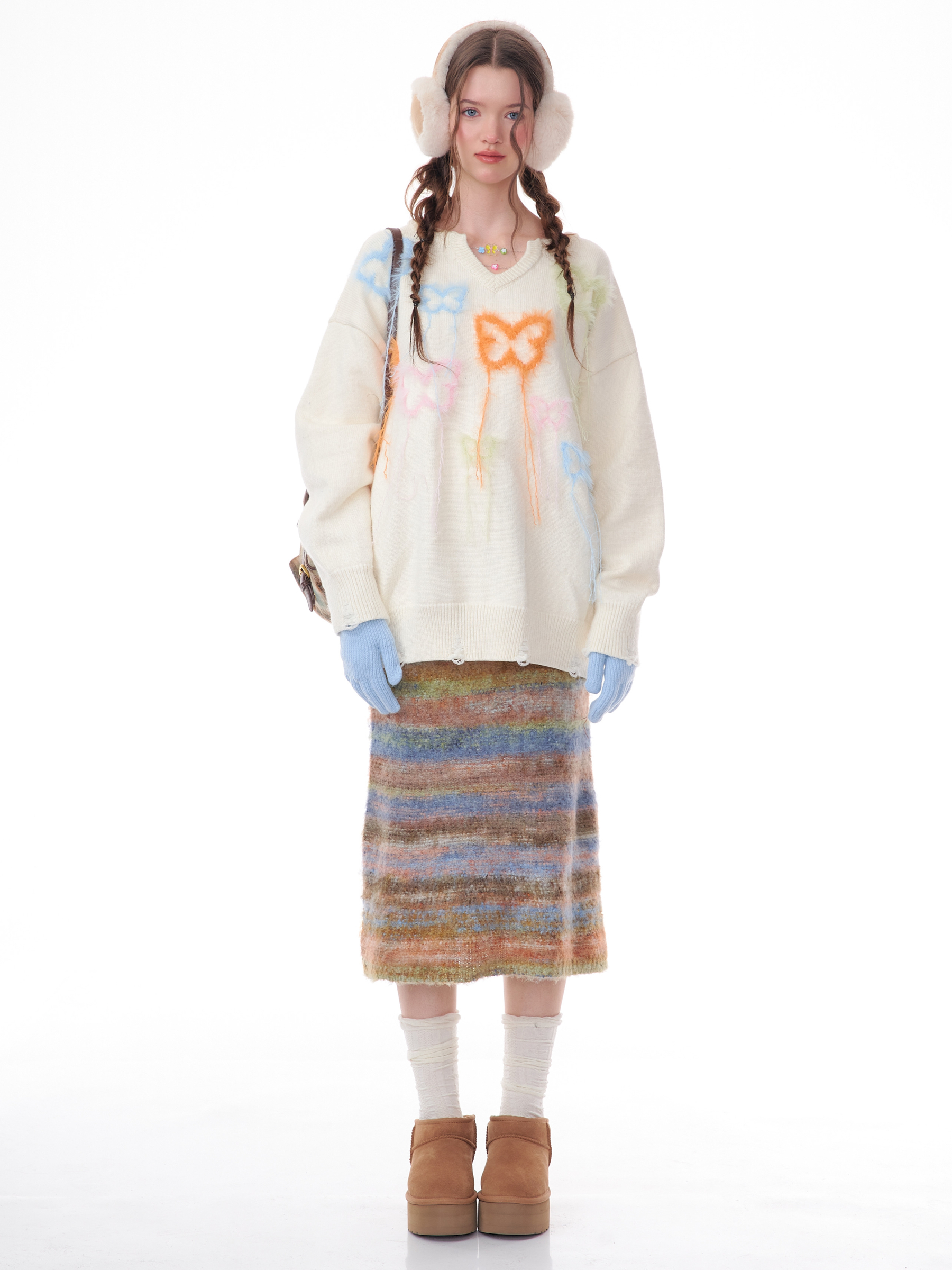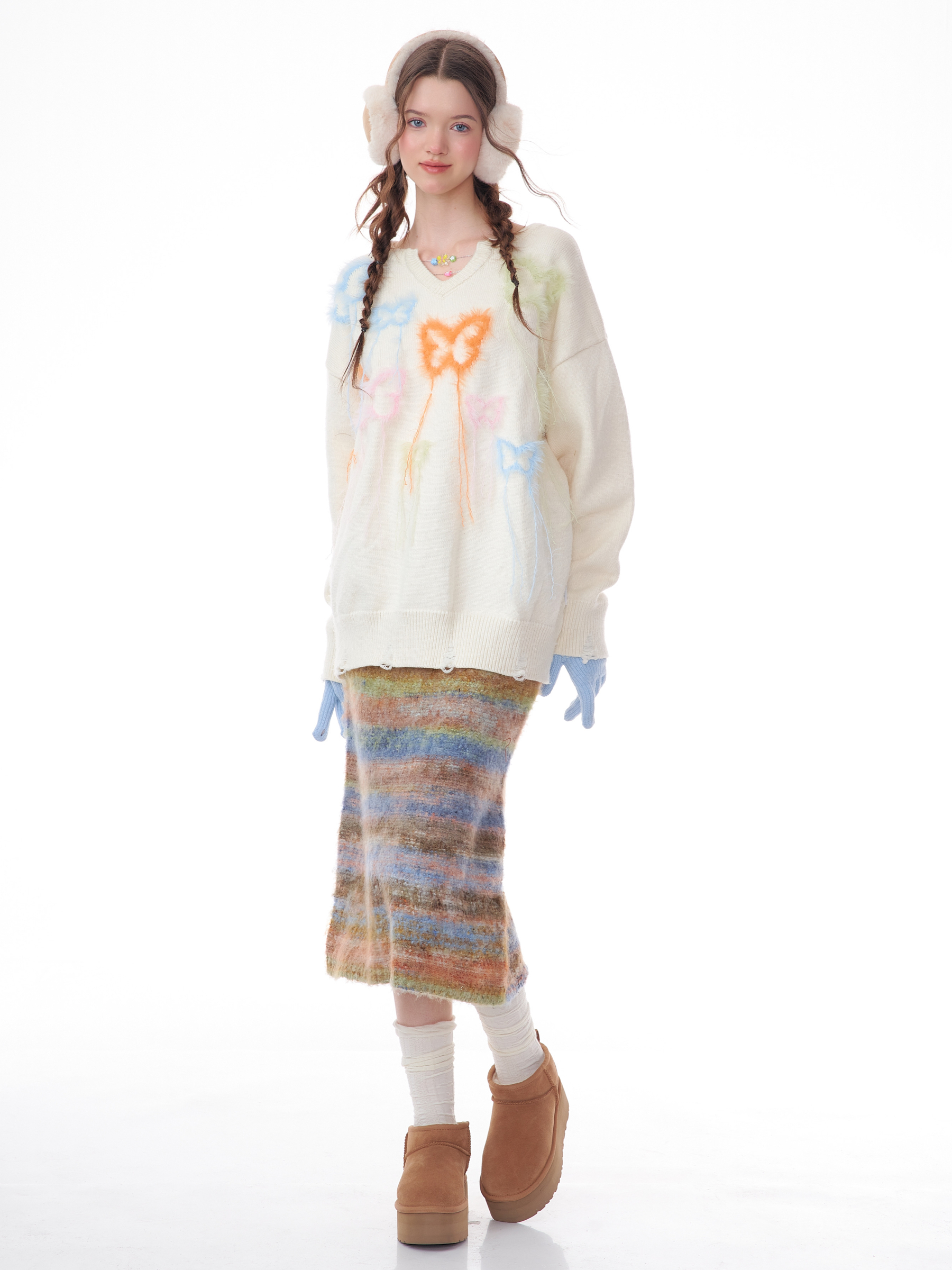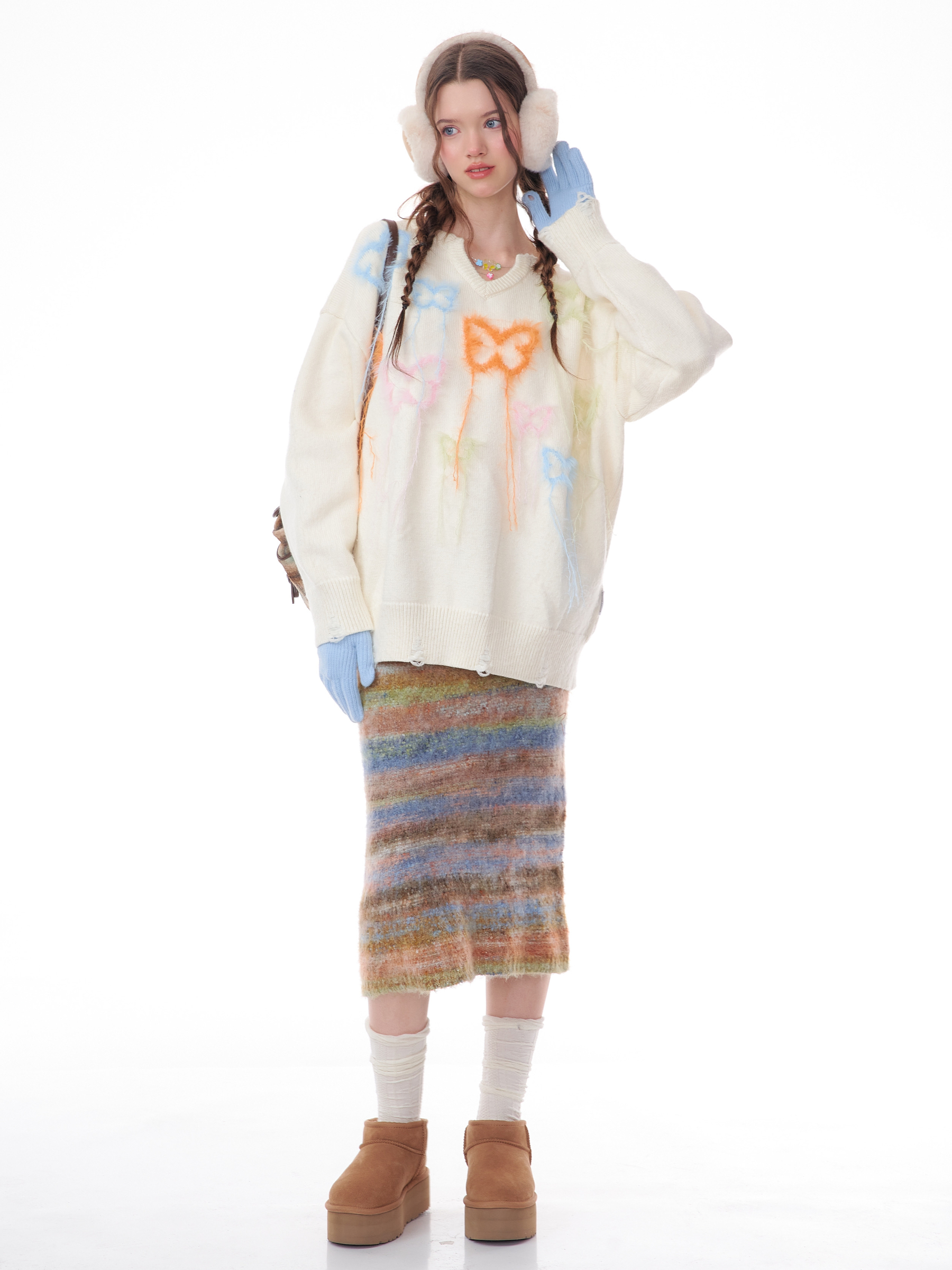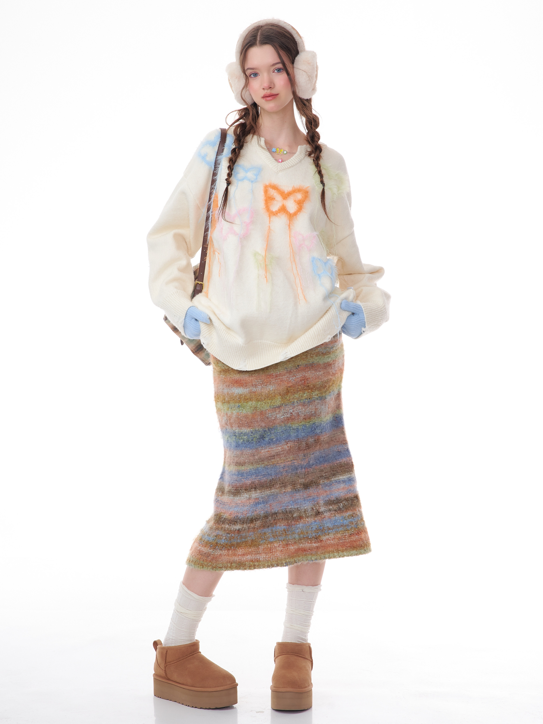 Jupe demi-queue de poisson tricotée à rayures rétro | Coupe ajustée, taille haute, pour l'automne/hiver
