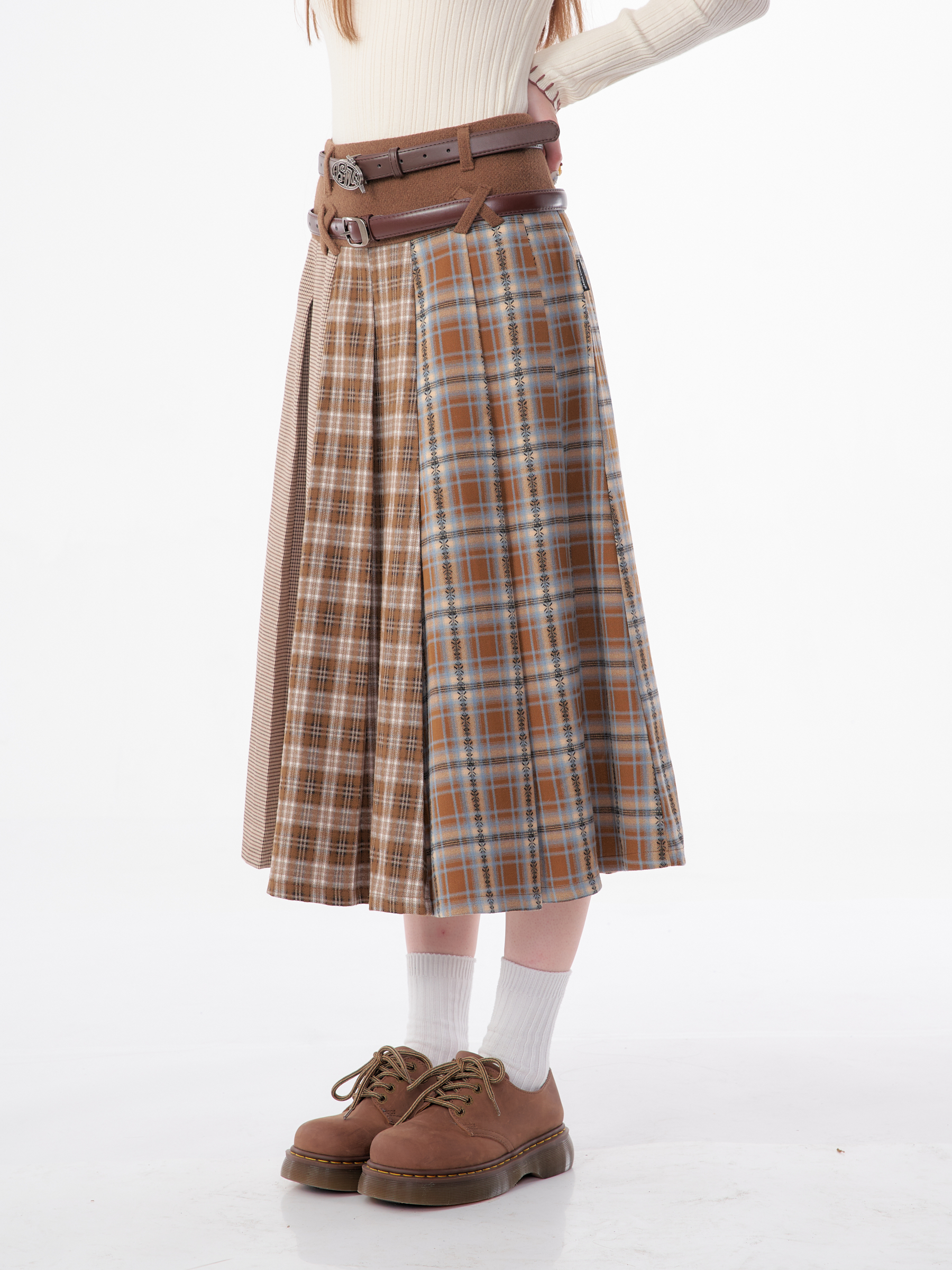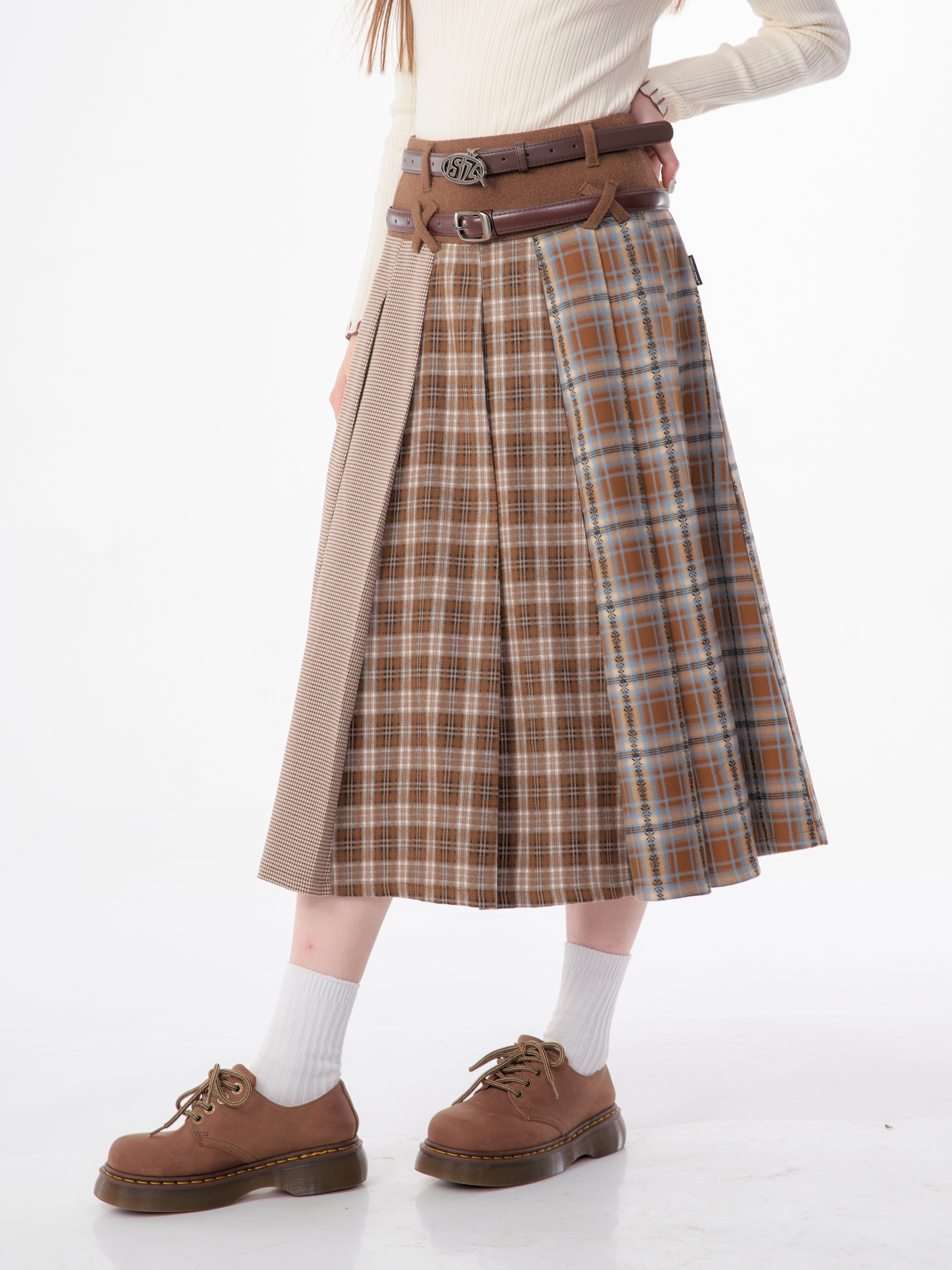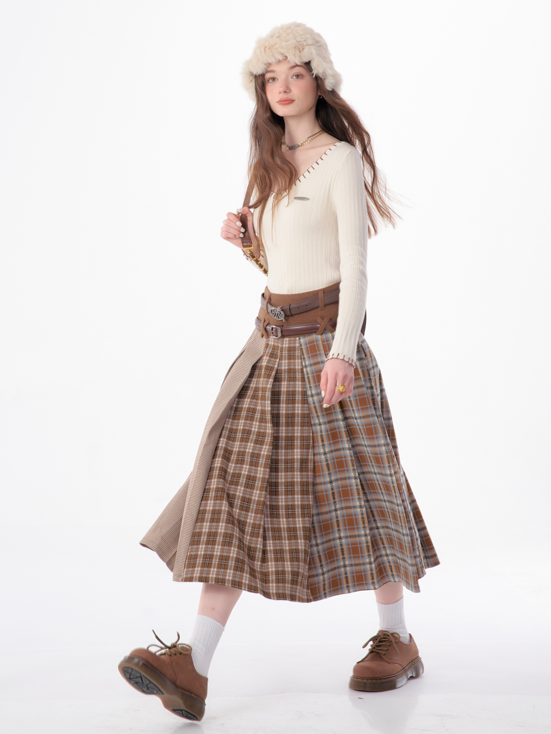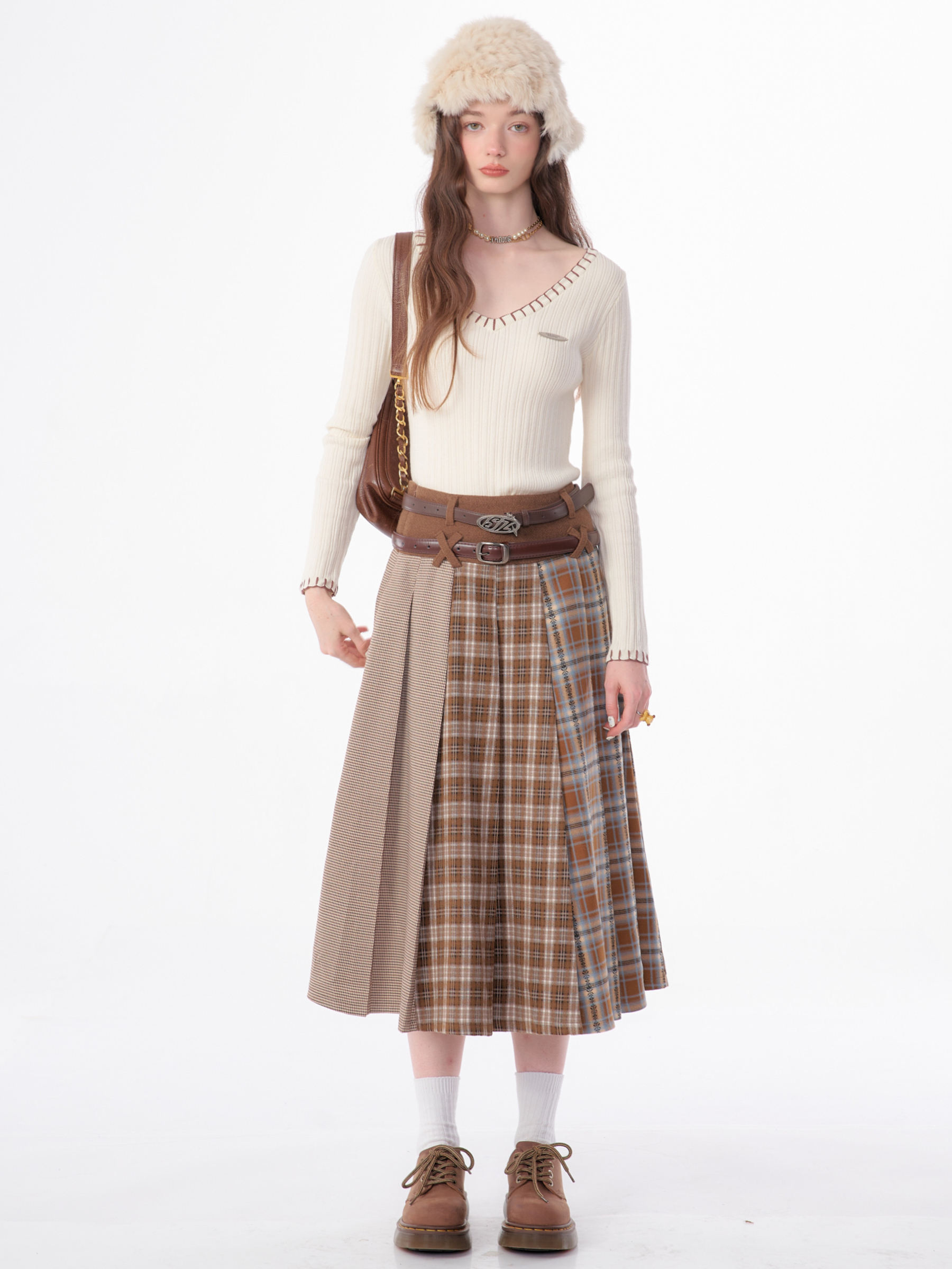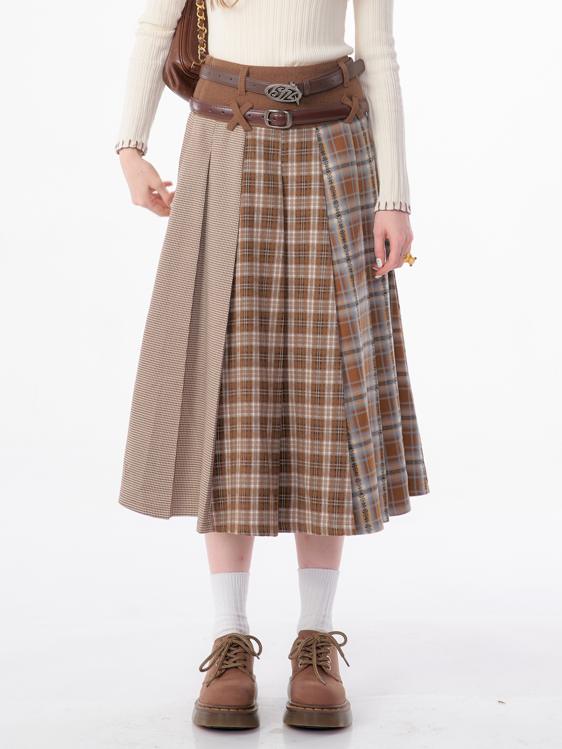 Jupe plissée en laine à carreaux | Design rétro épissé pour l'automne/hiver