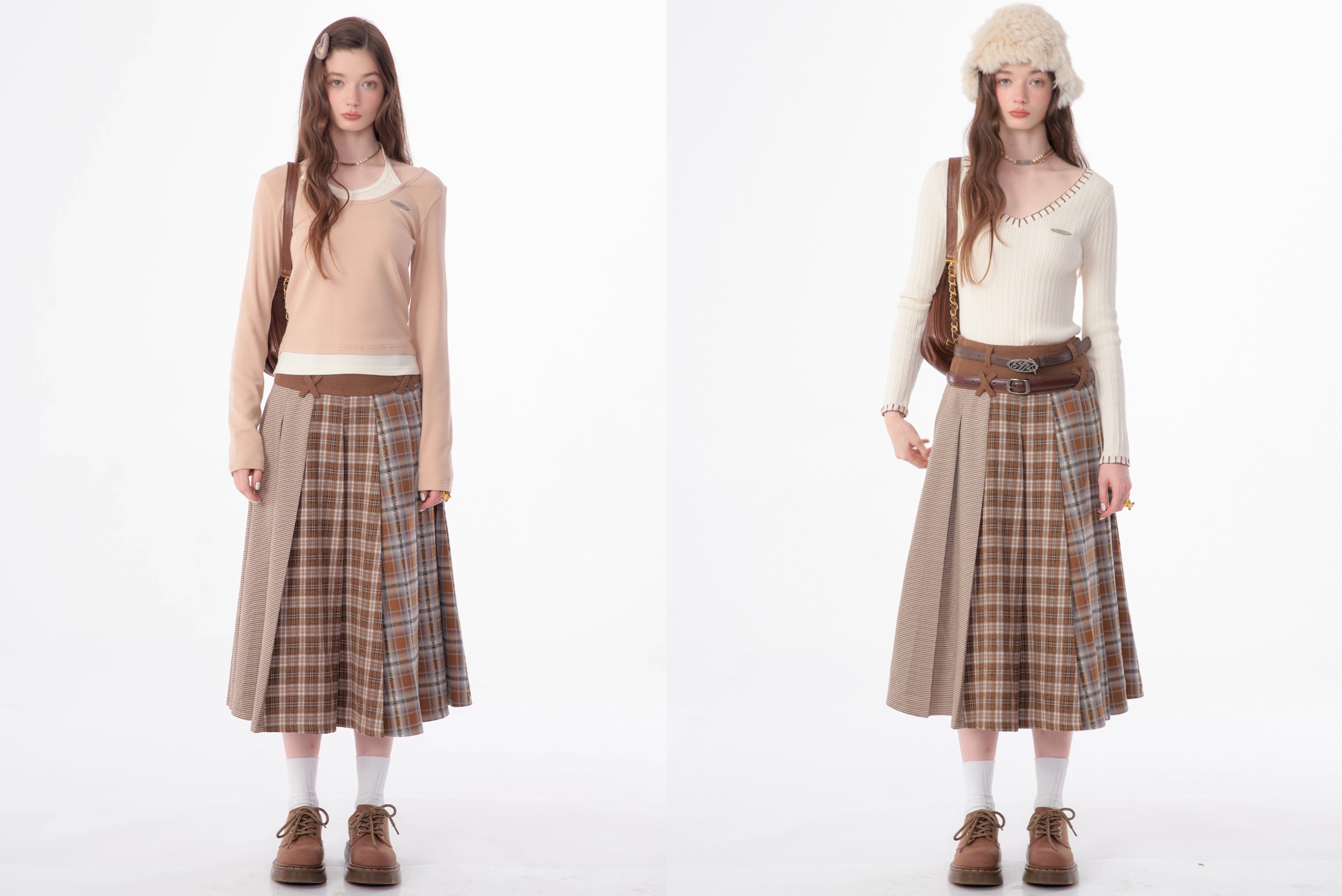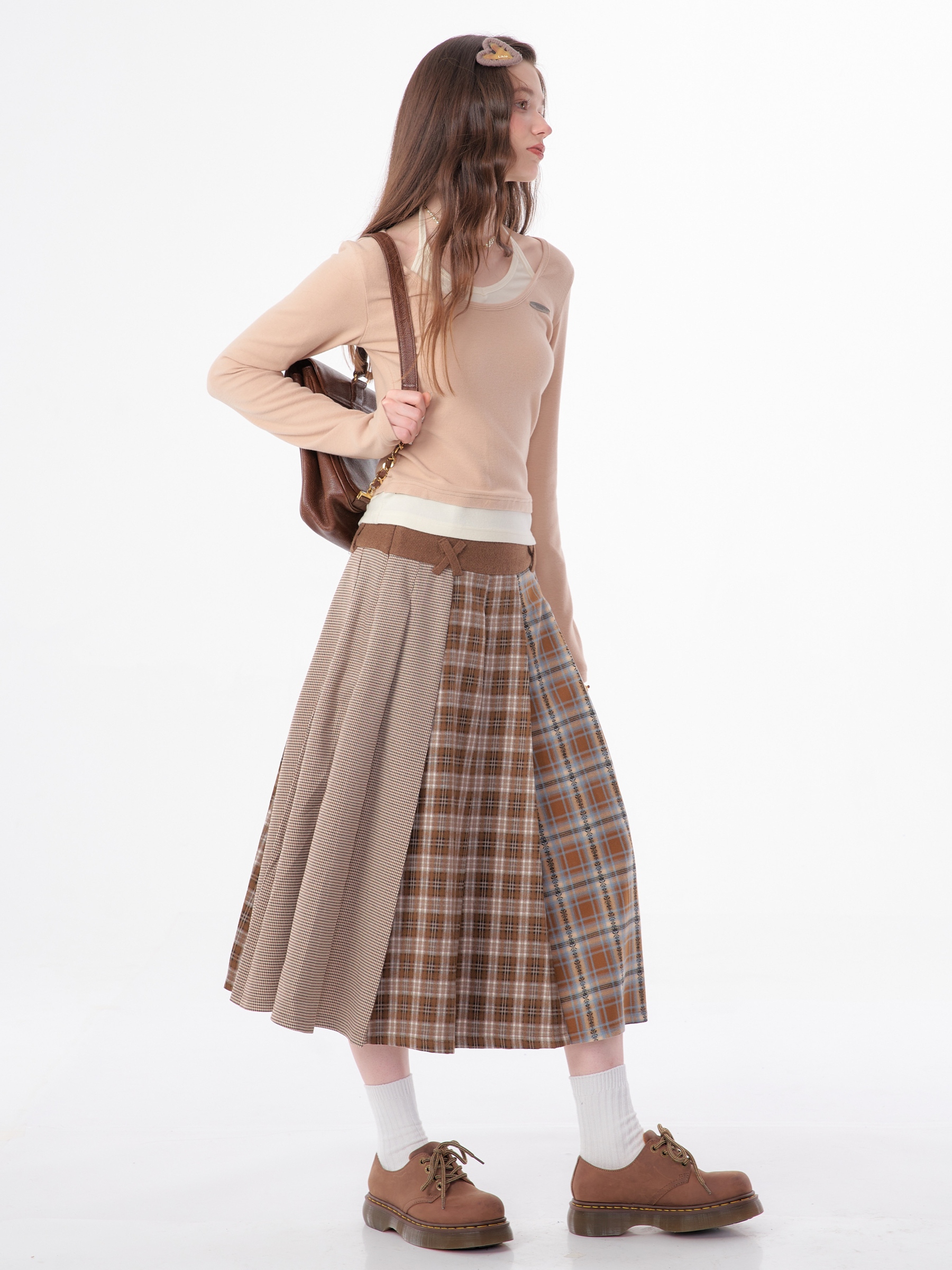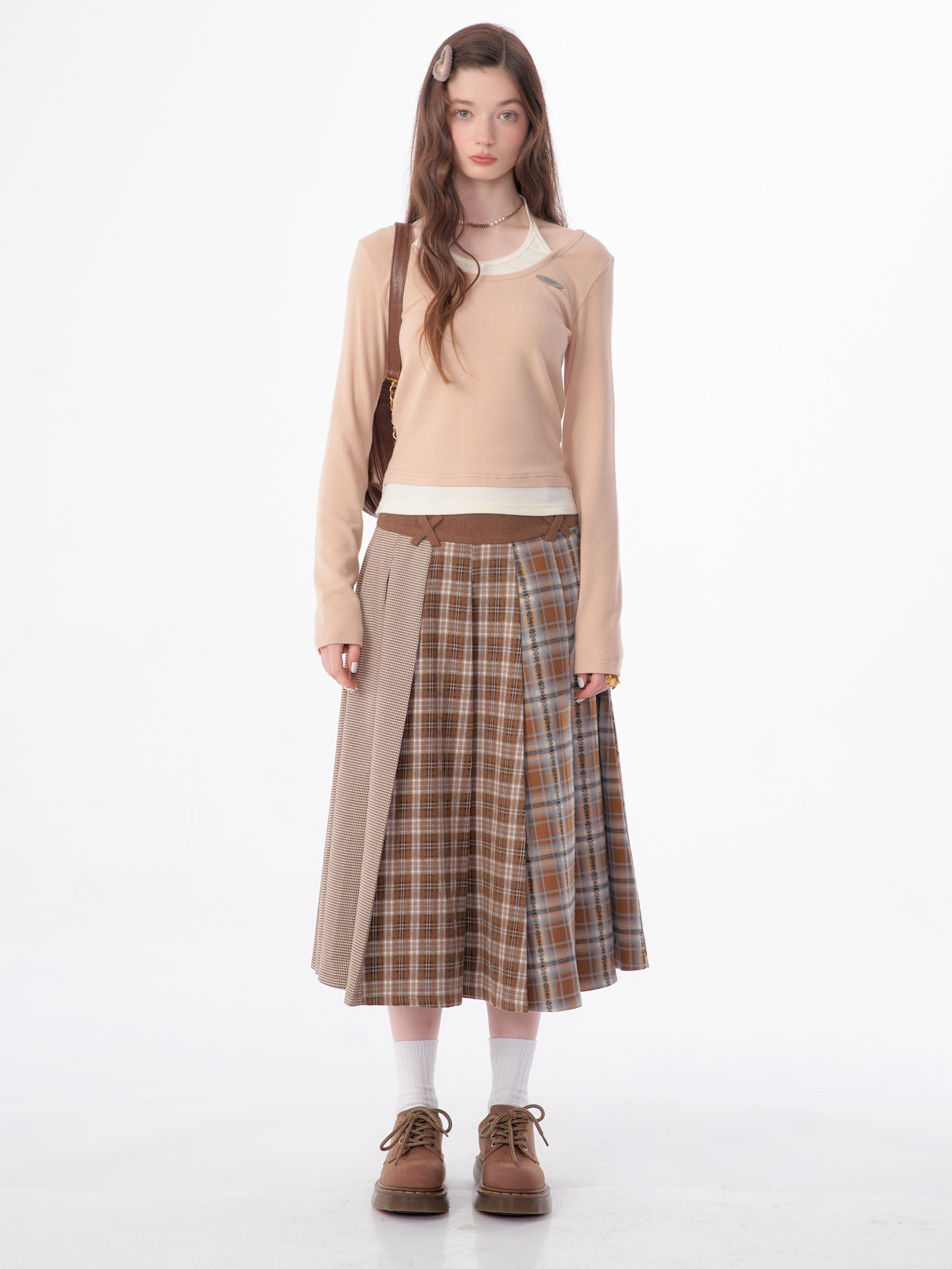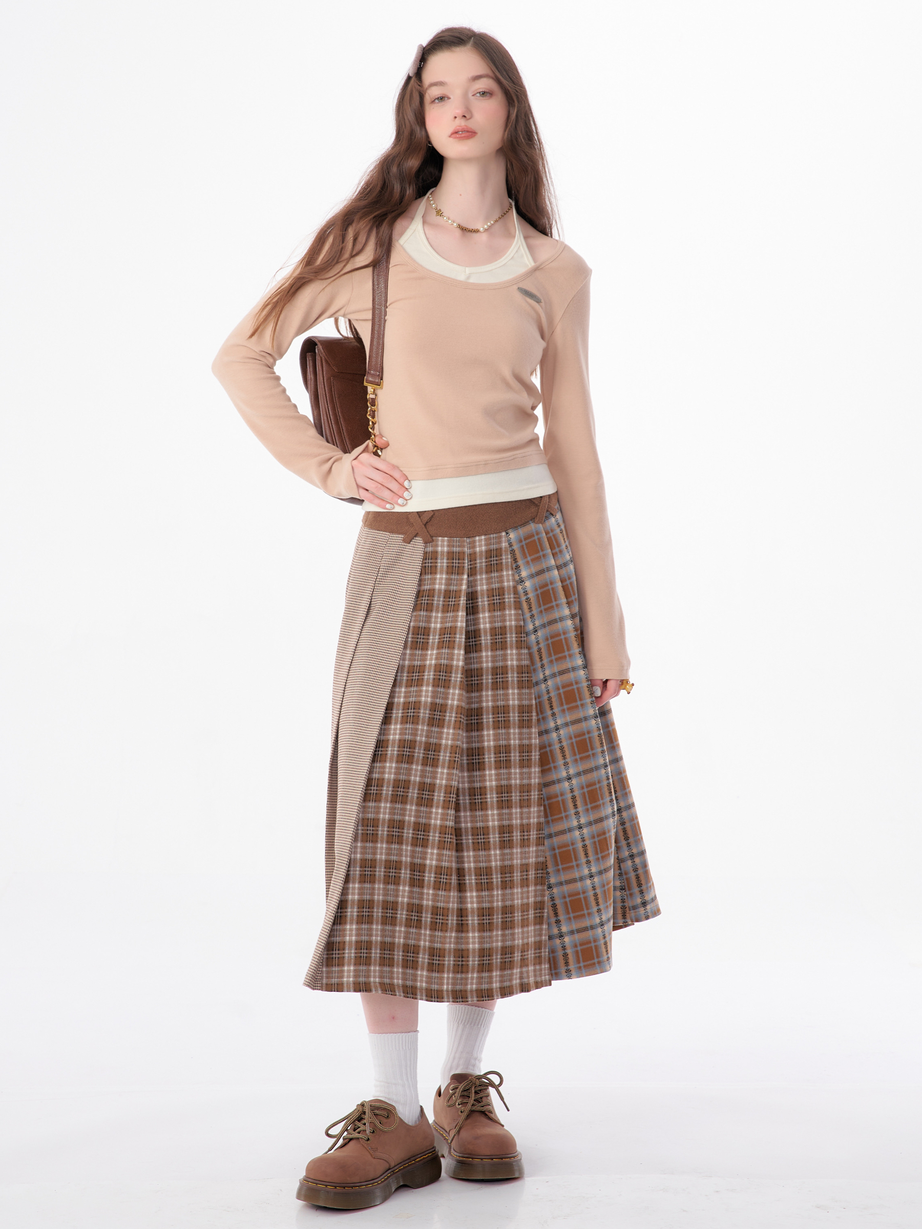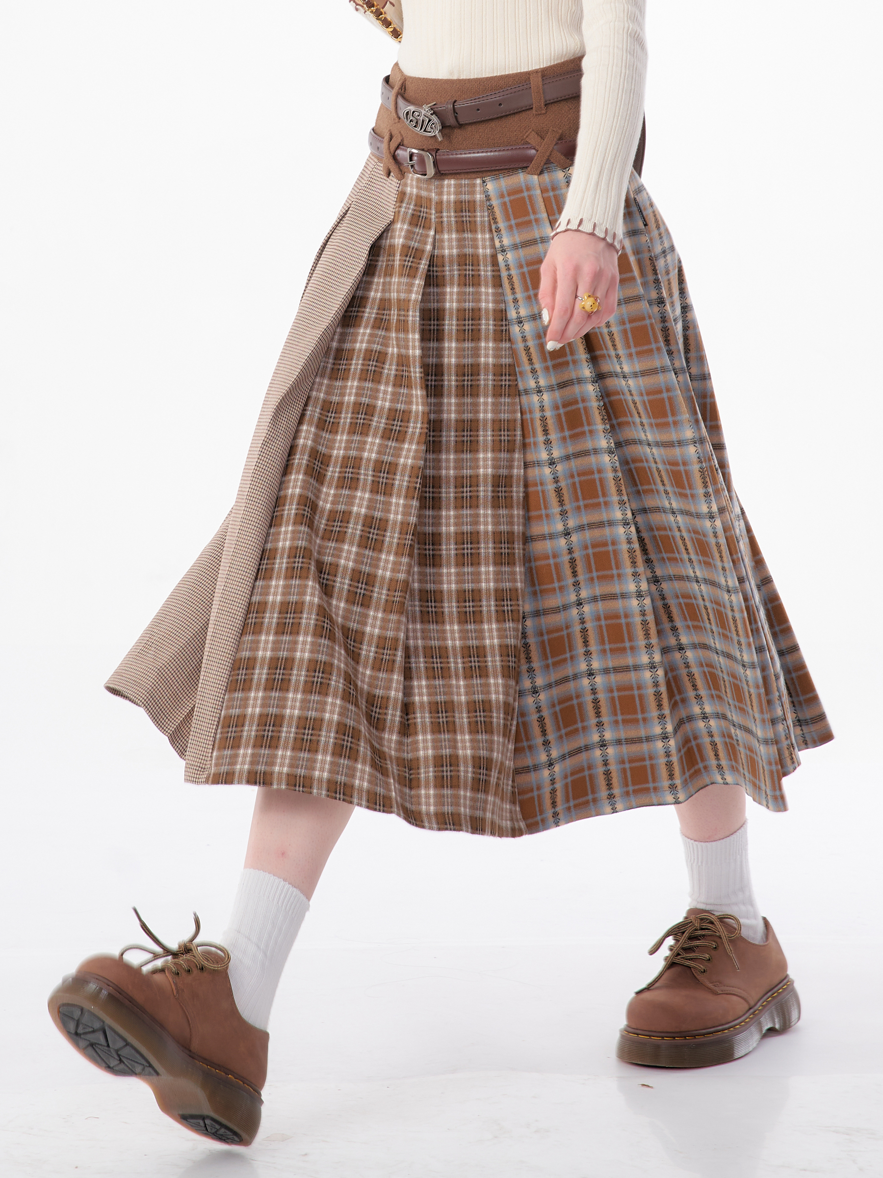 Jupe plissée en laine à carreaux | Design rétro épissé pour l'automne/hiver