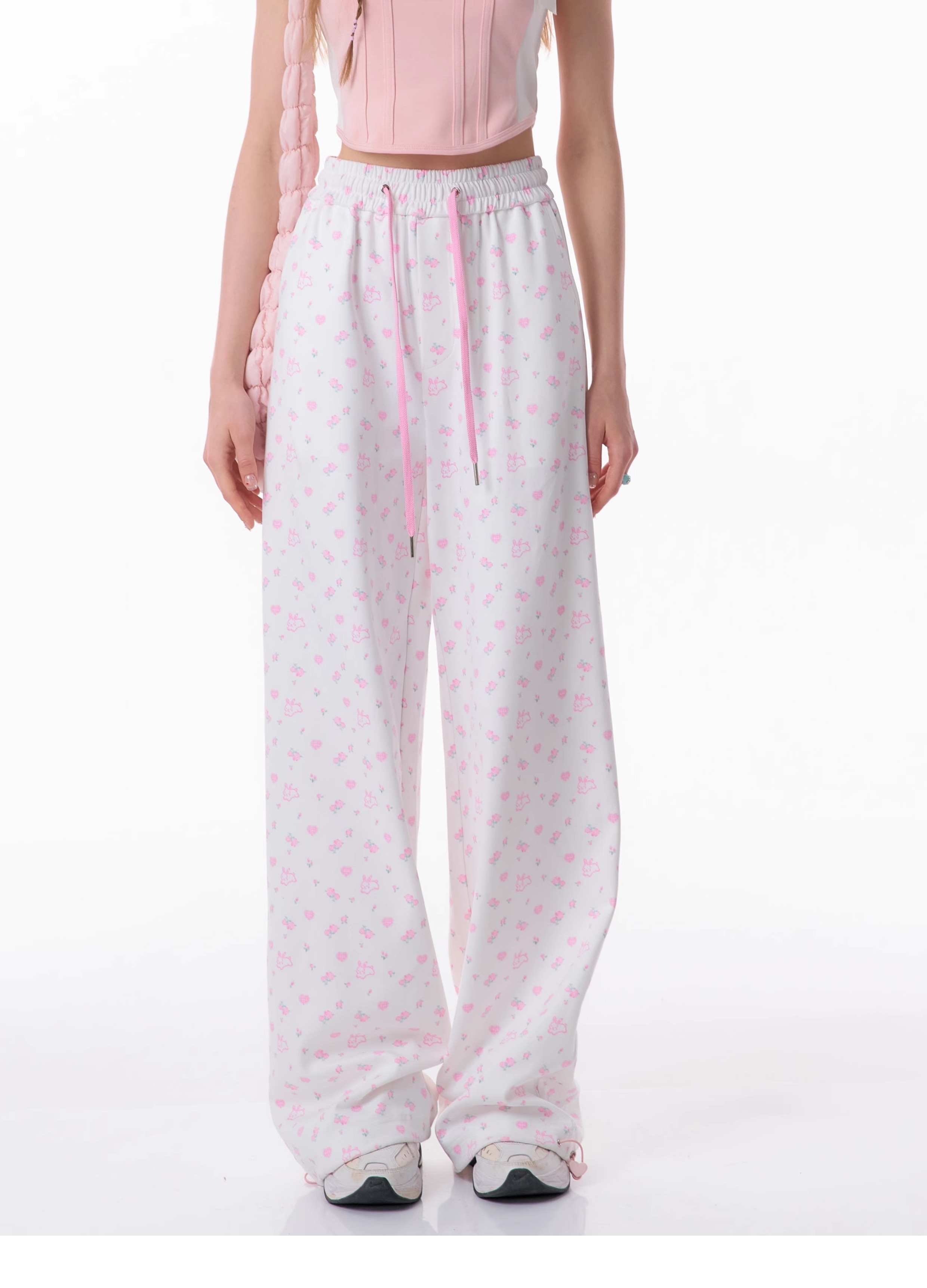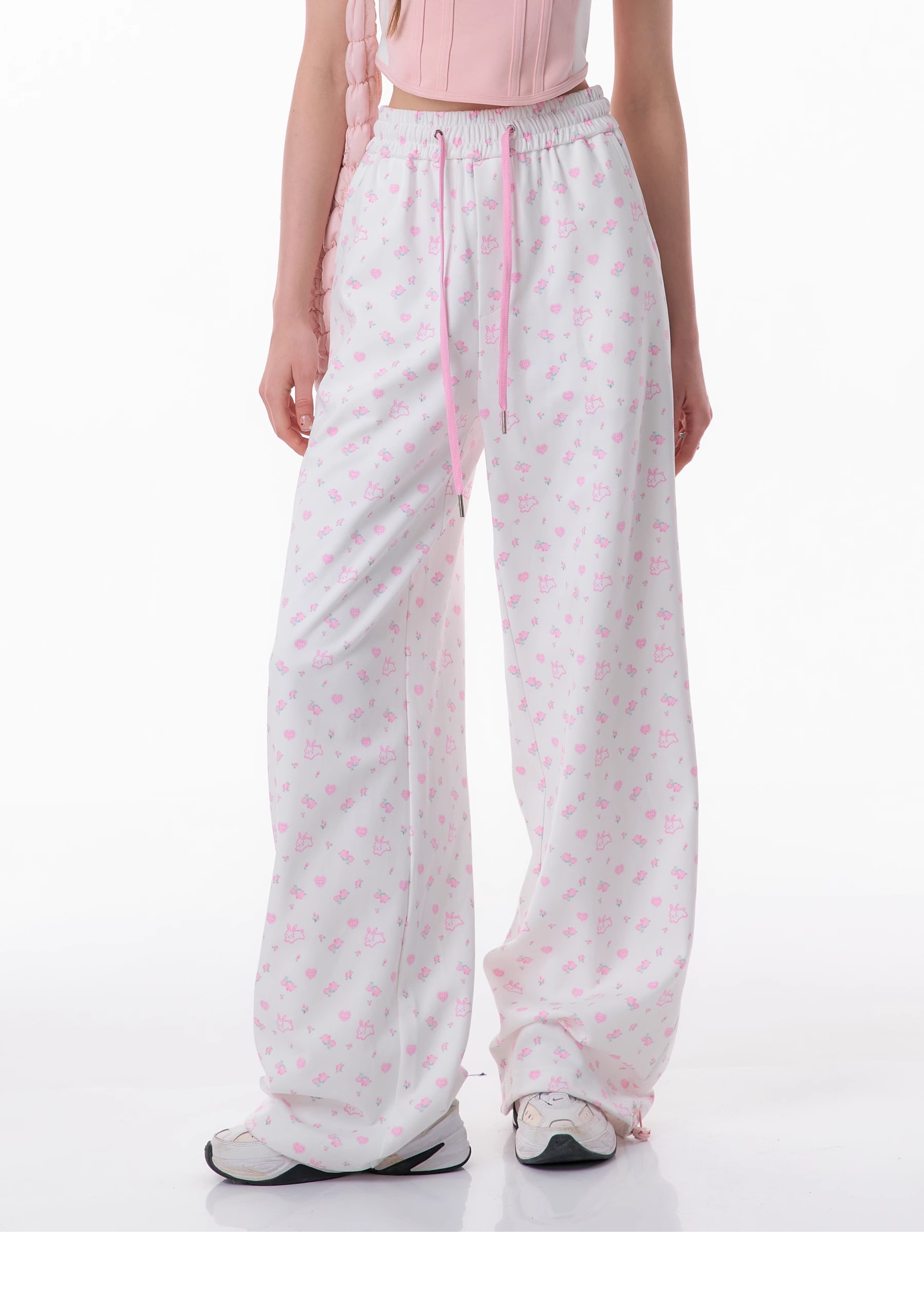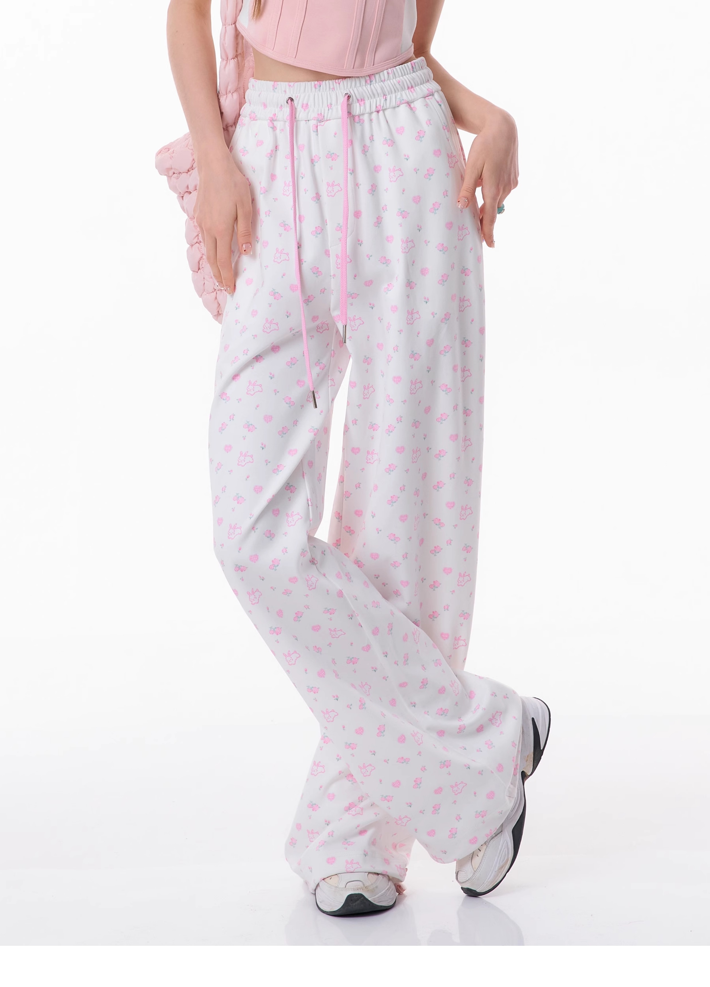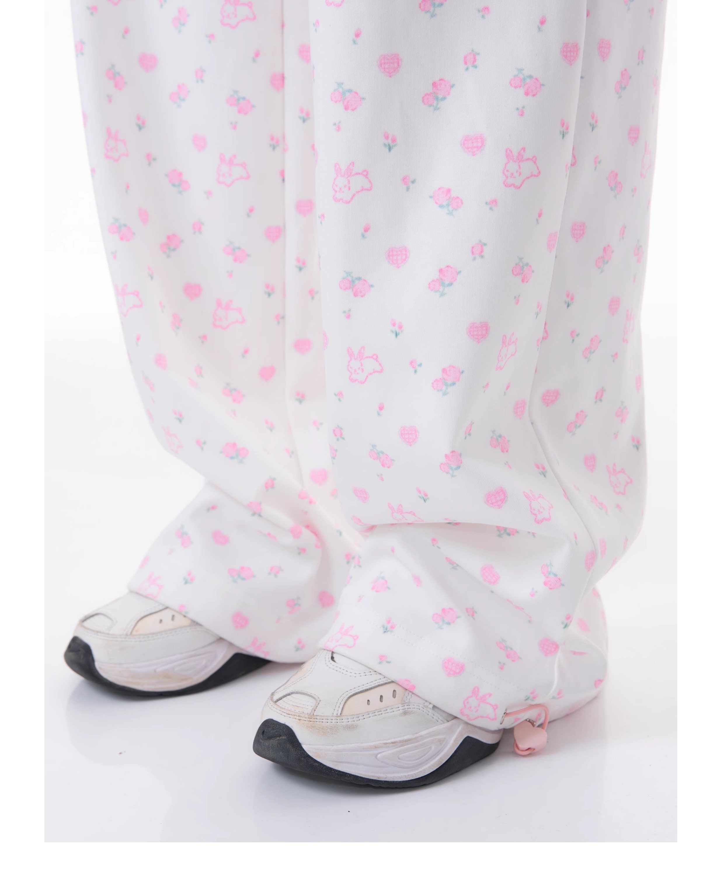 Pantalon à jambes larges imprimé lapin | Rétro taille haute, coupe ajustée, style décontracté