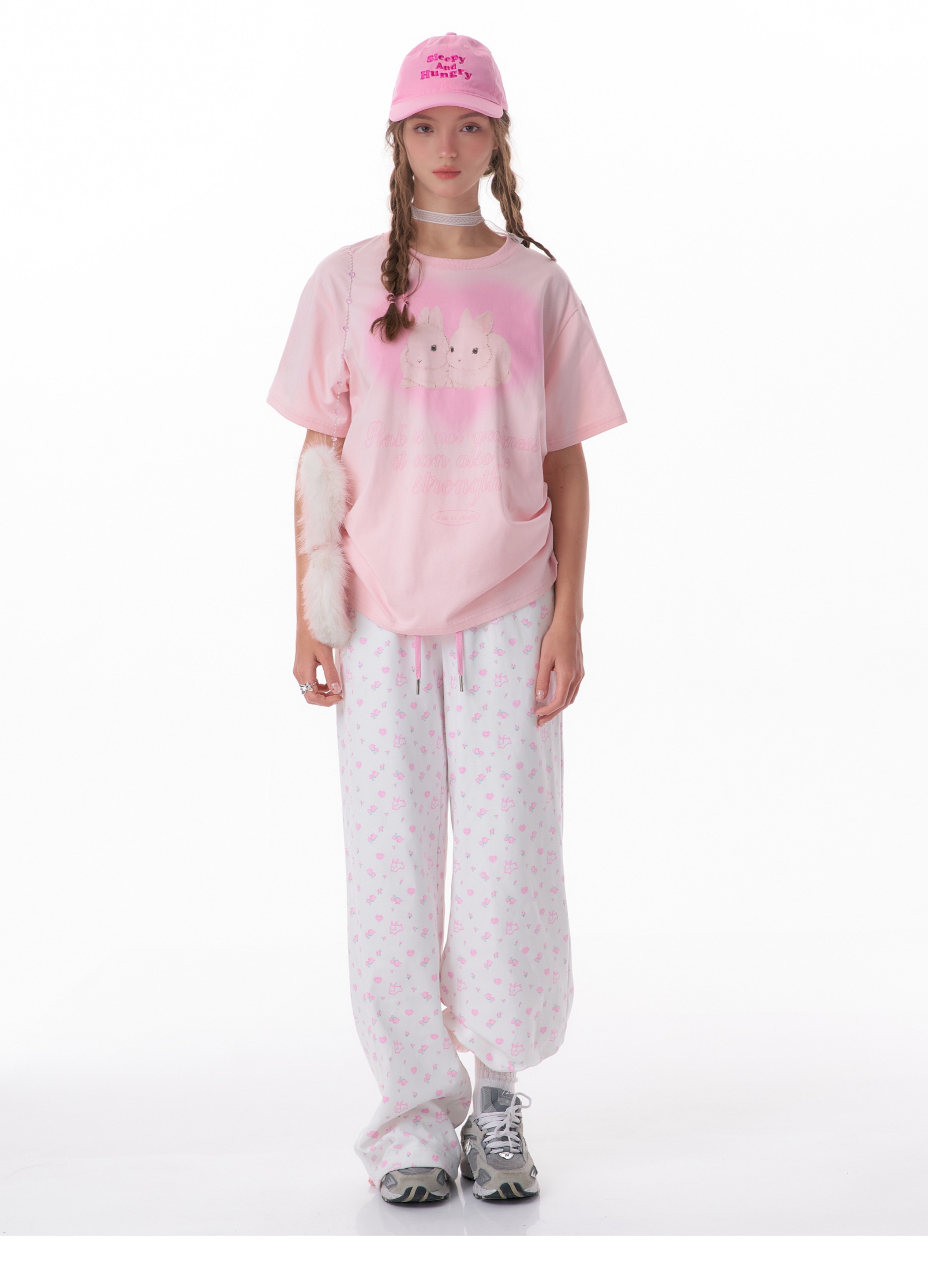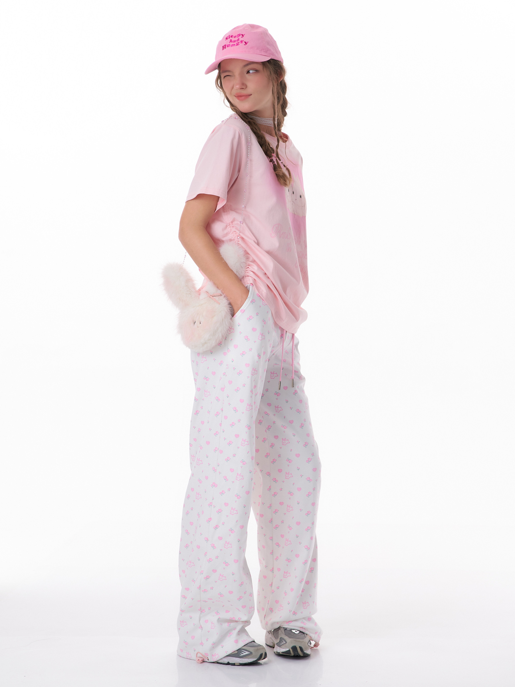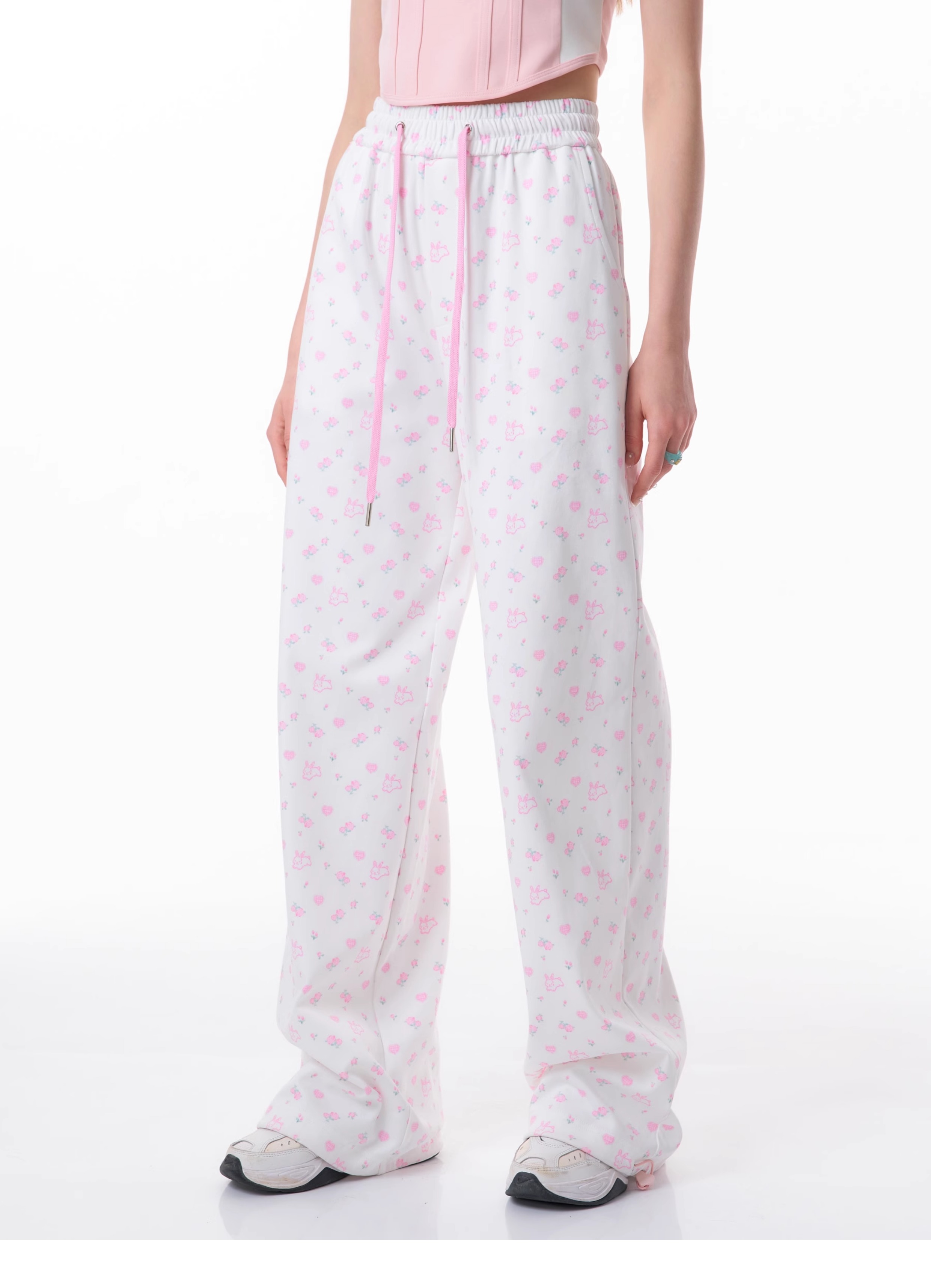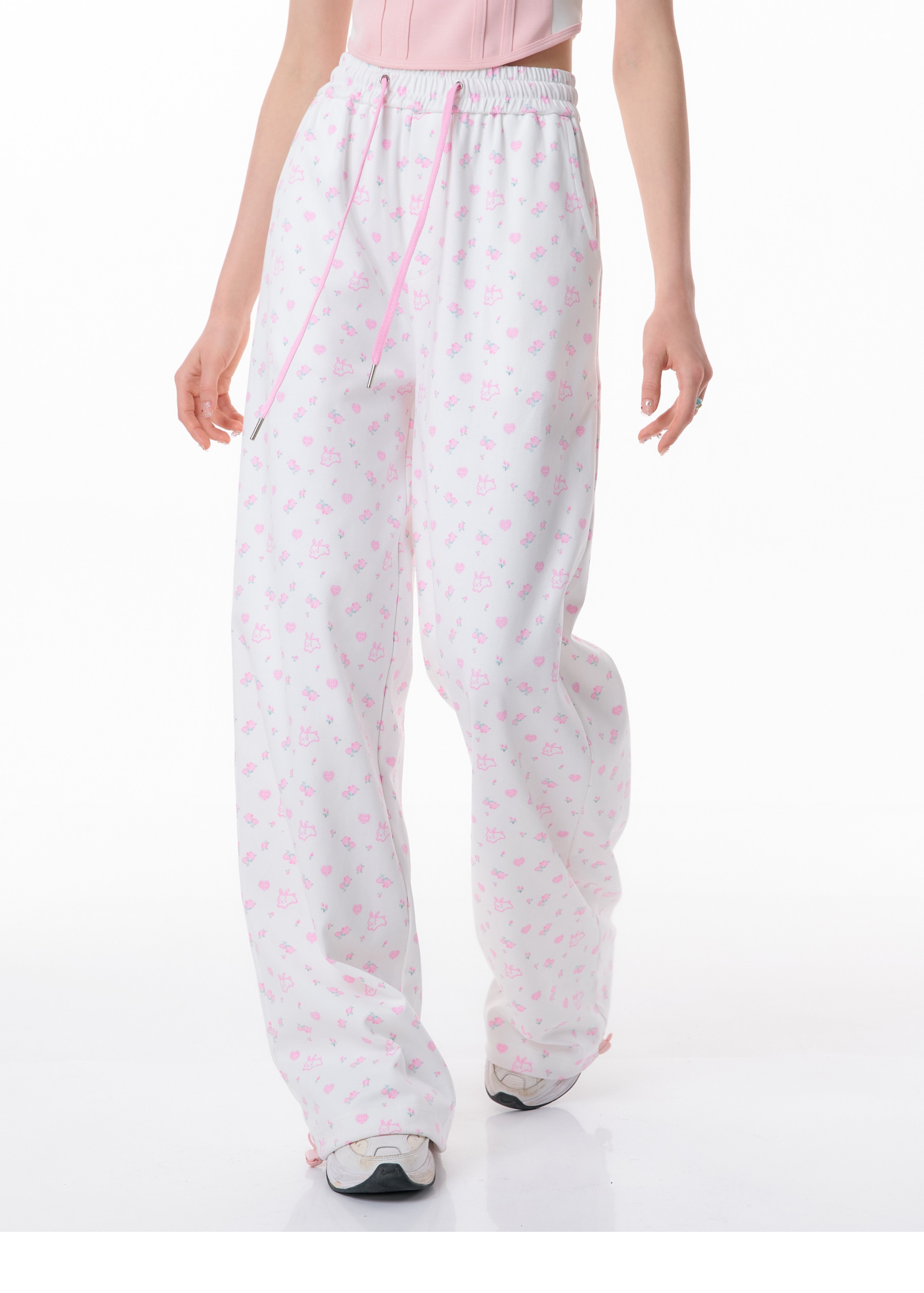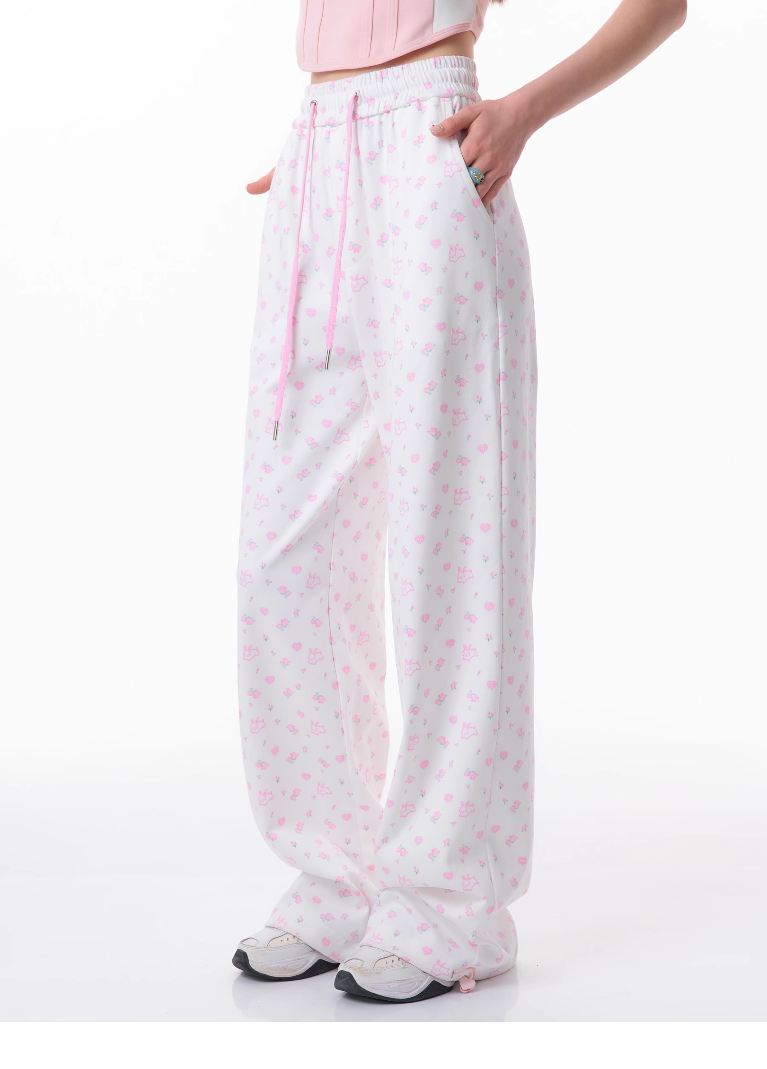 Pantalon à jambes larges imprimé lapin | Rétro taille haute, coupe ajustée, style décontracté