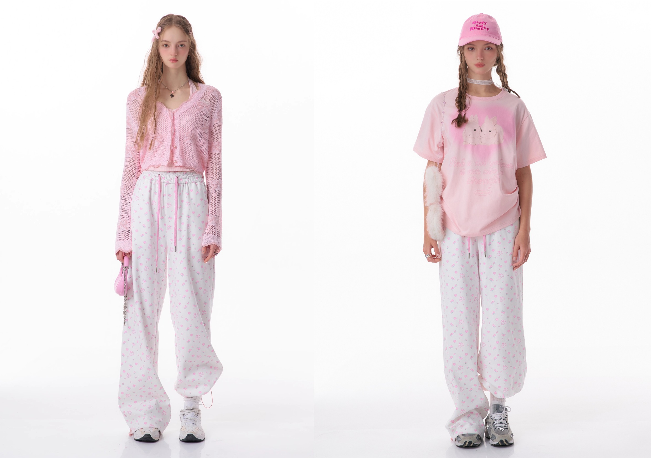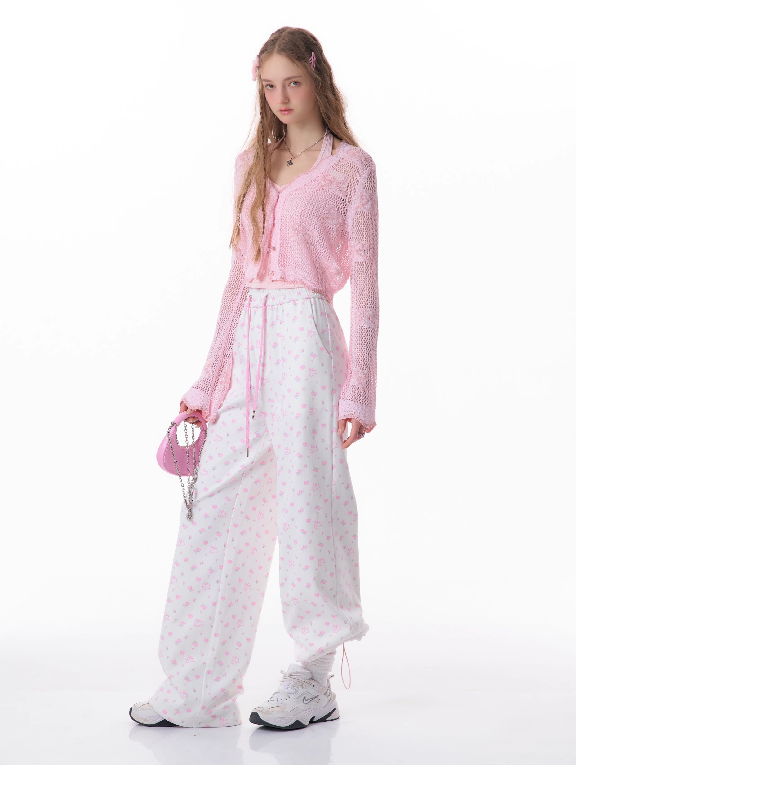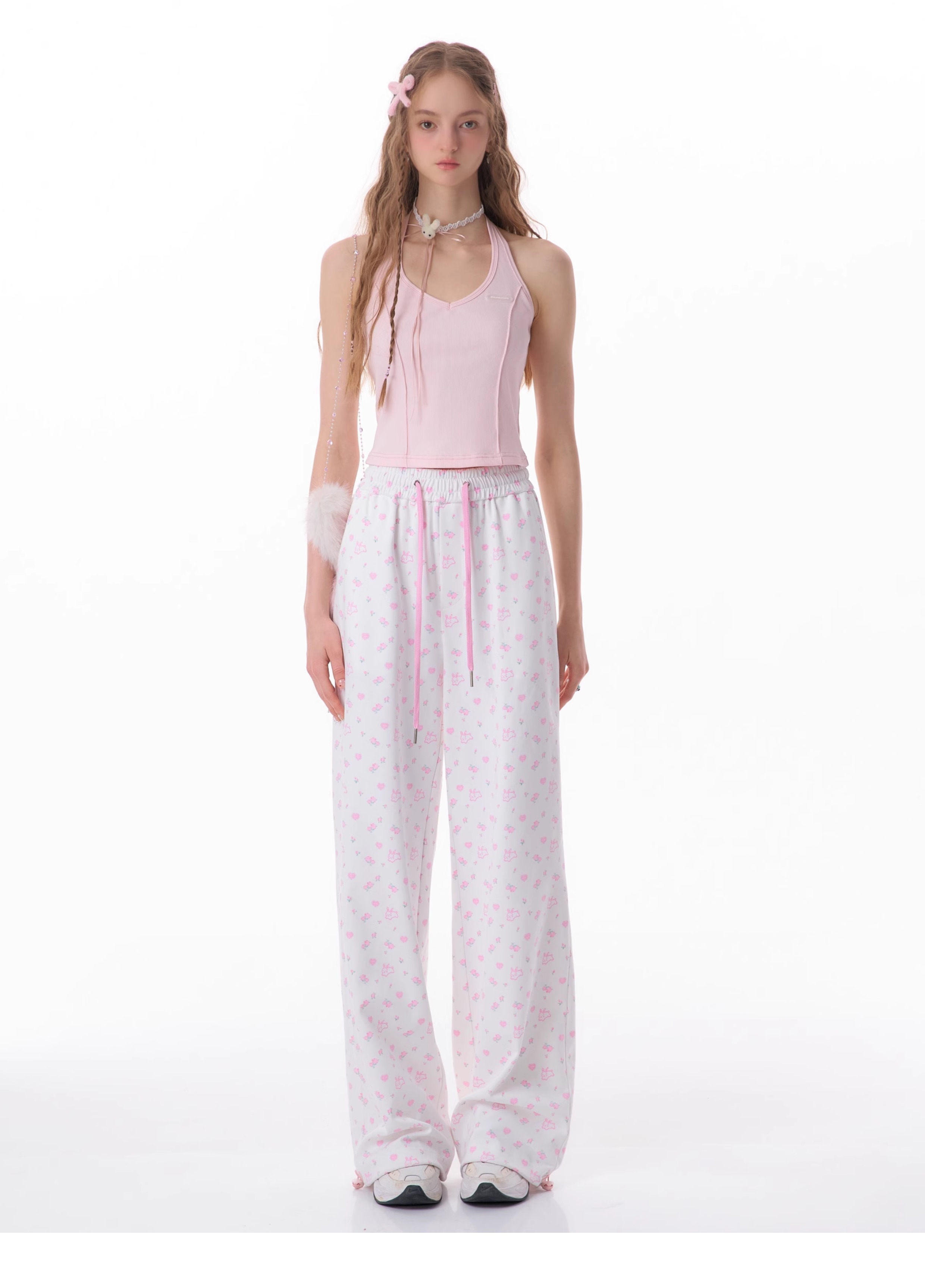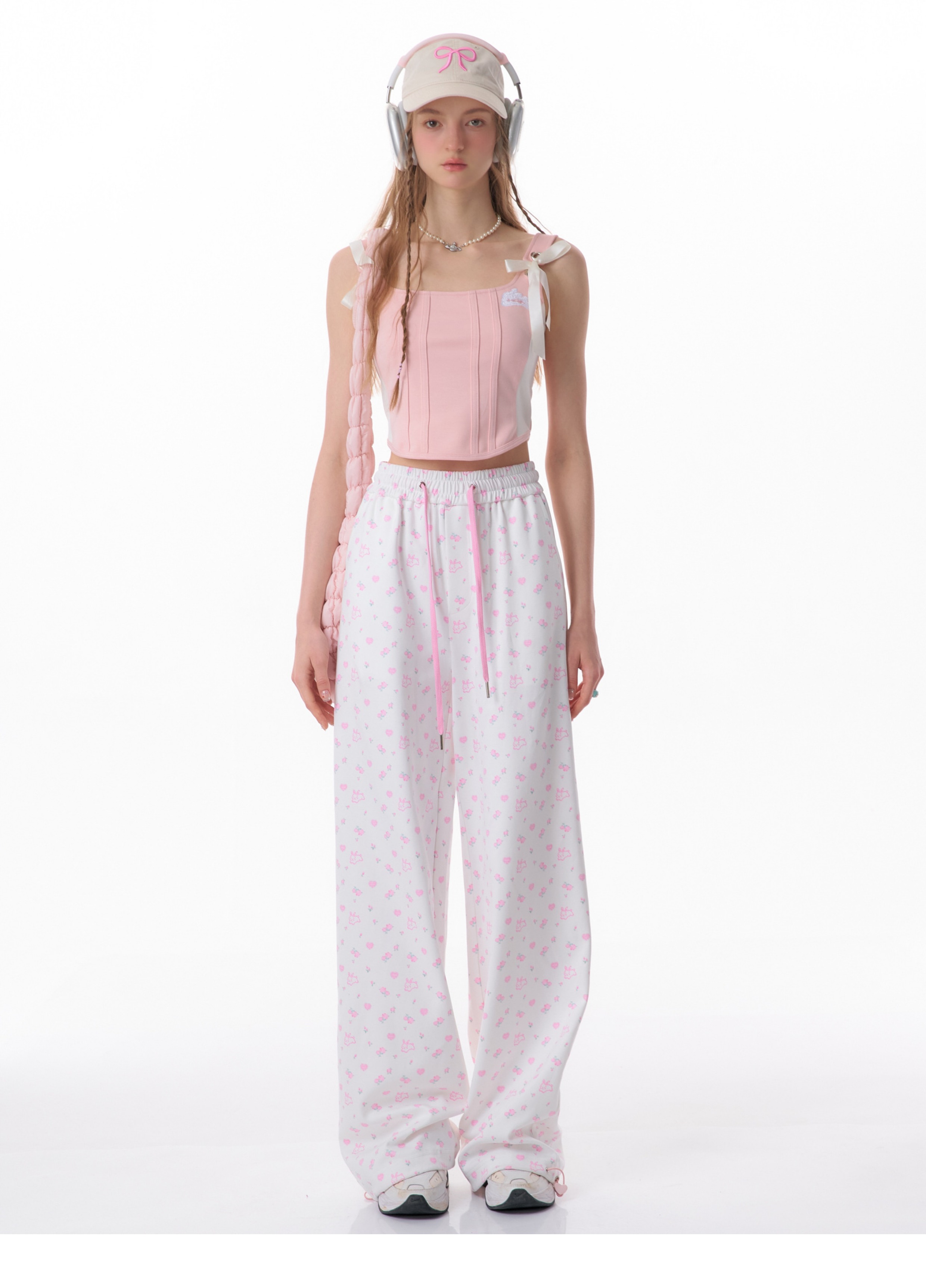 Pantalon à jambes larges imprimé lapin | Rétro taille haute, coupe ajustée, style décontracté
