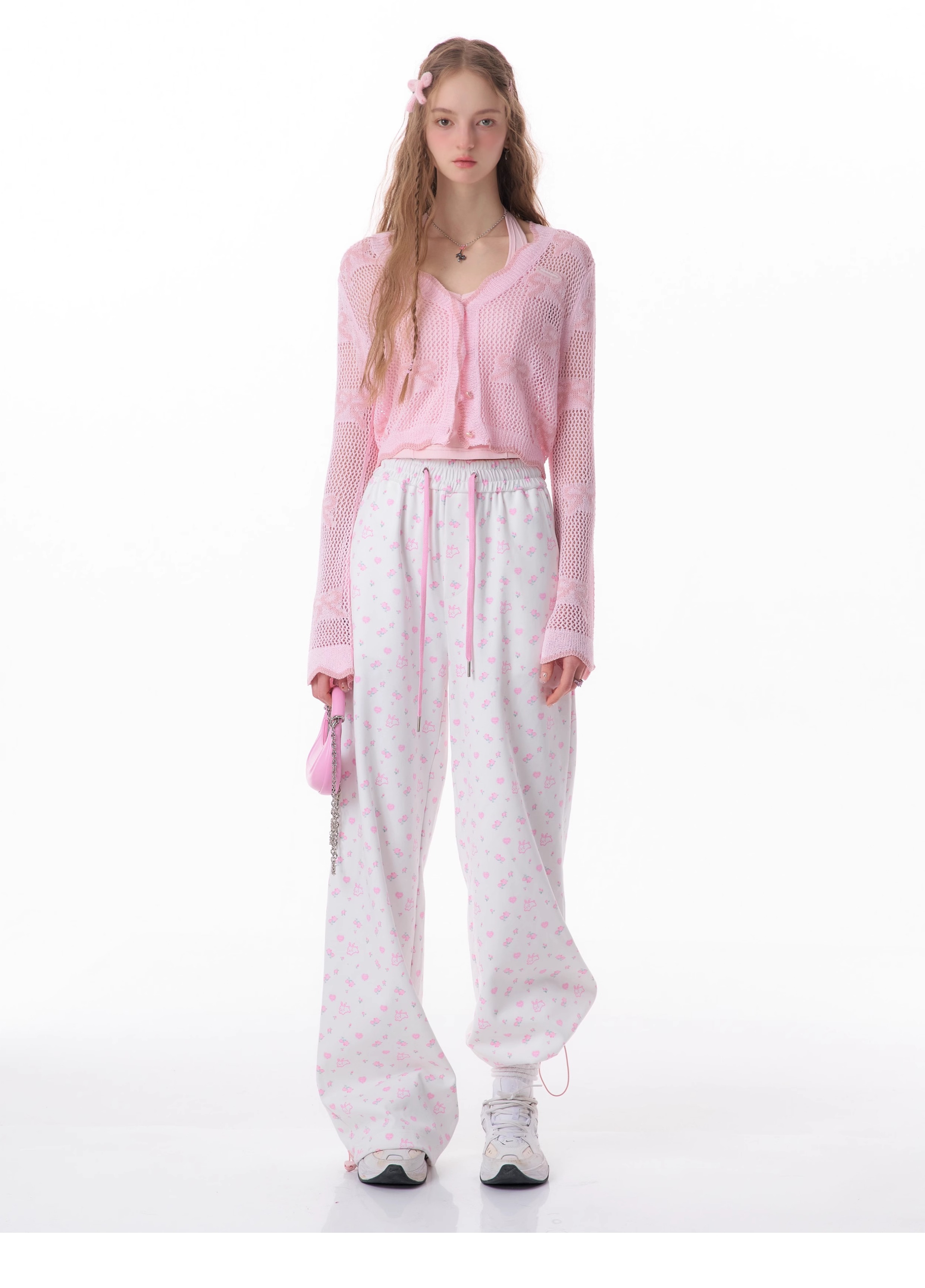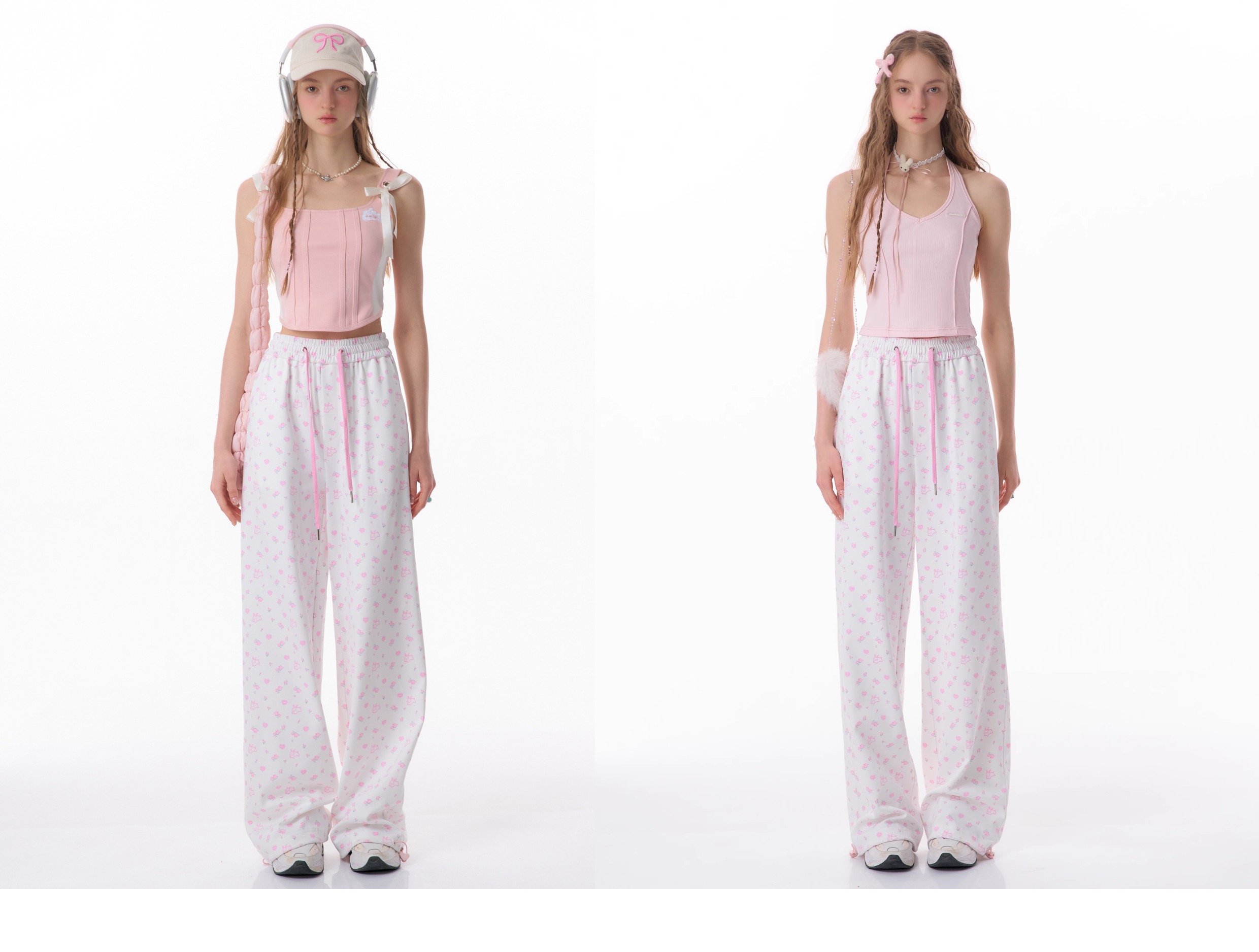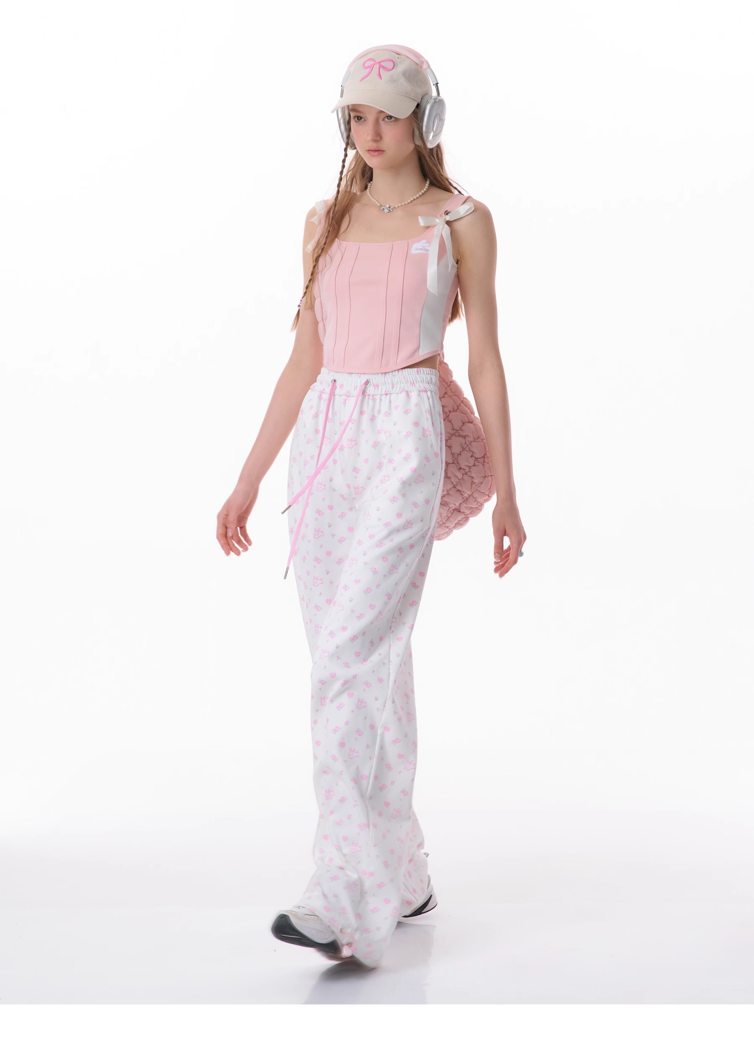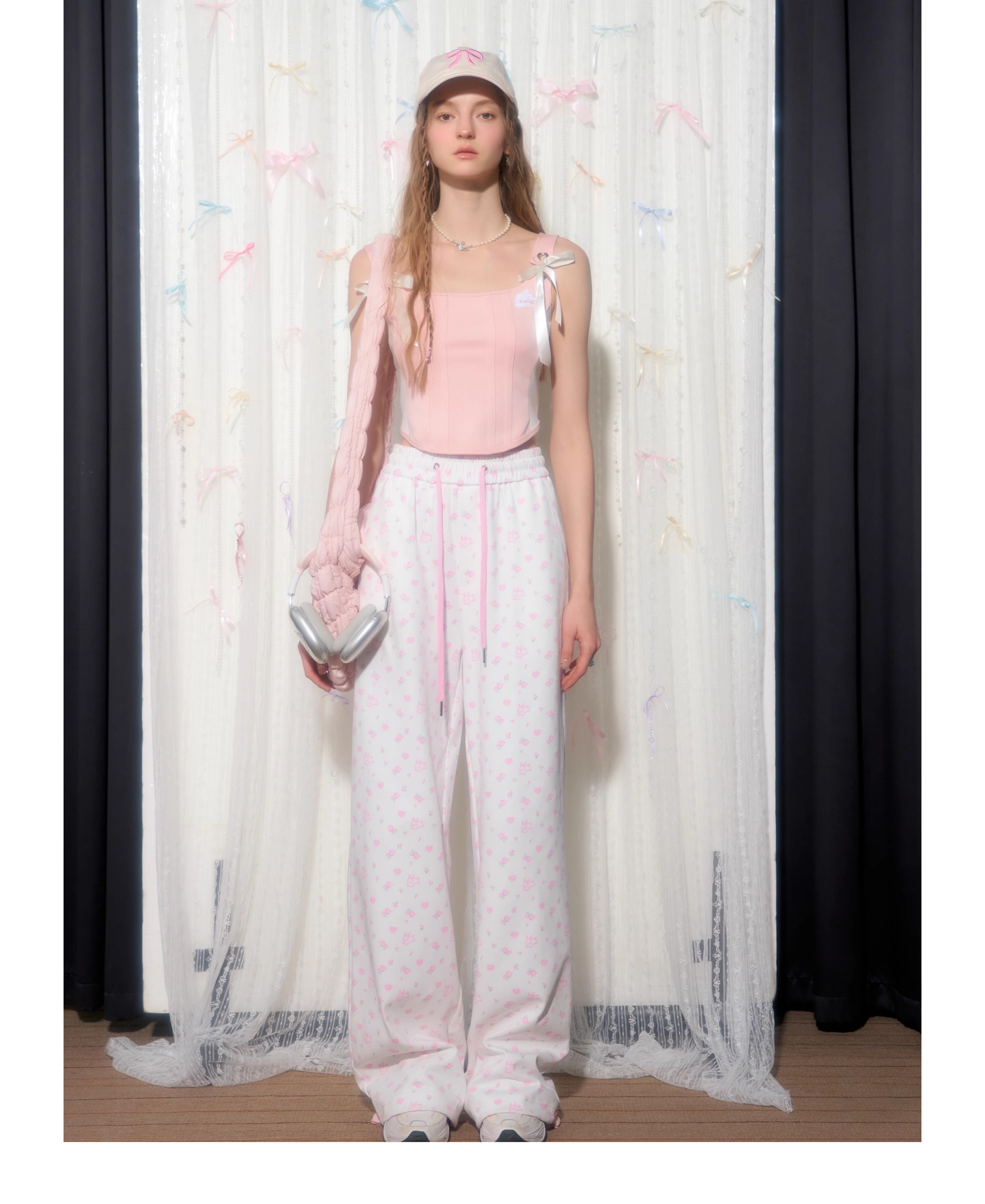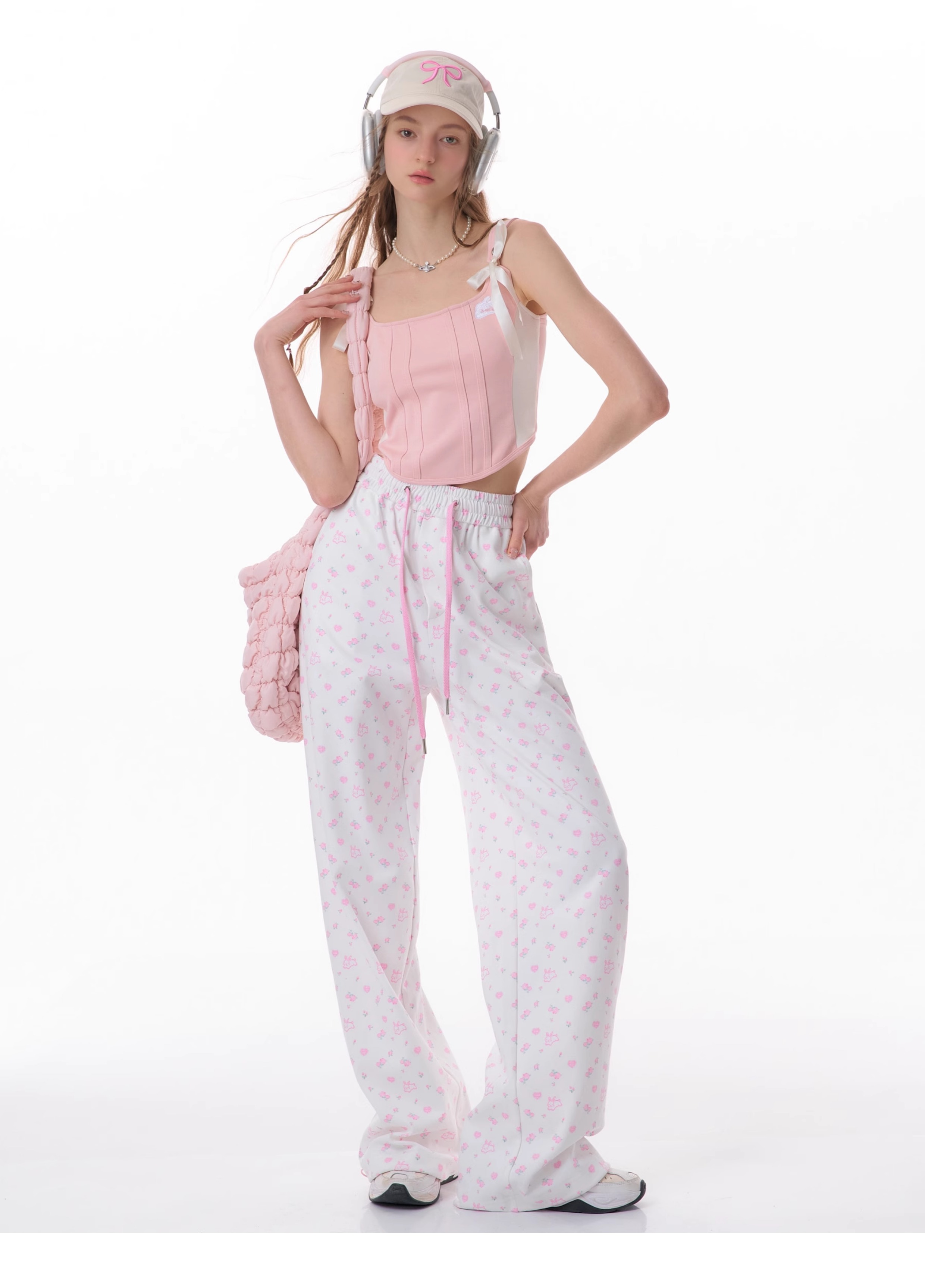 Pantalon à jambes larges imprimé lapin | Rétro taille haute, coupe ajustée, style décontracté