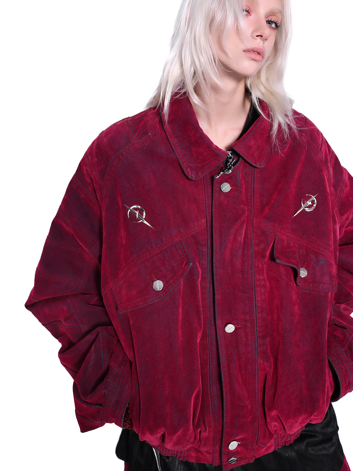 Velvet Red Denim Jacket – Padded Shoulders Electric Moon Genderless Style