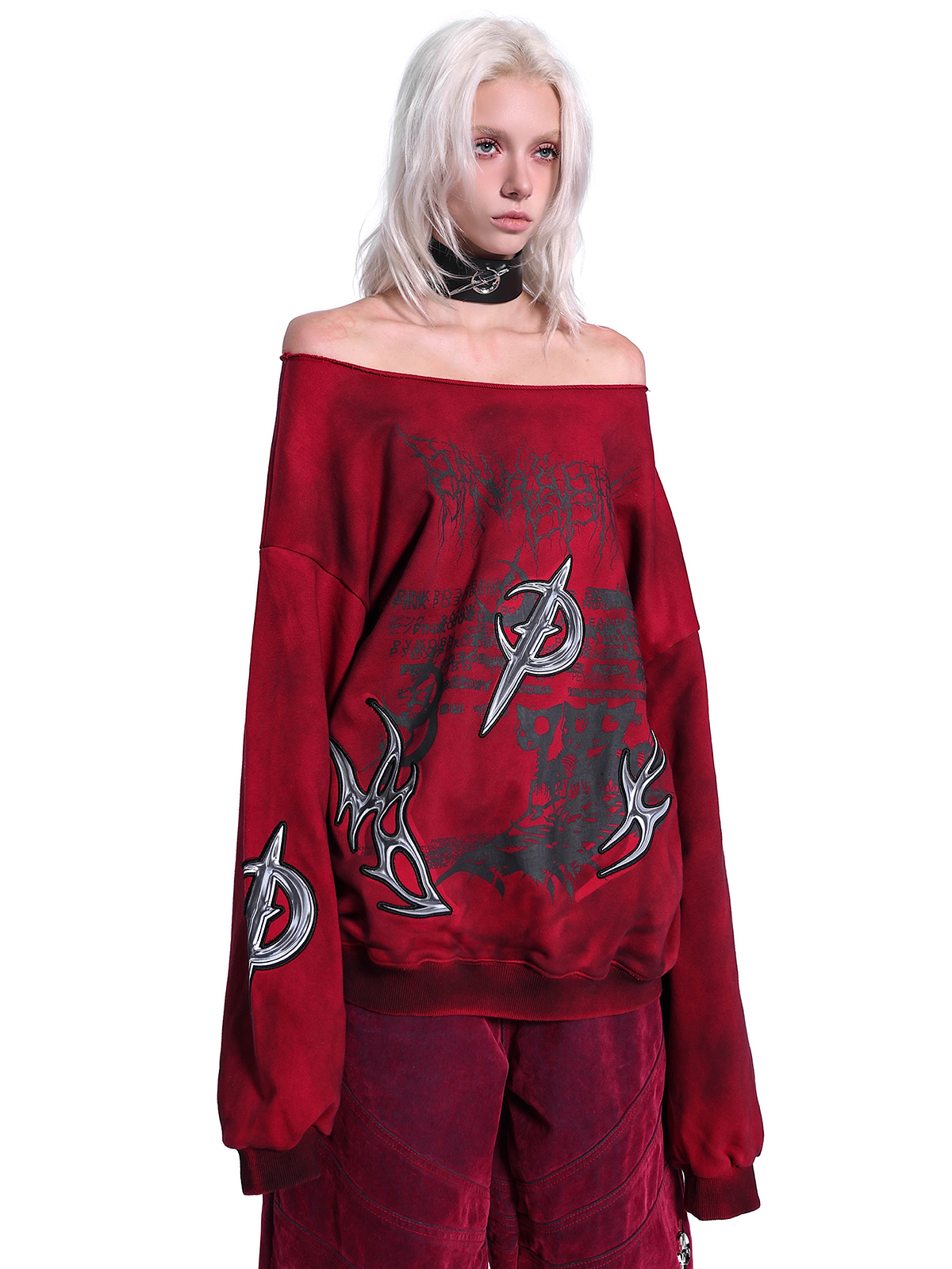 One-Shoulder 3D Embroidery Distressed Punk Y2K Sweatshirt