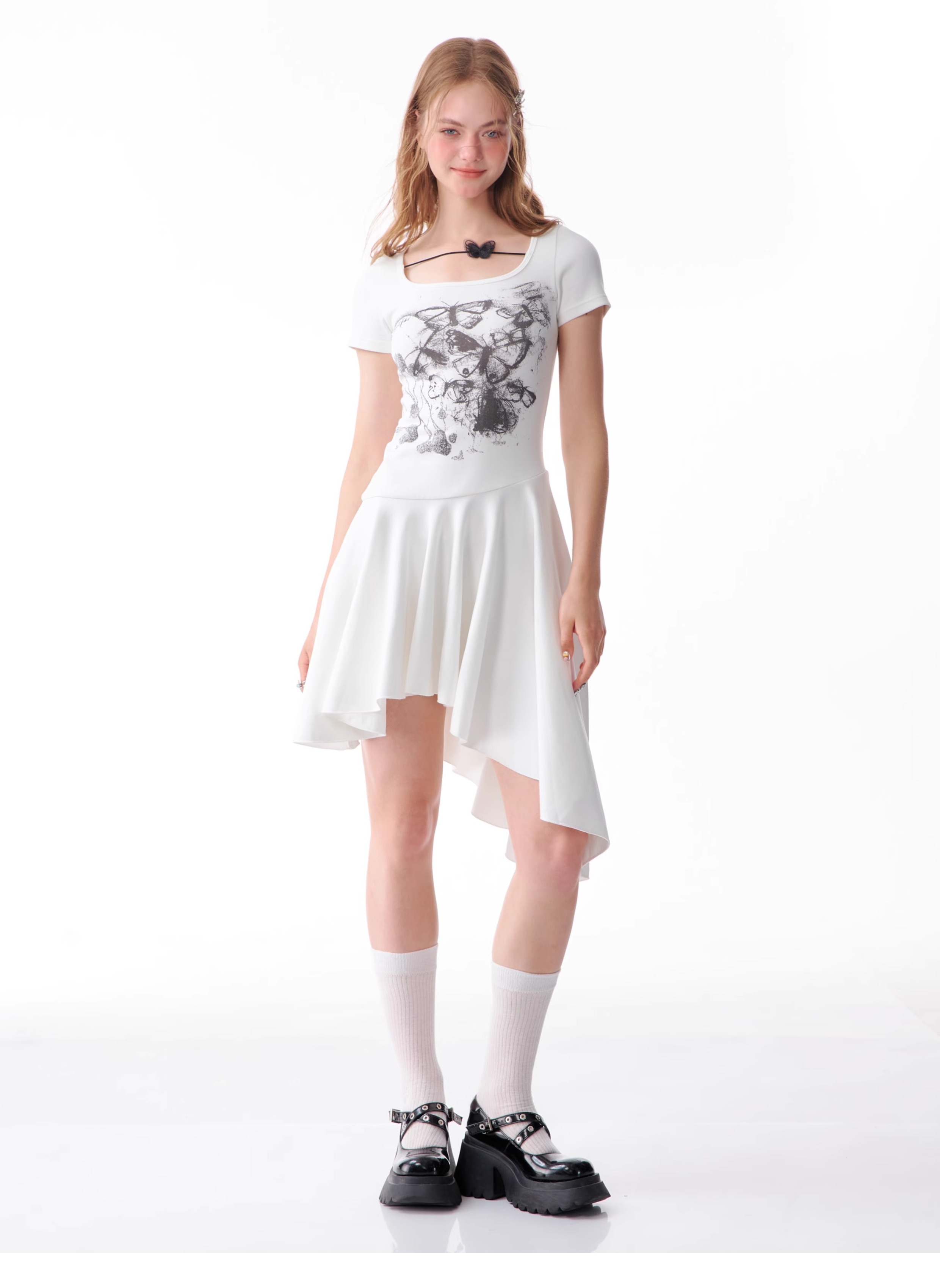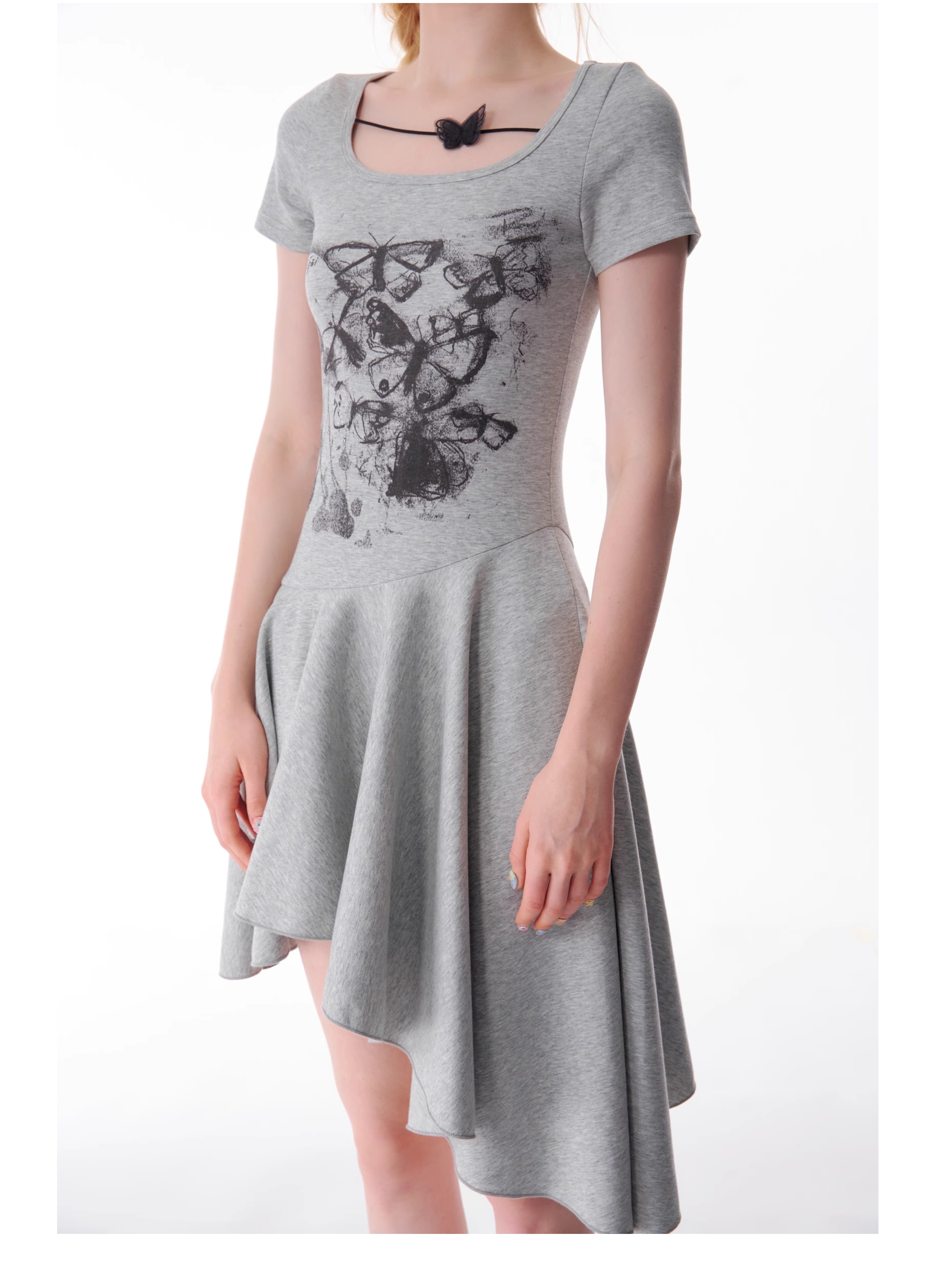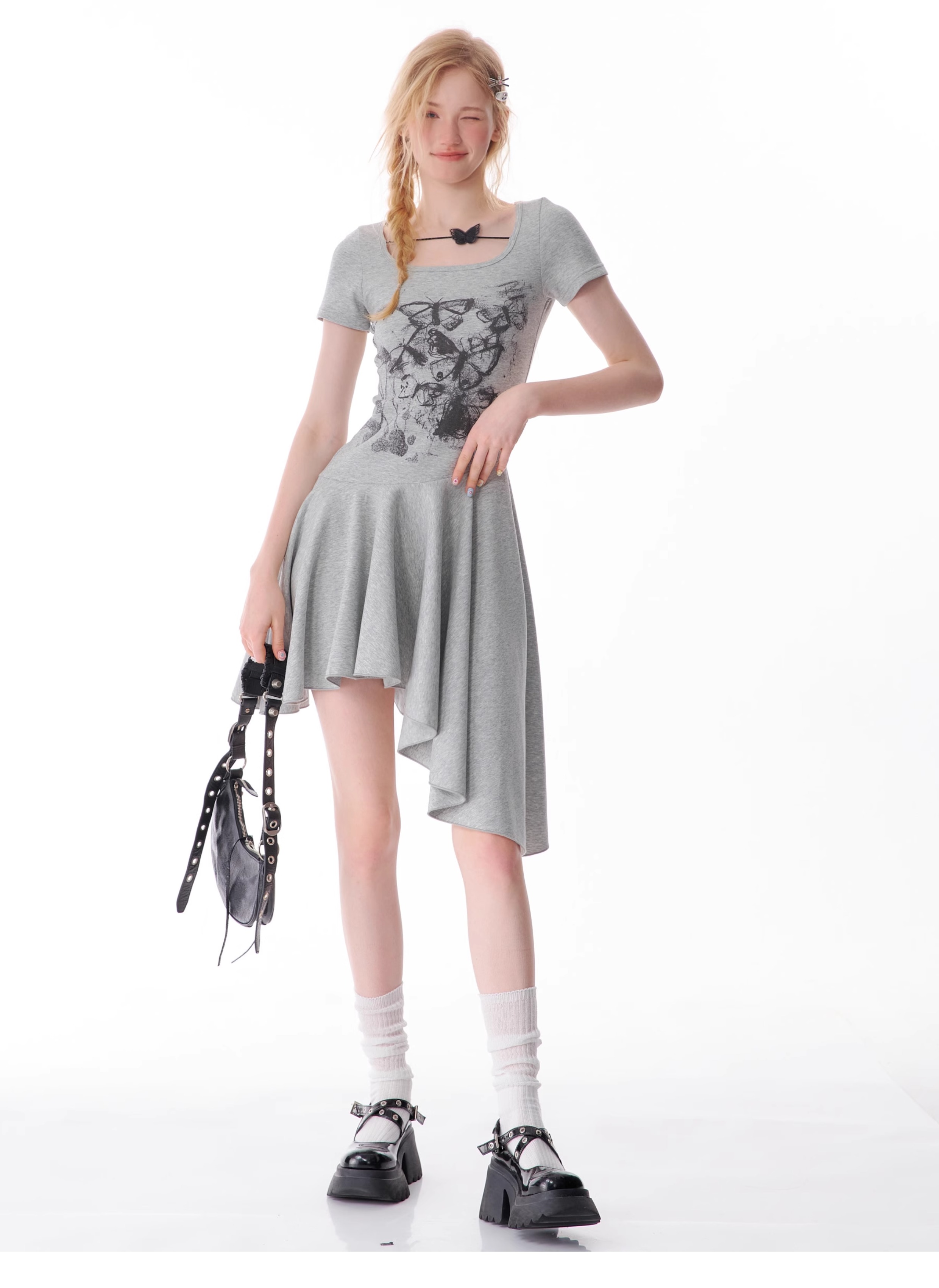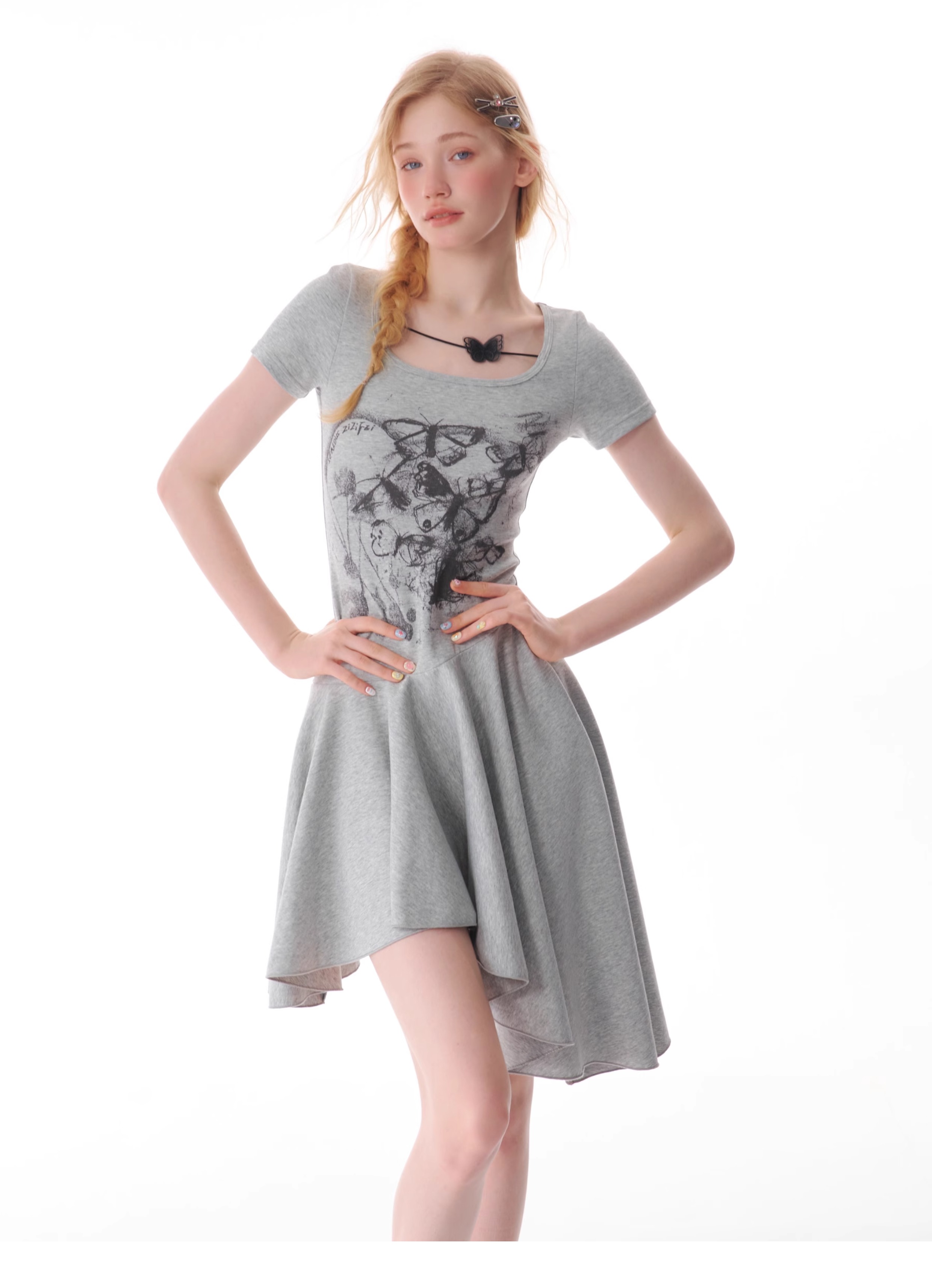 Robe taille imprimée papillon | Rétro coupe slim irrégulière, design d'été