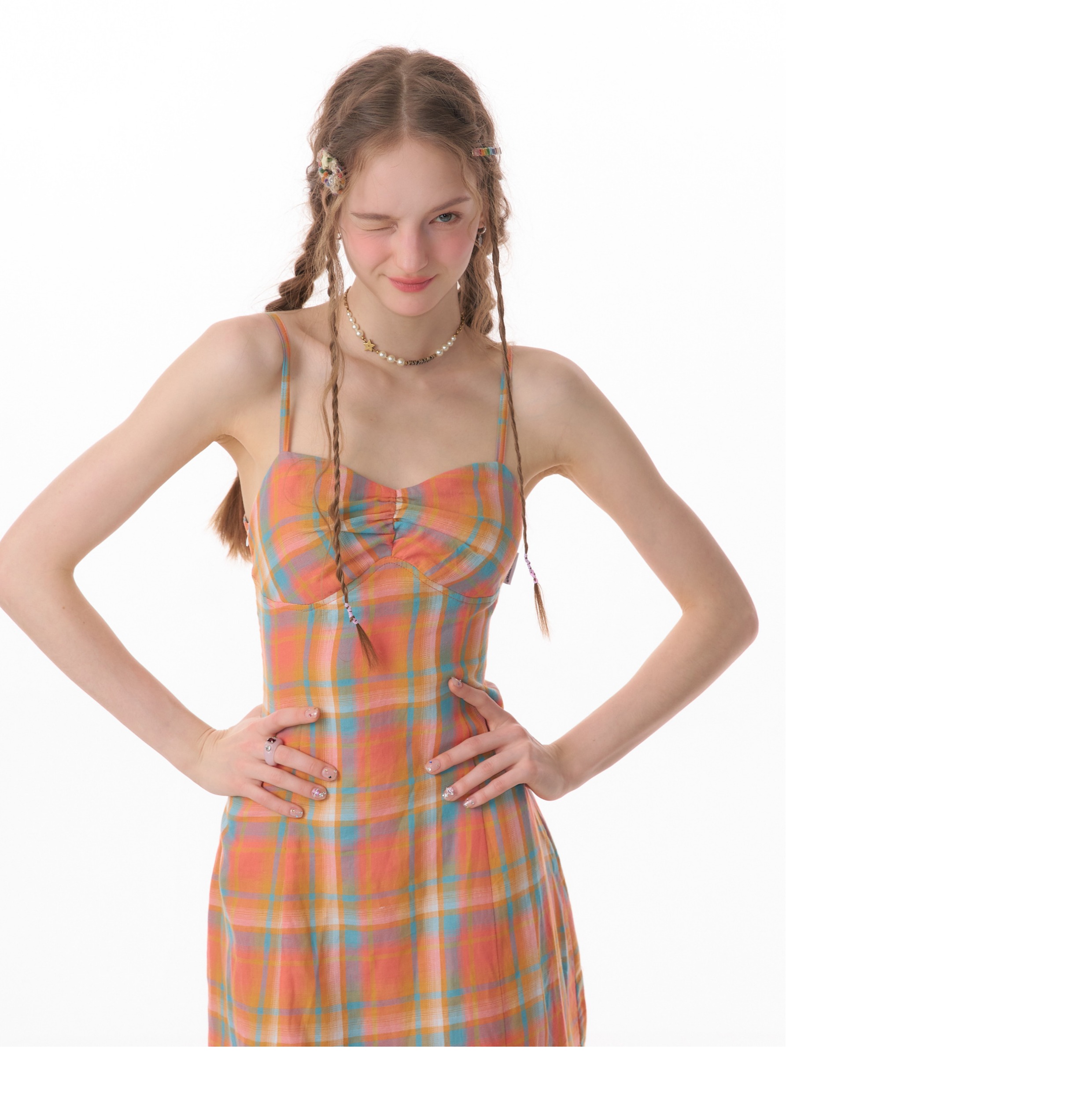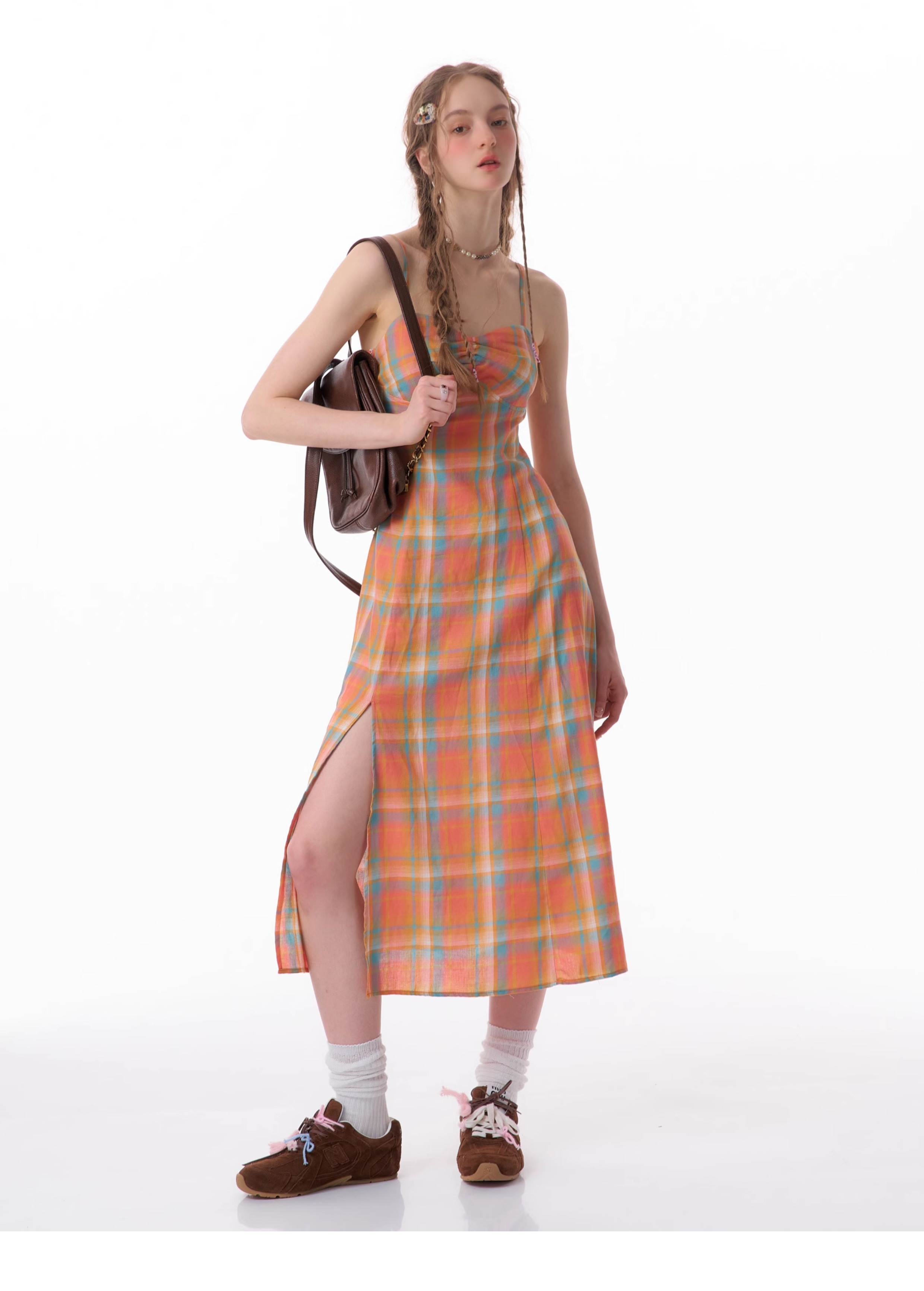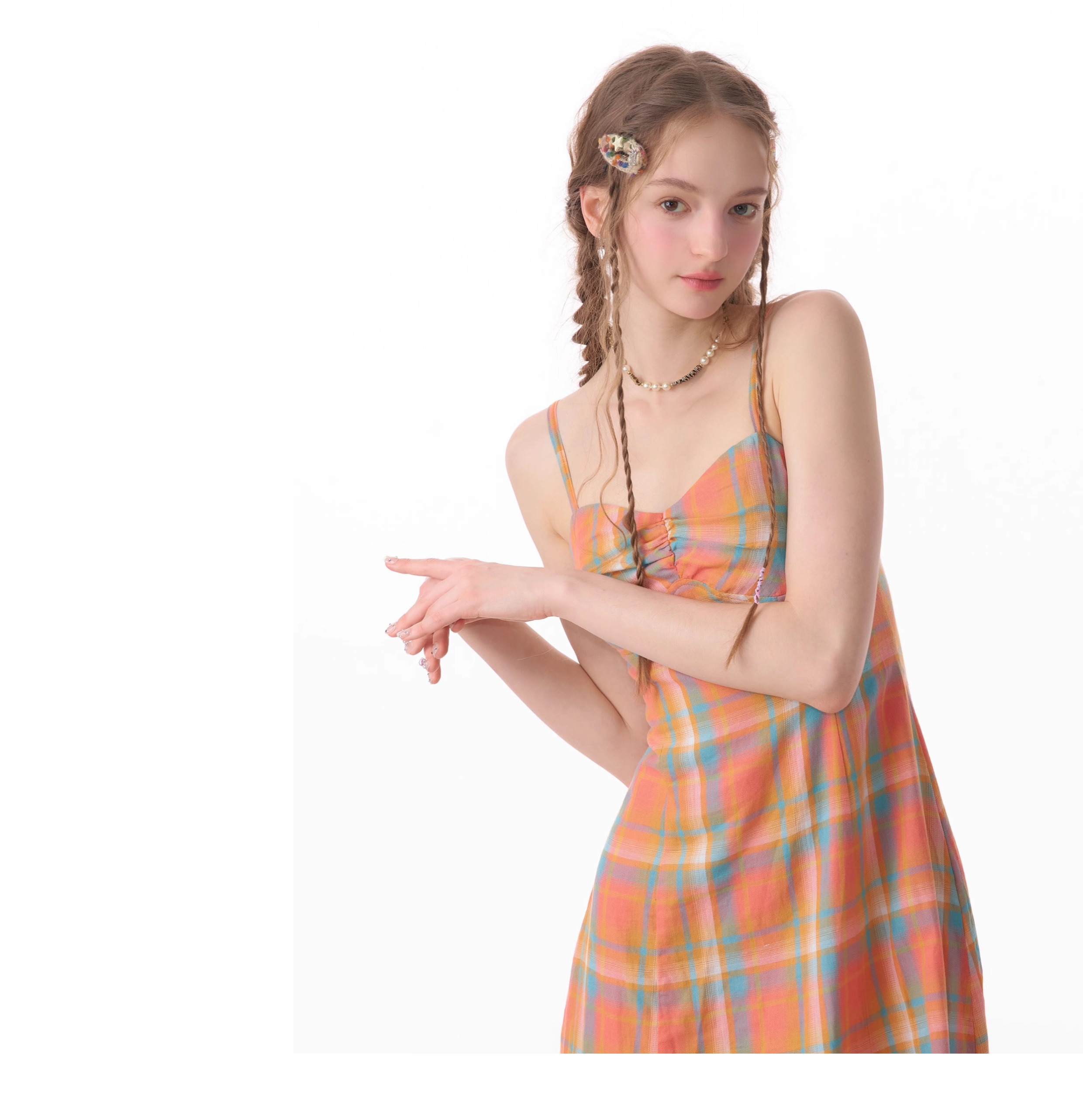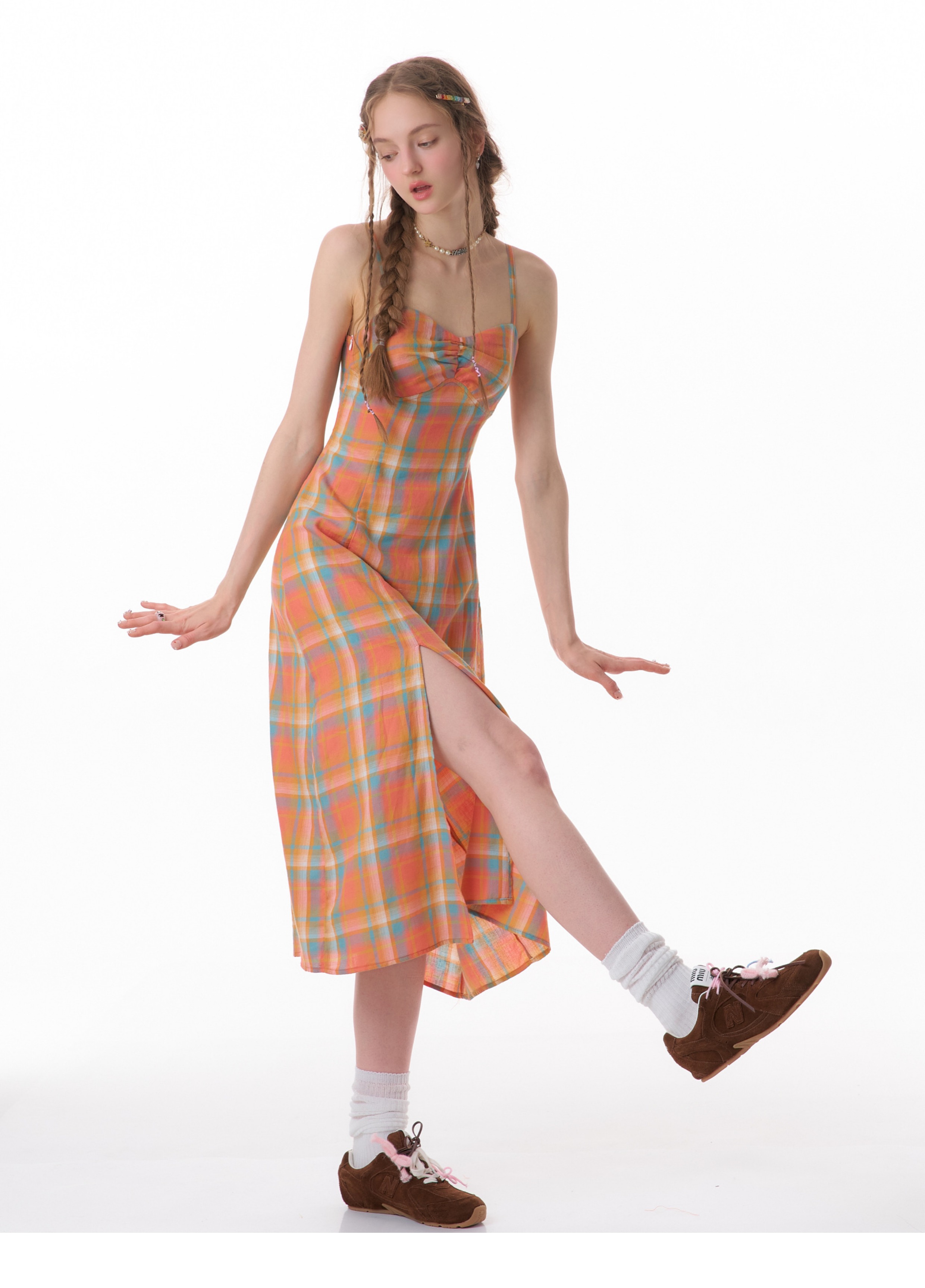 Robe à carreaux orange | Slim Fit American Retro Strap Design