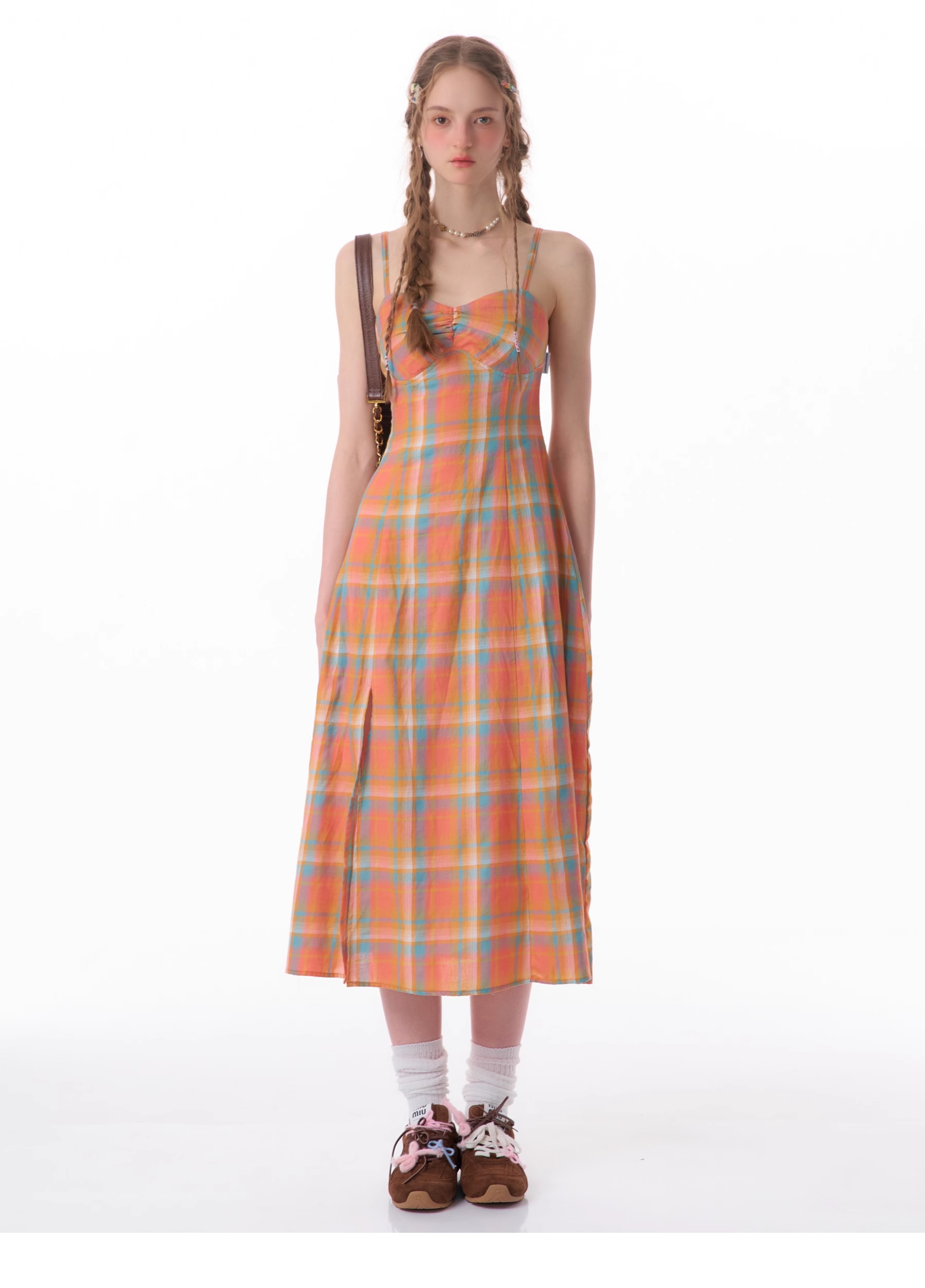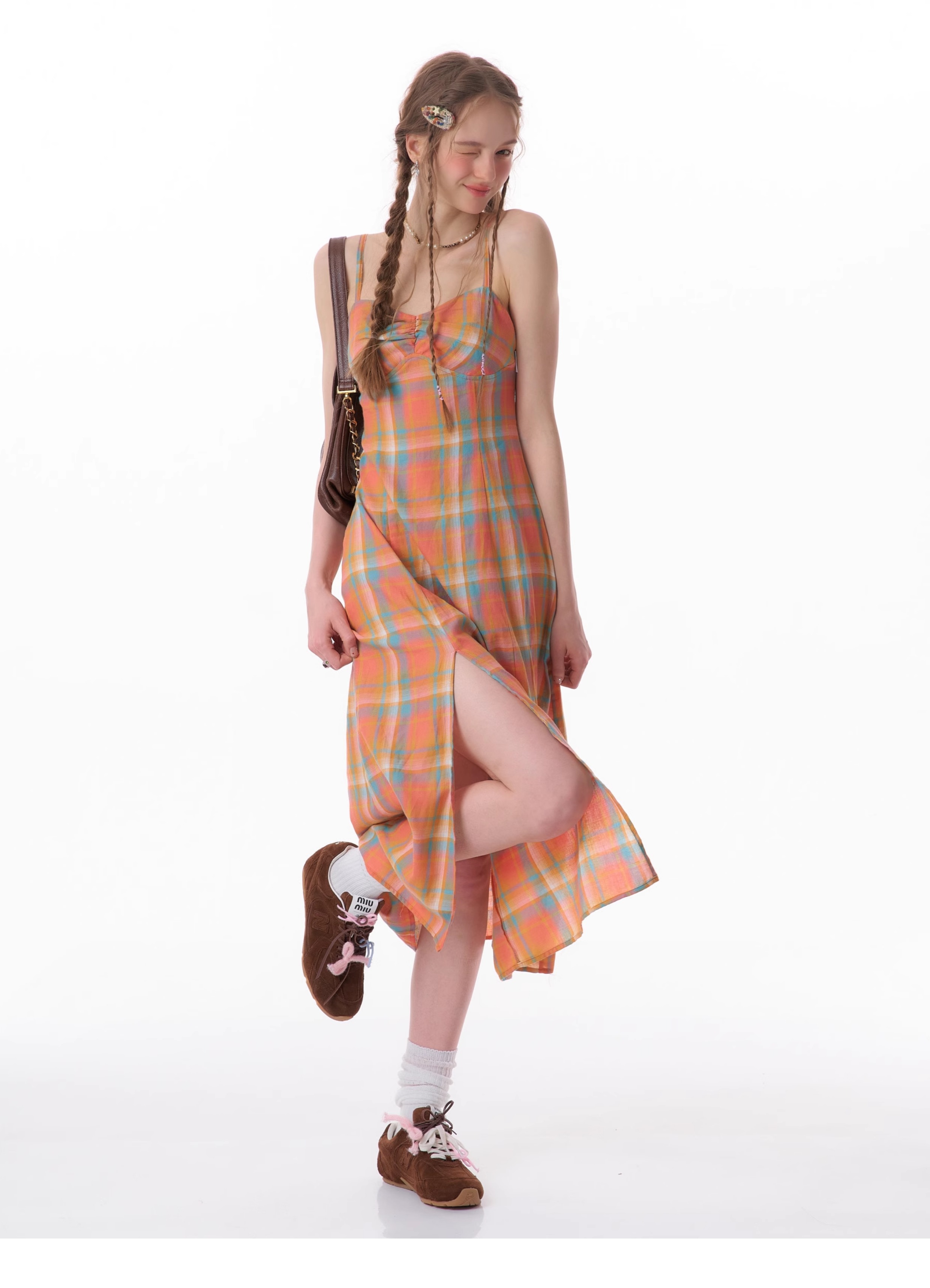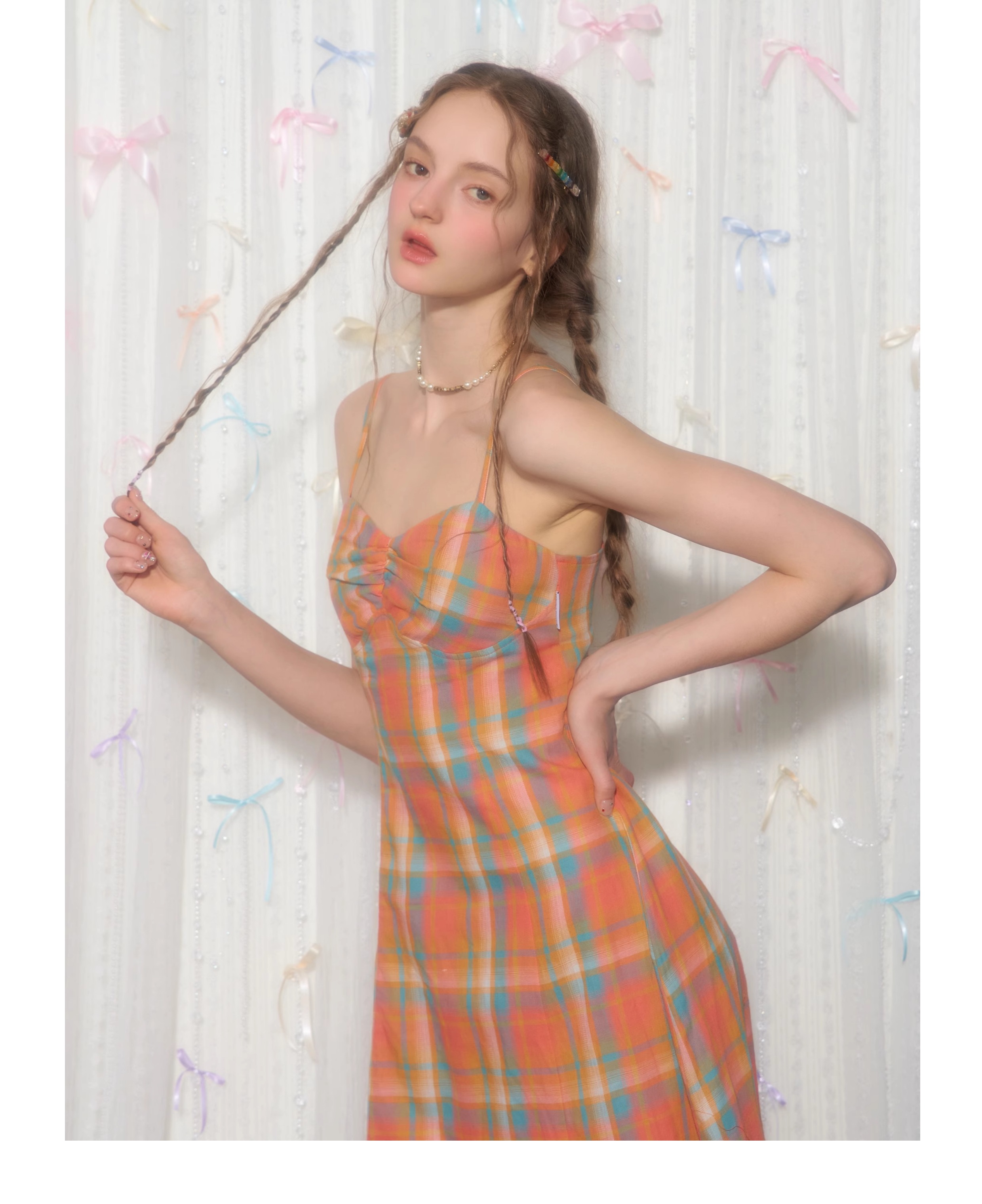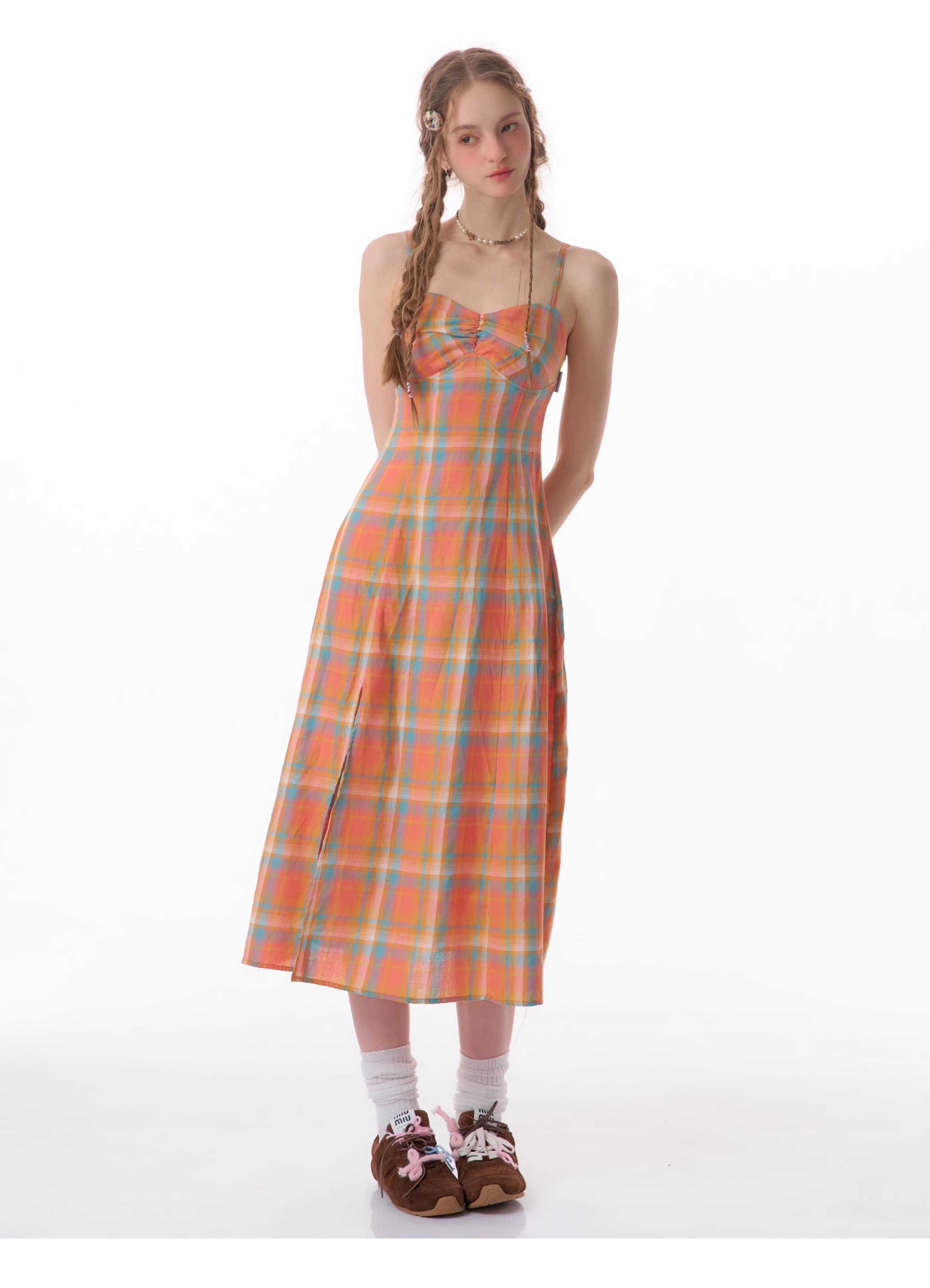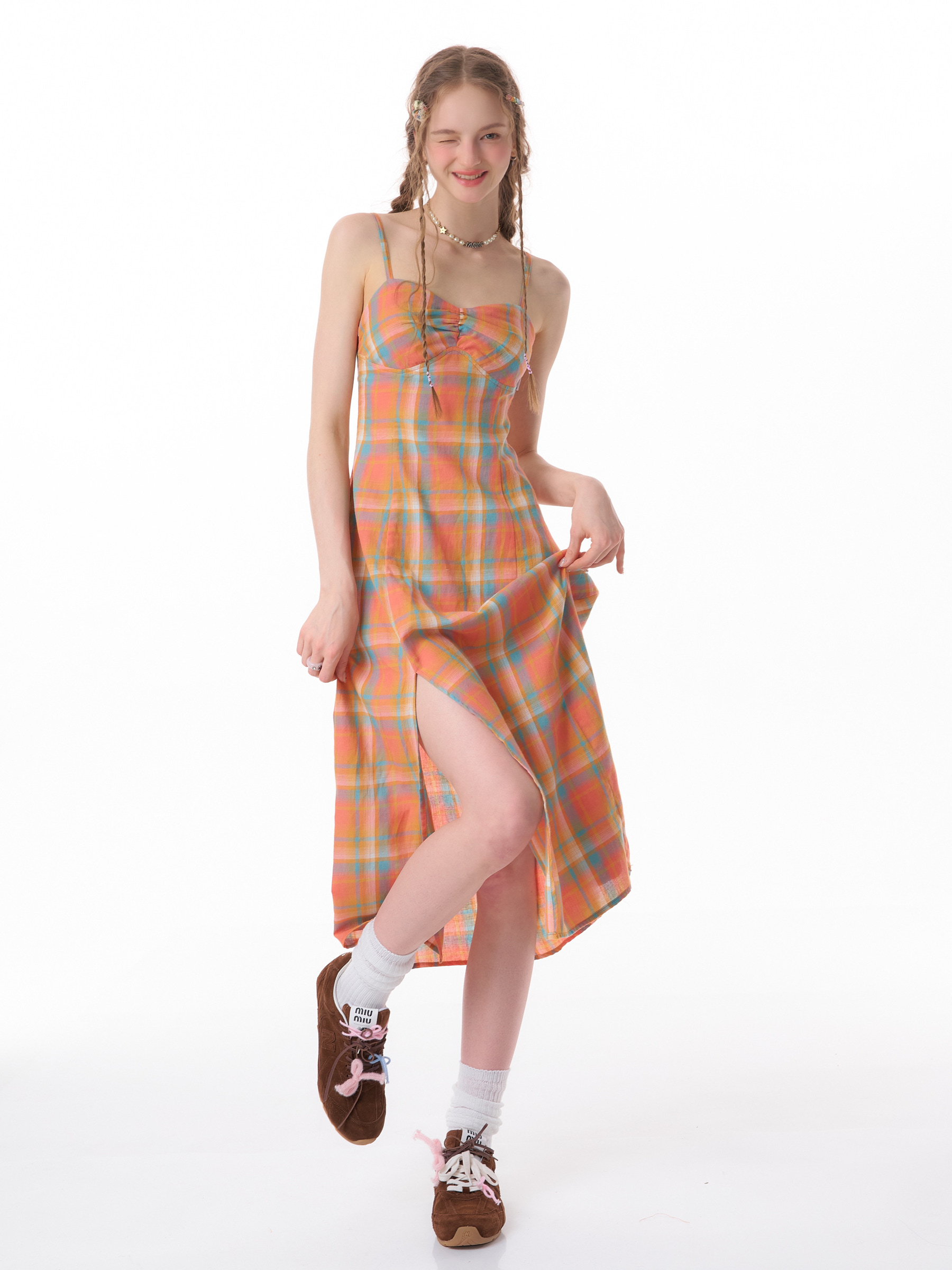 Robe à carreaux orange | Slim Fit American Retro Strap Design