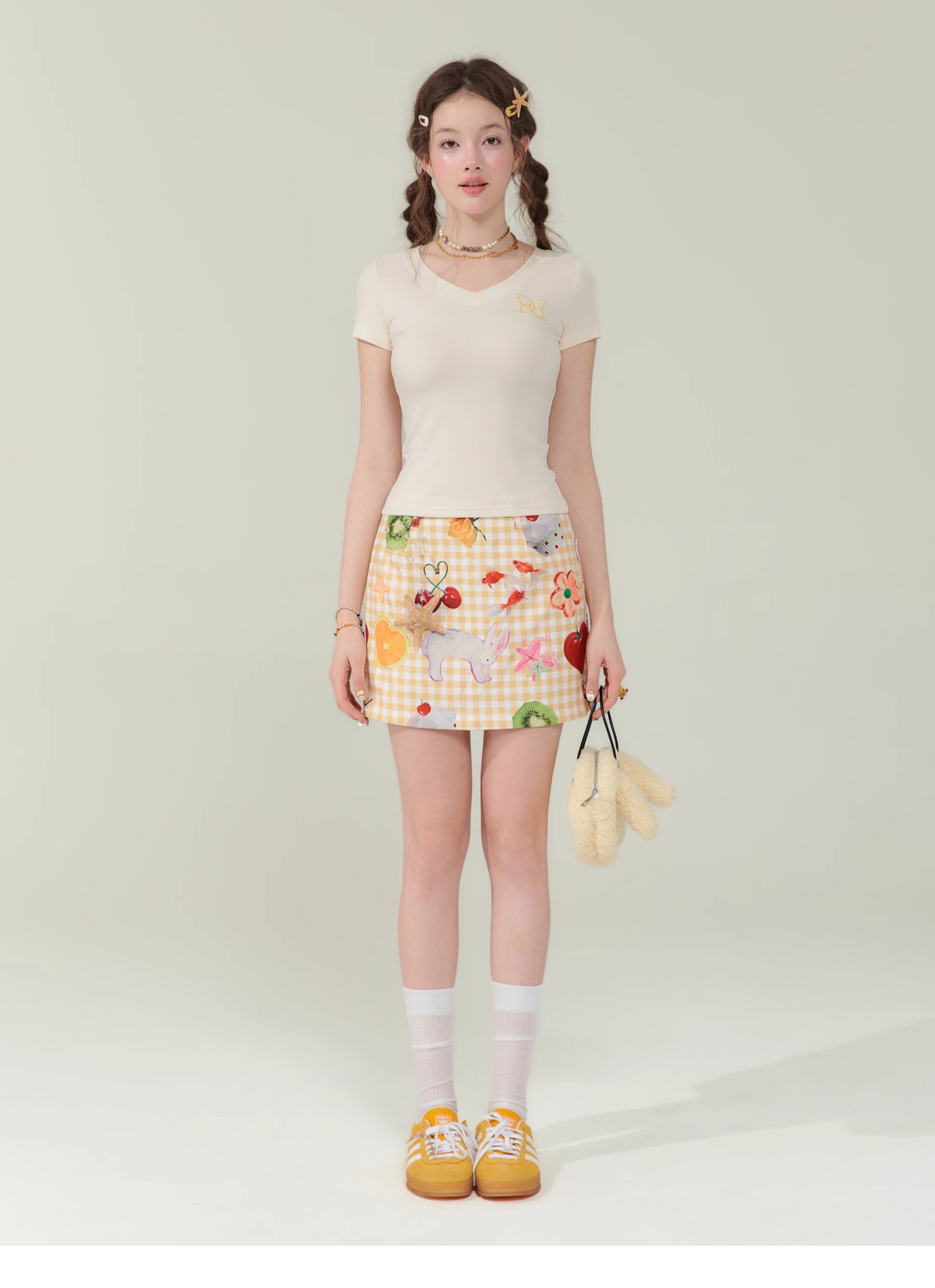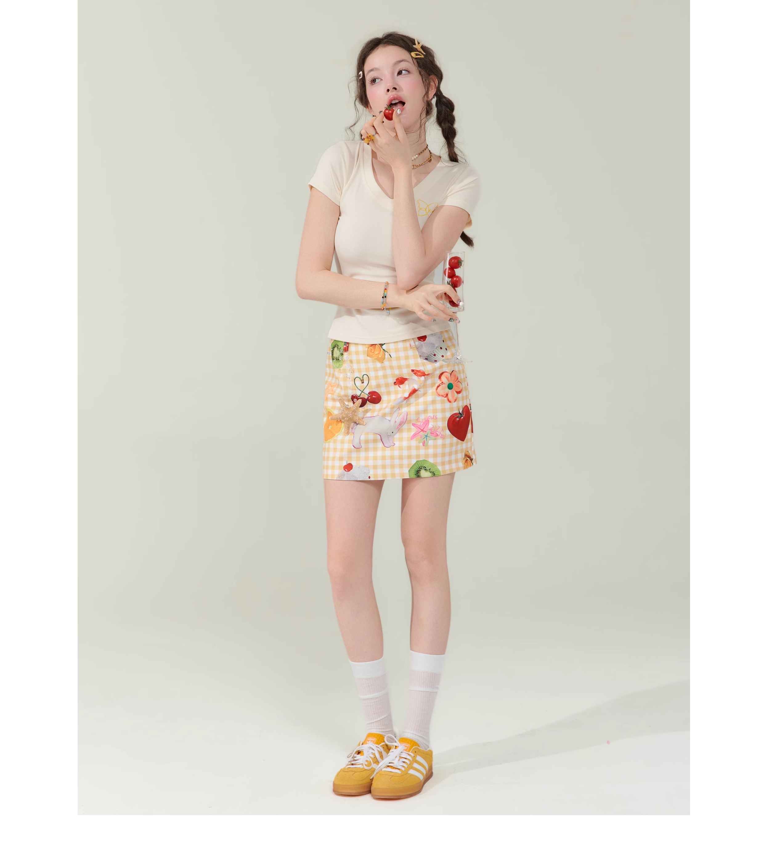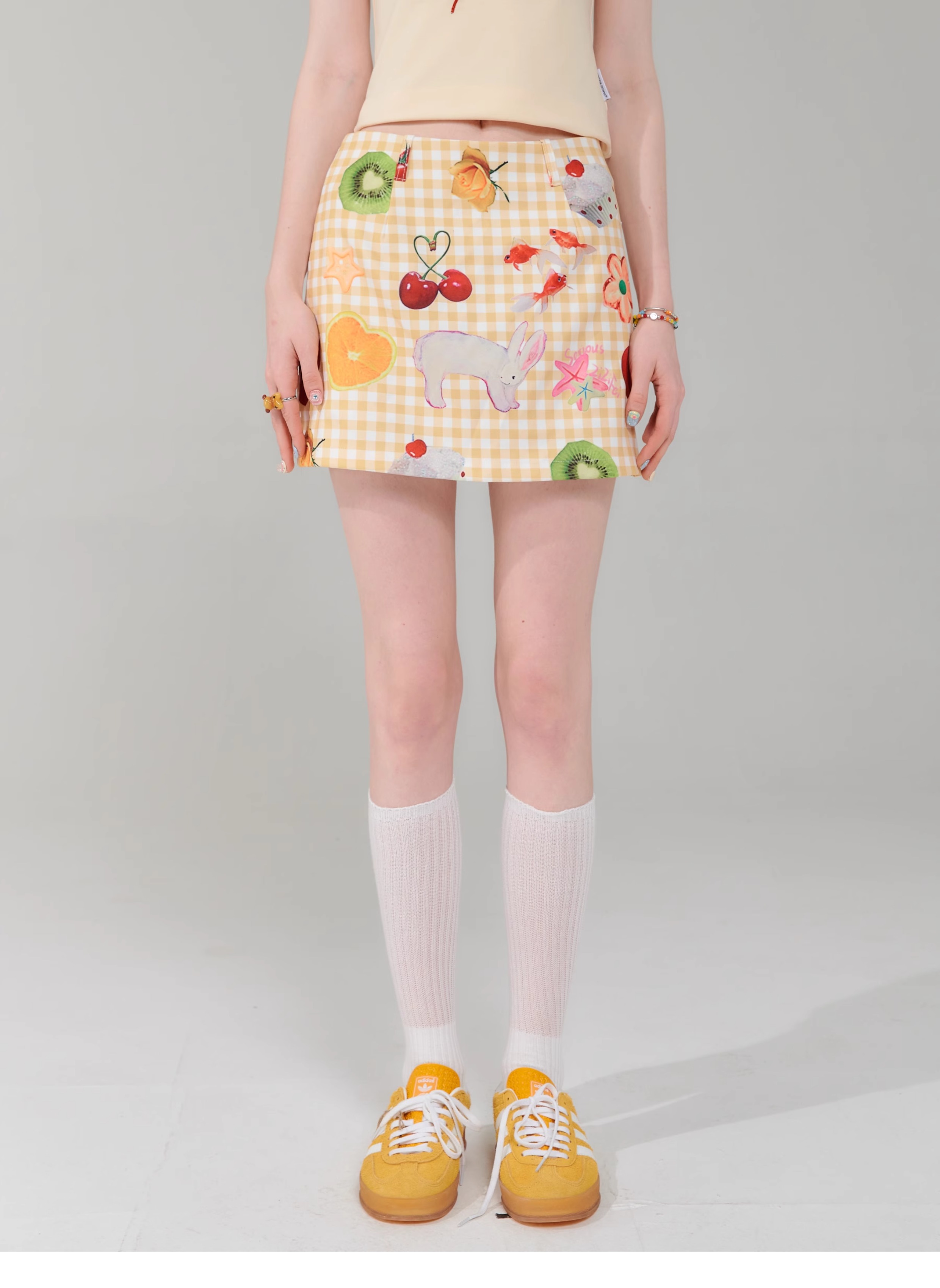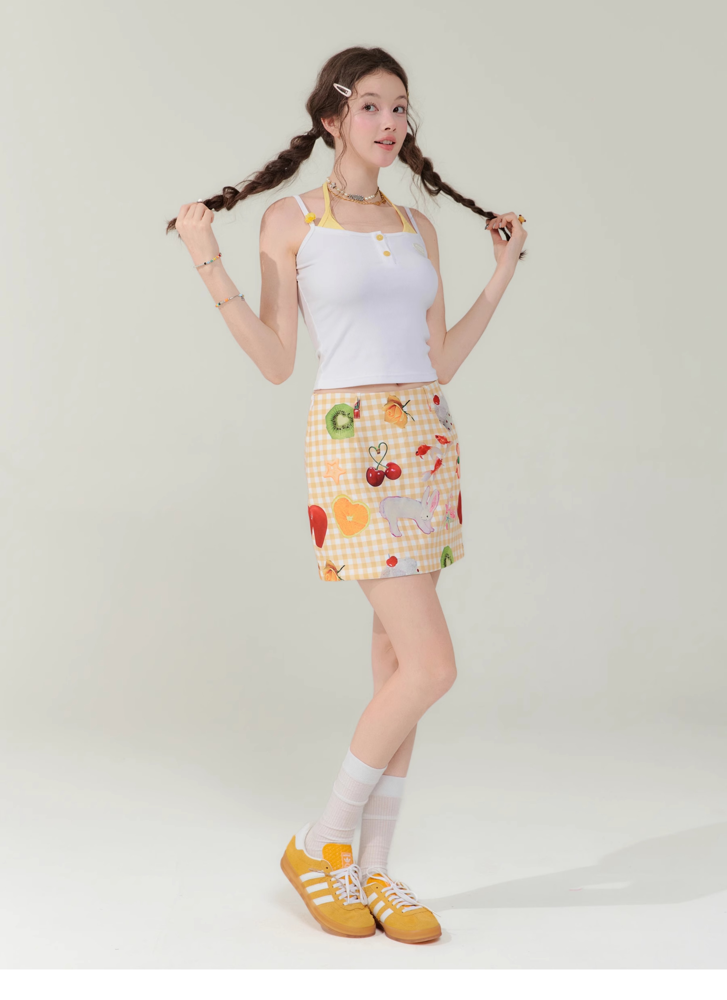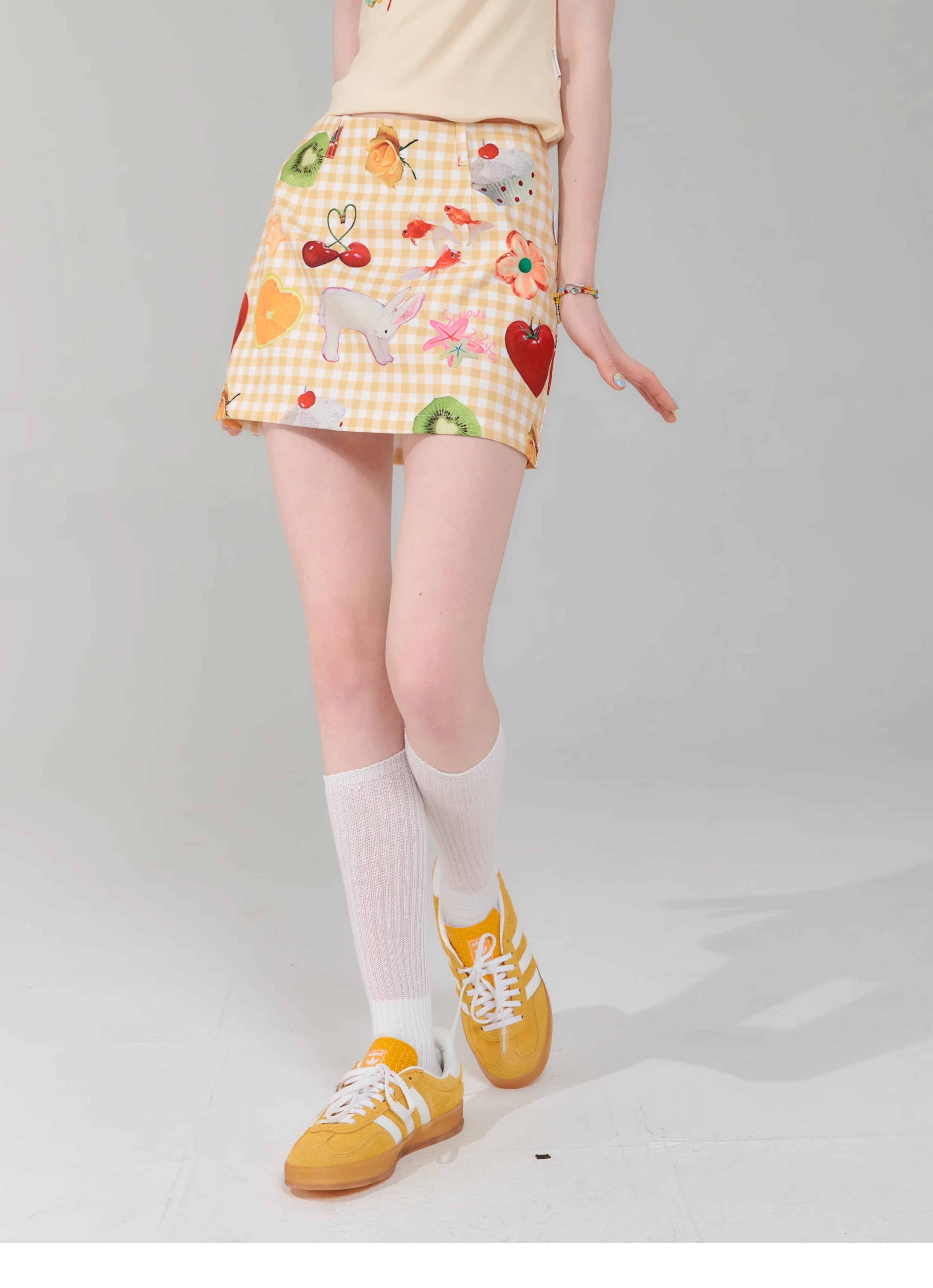 Jupe courte à imprimé fruits | Rétro jaune taille haute Slim Fit Style d’été