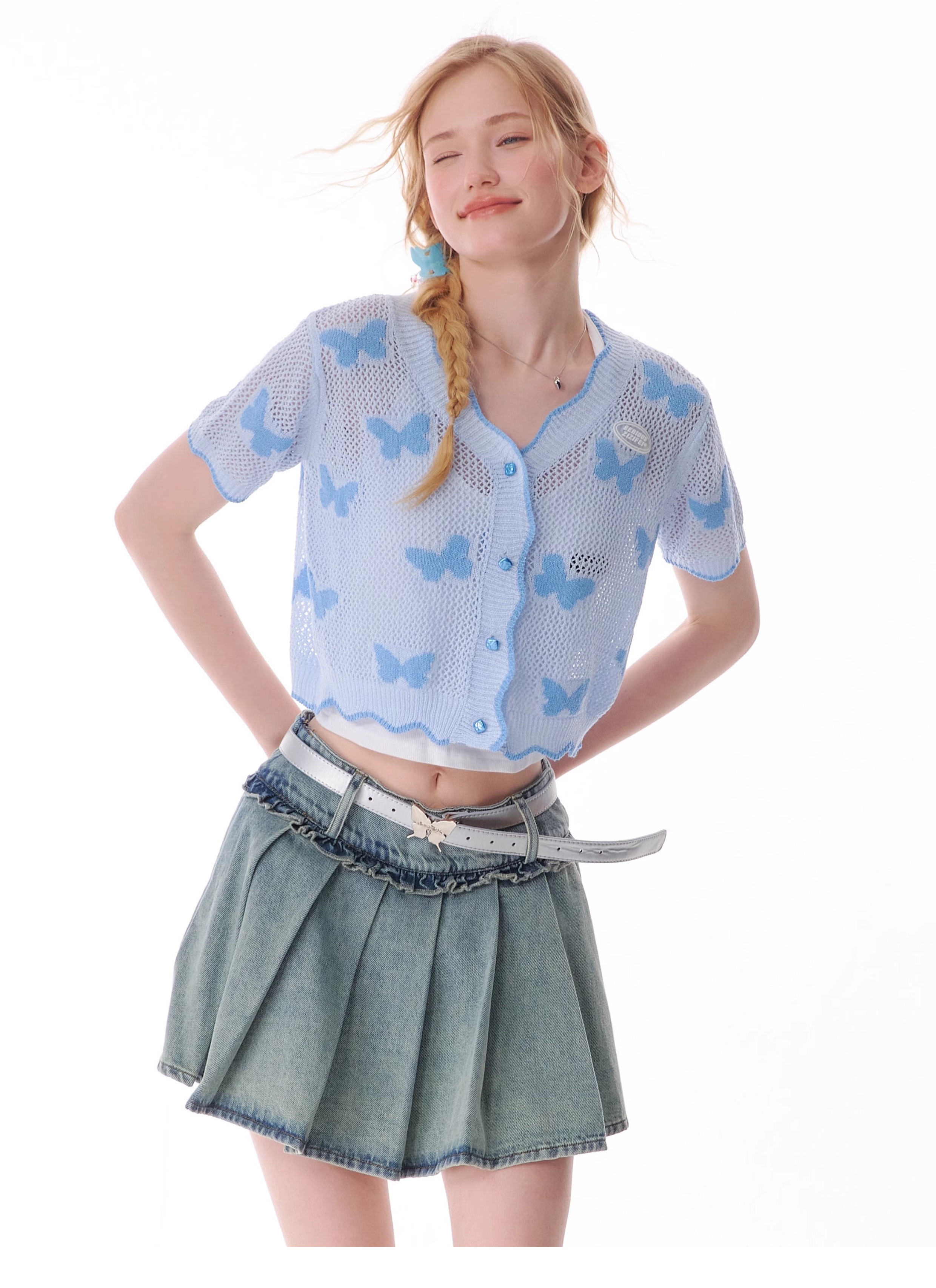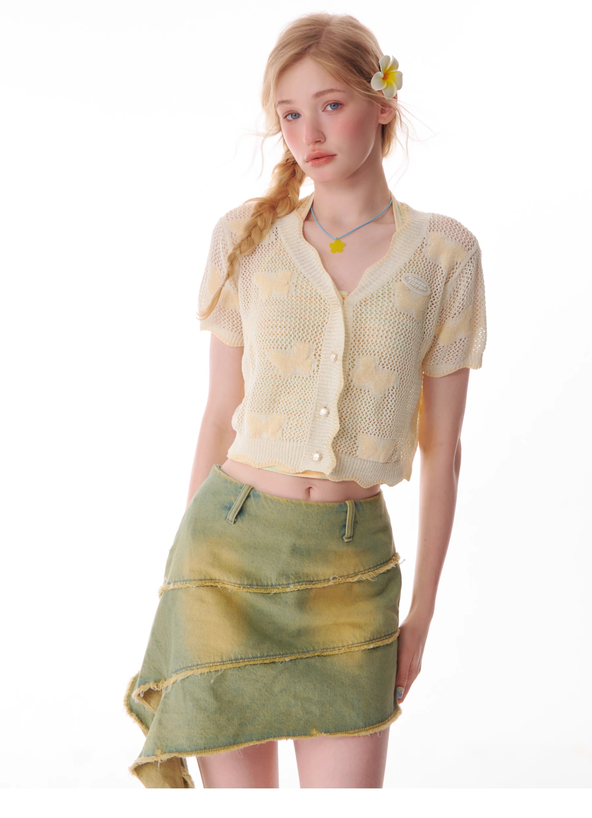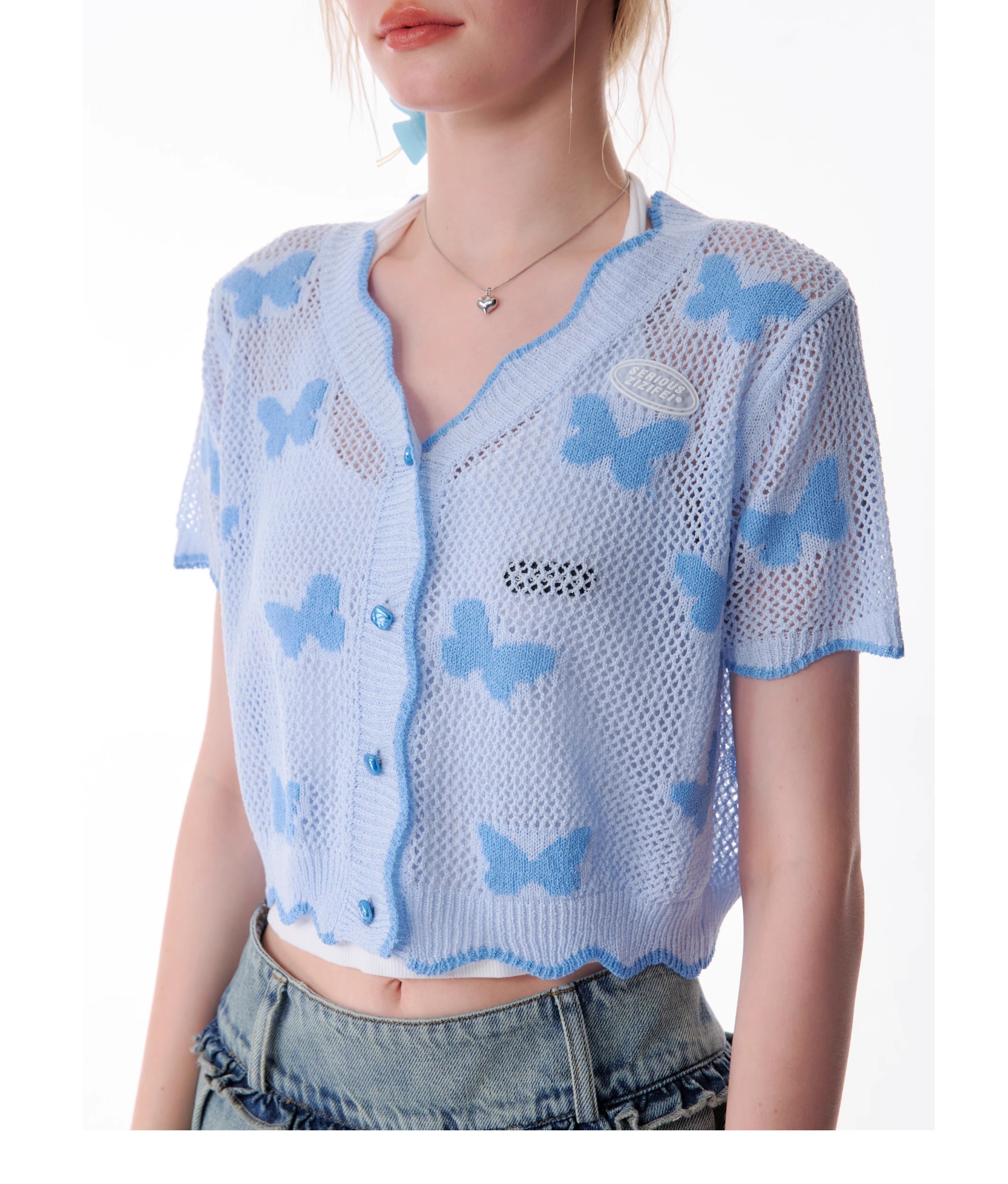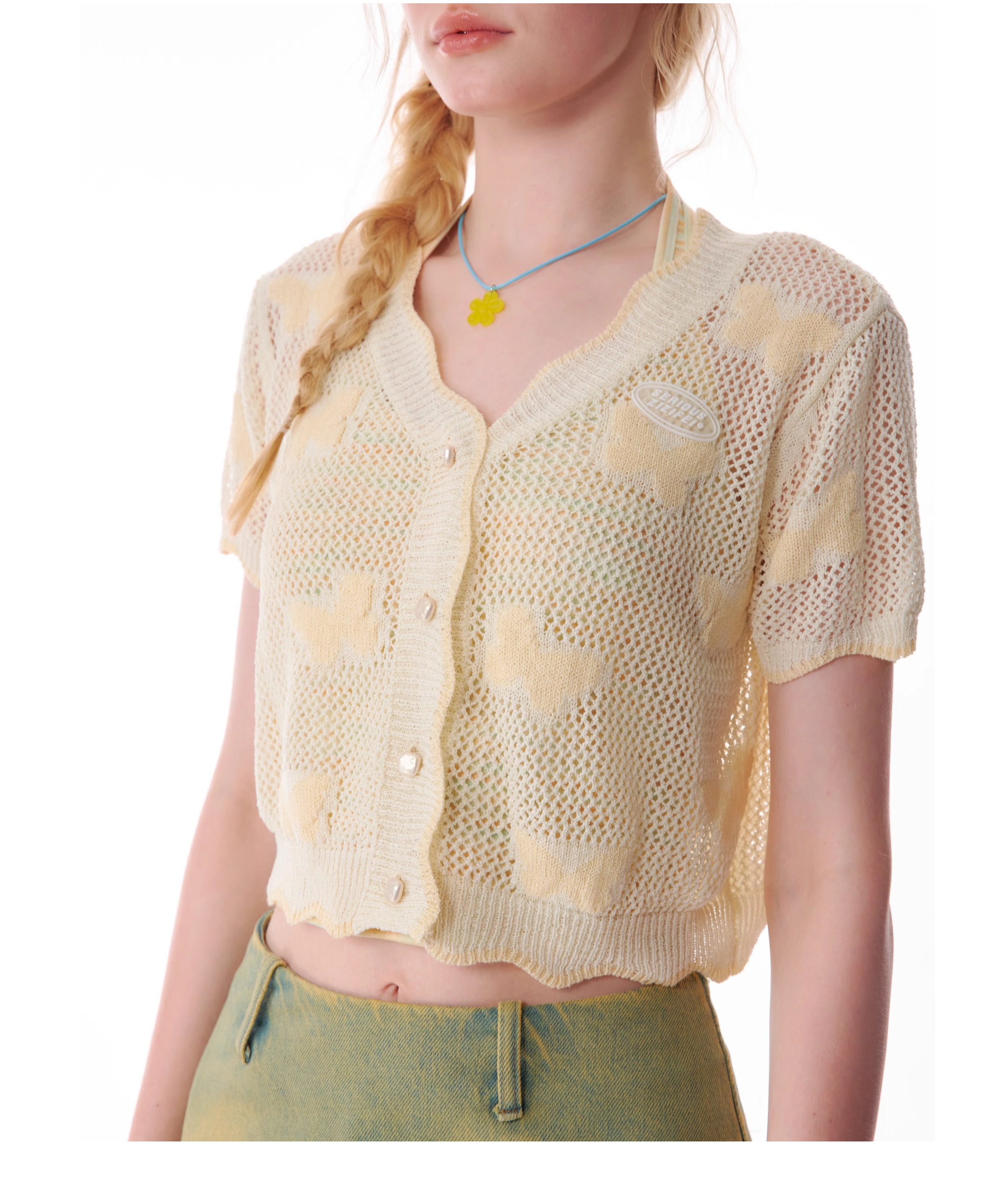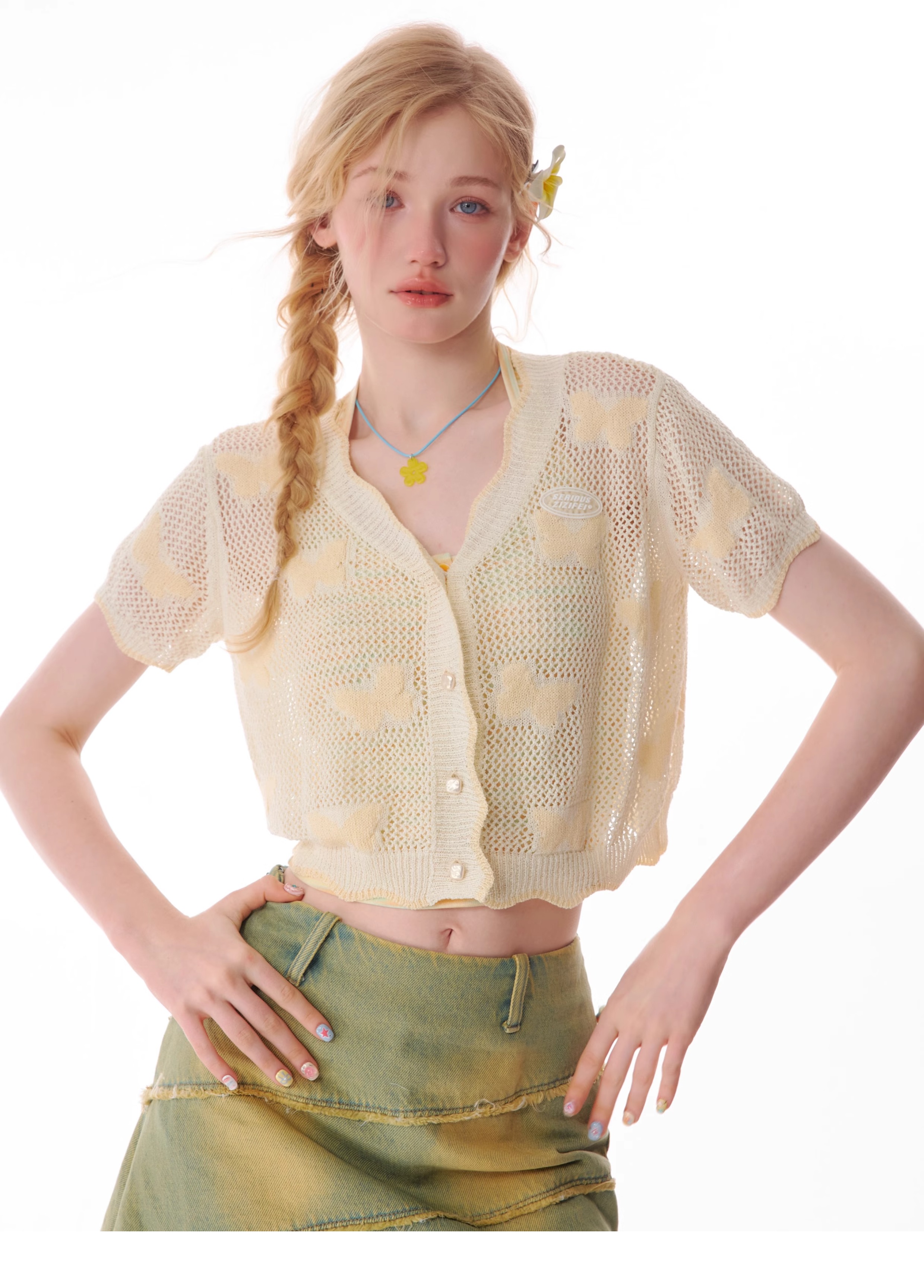 T-shirt à manches courtes tricoté creux papillon | Cardigan de protection solaire rétro d'été