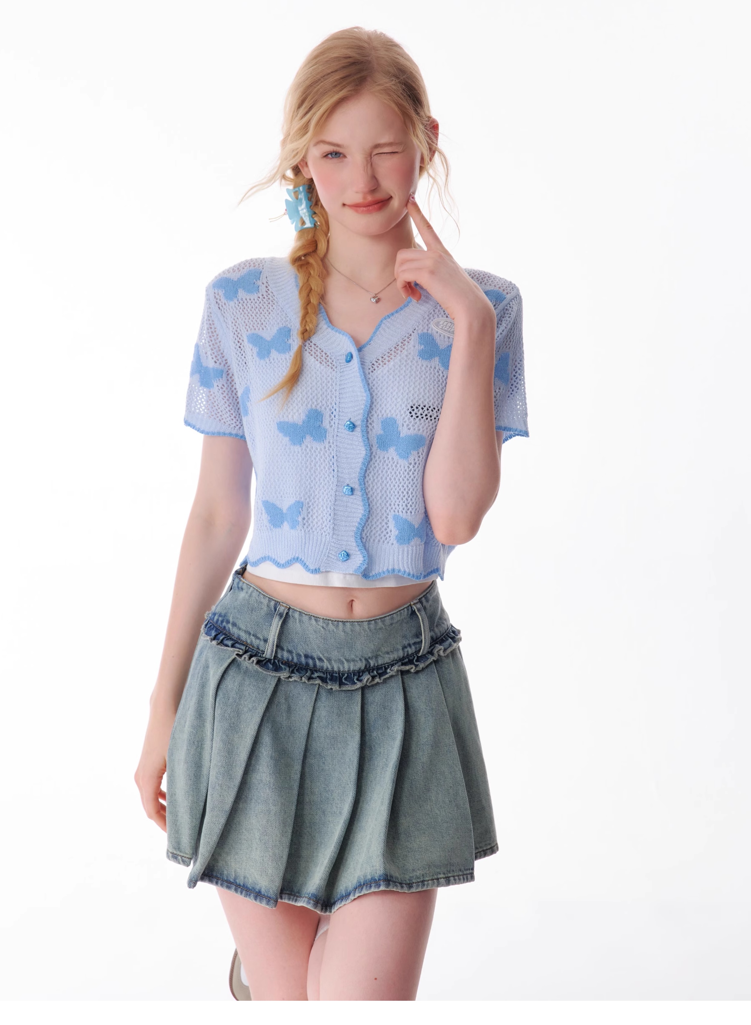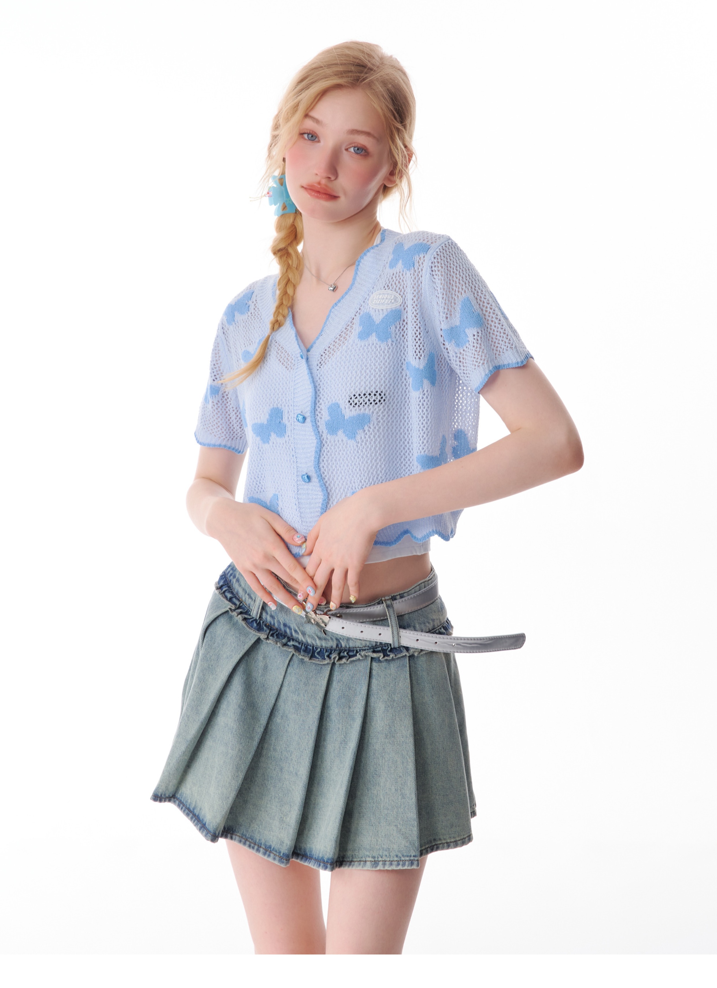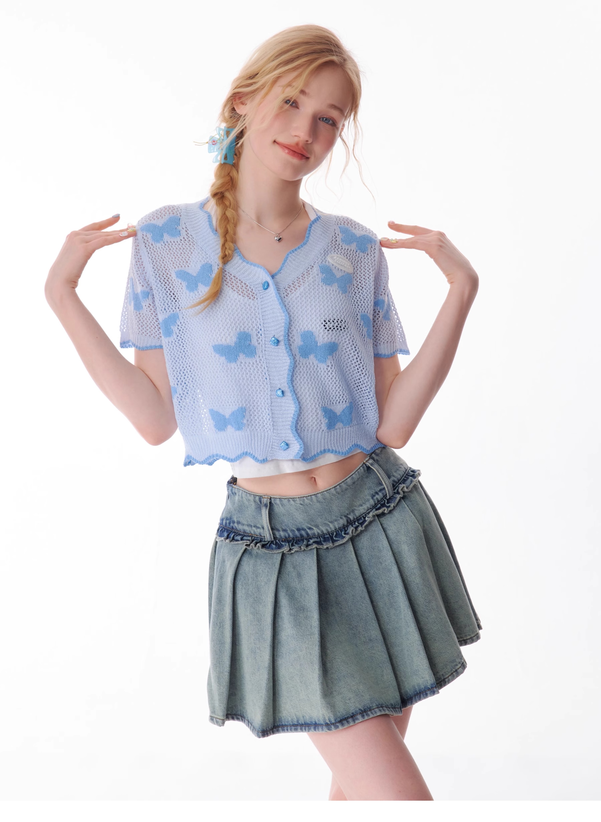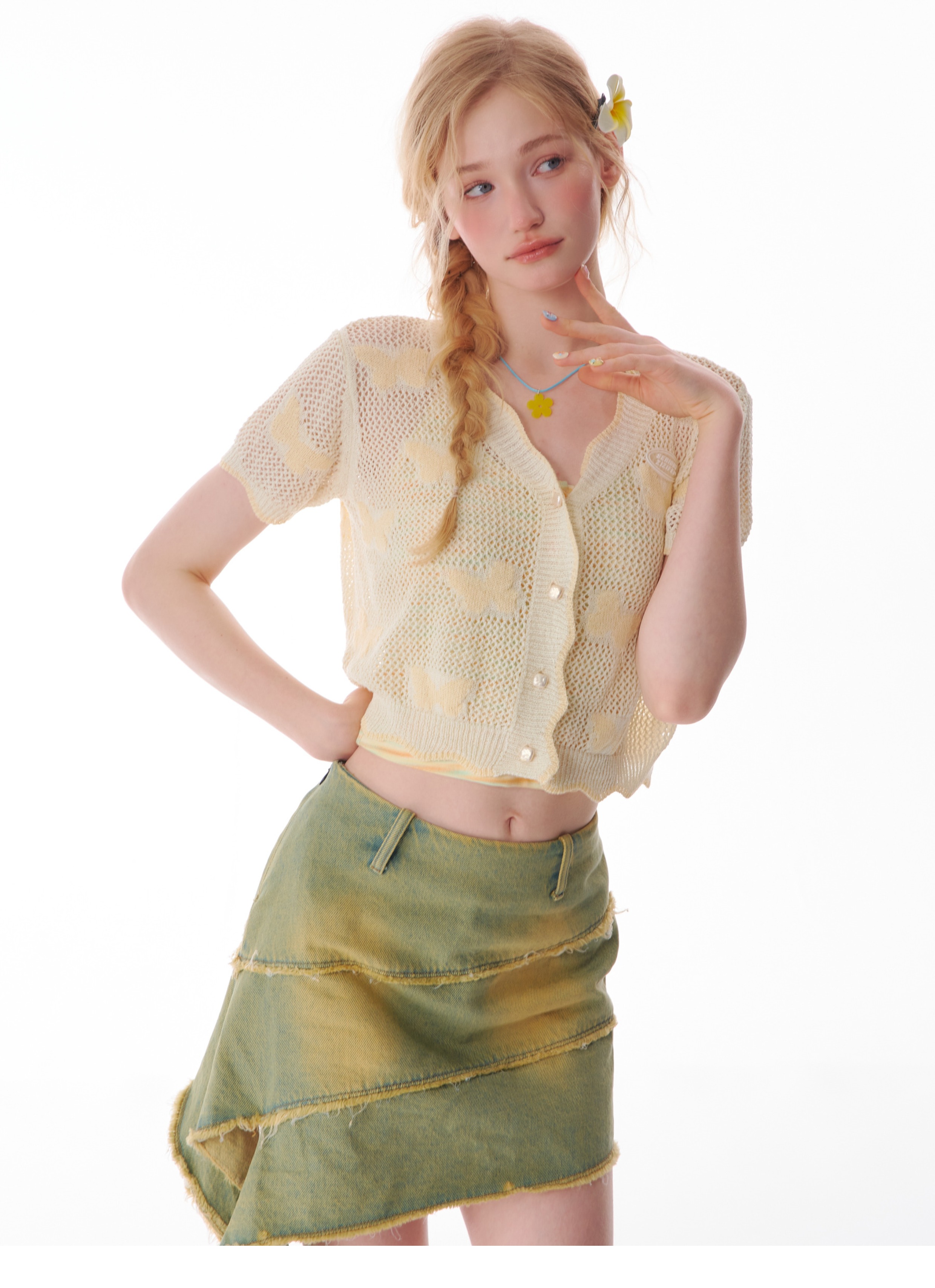 T-shirt à manches courtes tricoté creux papillon | Cardigan de protection solaire rétro d'été