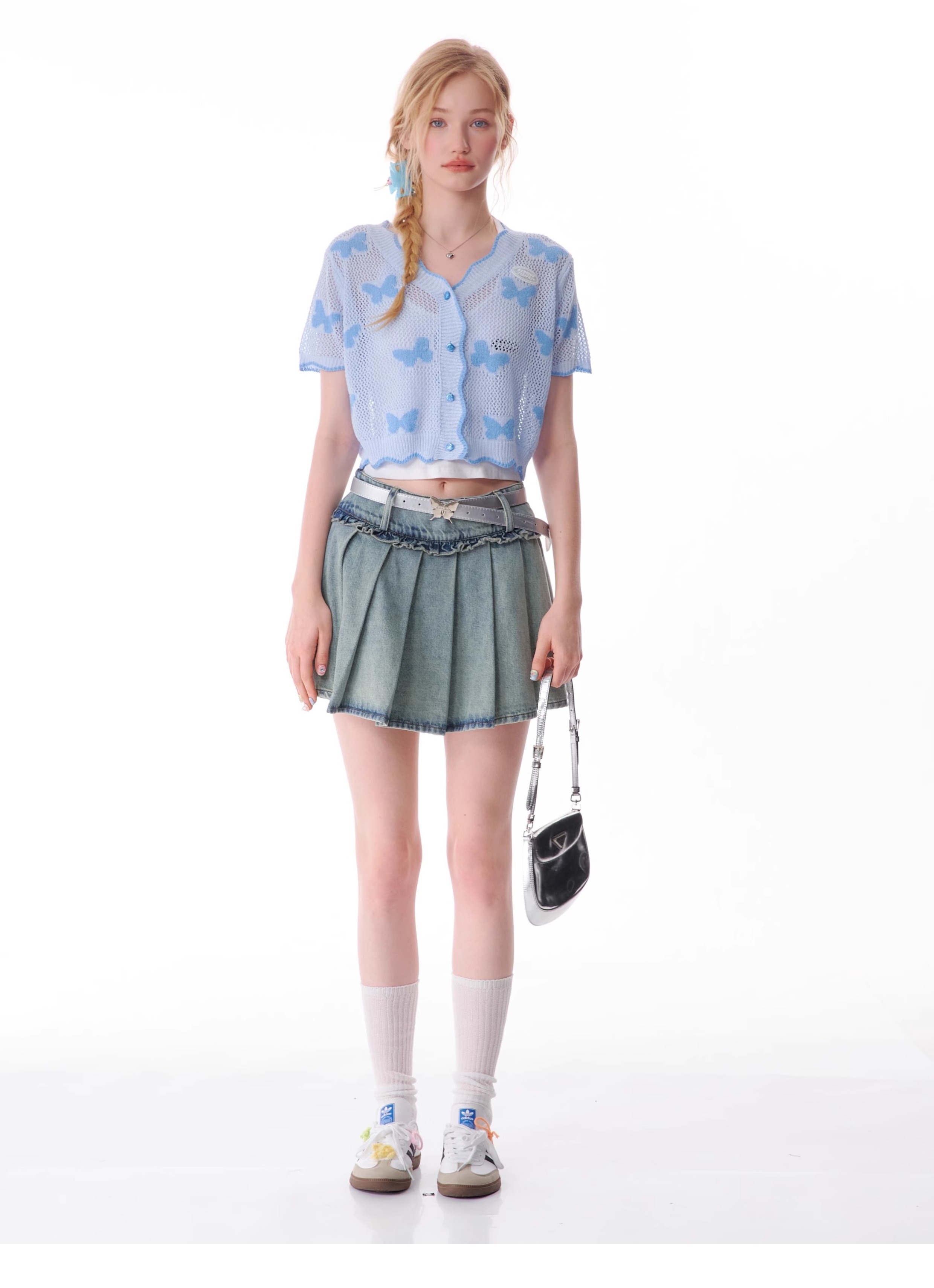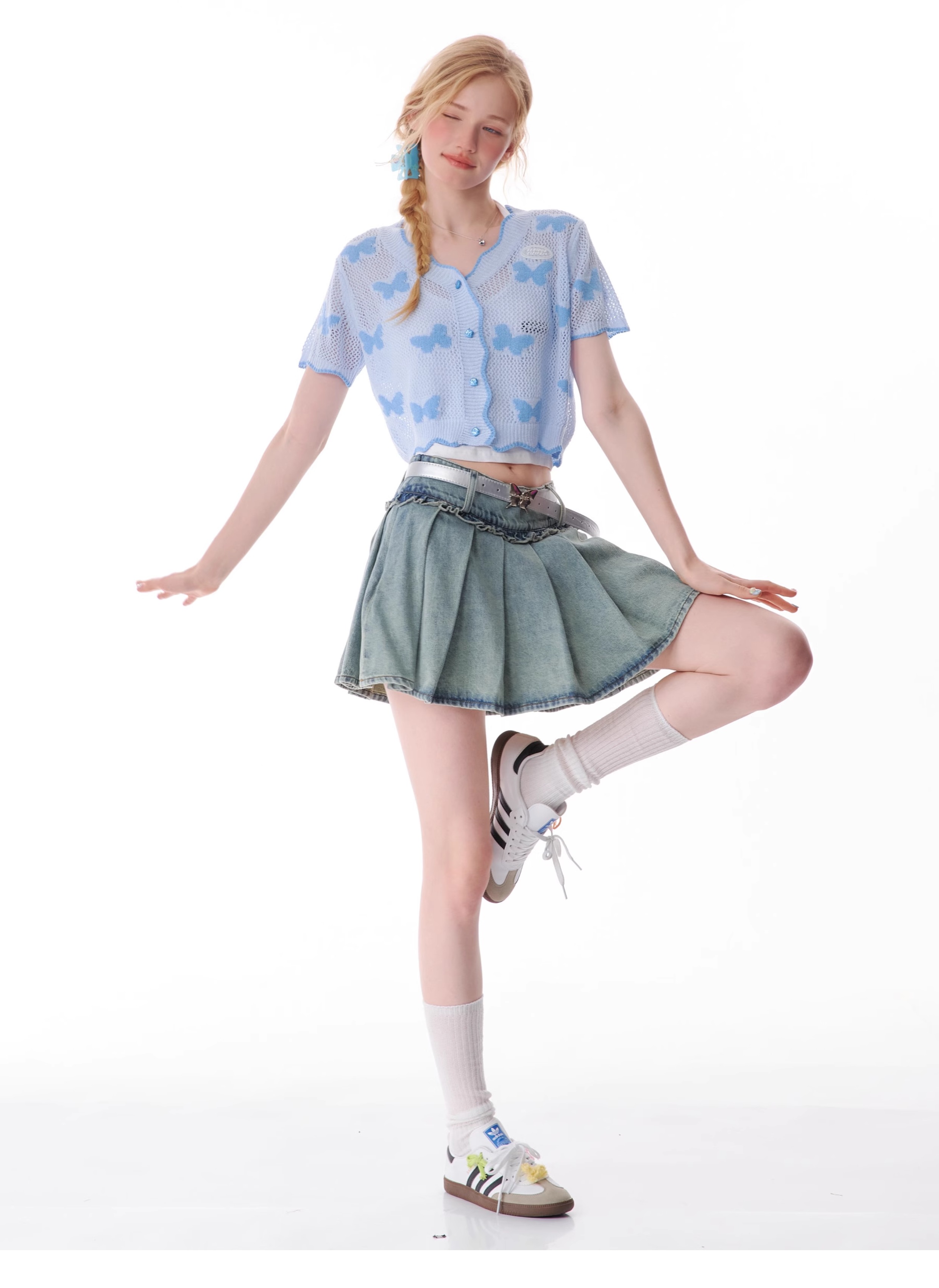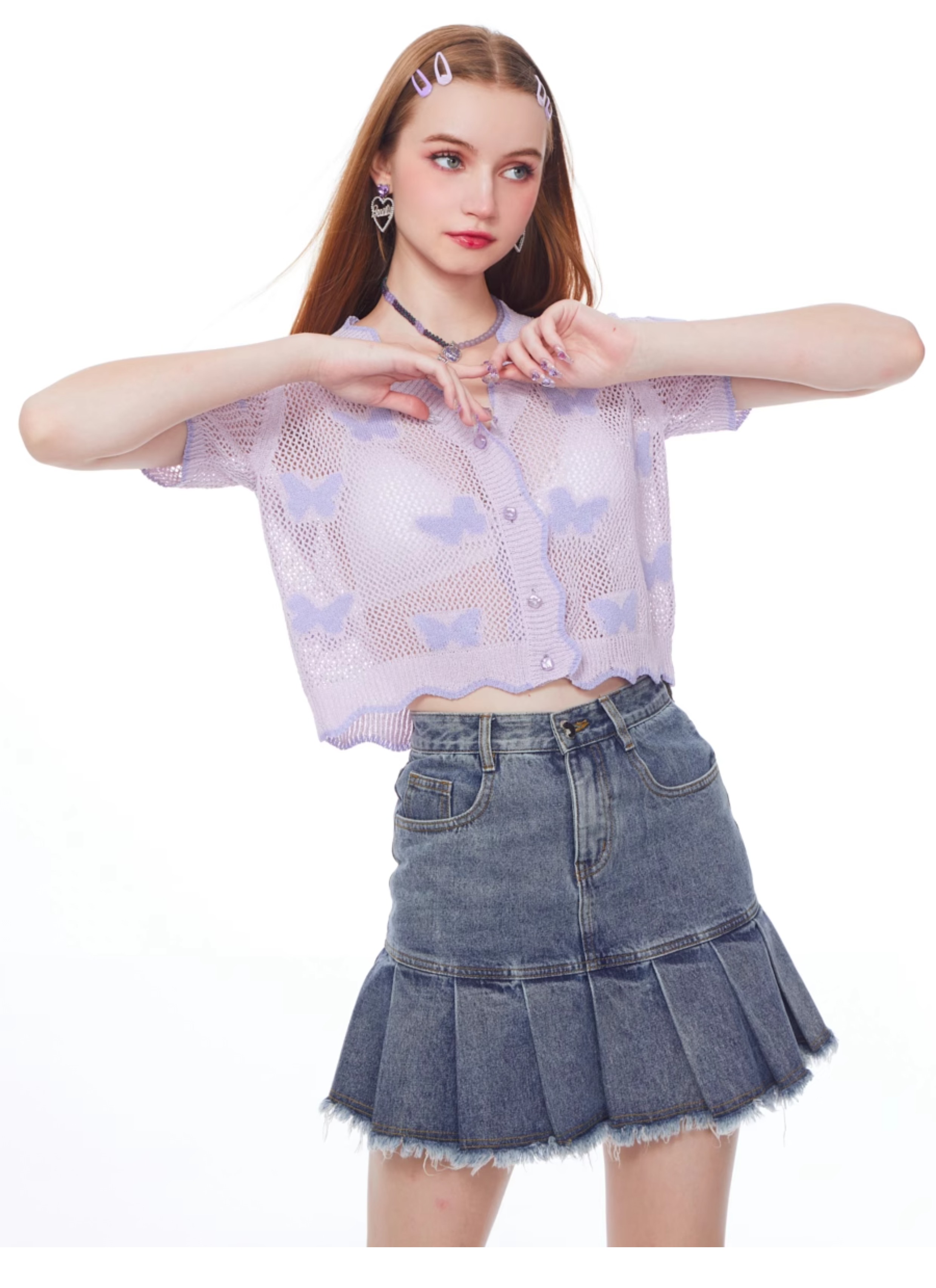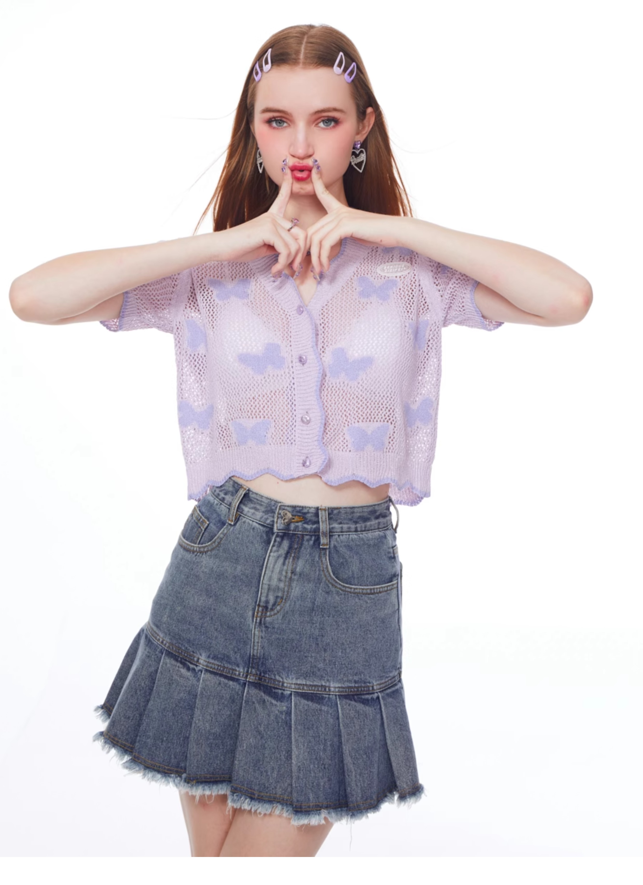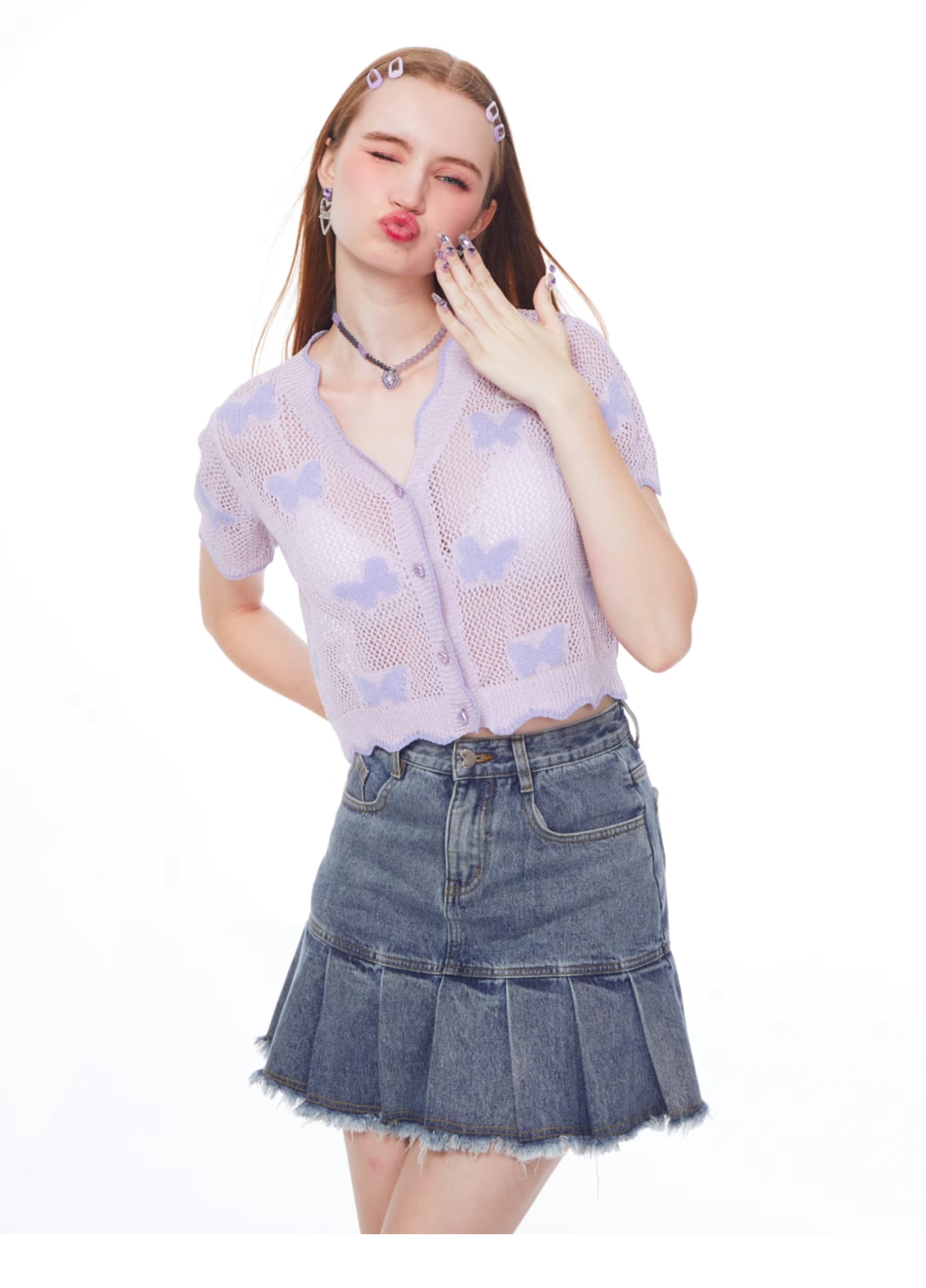 T-shirt à manches courtes tricoté creux papillon | Cardigan de protection solaire rétro d'été