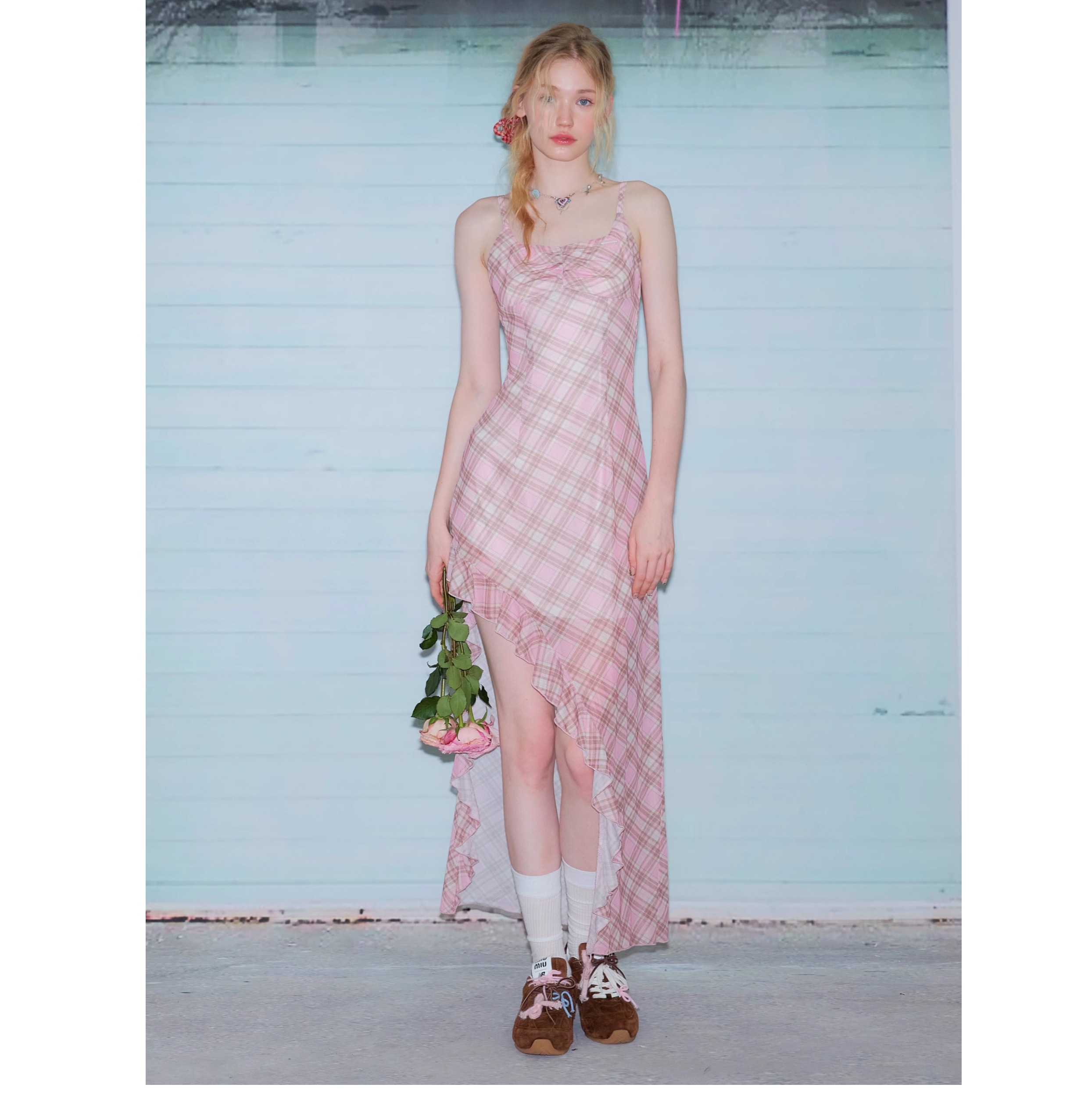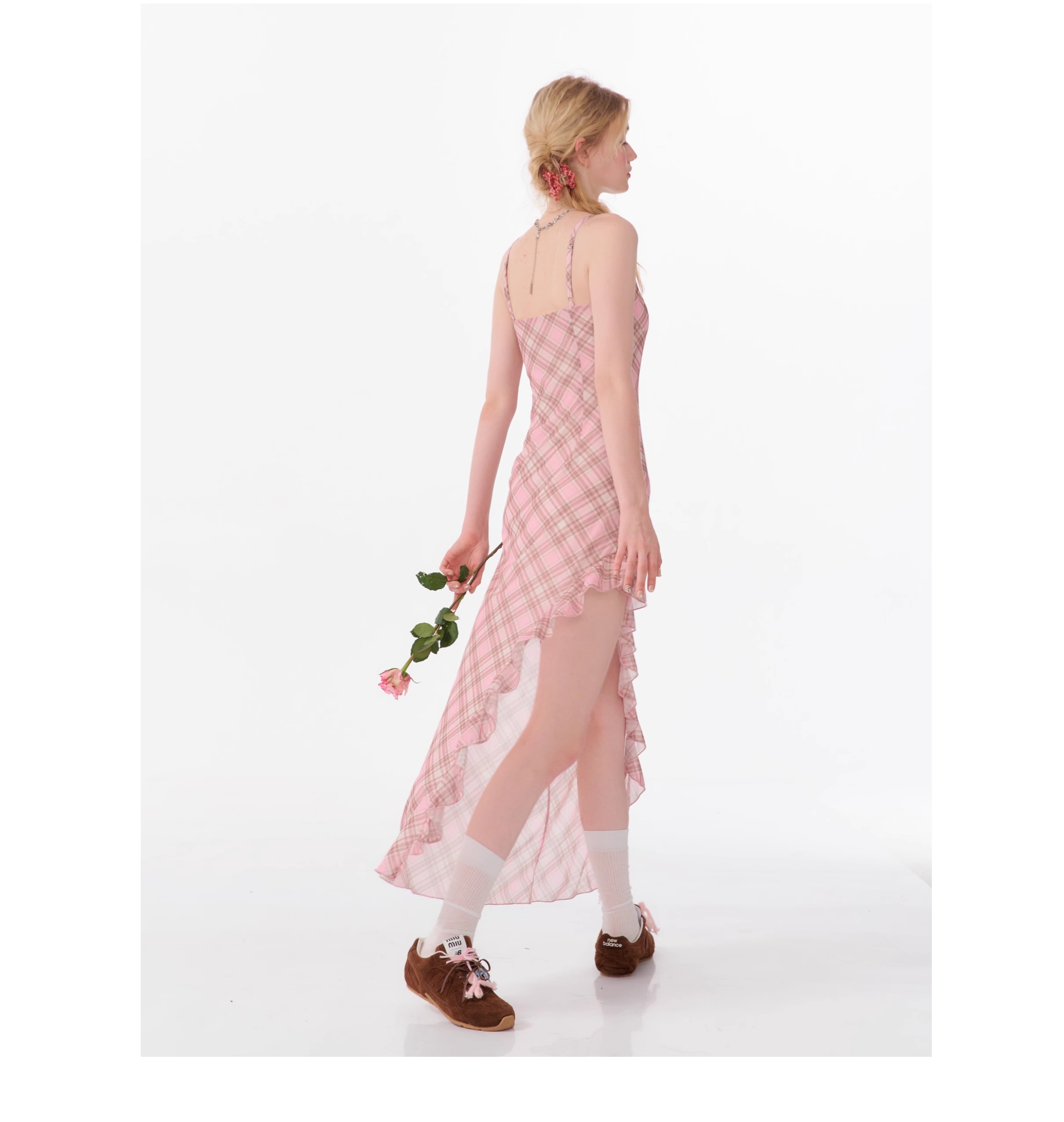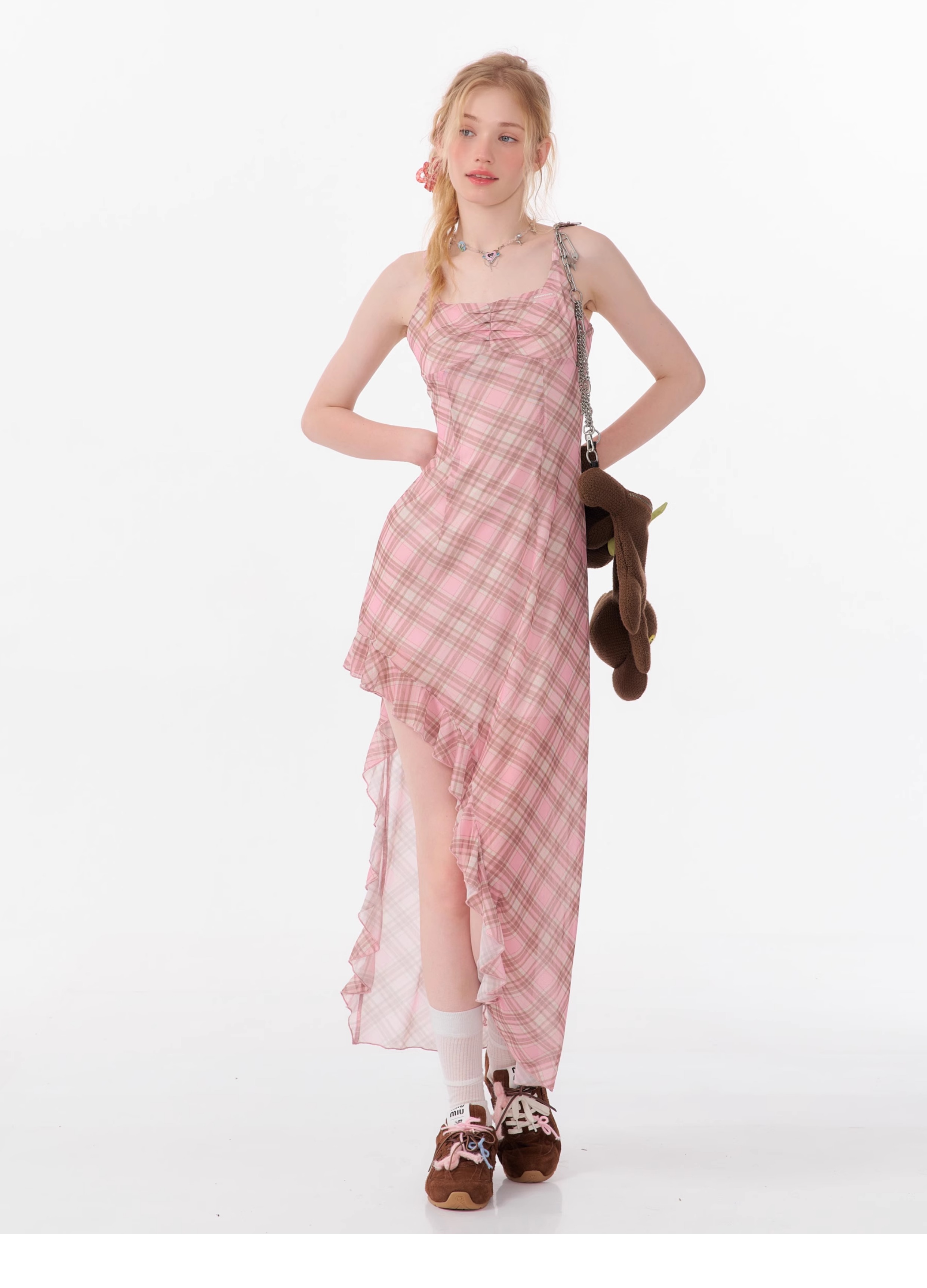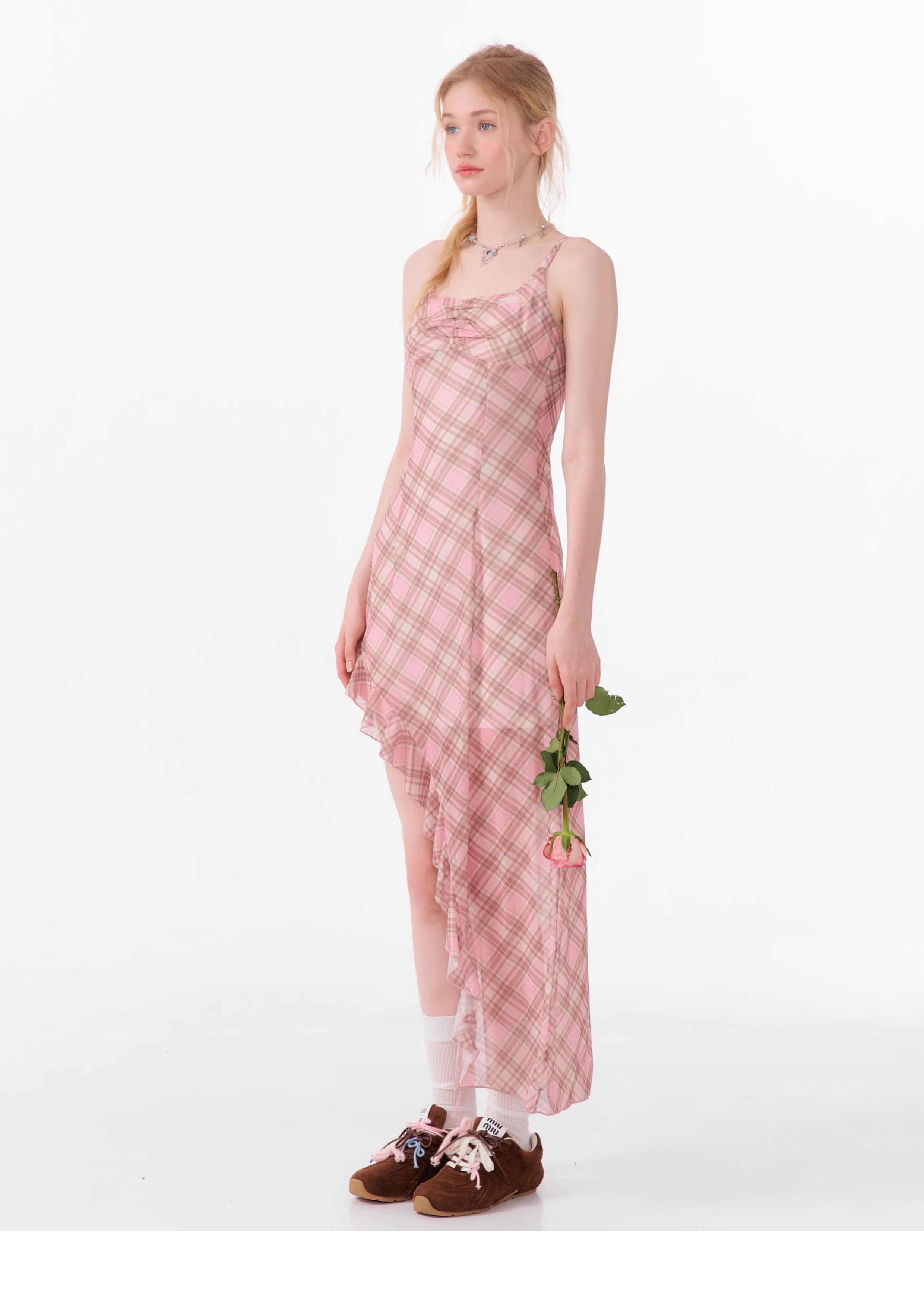 Robe camisole à carreaux rose | Conception d’été coupe slim irrégulière