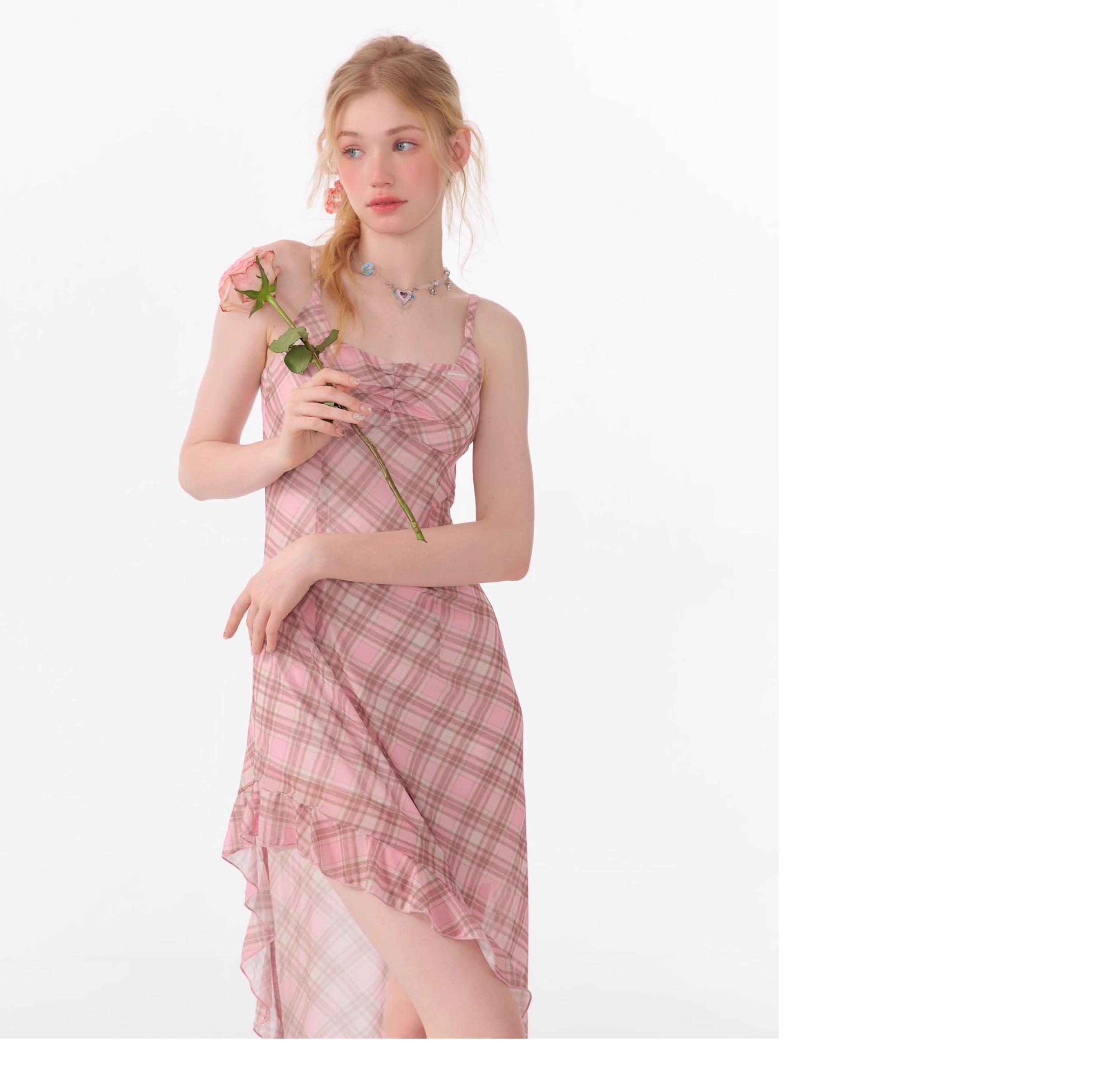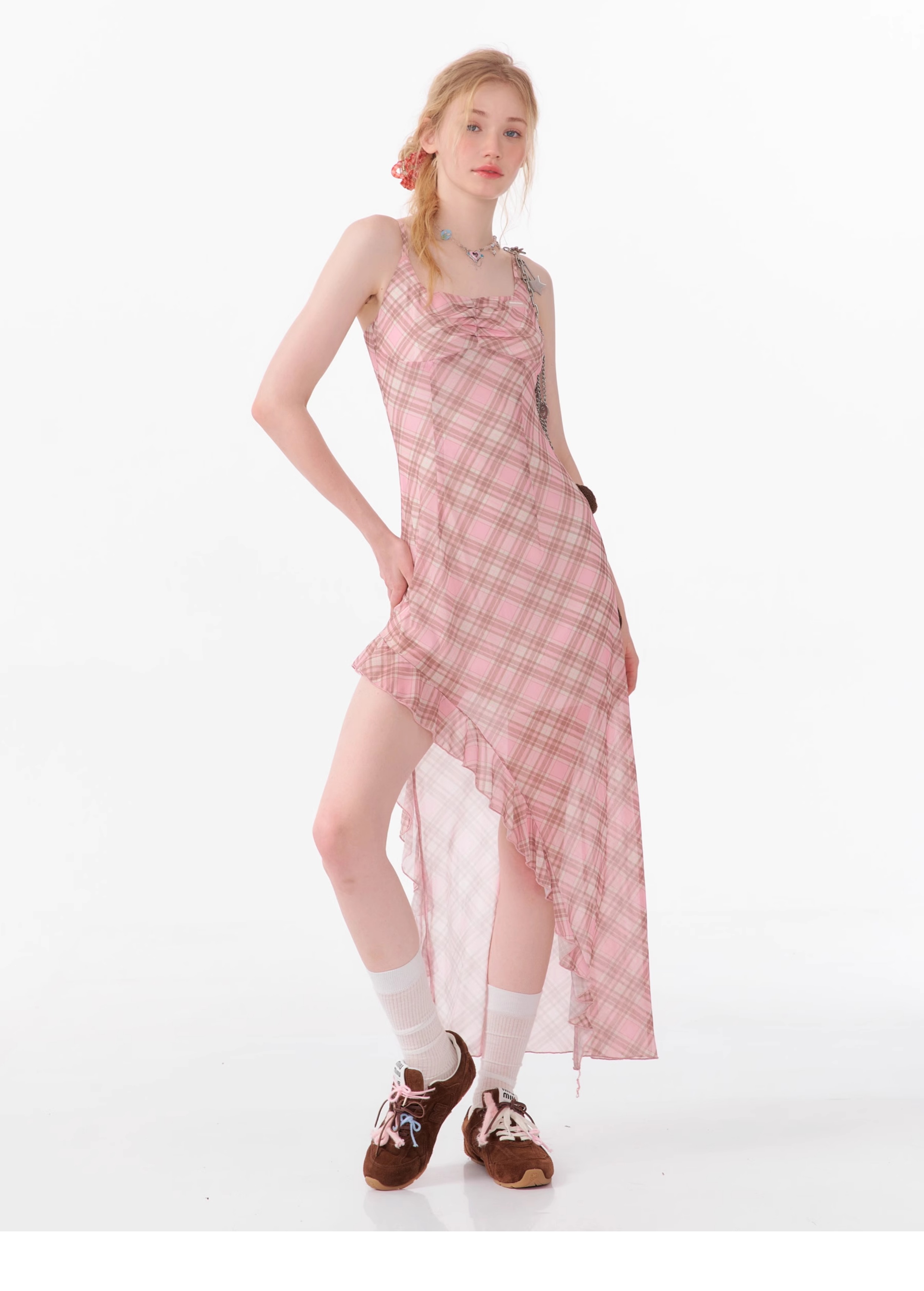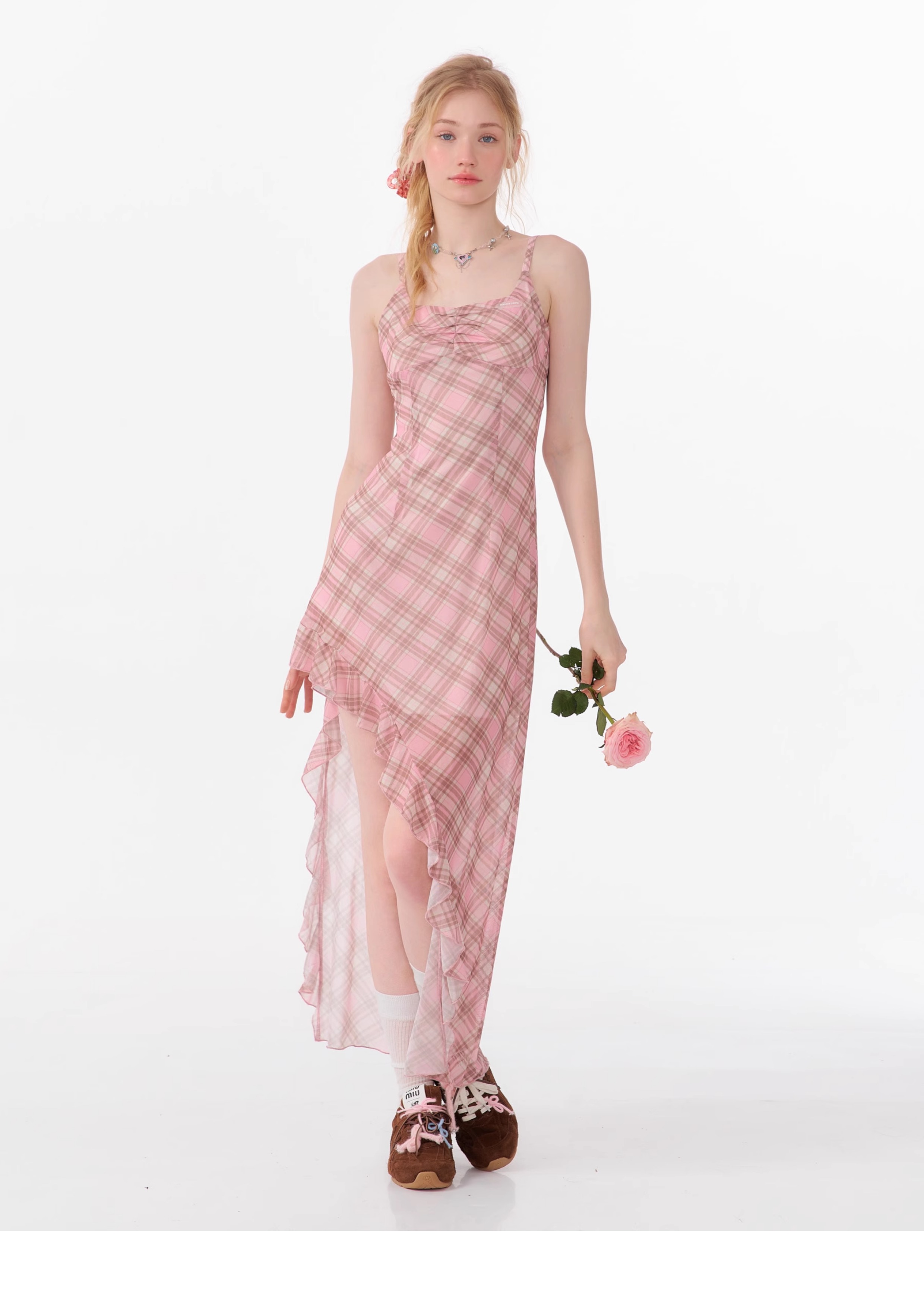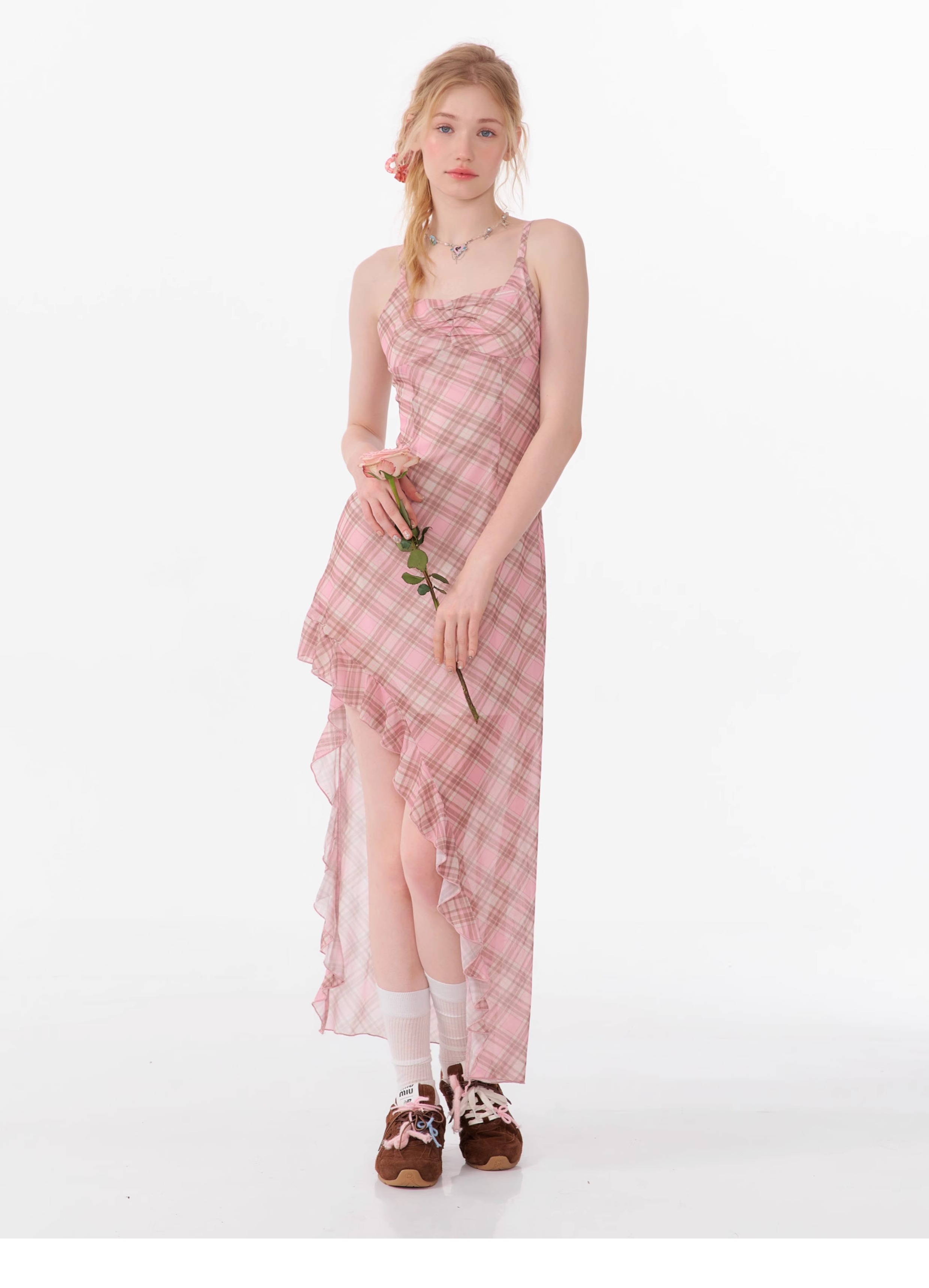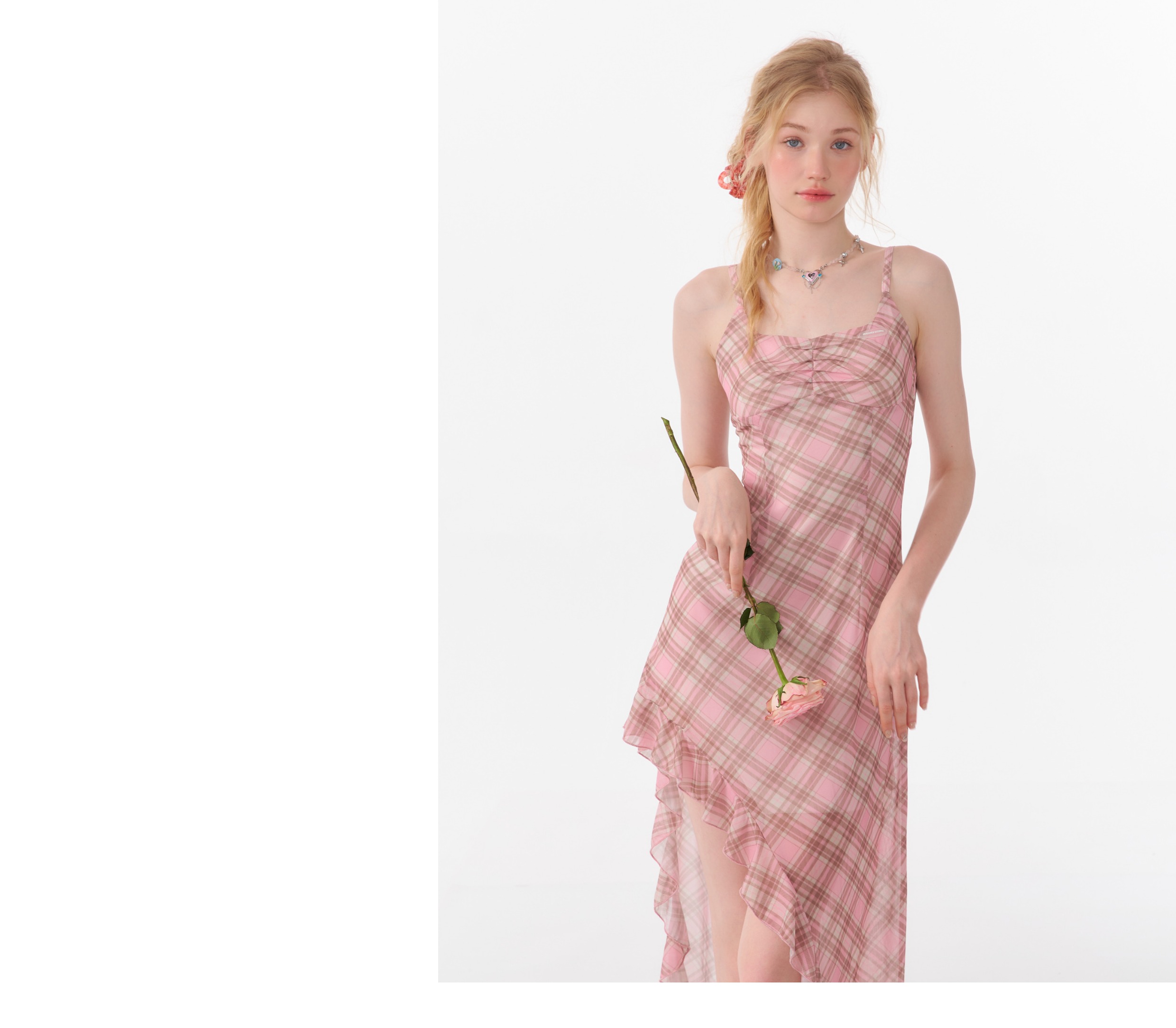 Robe camisole à carreaux rose | Conception d’été coupe slim irrégulière