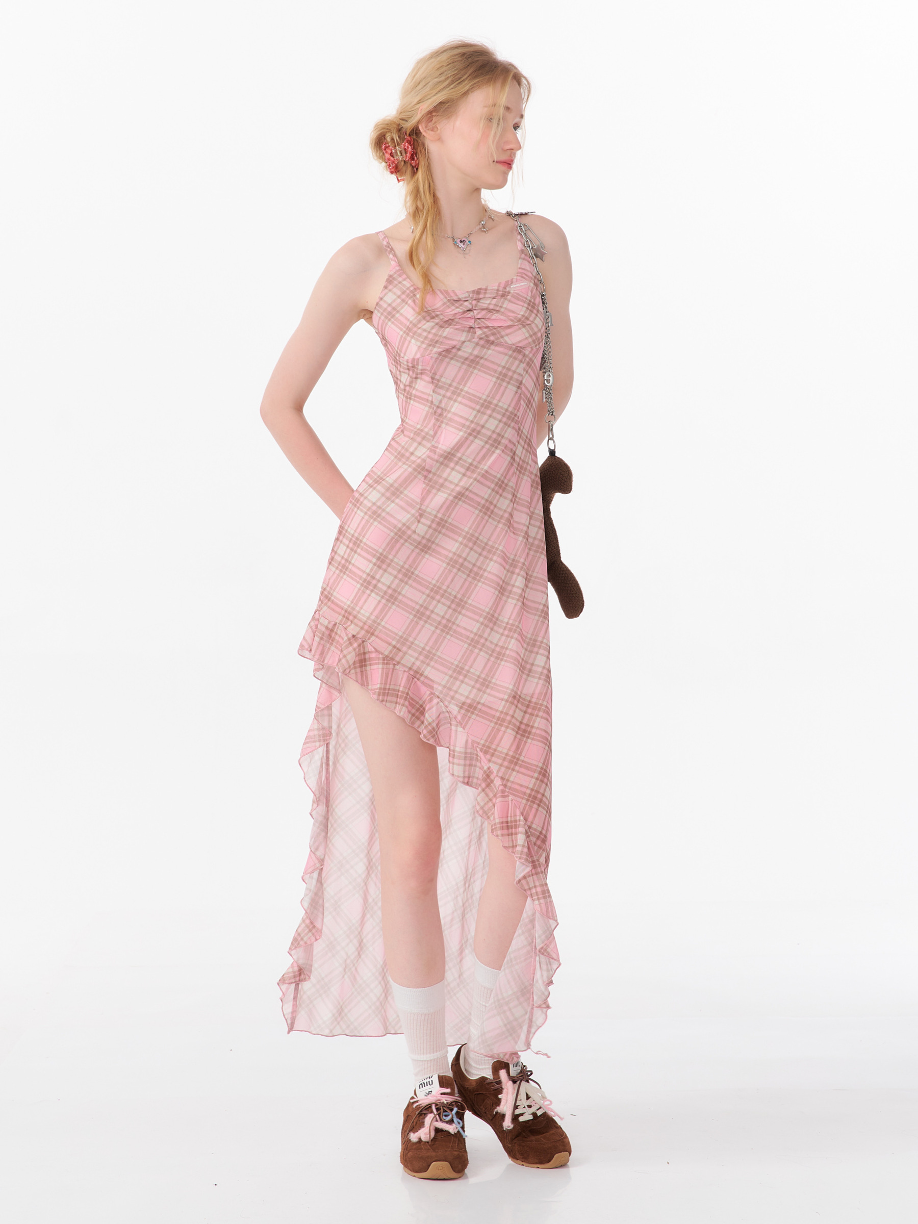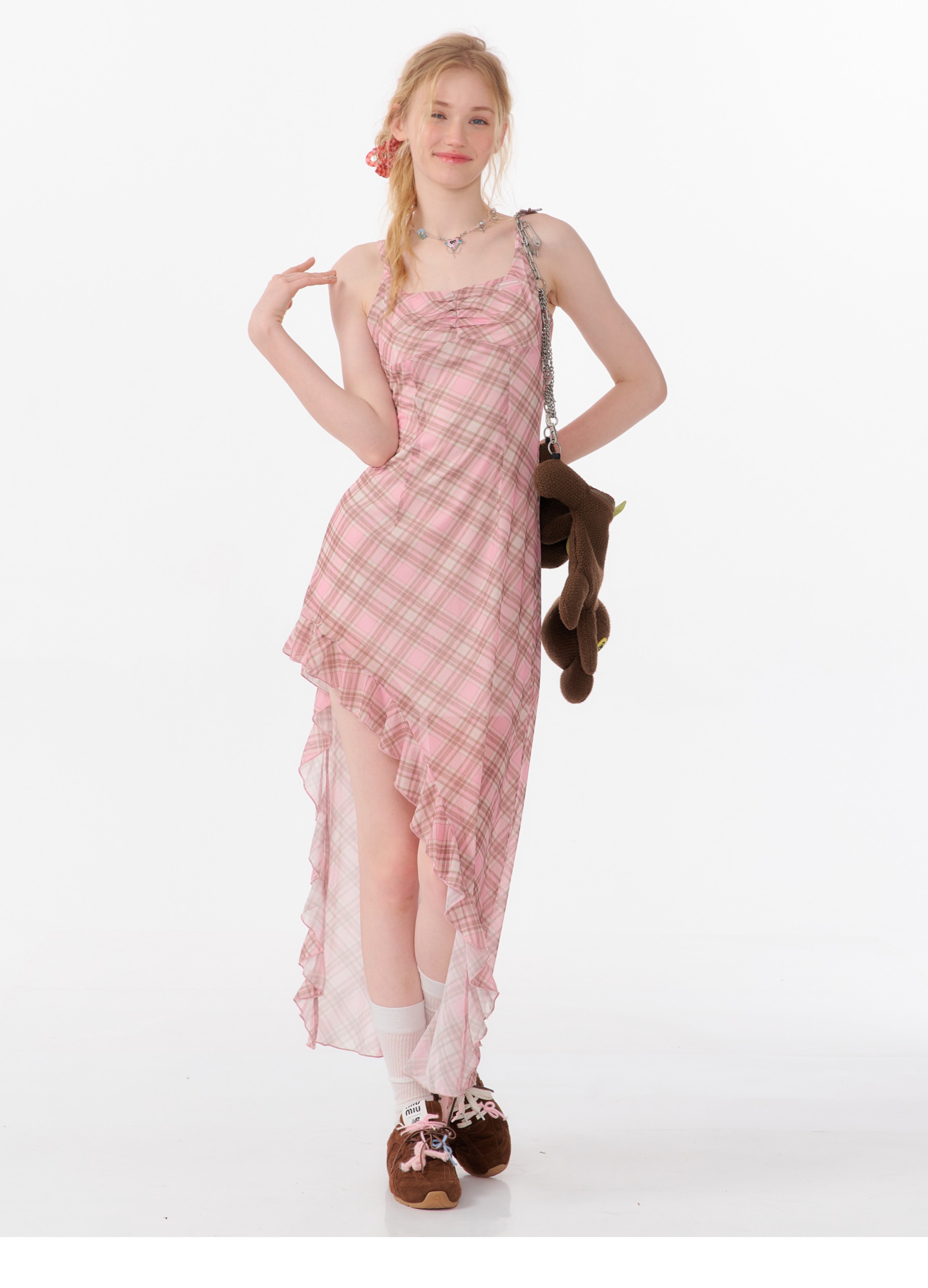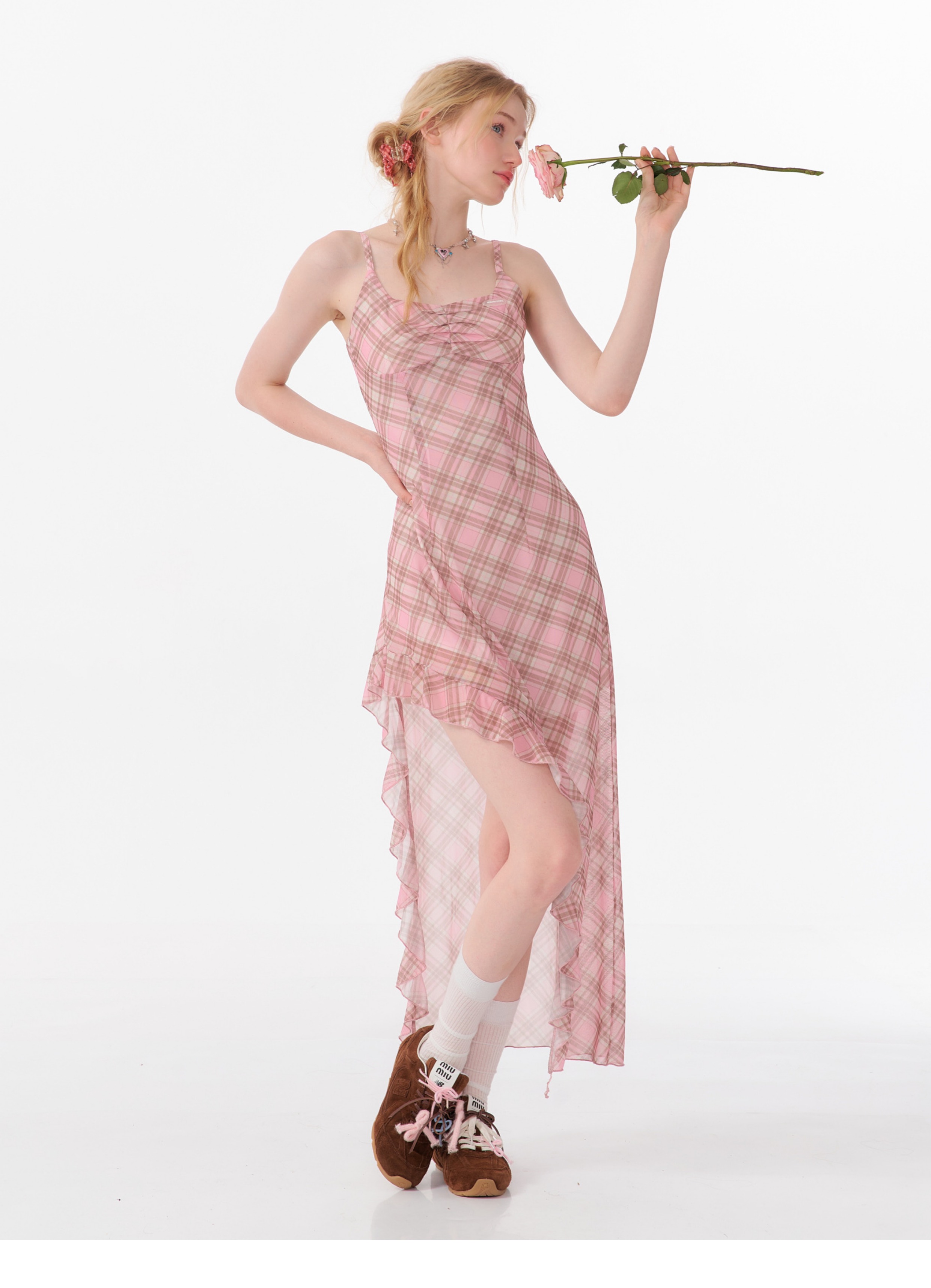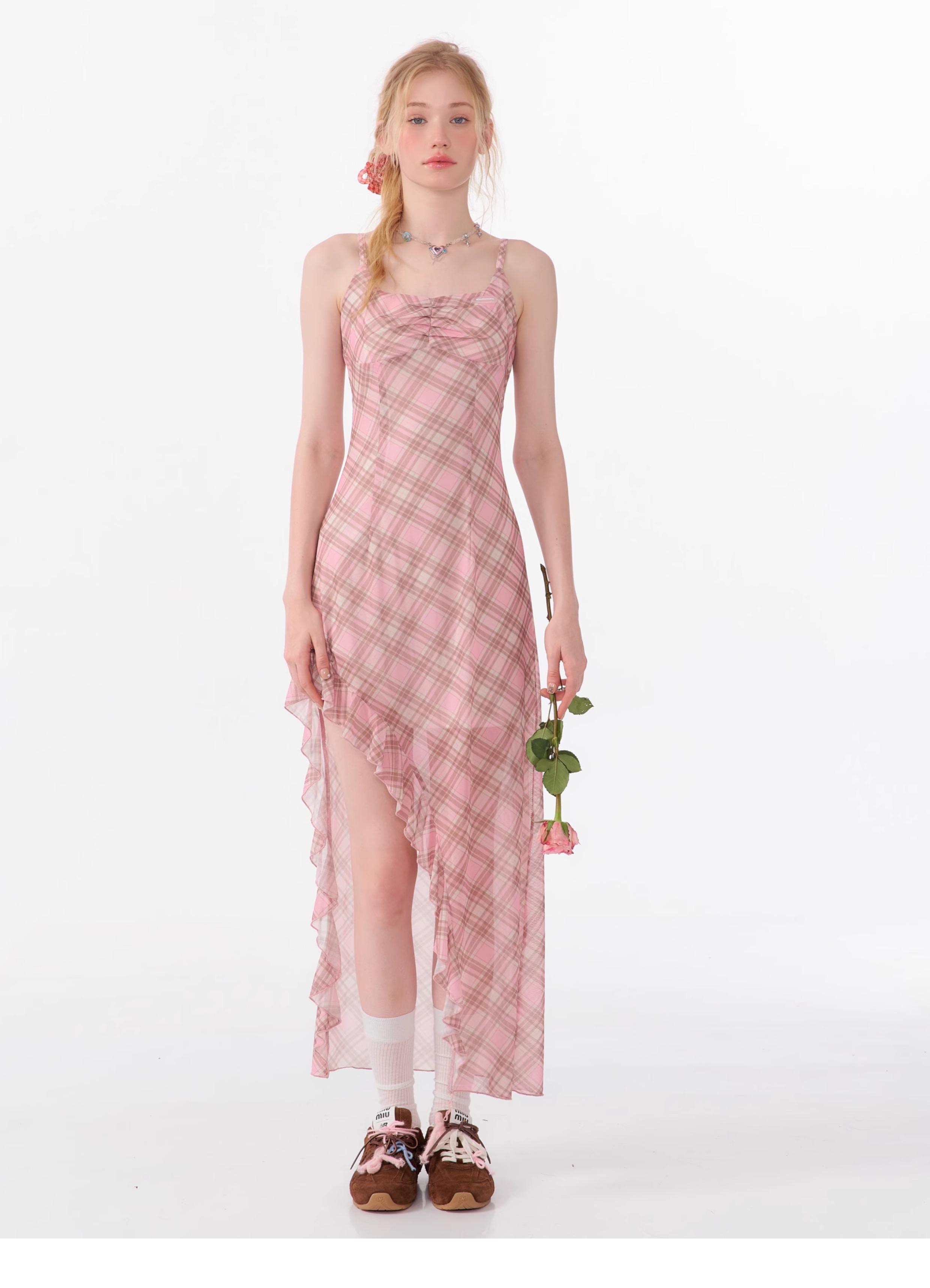 Robe camisole à carreaux rose | Conception d’été coupe slim irrégulière