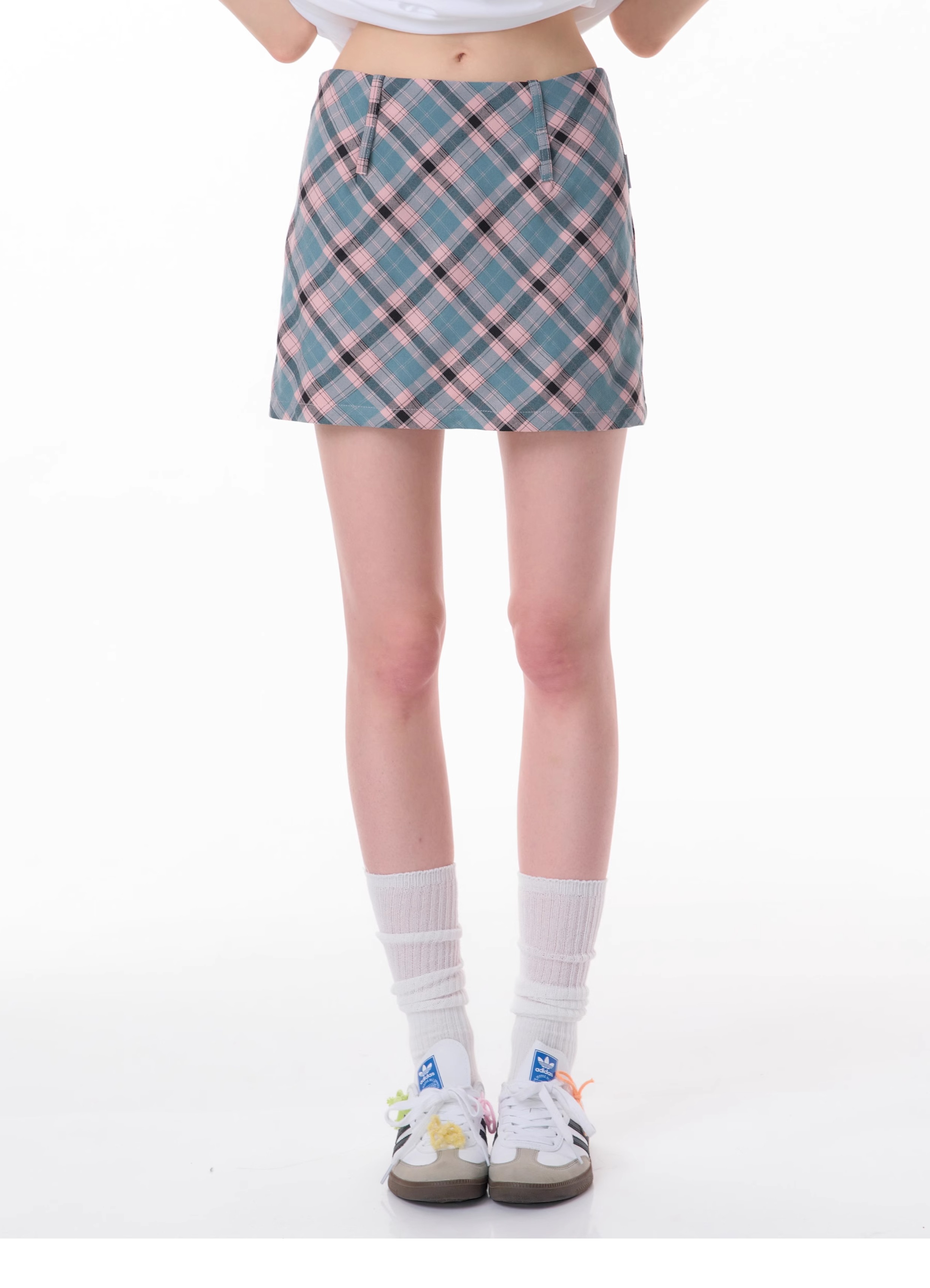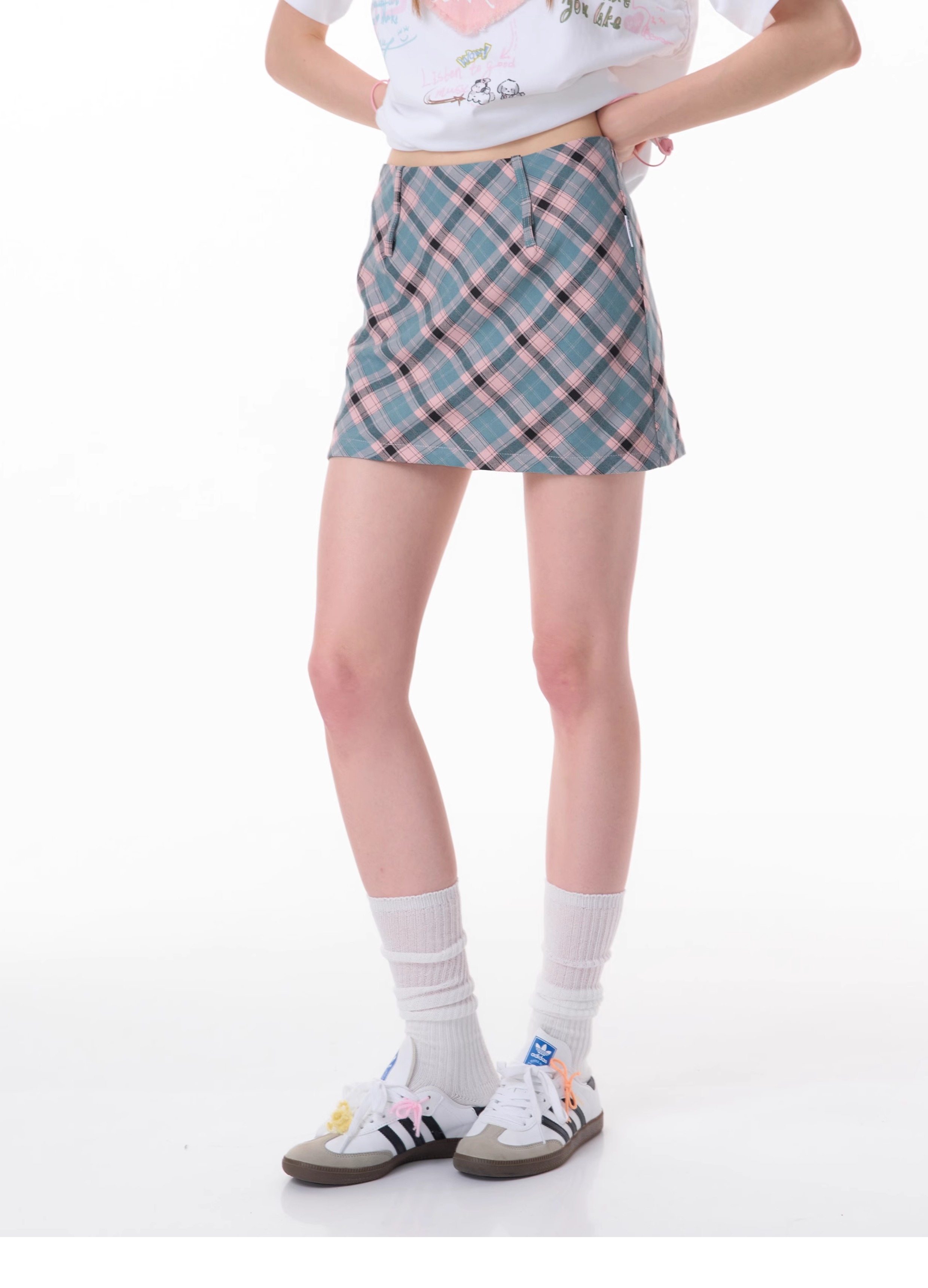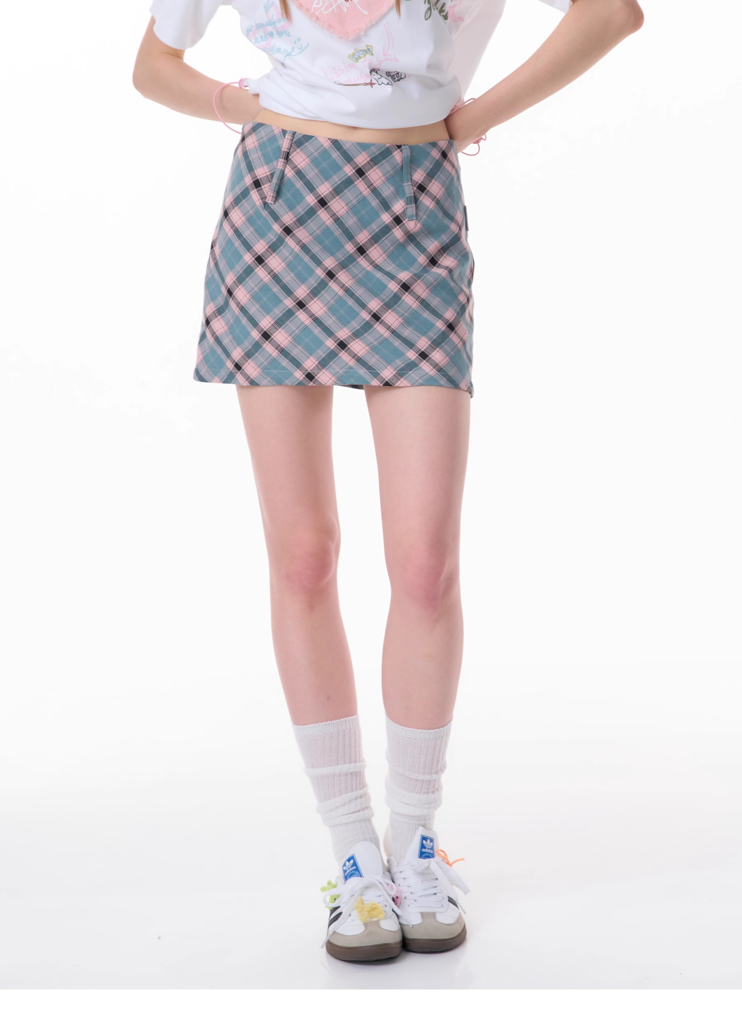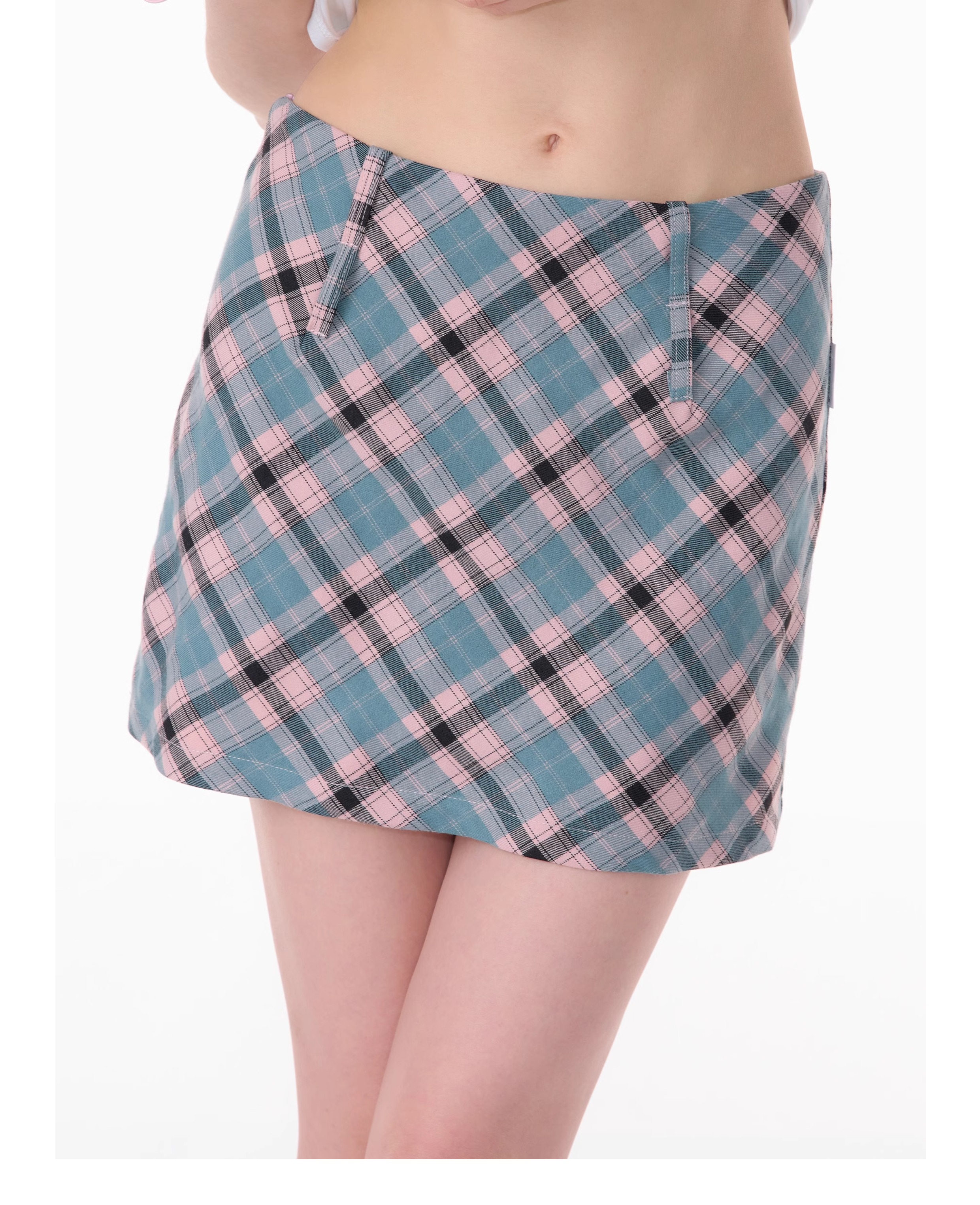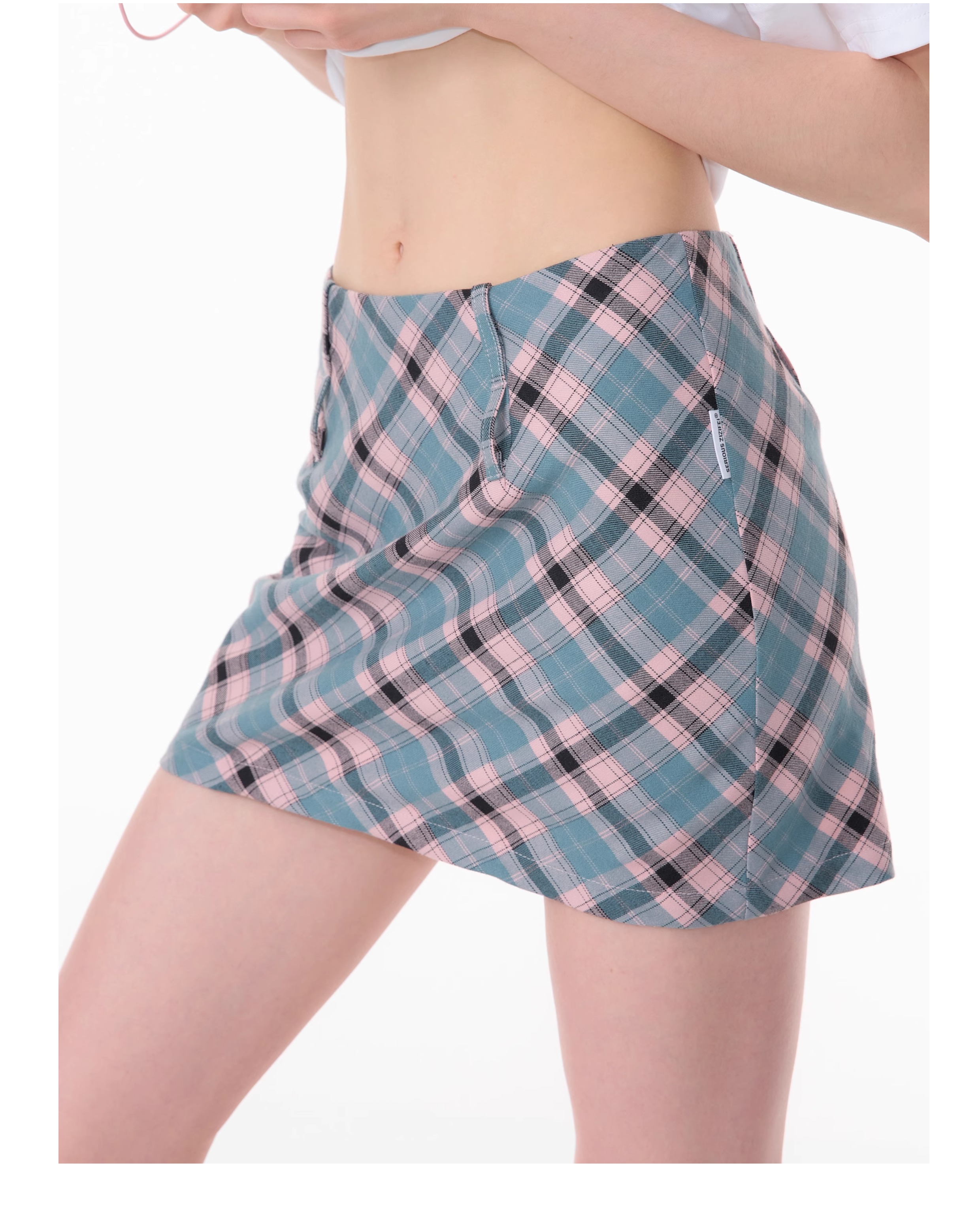 Jupe trapèze à carreaux rose et bleu | Coupe slim rétro taille haute pour l’été