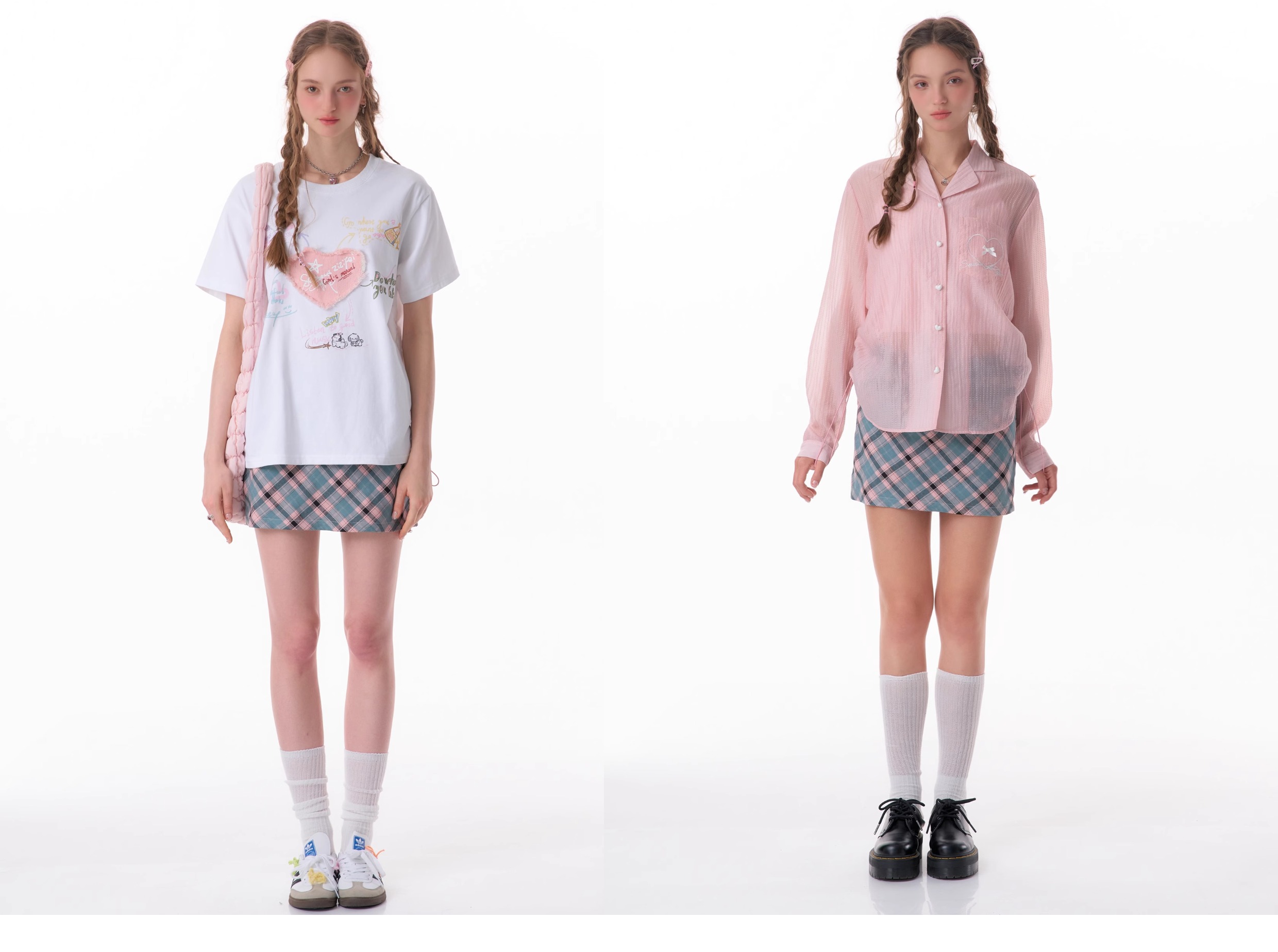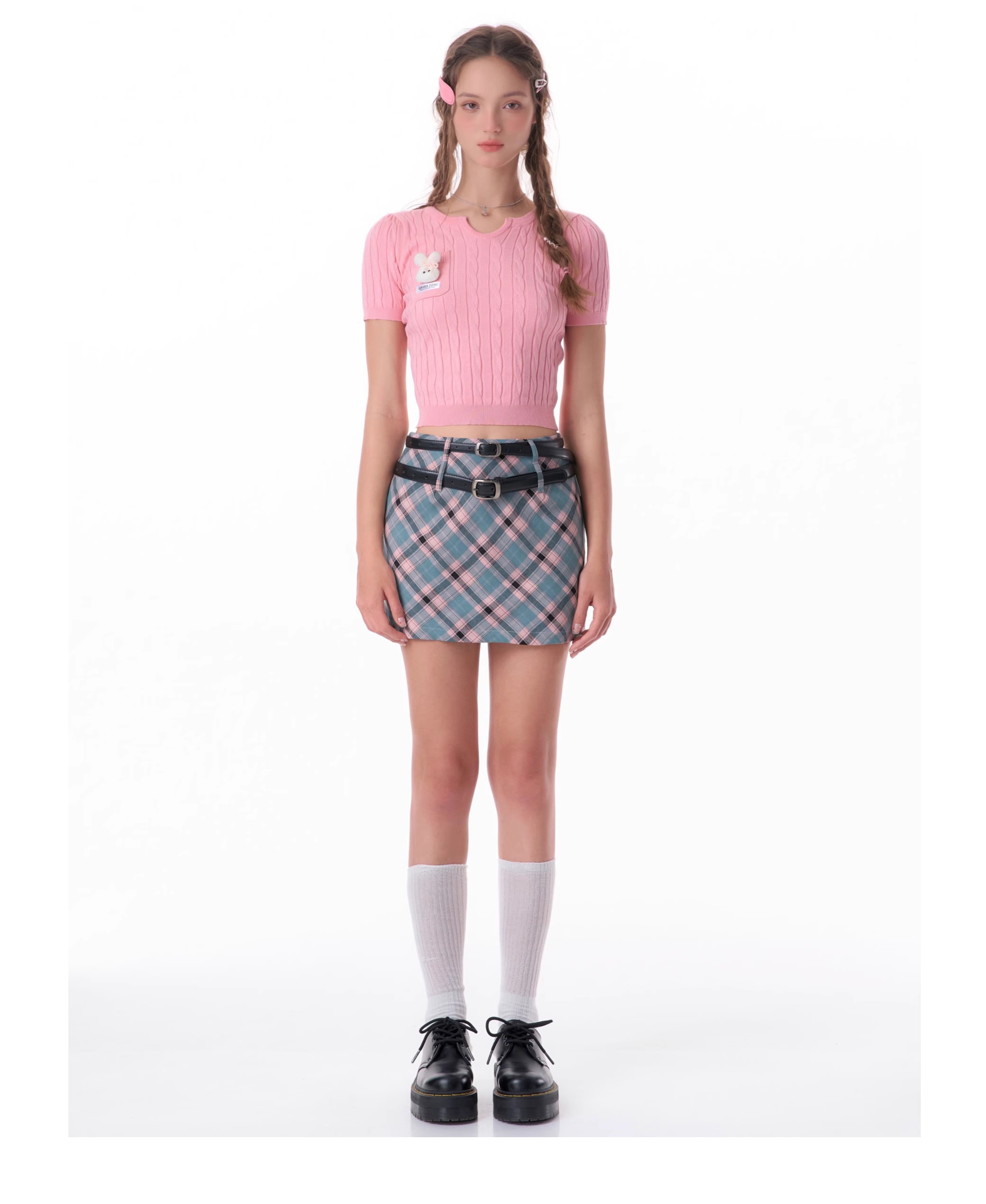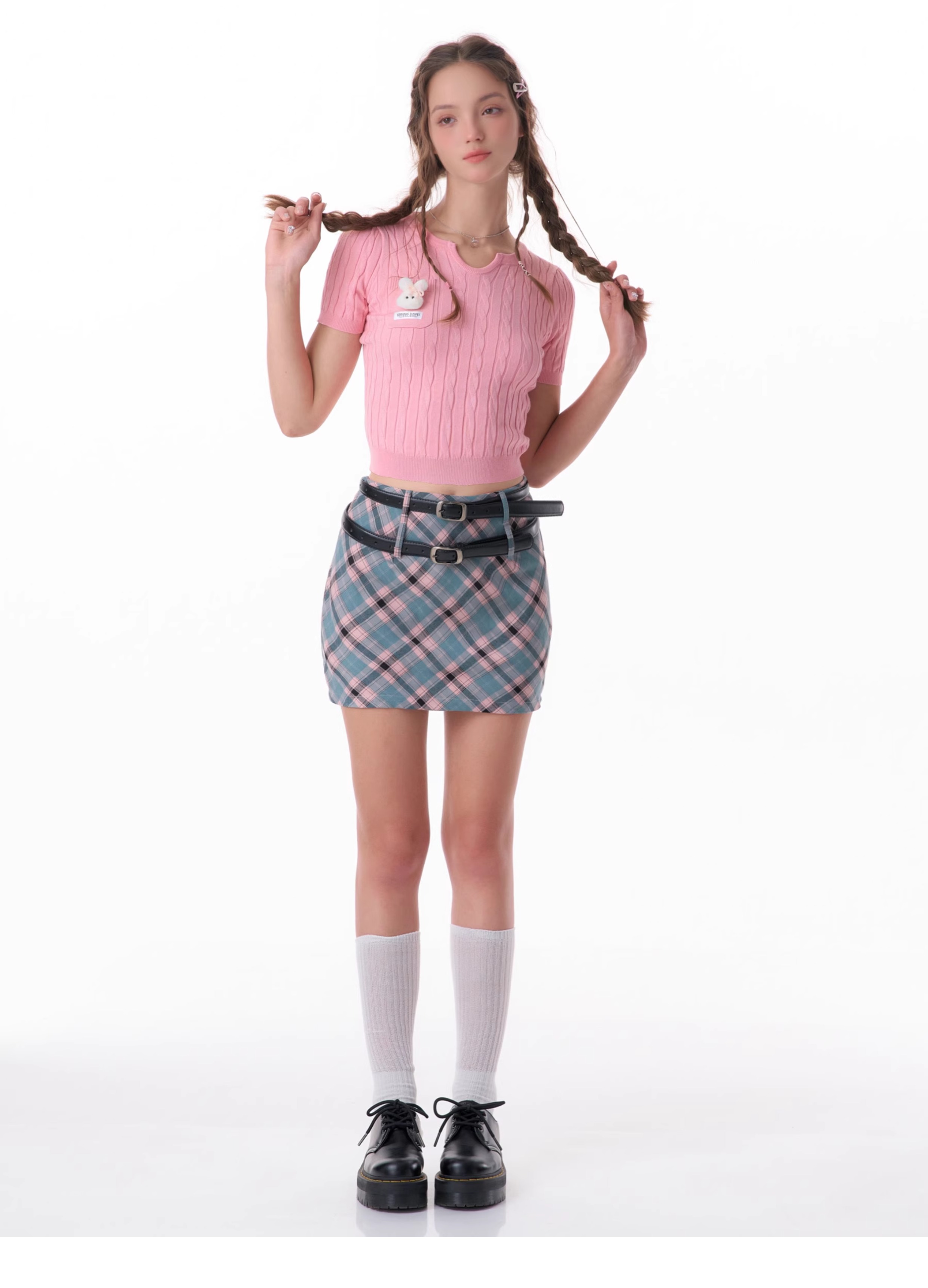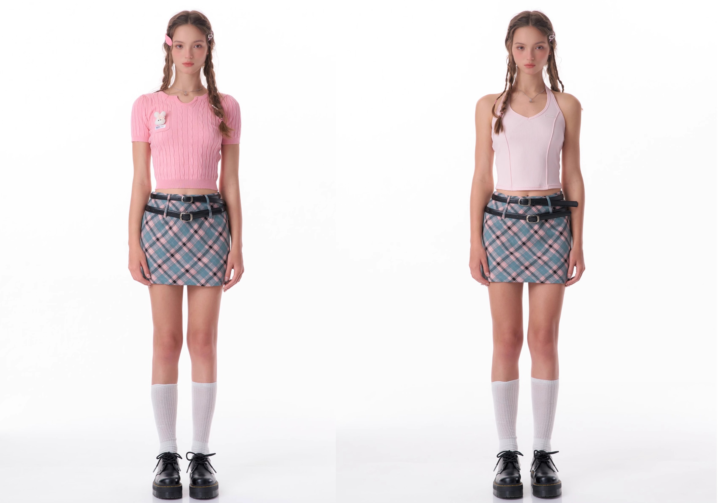 Jupe trapèze à carreaux rose et bleu | Coupe slim rétro taille haute pour l’été