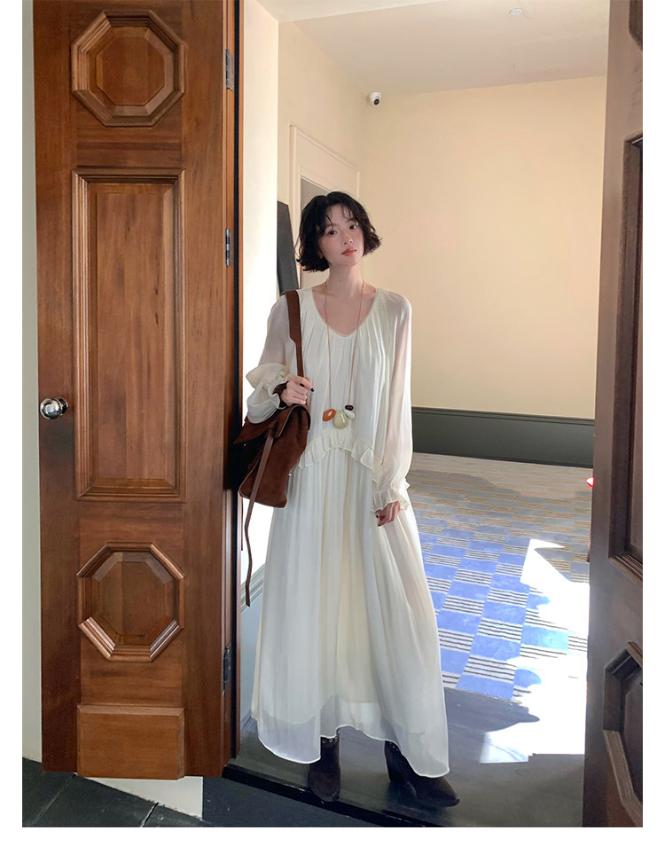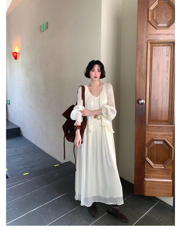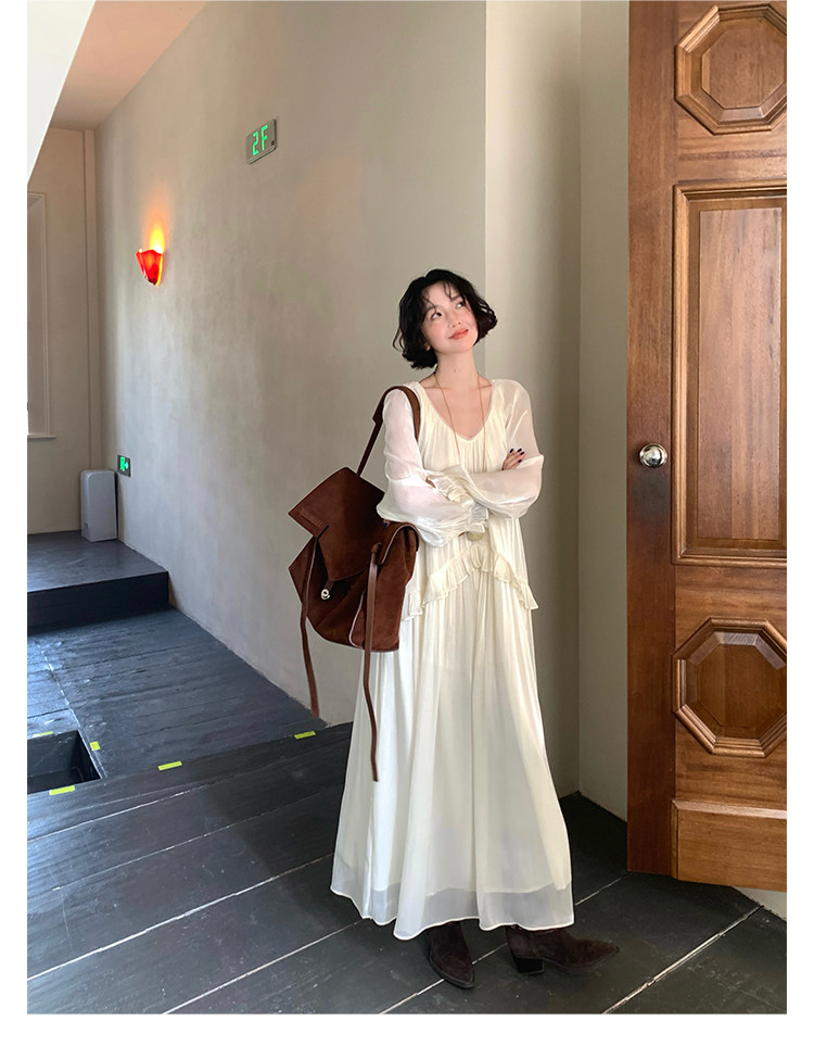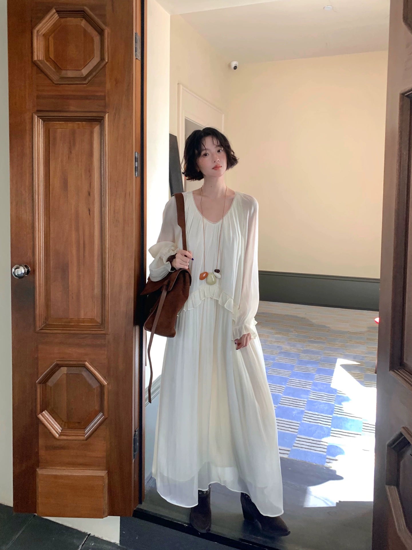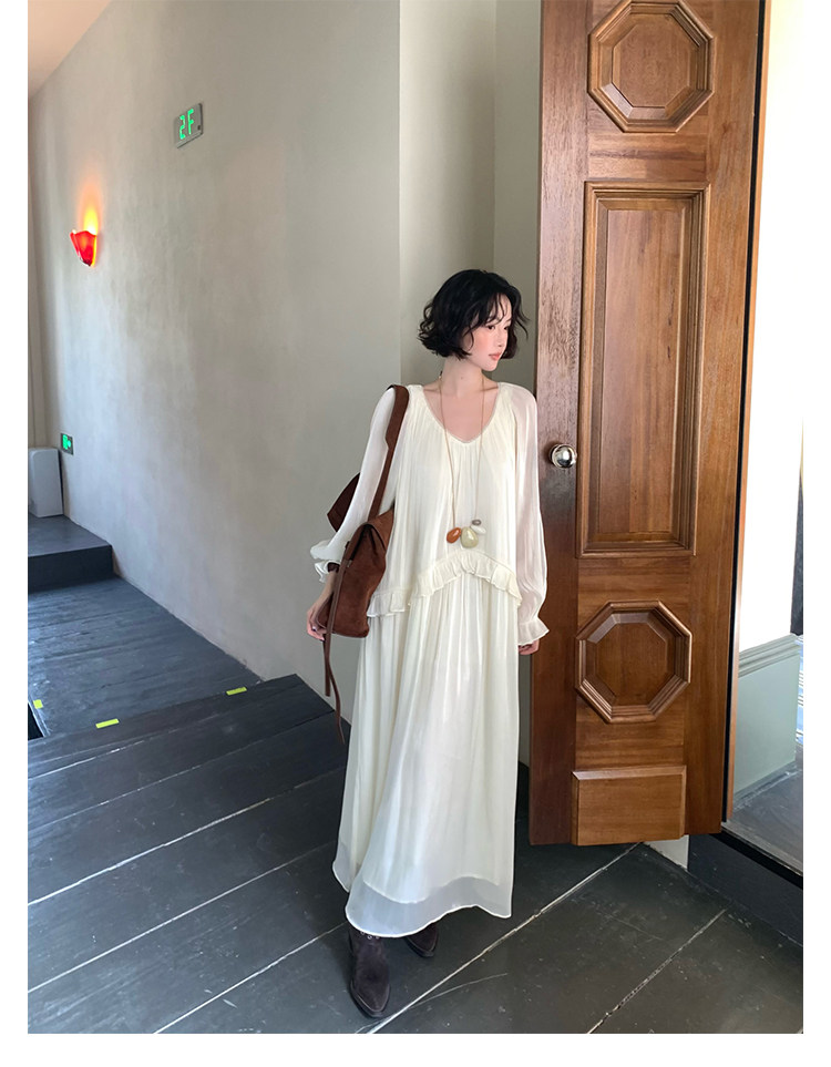 French Retro Pleated Ruffle V-Neck Long Sleeve Dress – Elegant Autumn Style