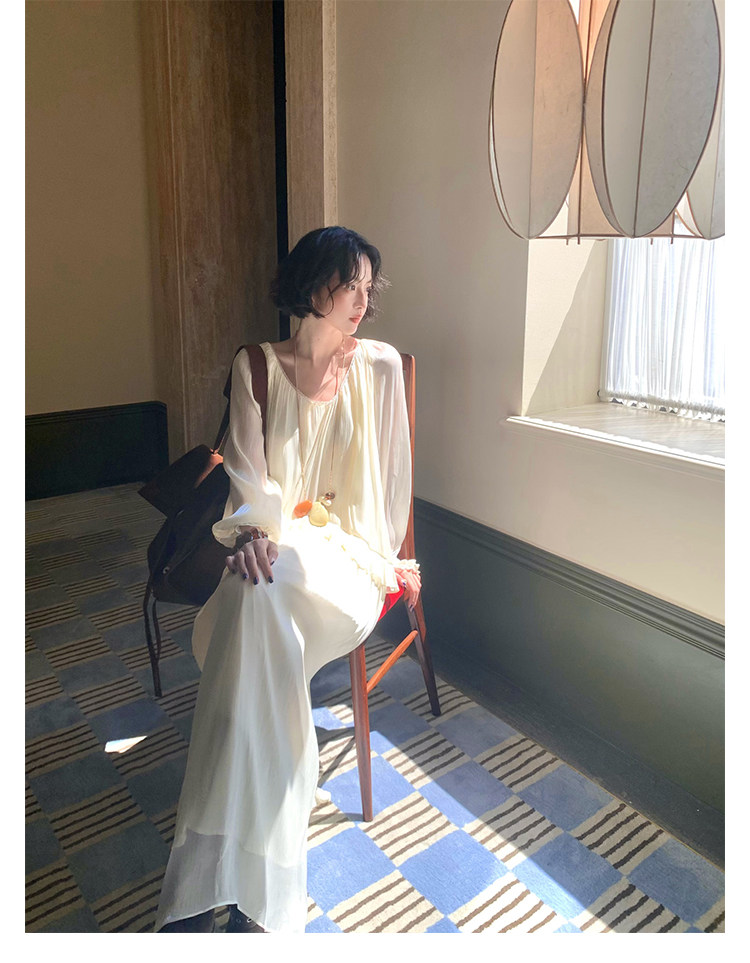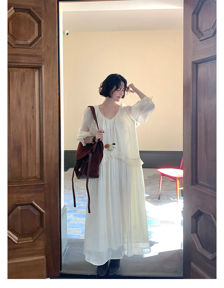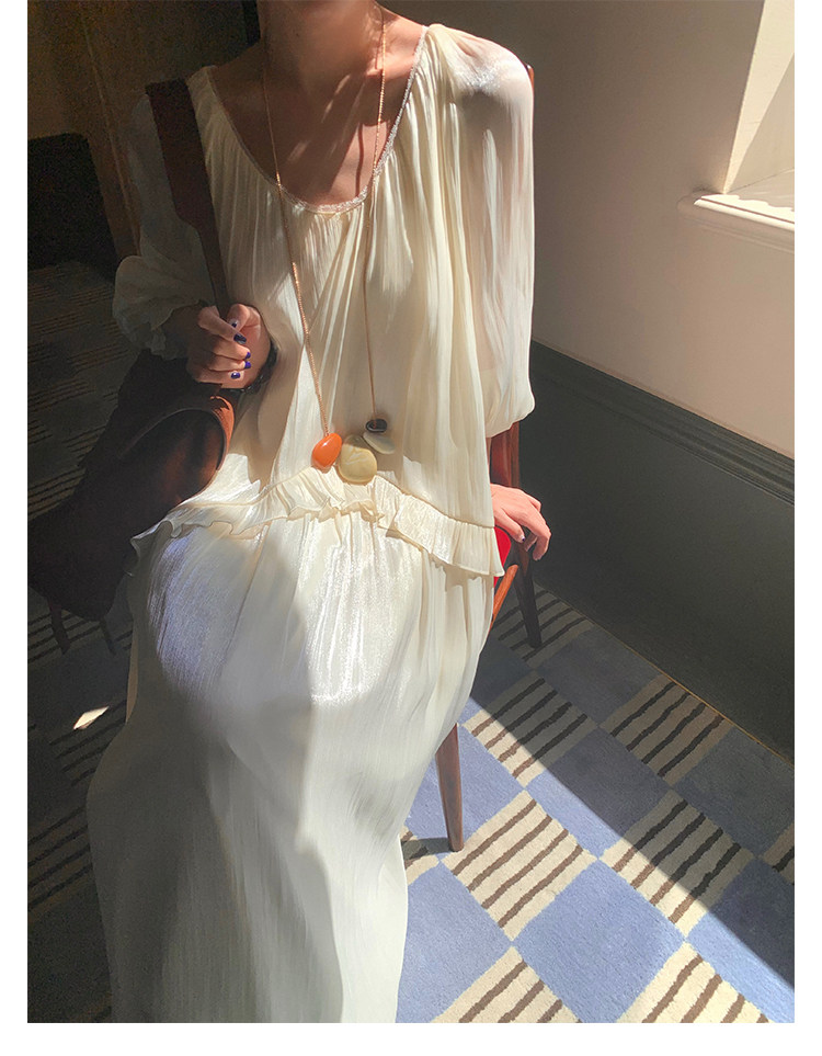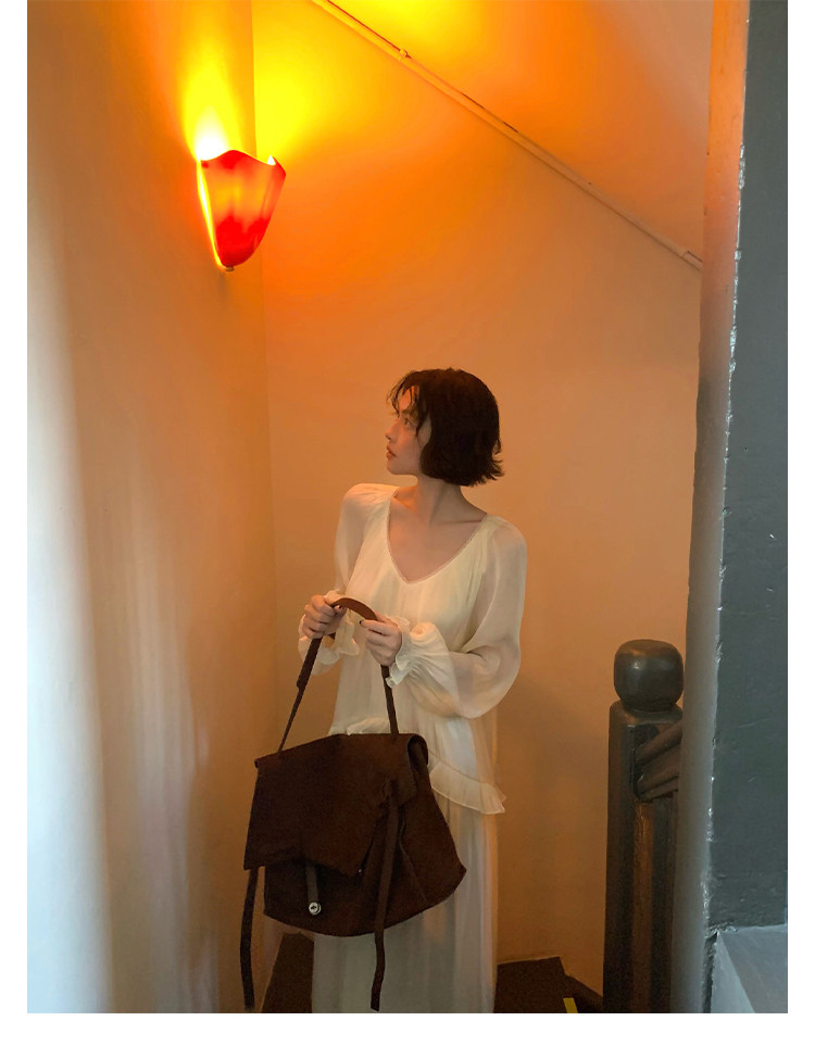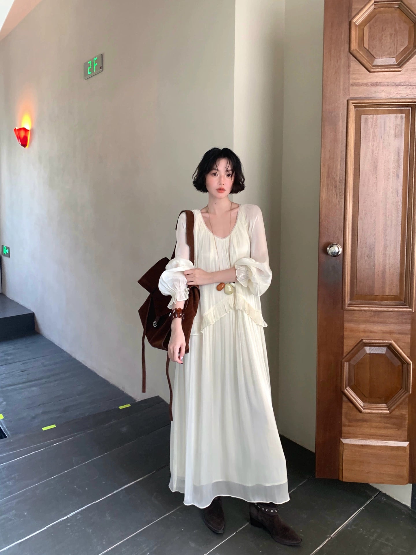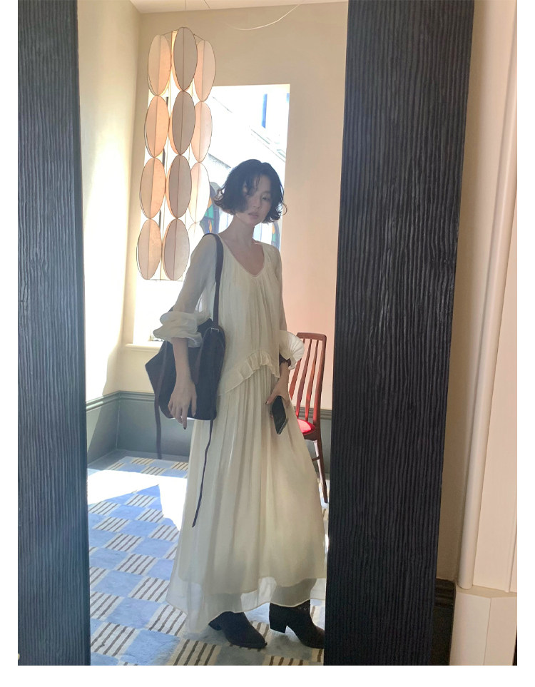 French Retro Pleated Ruffle V-Neck Long Sleeve Dress – Elegant Autumn Style