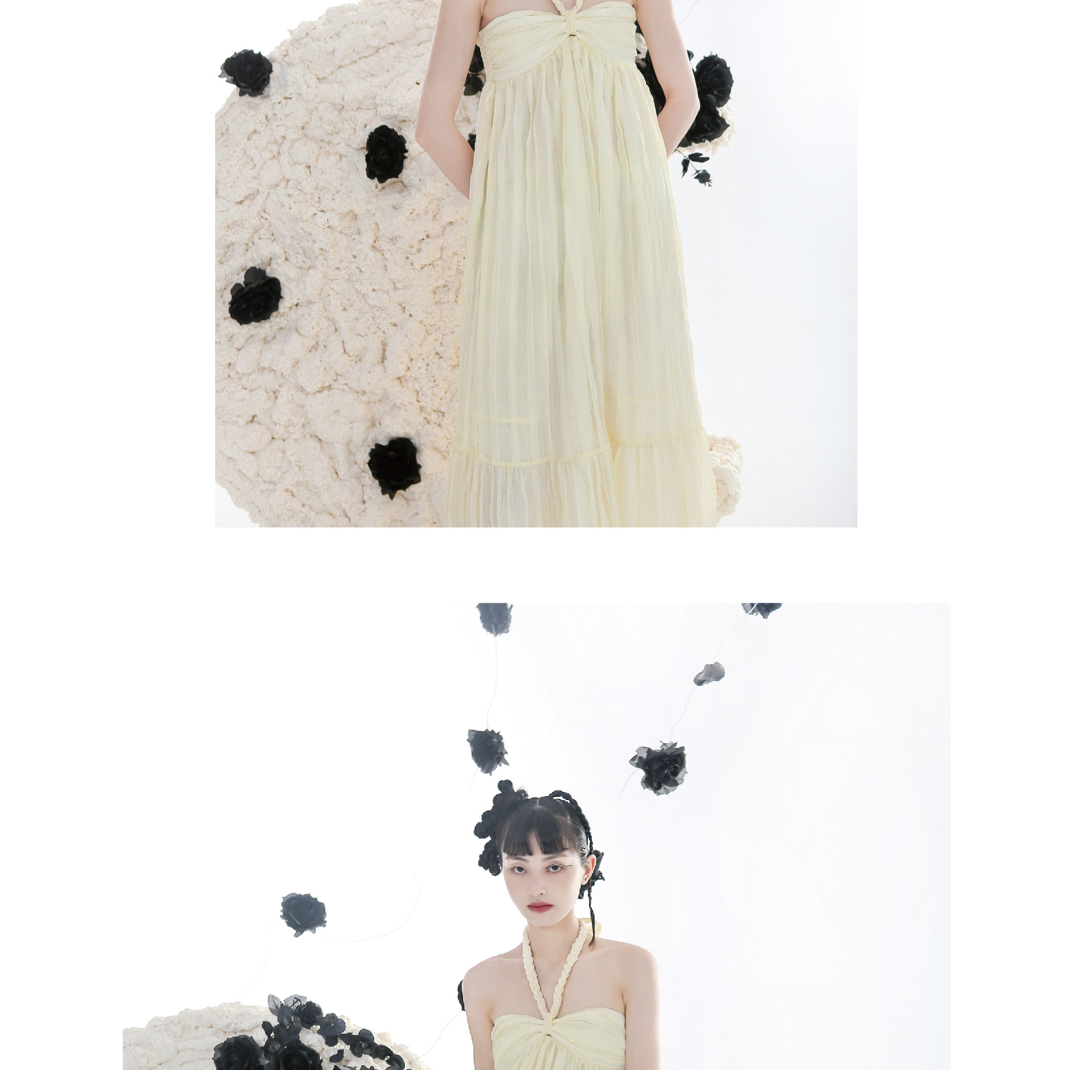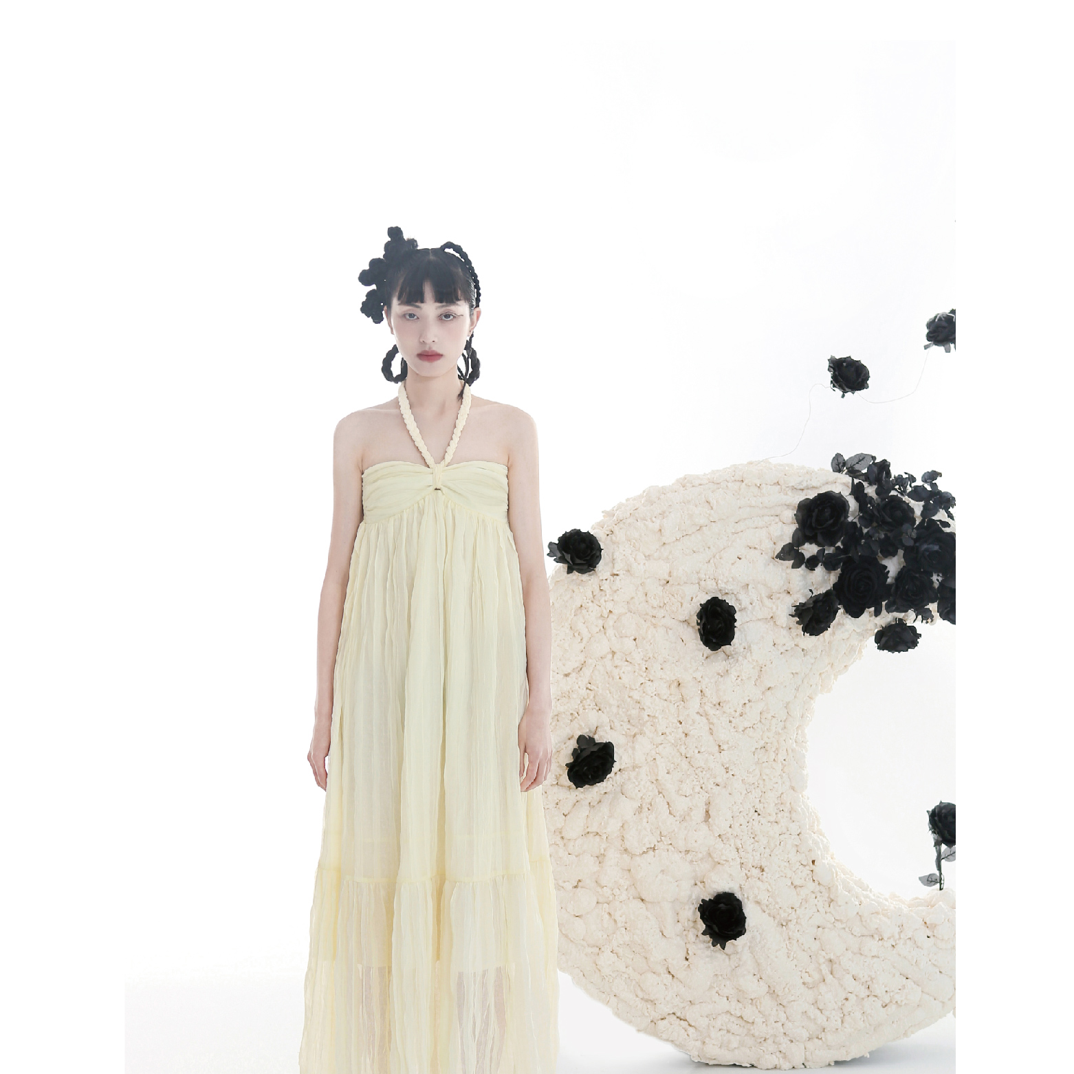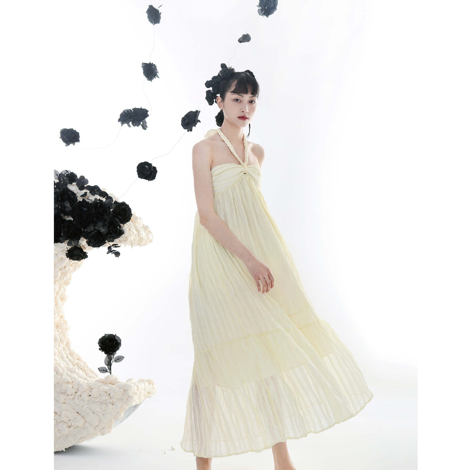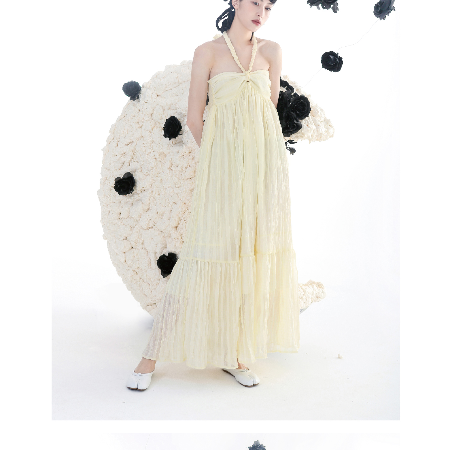 Original Light Yellow Handmade Knitted Neck Pleated Dress