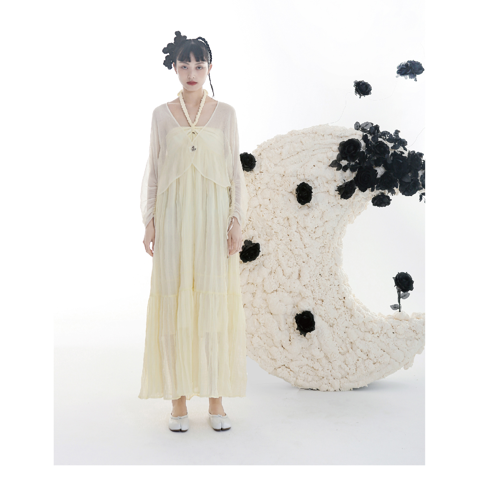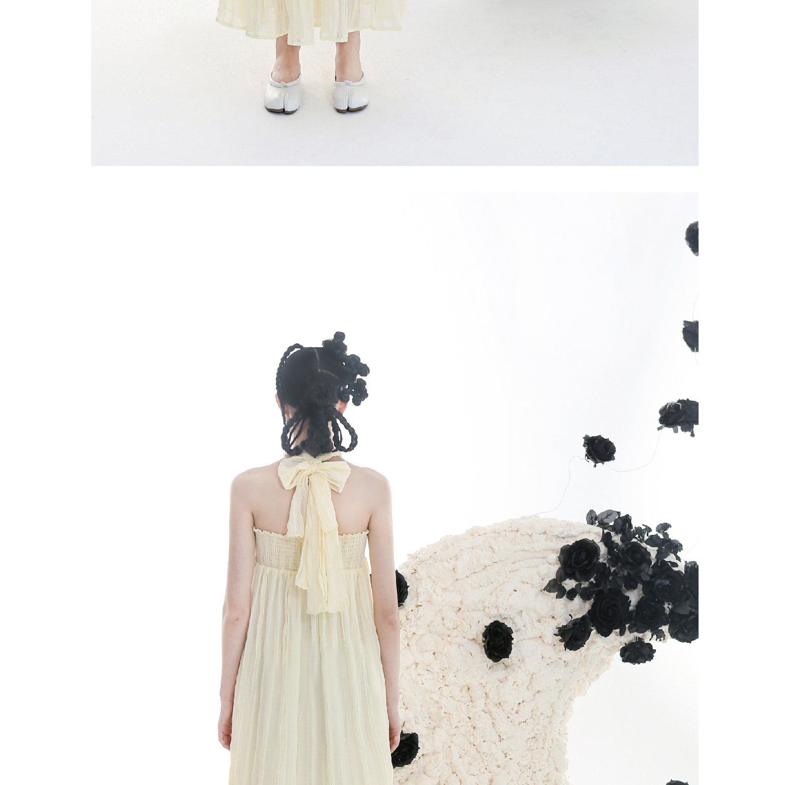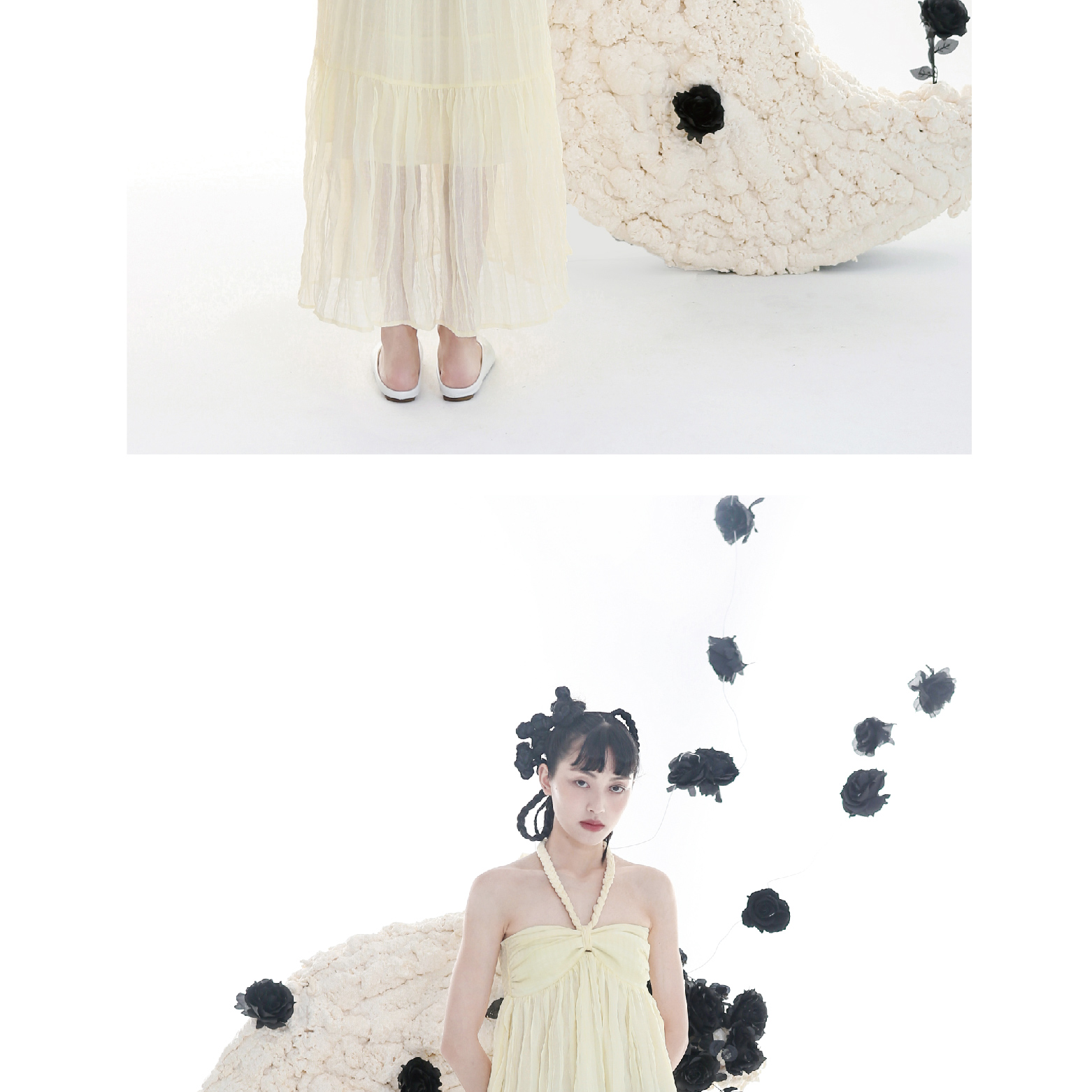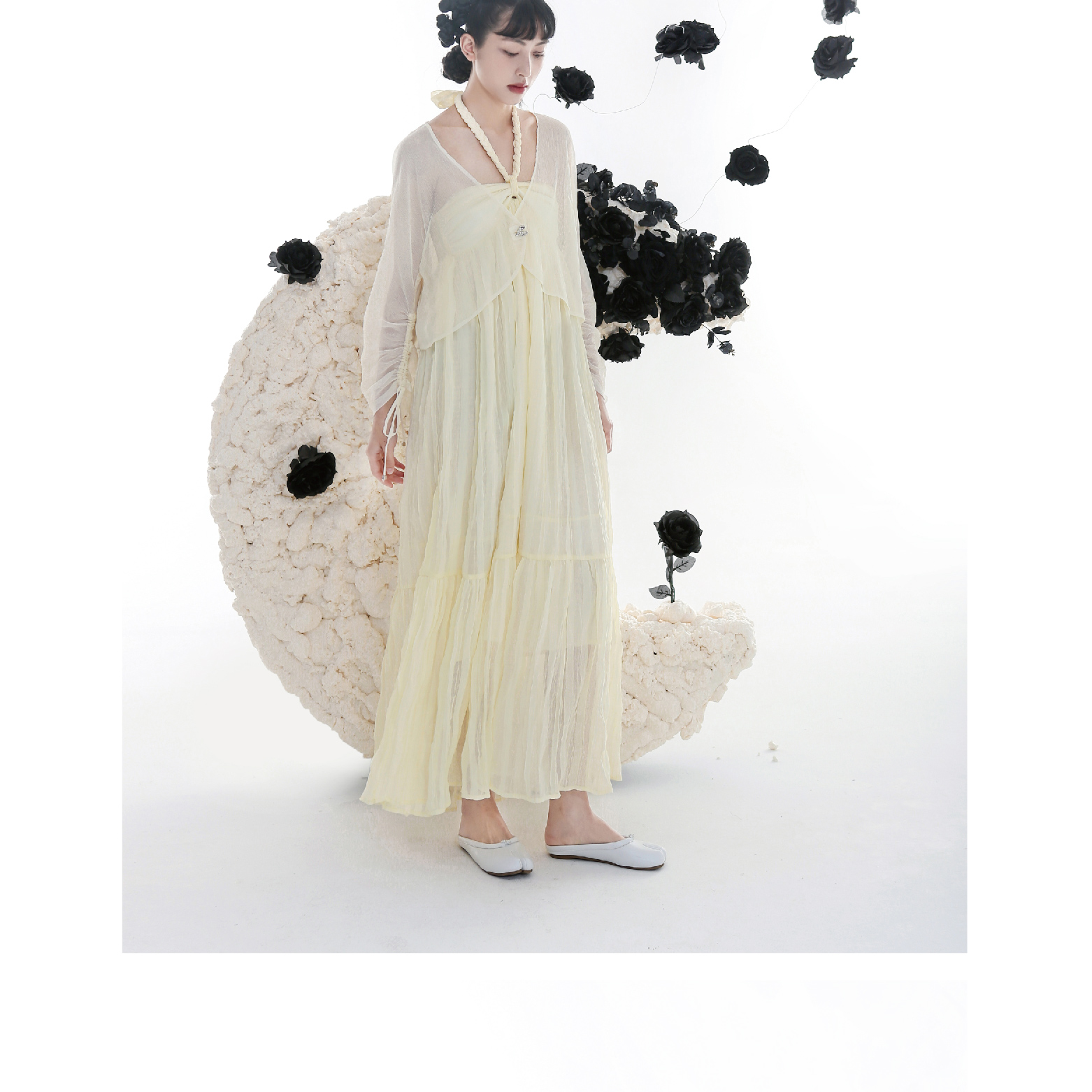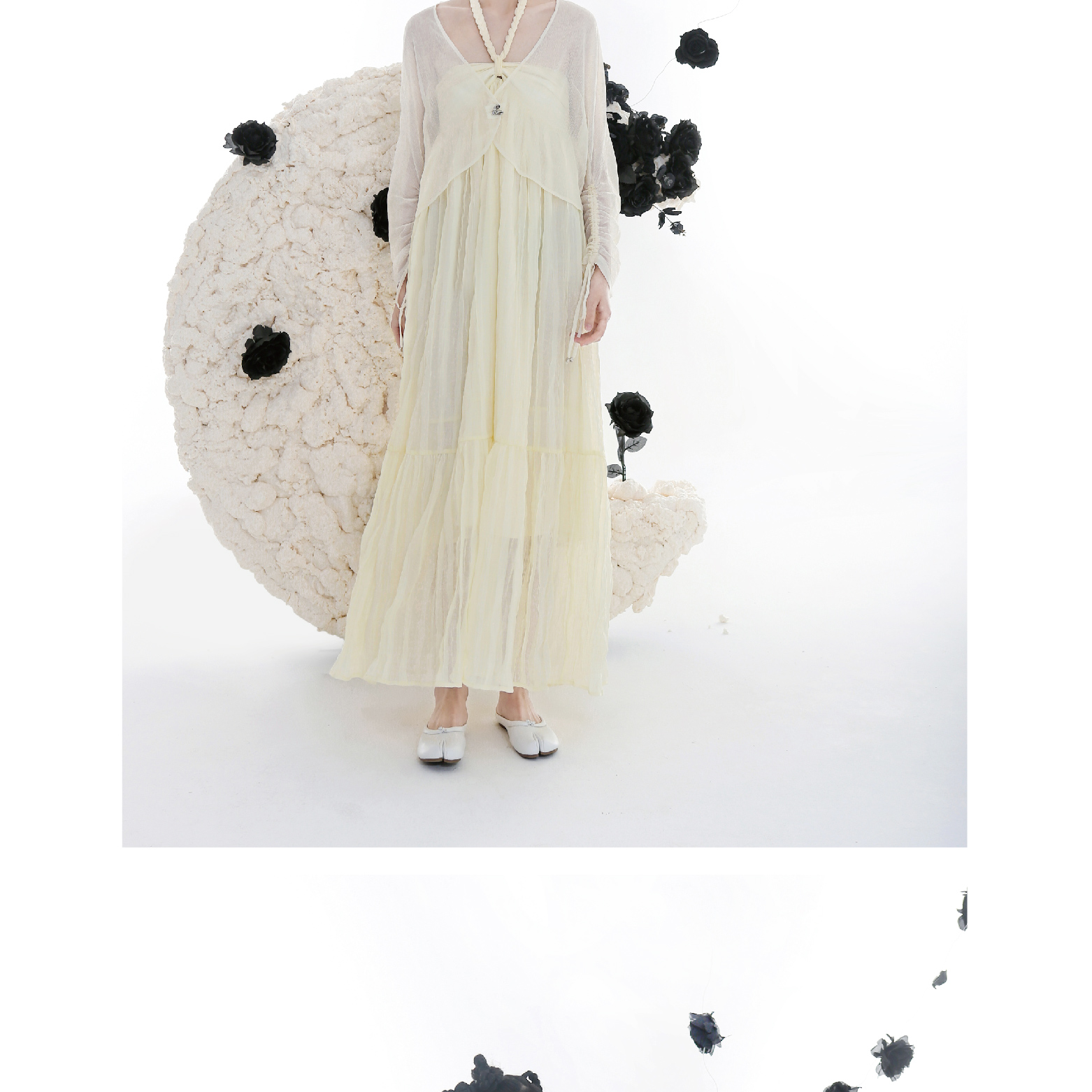 Original Light Yellow Handmade Knitted Neck Pleated Dress