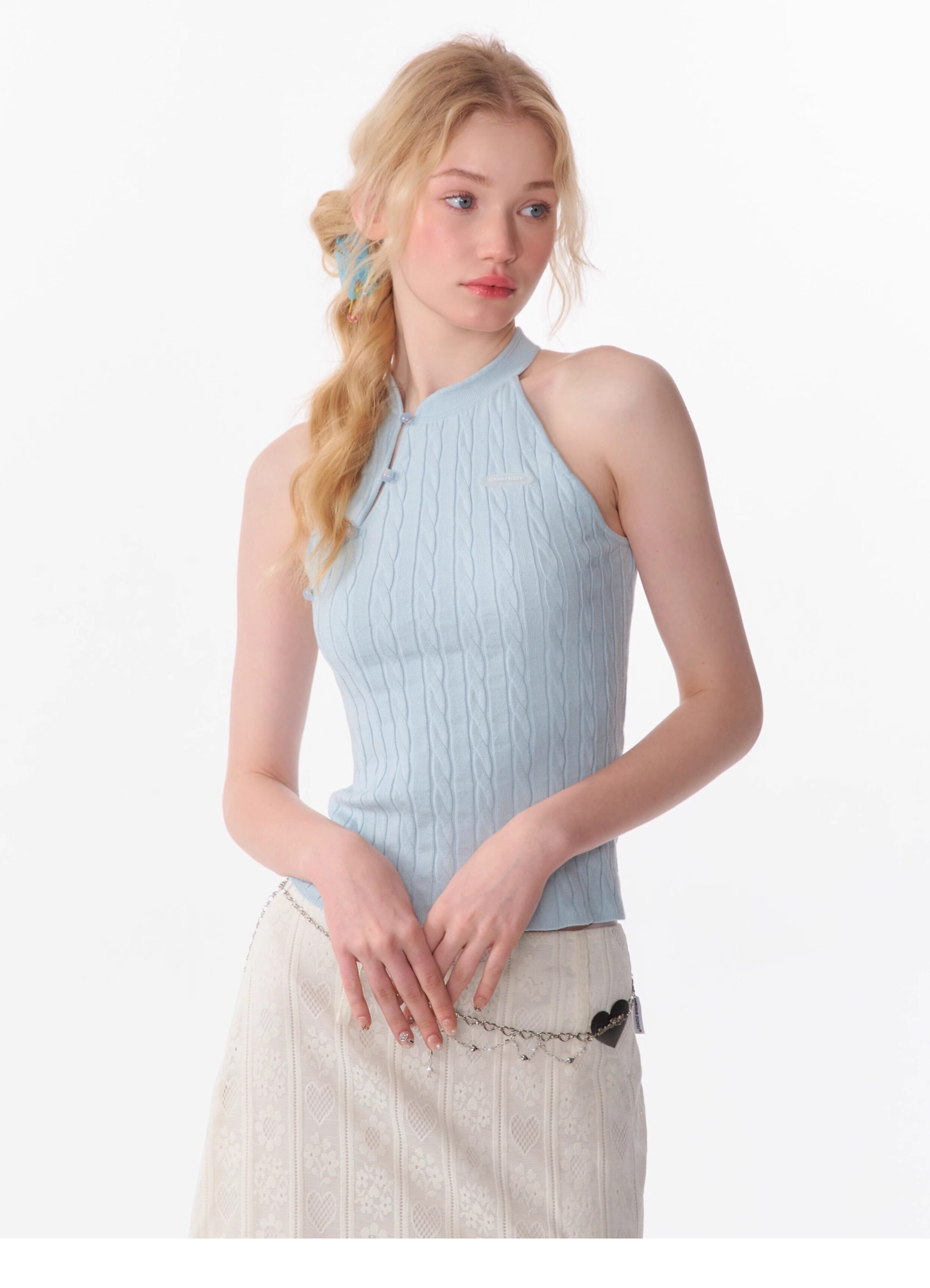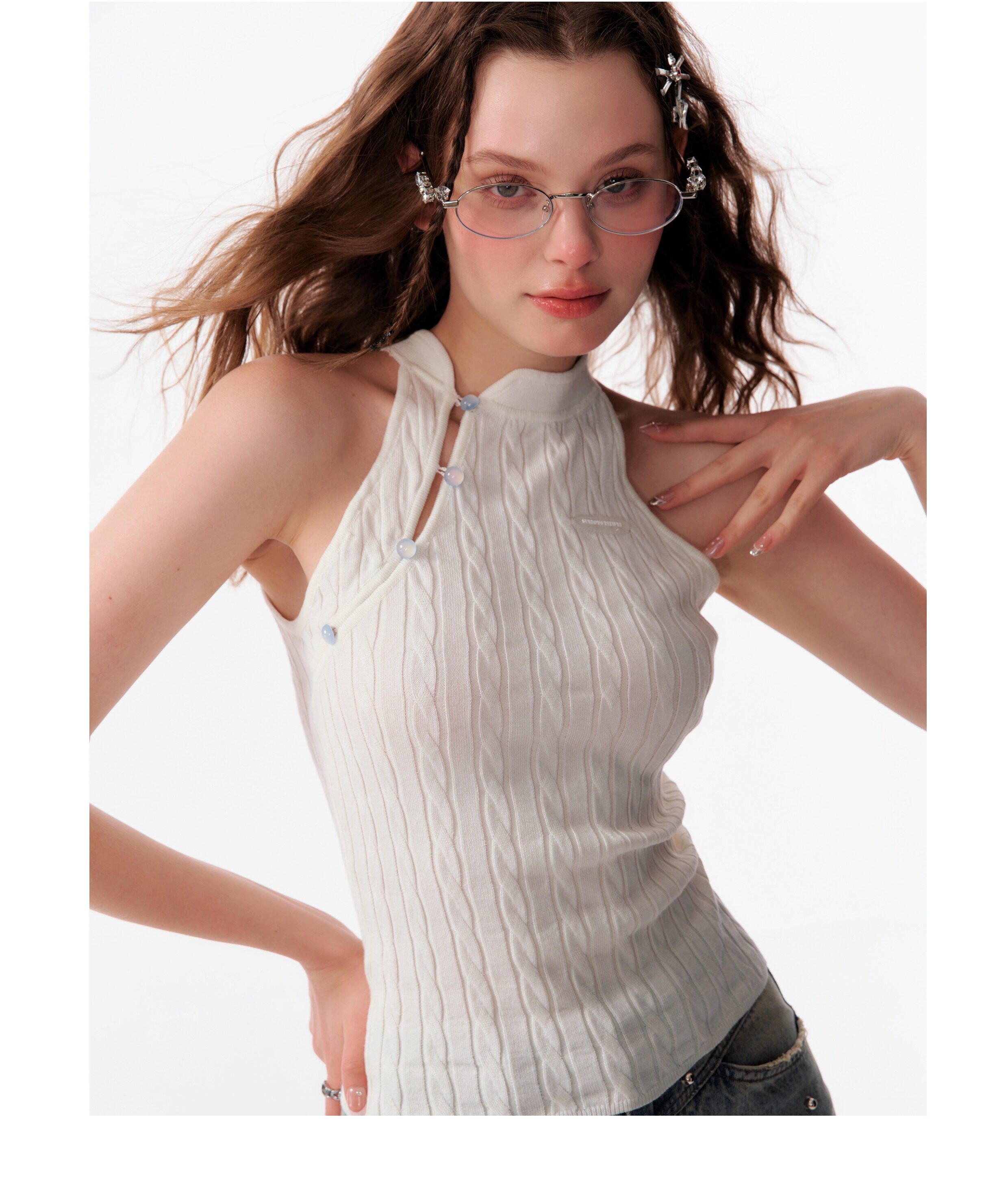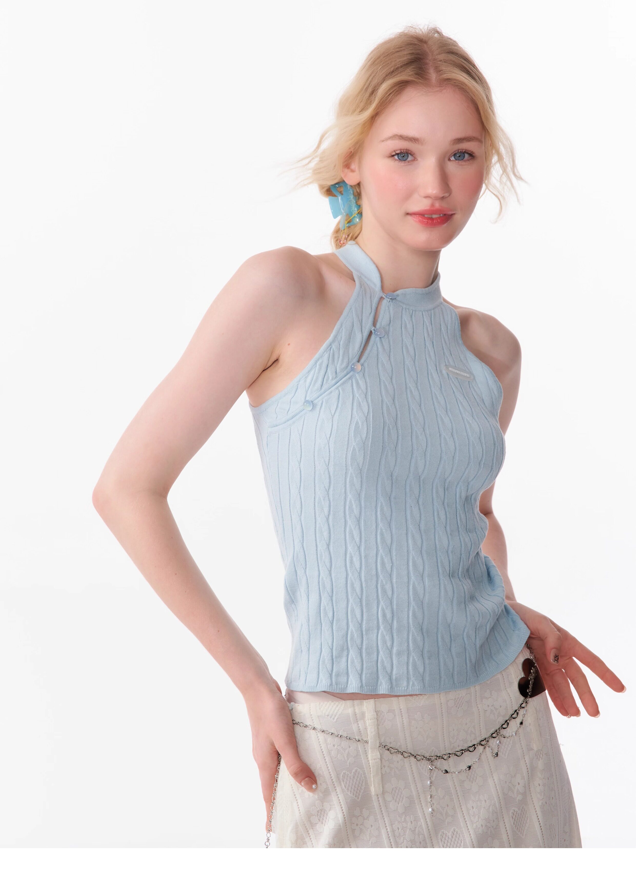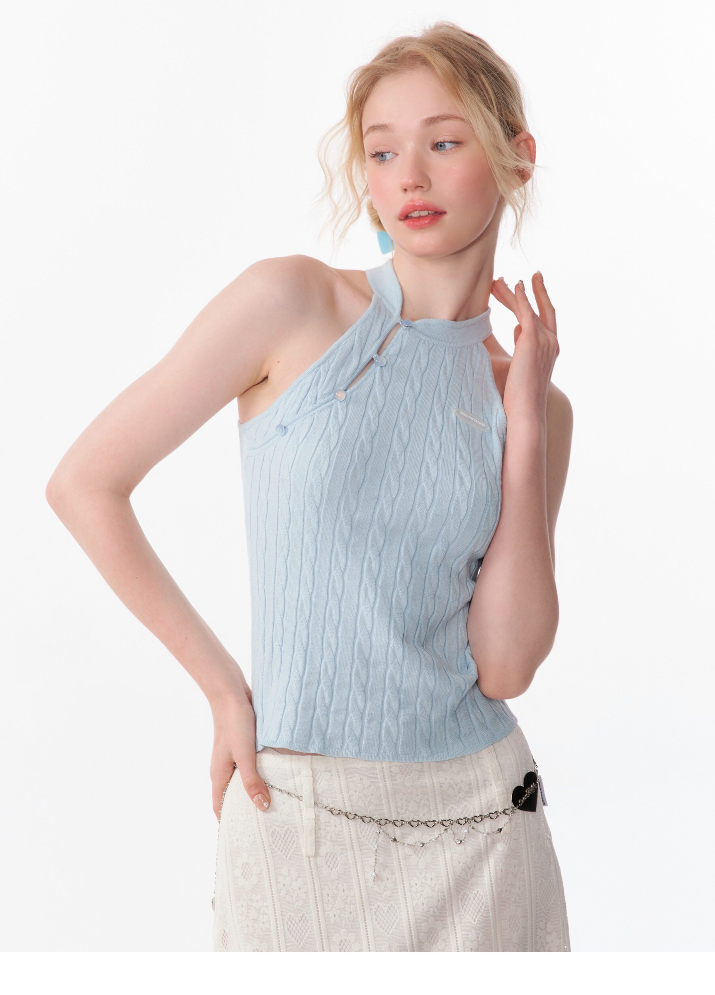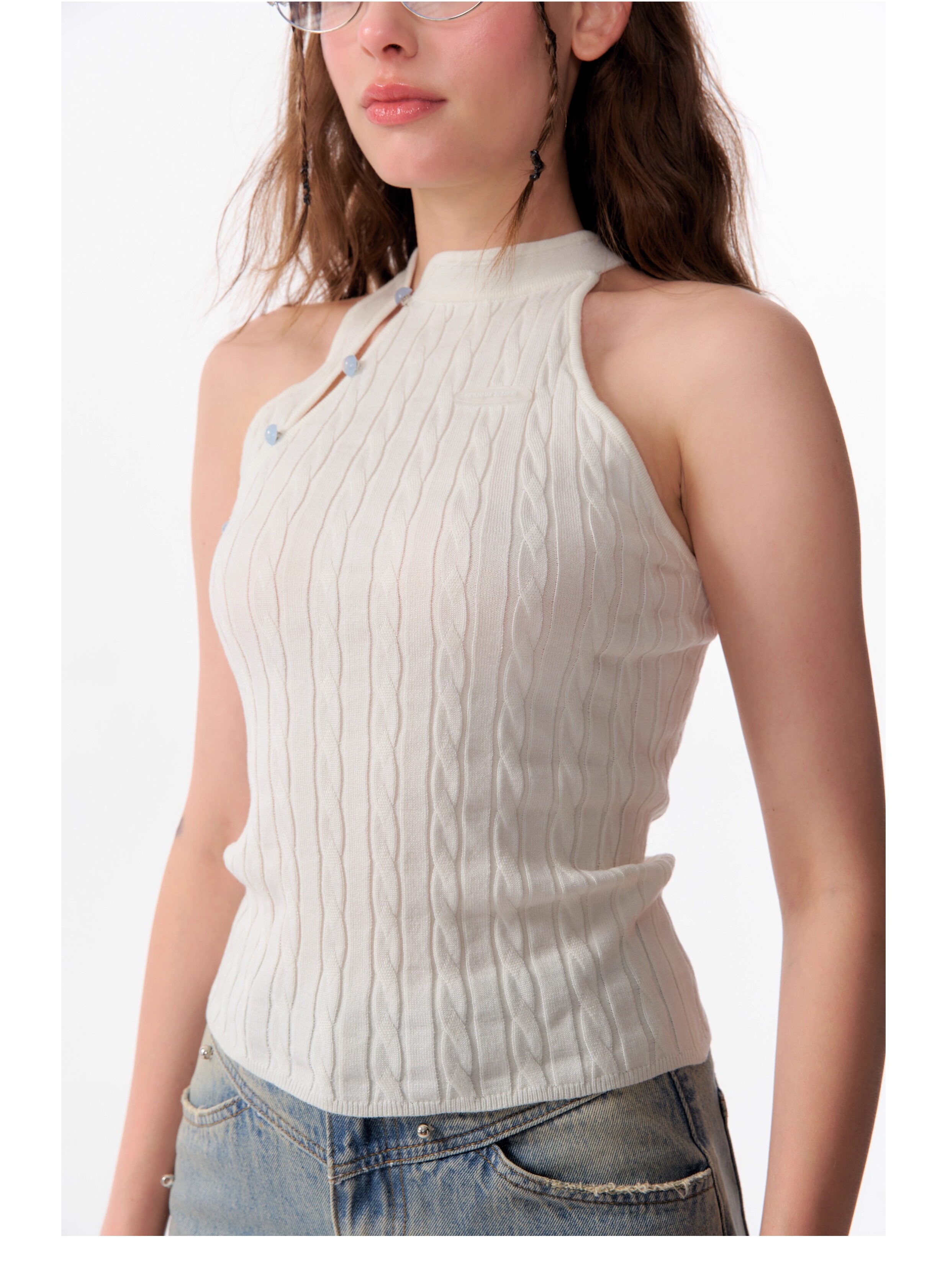 Top senza maniche con bocca inclinata |. Design retrò lavorato a maglia senza schienale per l'estate