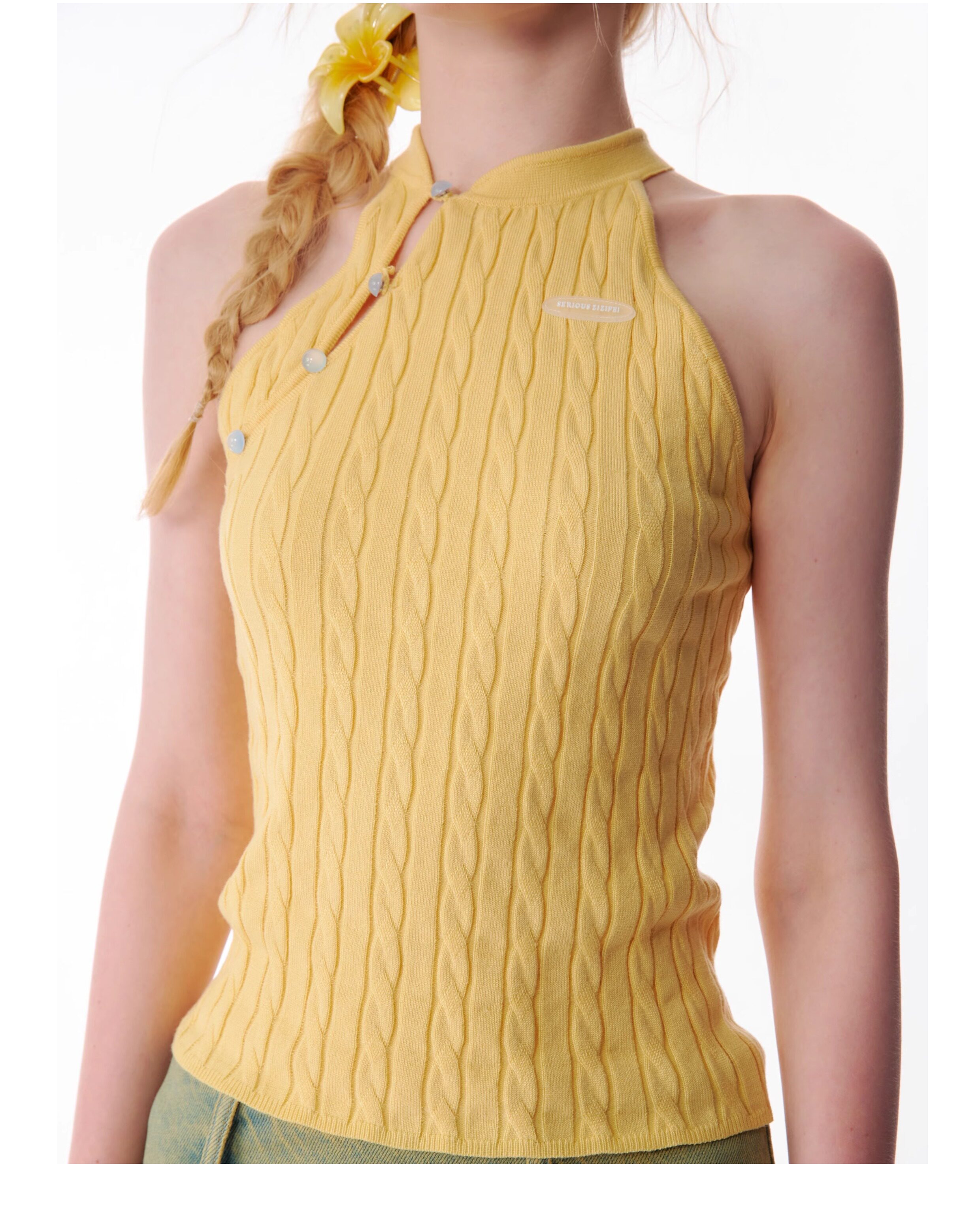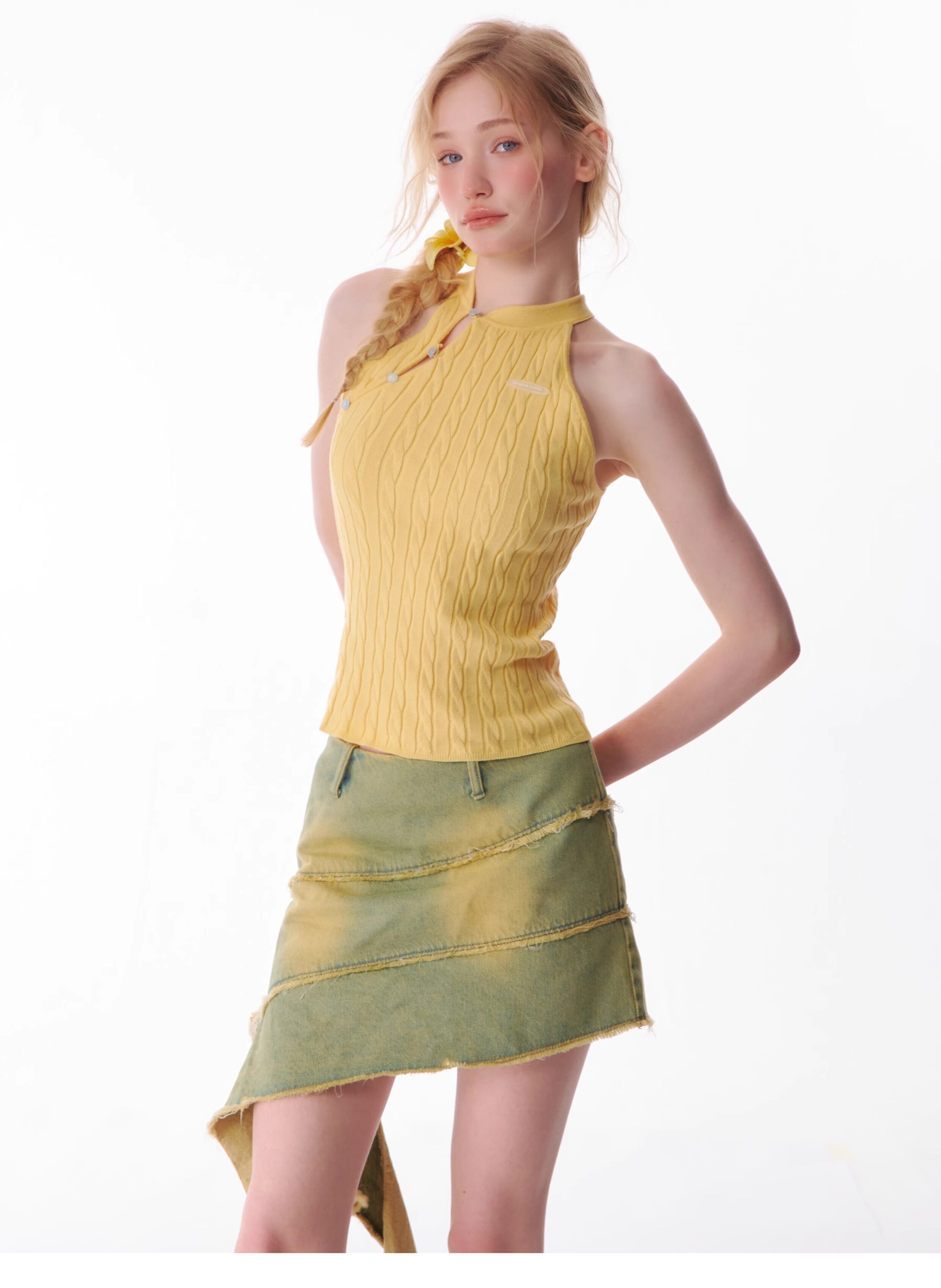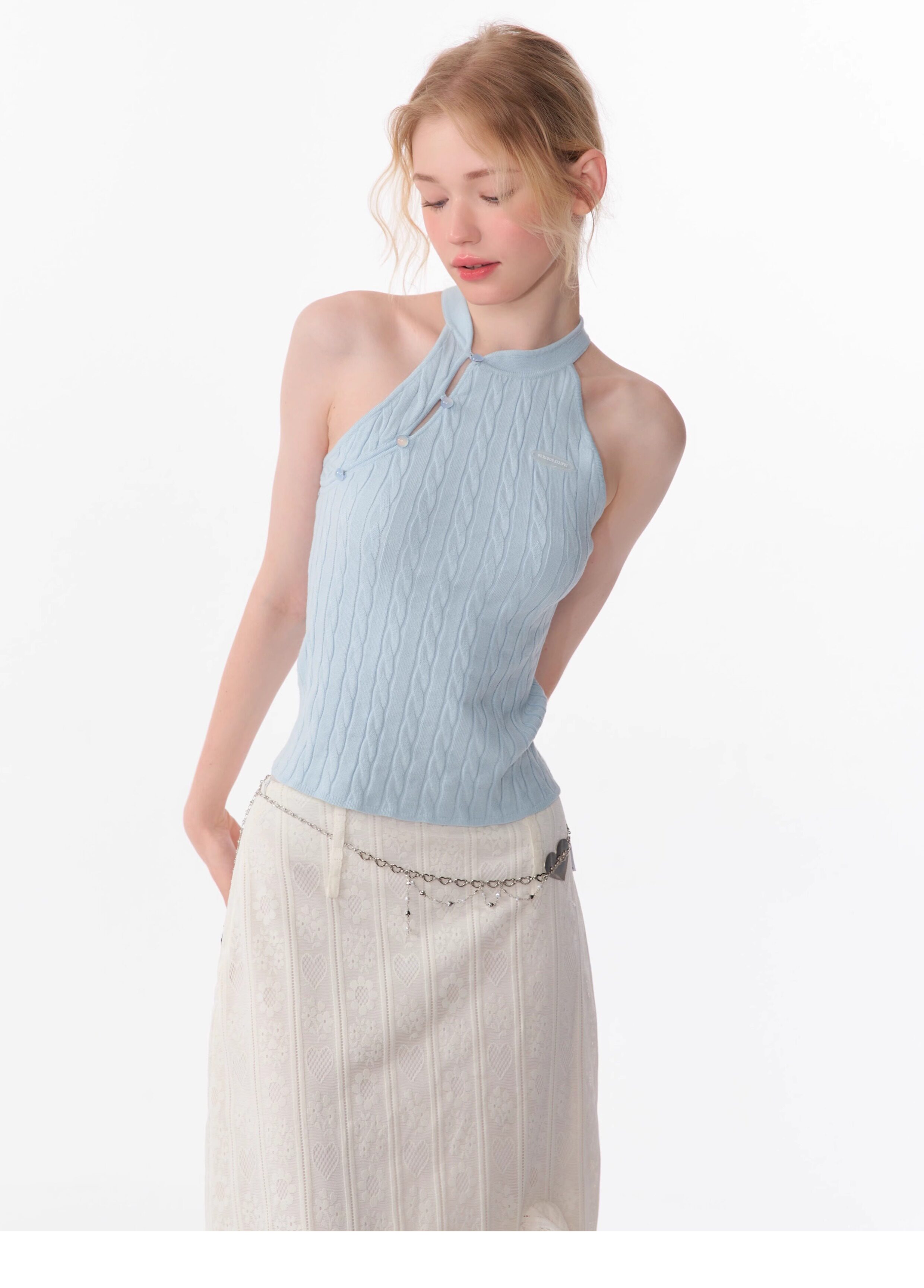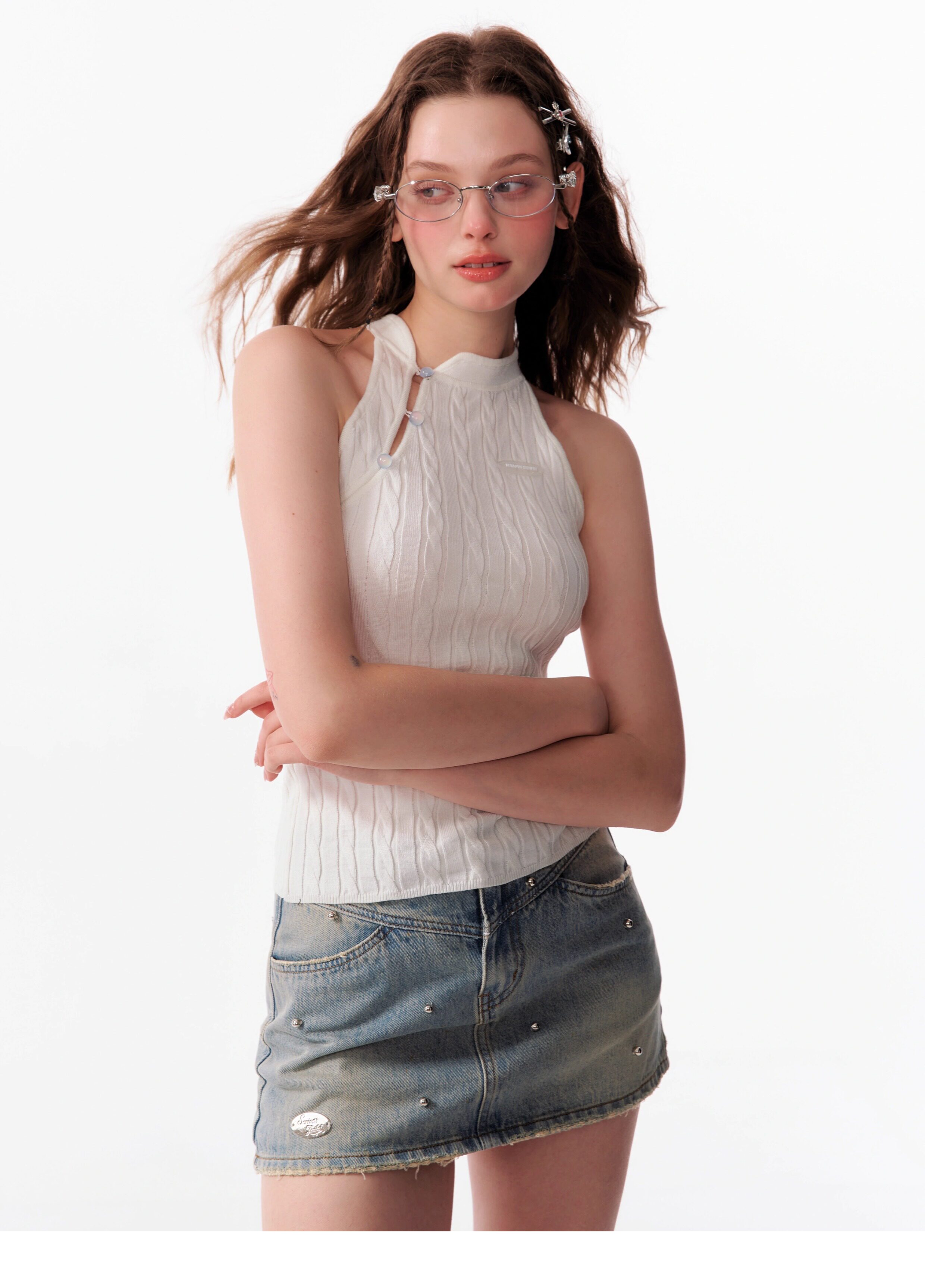 Top senza maniche con bocca inclinata |. Design retrò lavorato a maglia senza schienale per l'estate