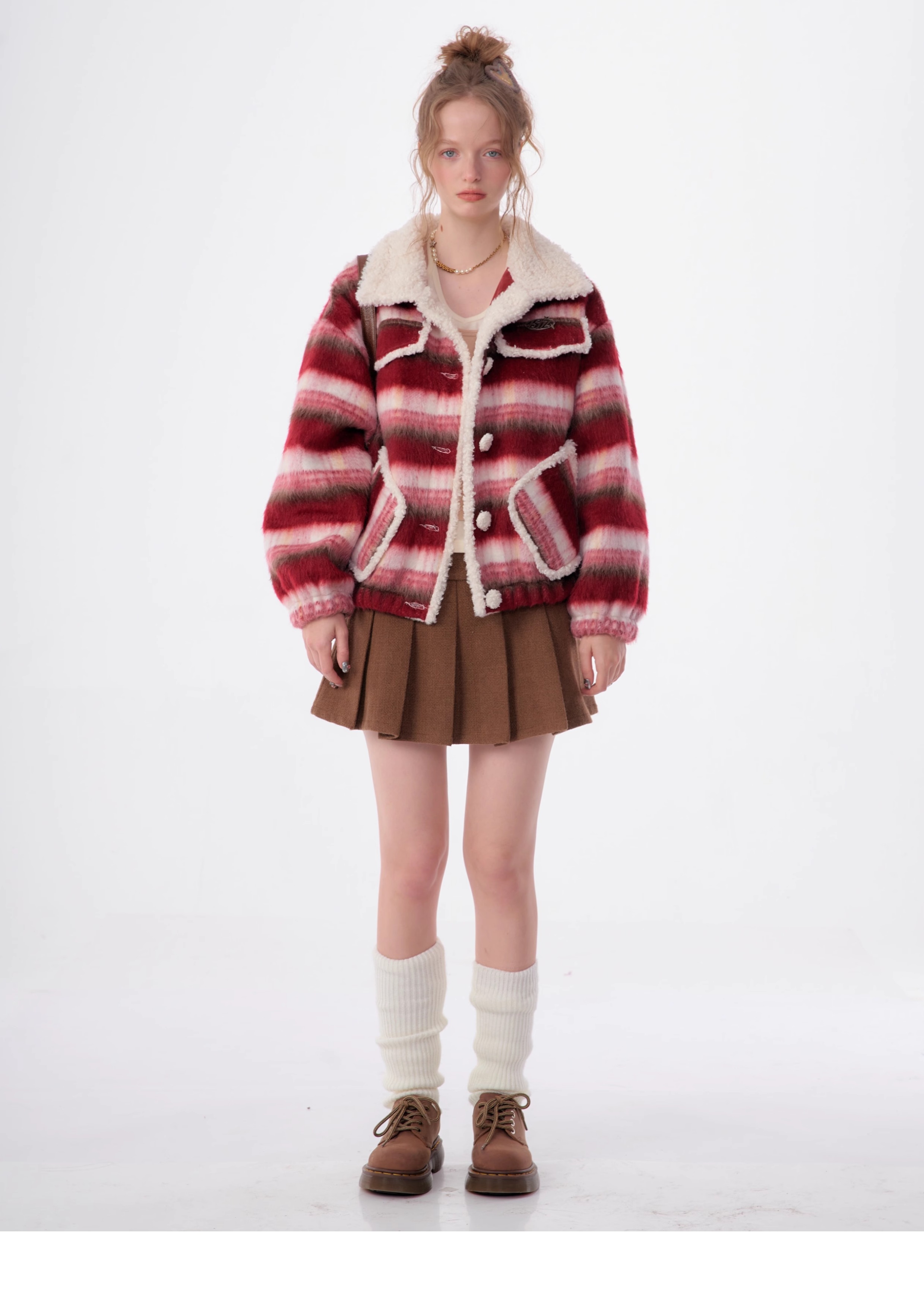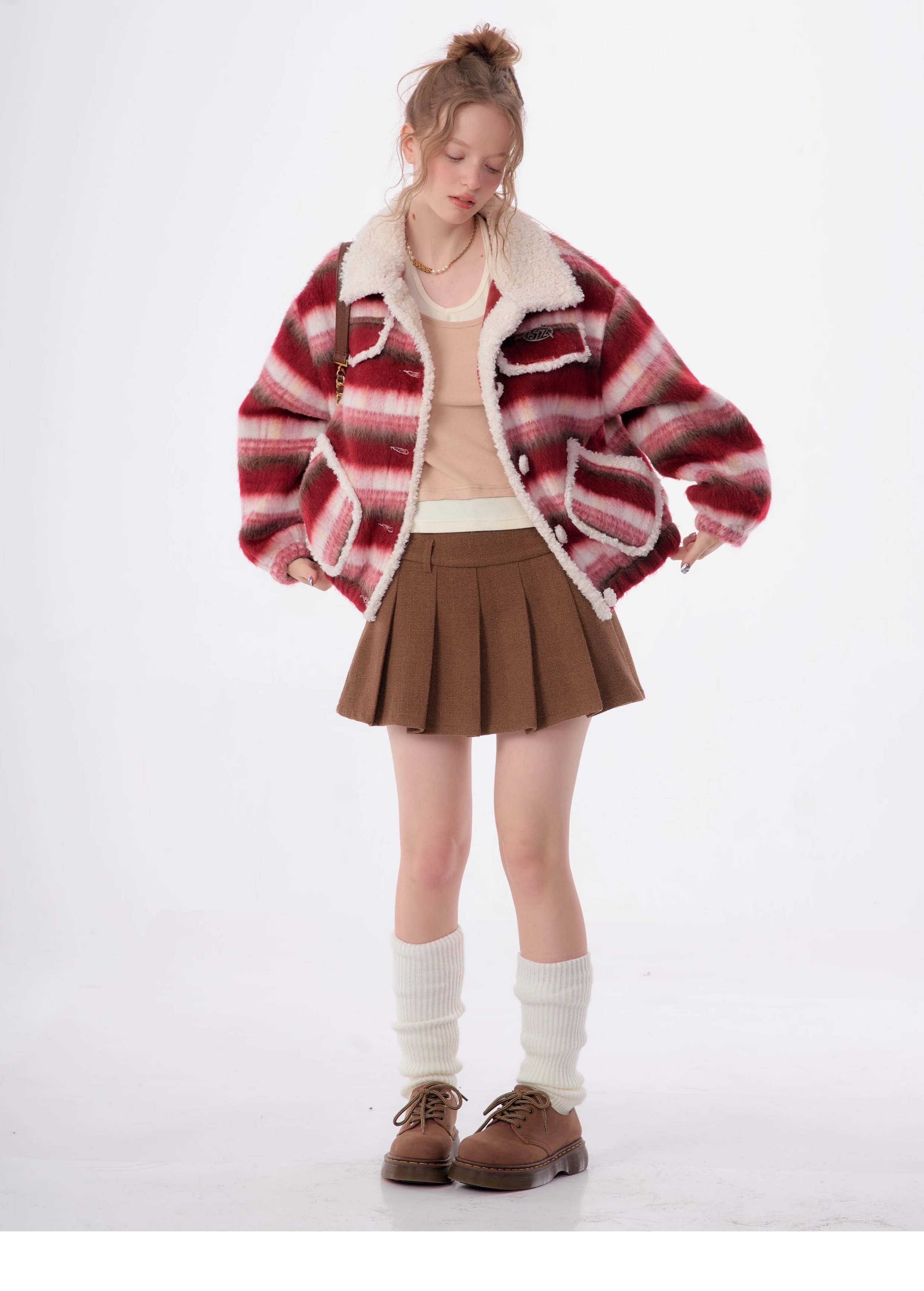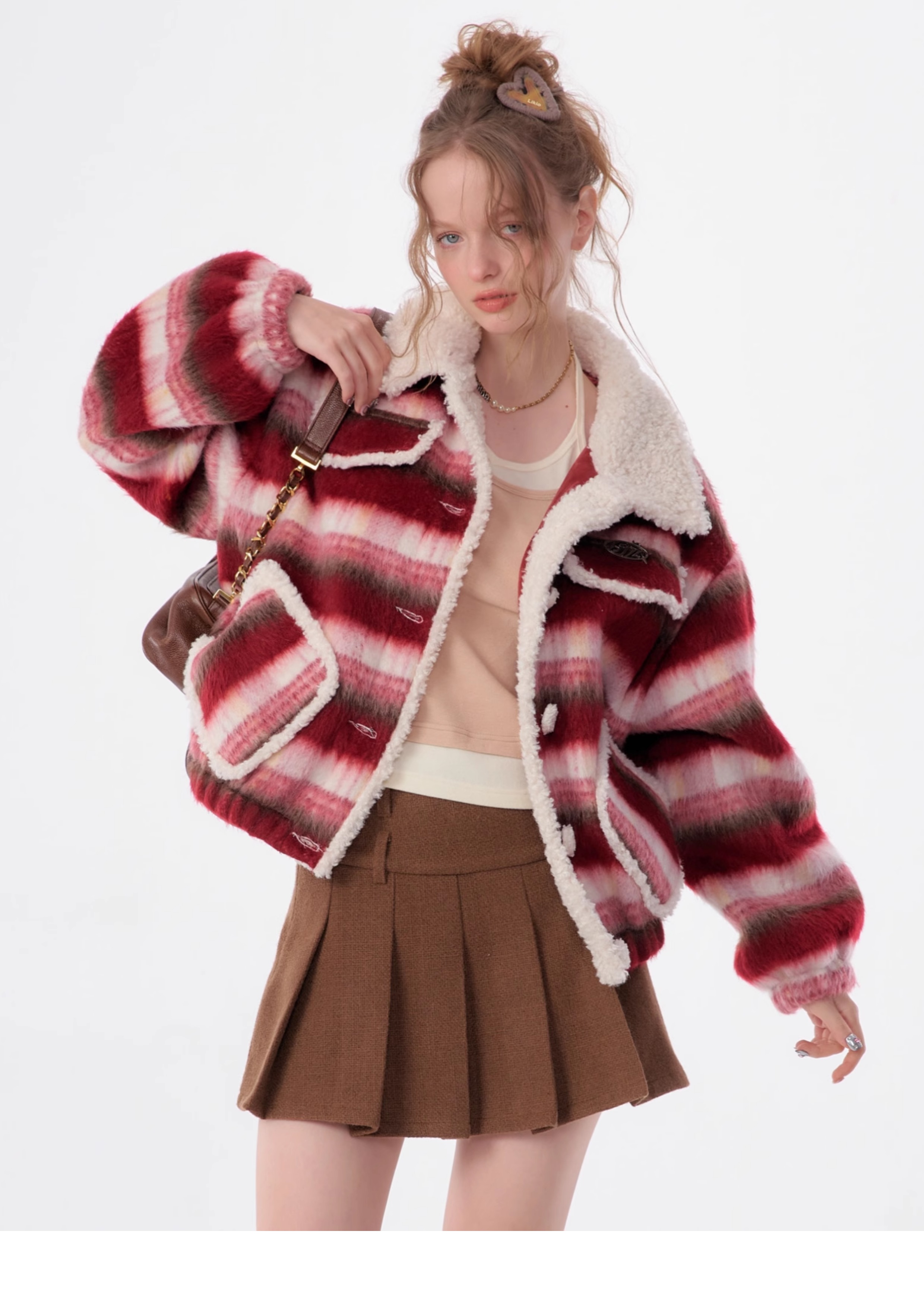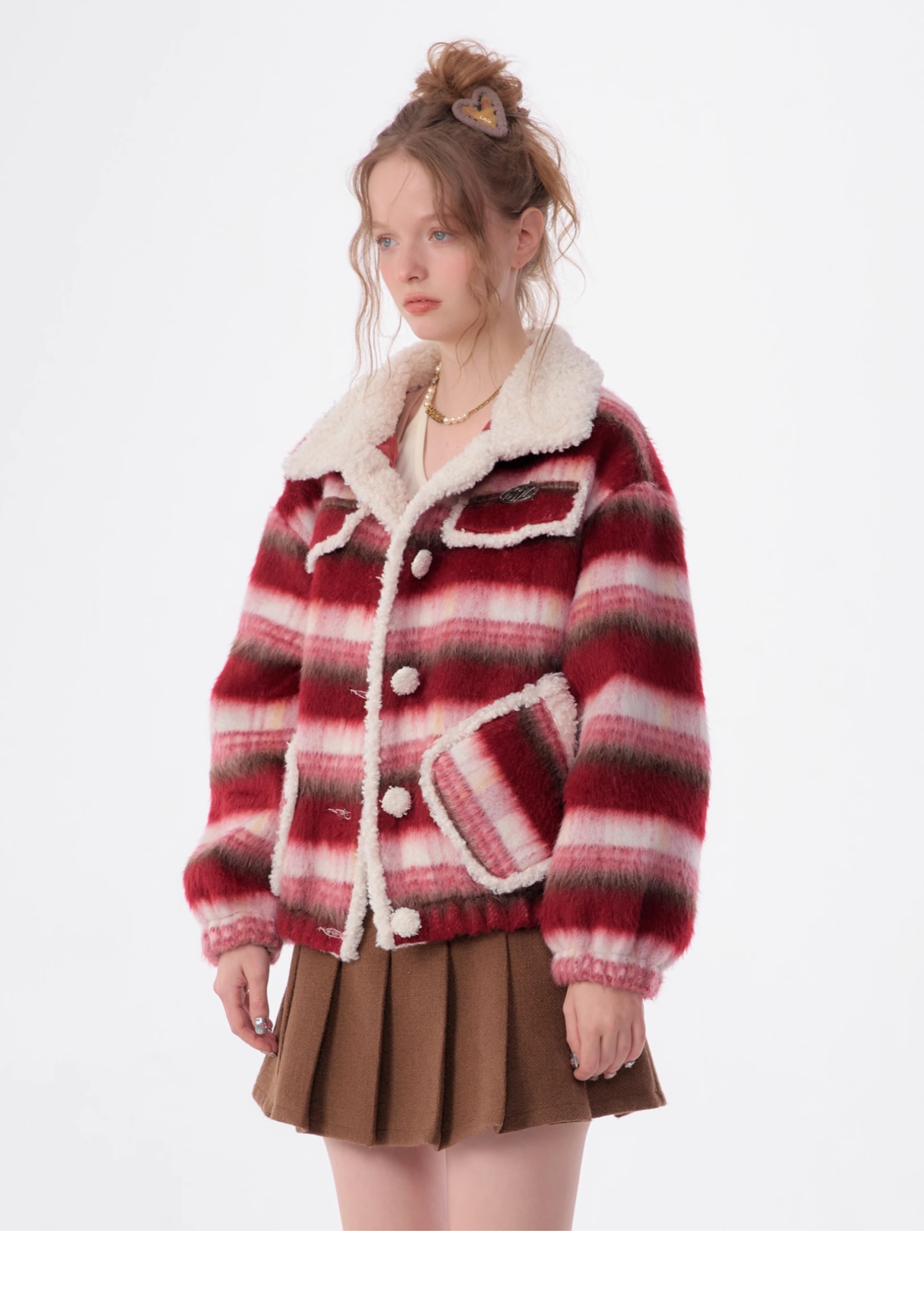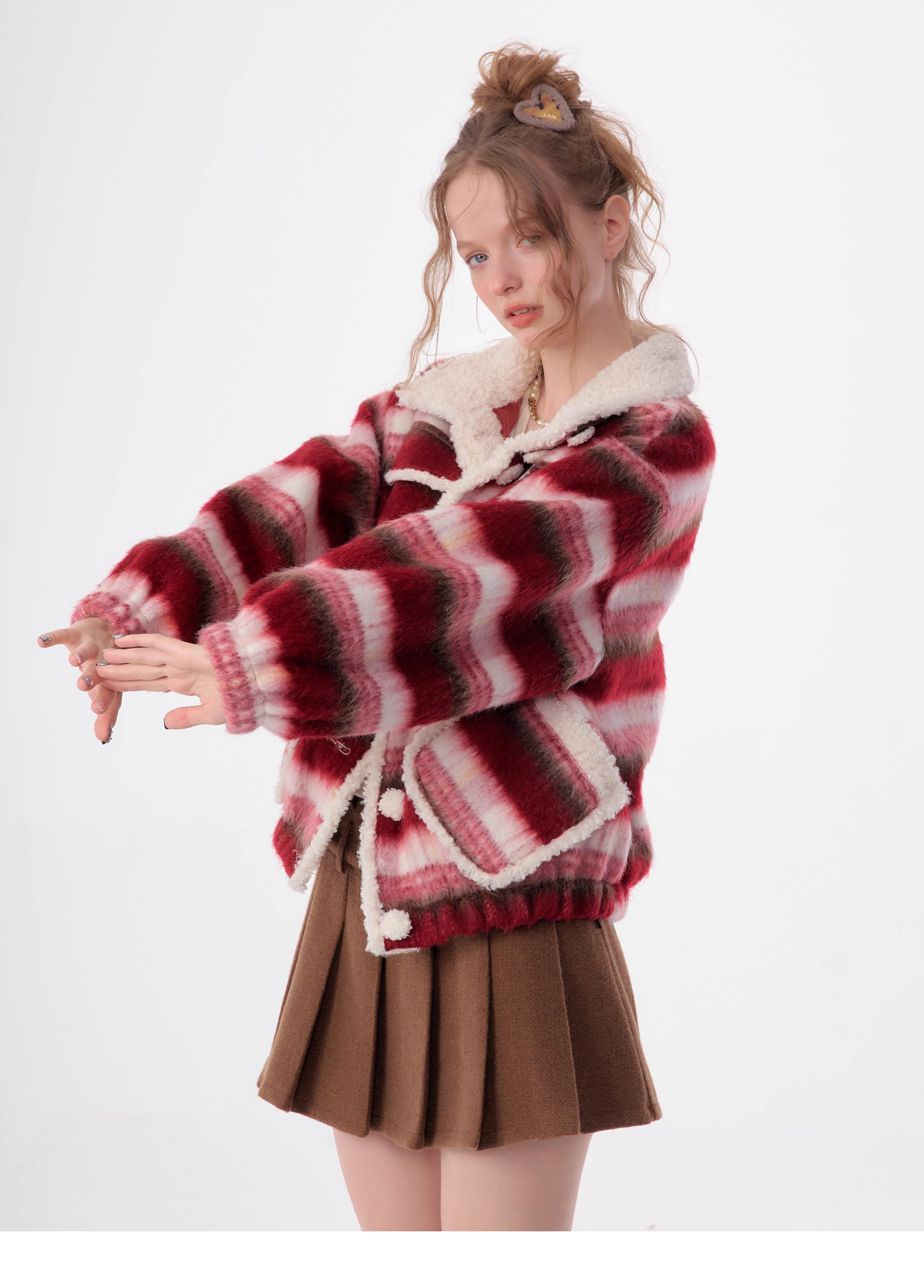 Red Striped Wool Coat | Retro Rabbit Pattern Christmas Design for Autumn/Winter
