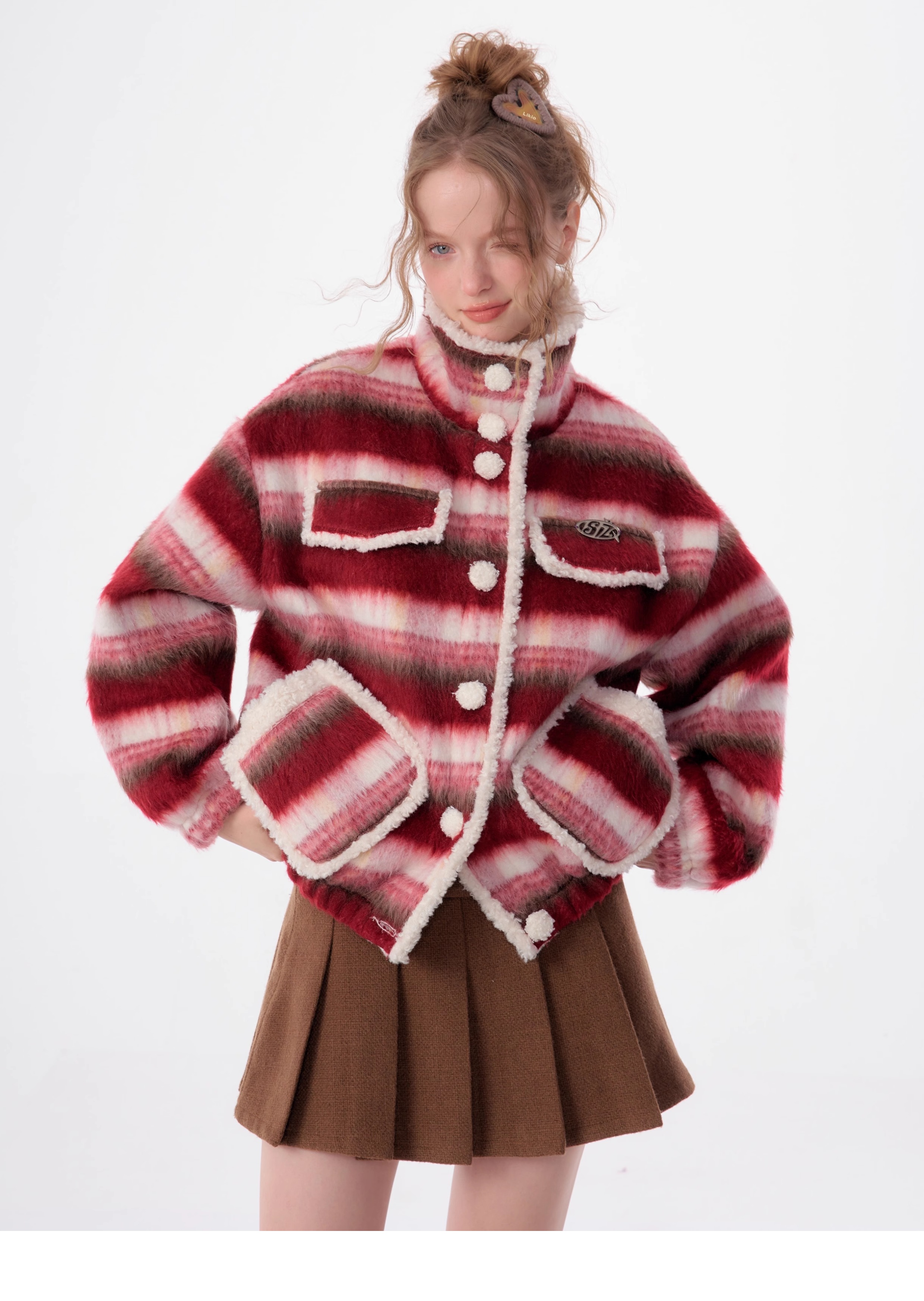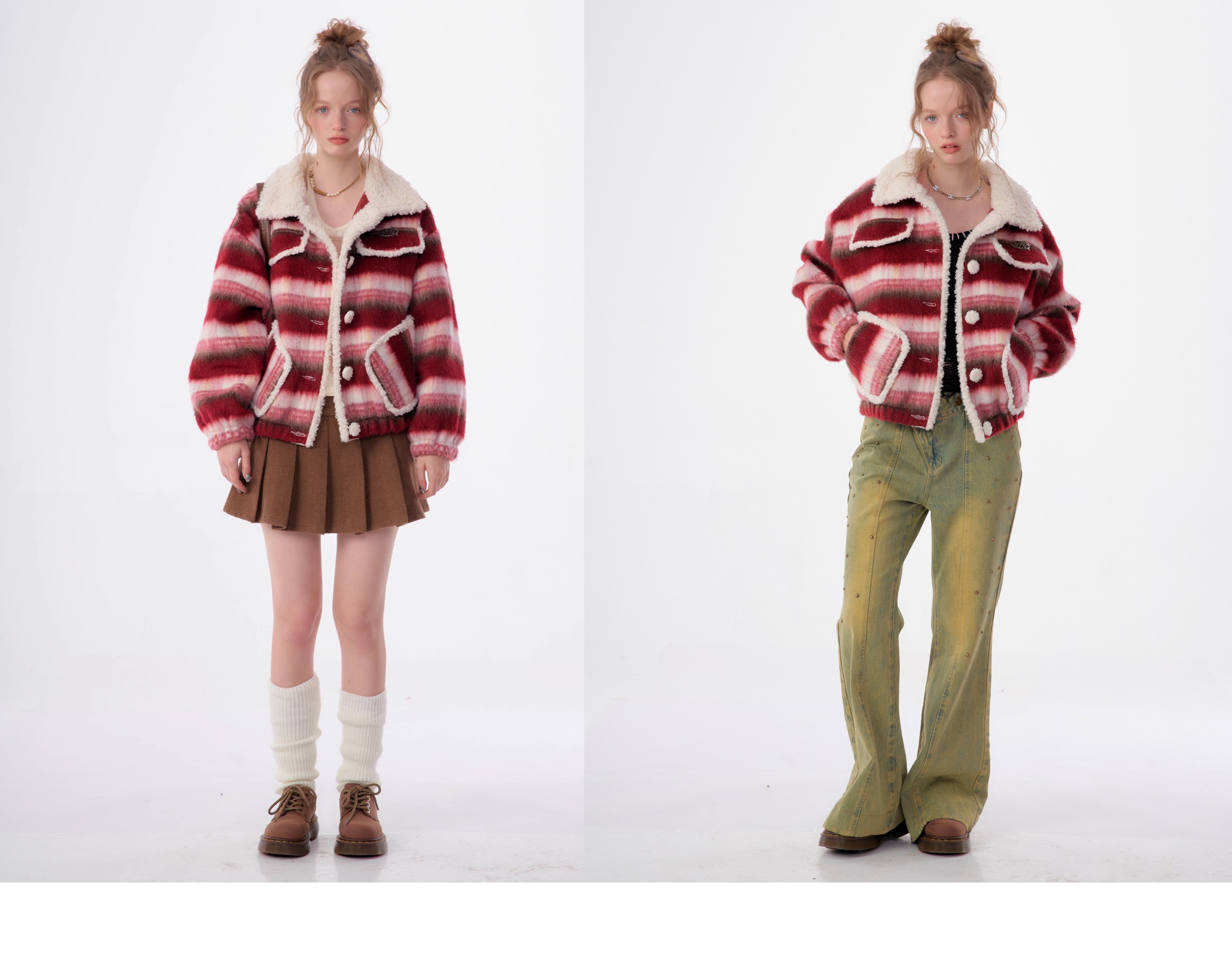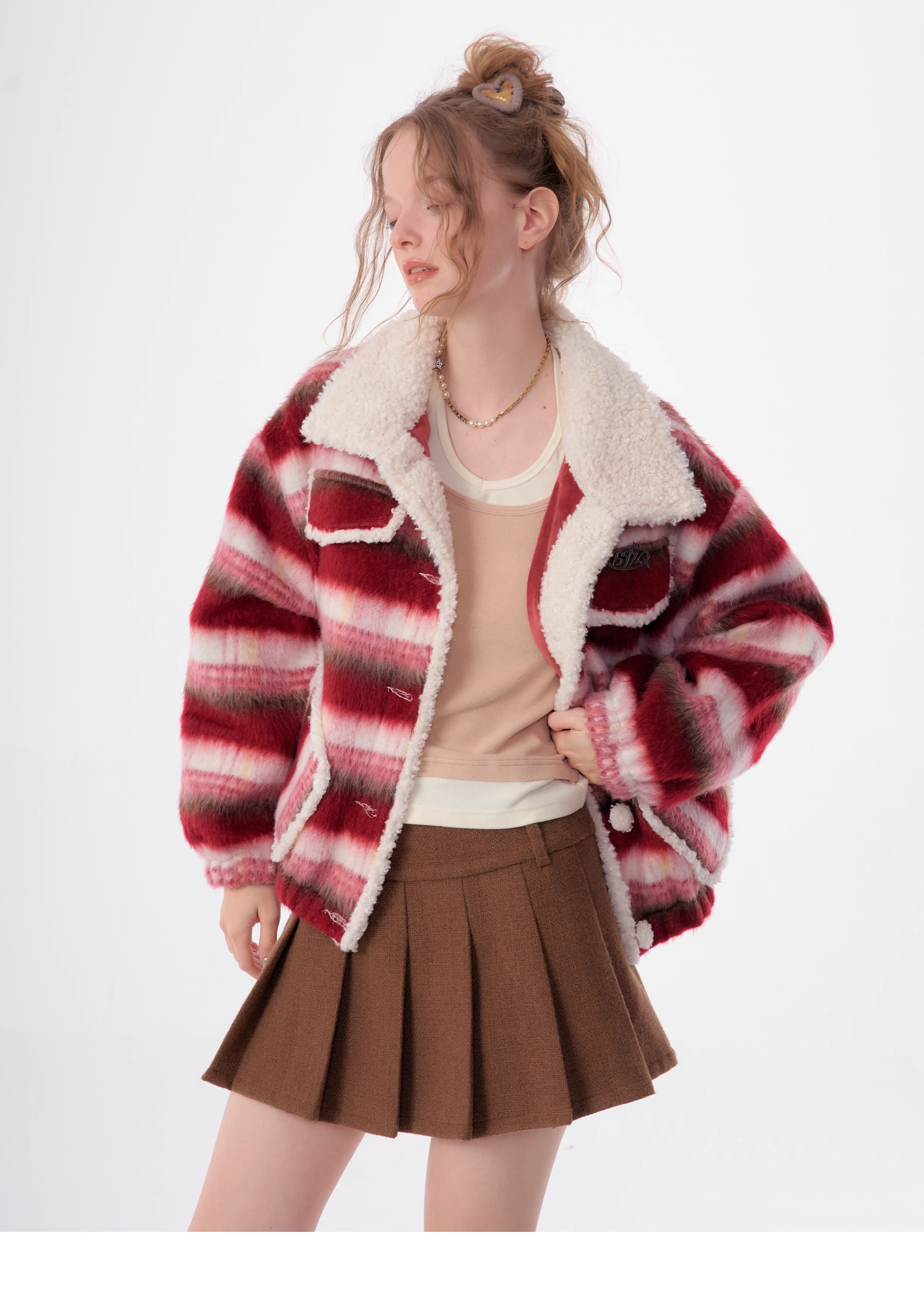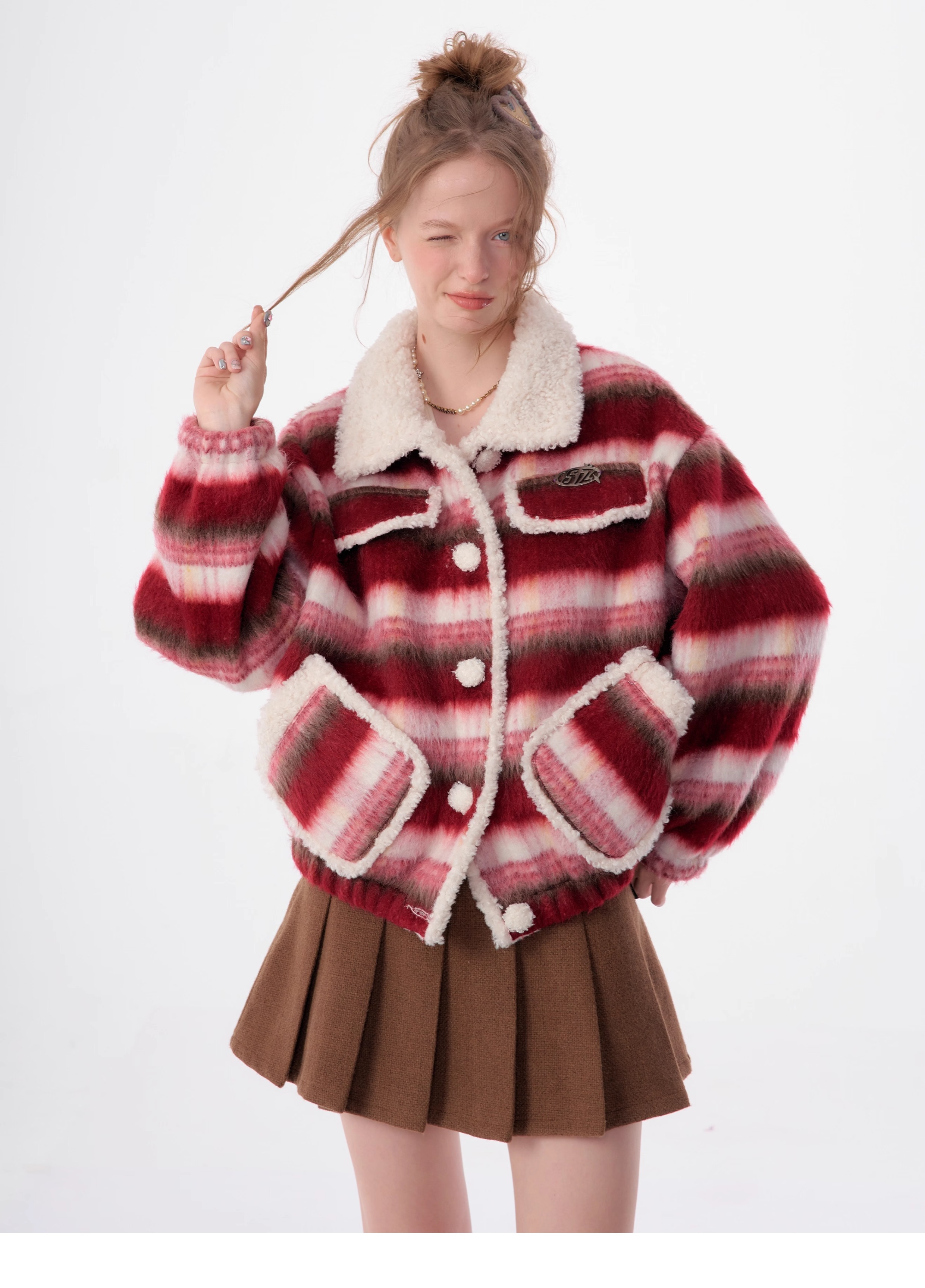 Red Striped Wool Coat | Retro Rabbit Pattern Christmas Design for Autumn/Winter