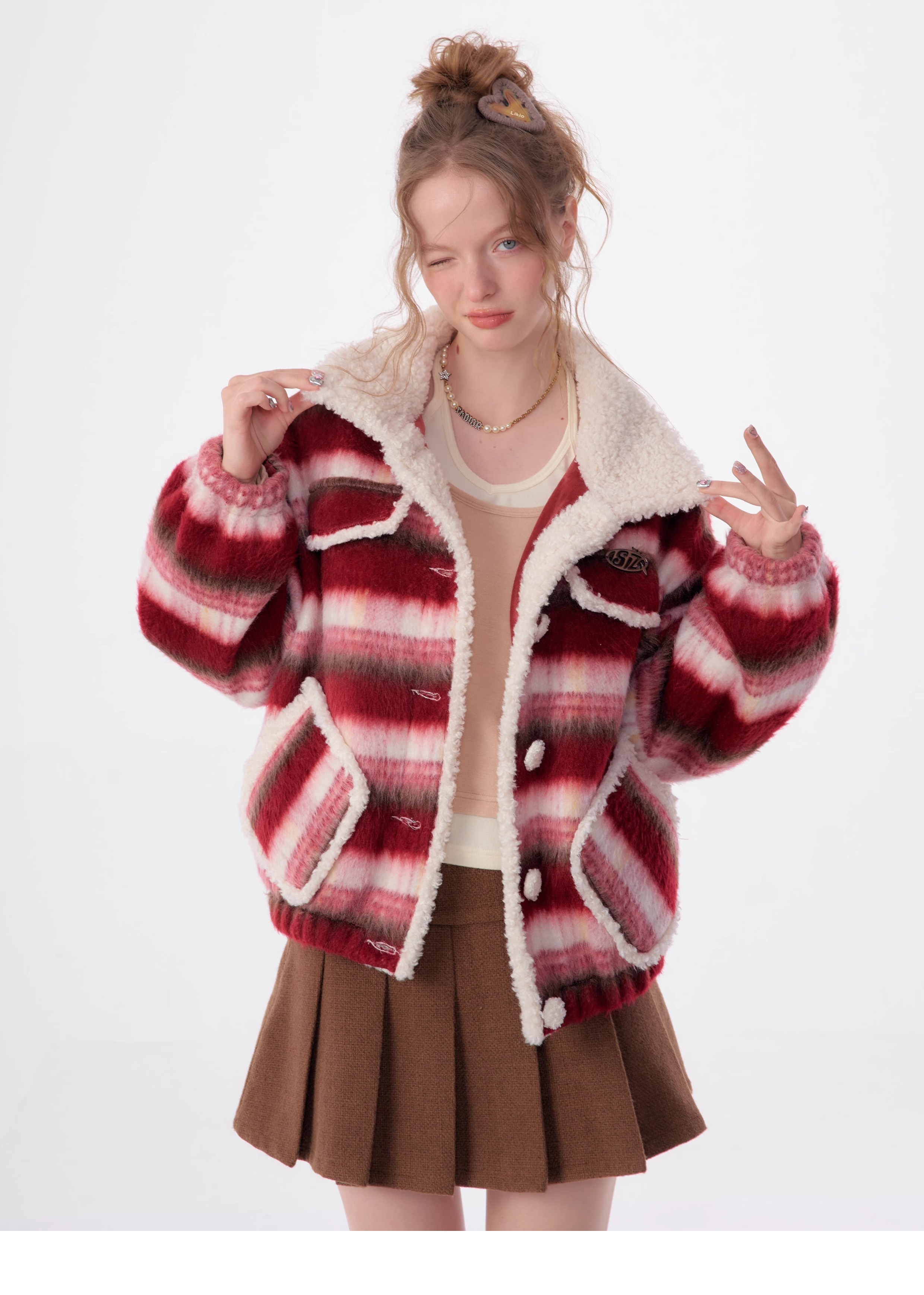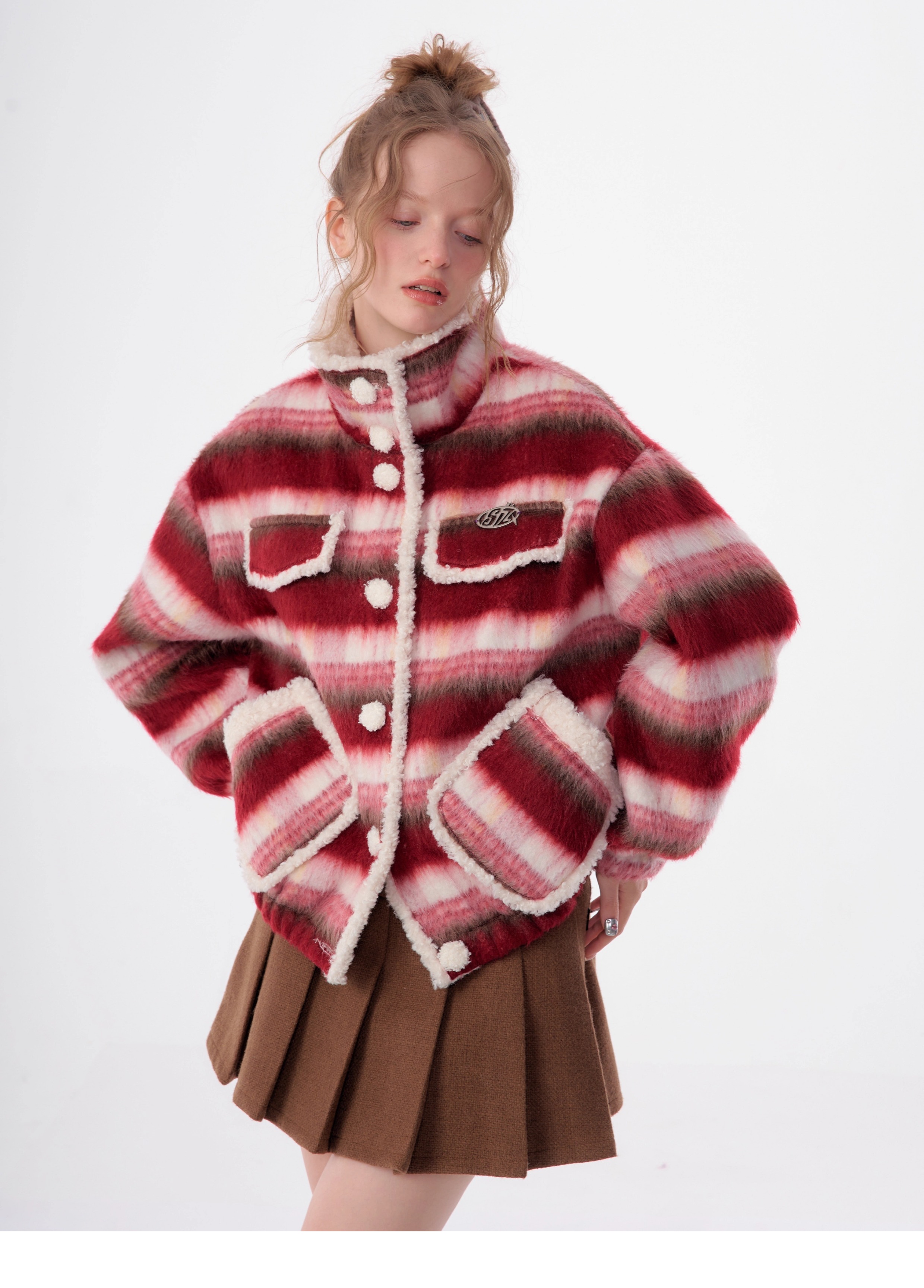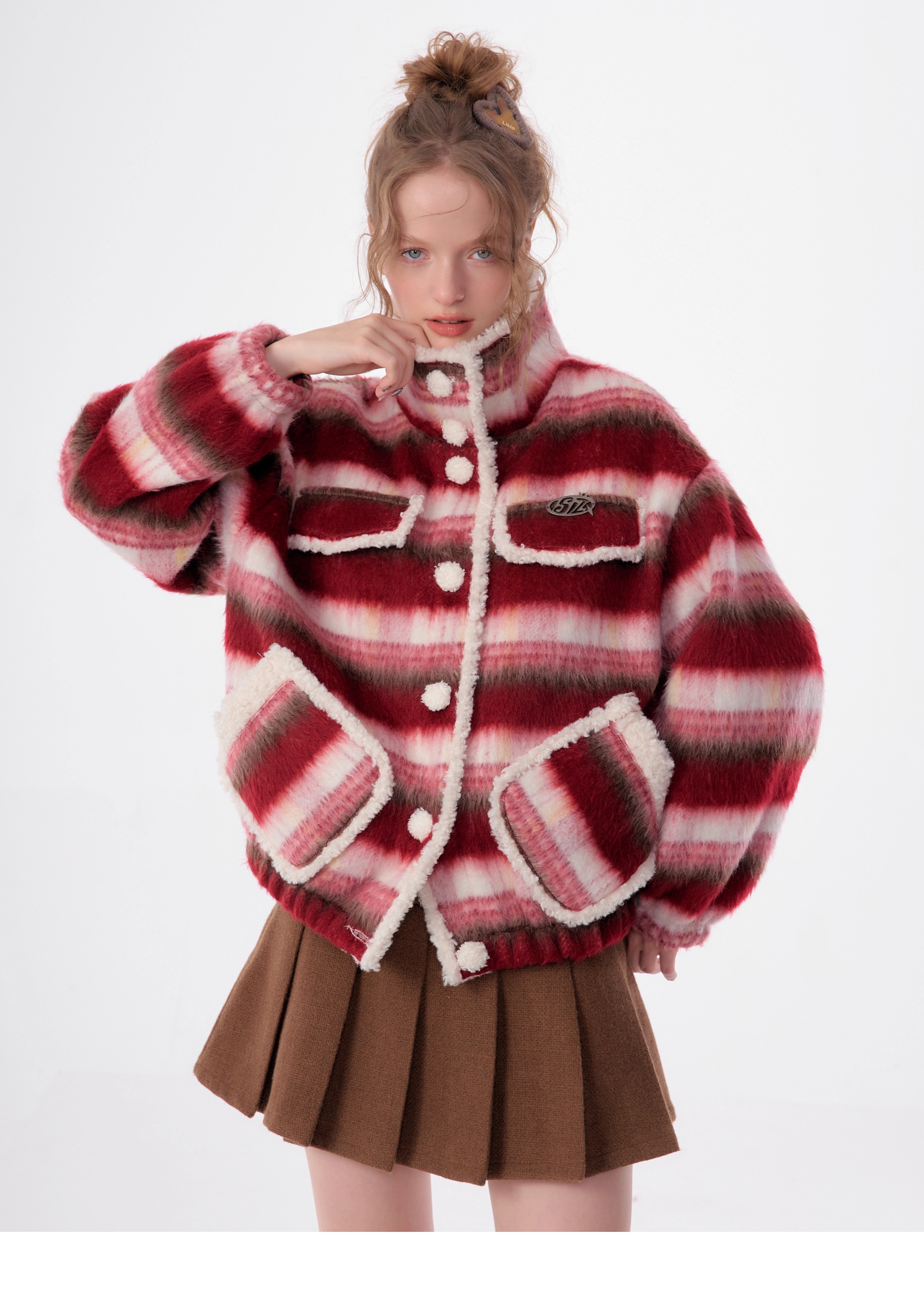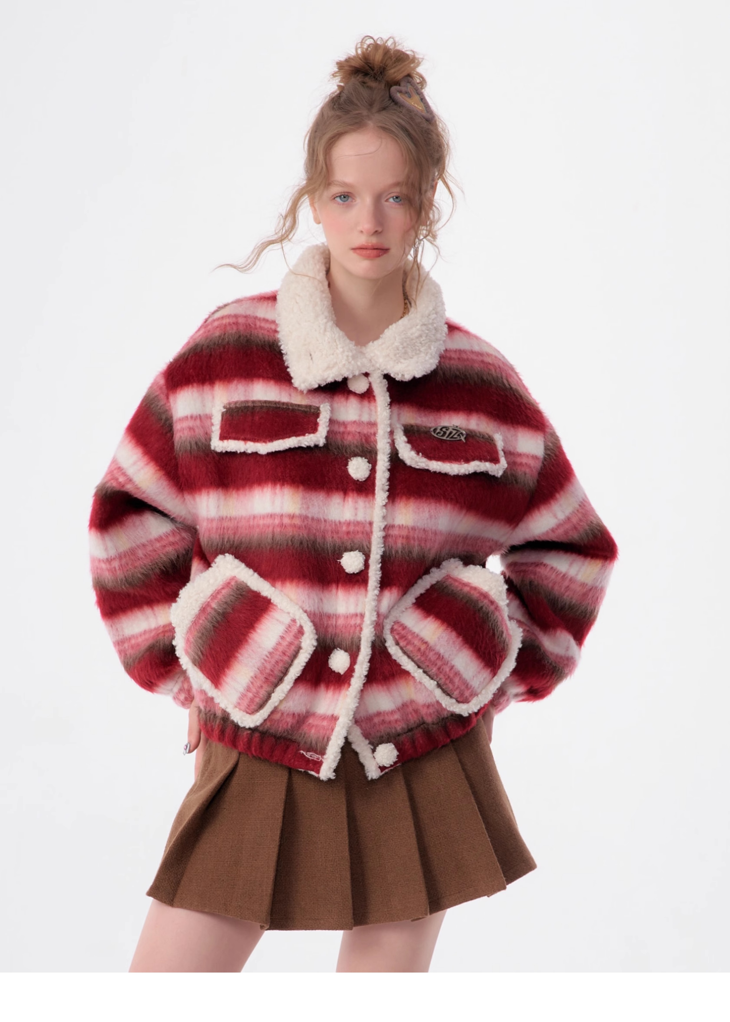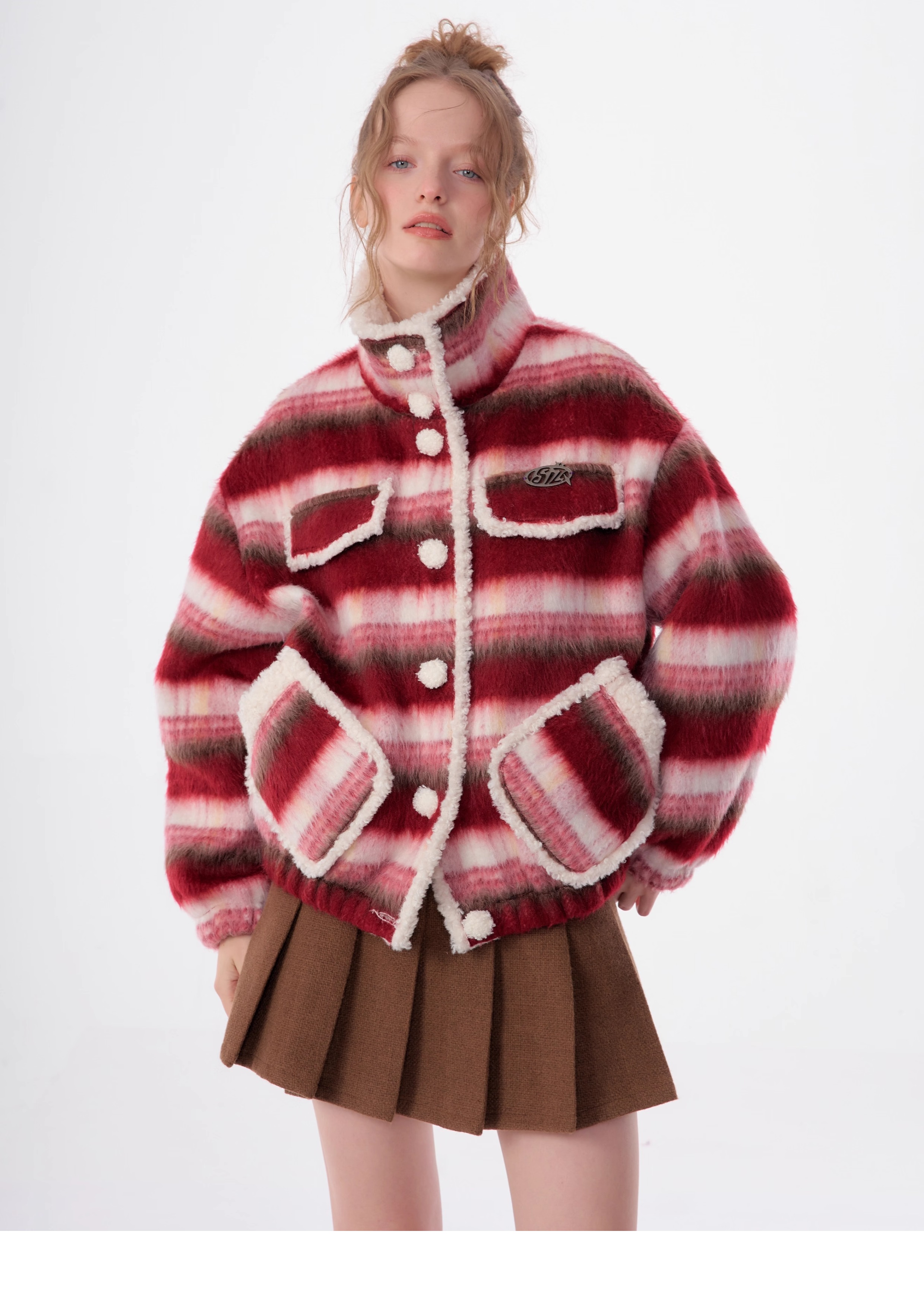 Red Striped Wool Coat | Retro Rabbit Pattern Christmas Design for Autumn/Winter
