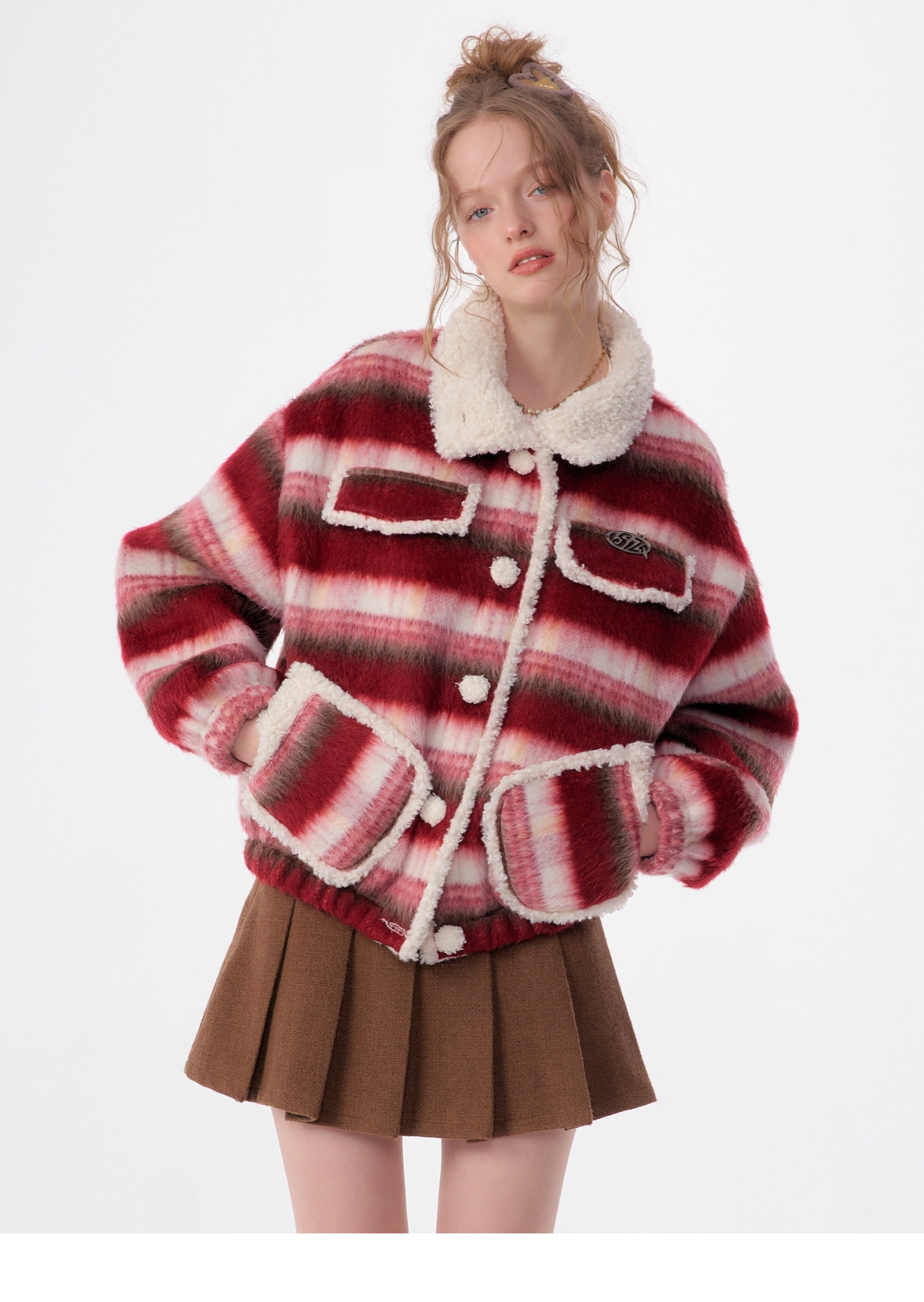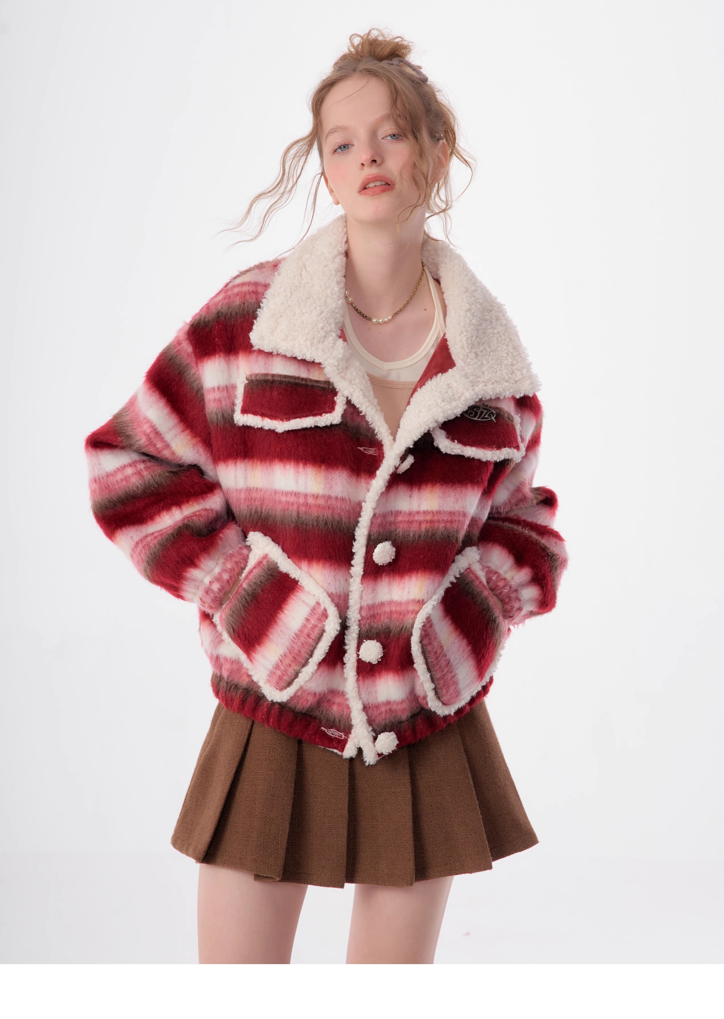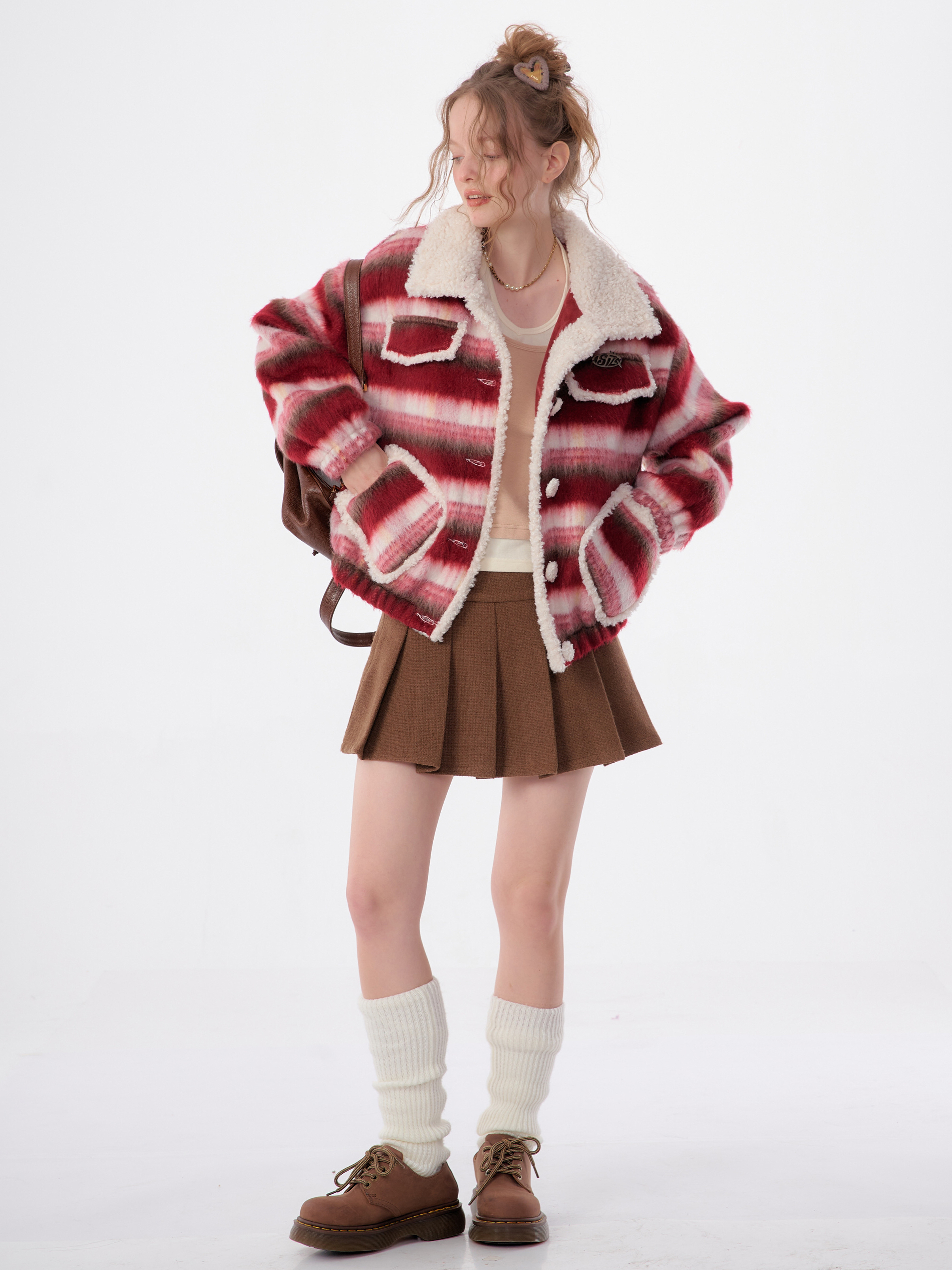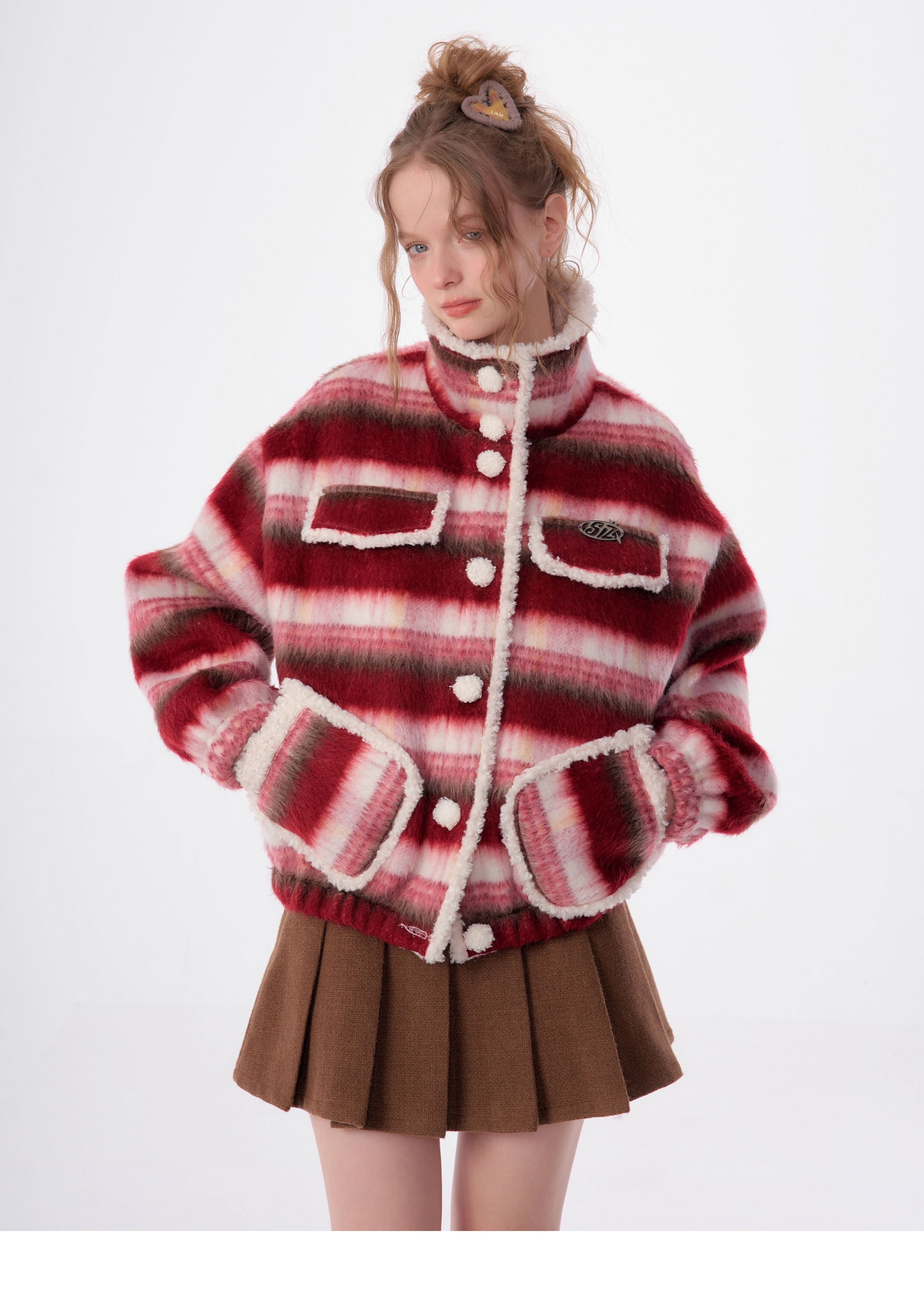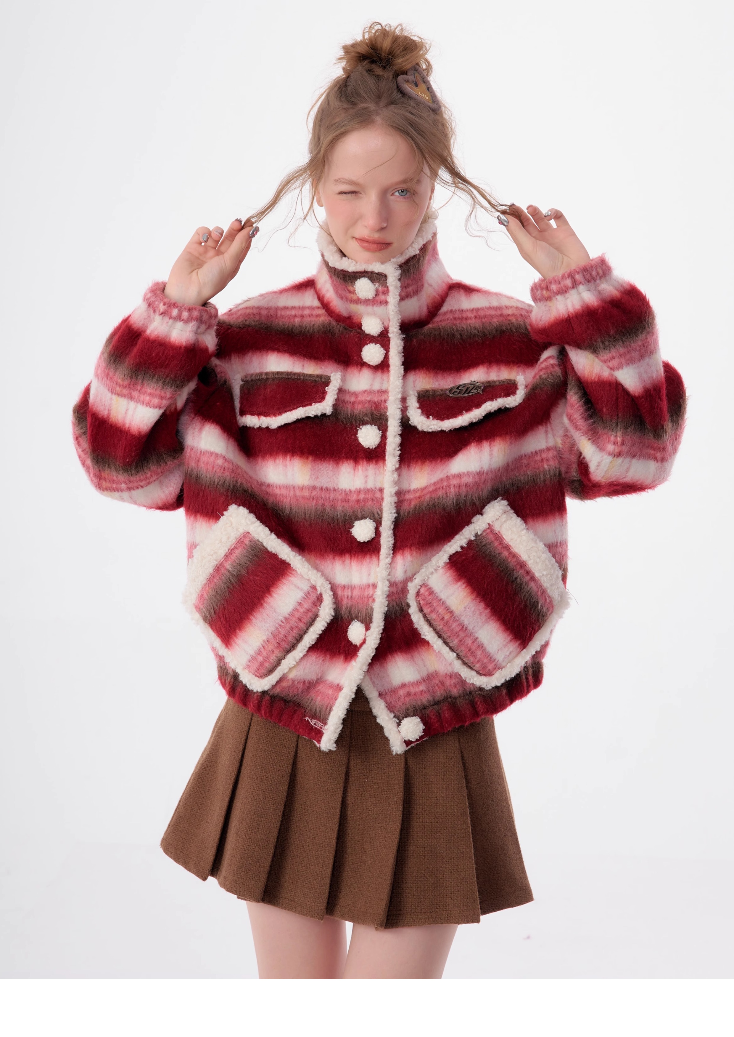 Red Striped Wool Coat | Retro Rabbit Pattern Christmas Design for Autumn/Winter
