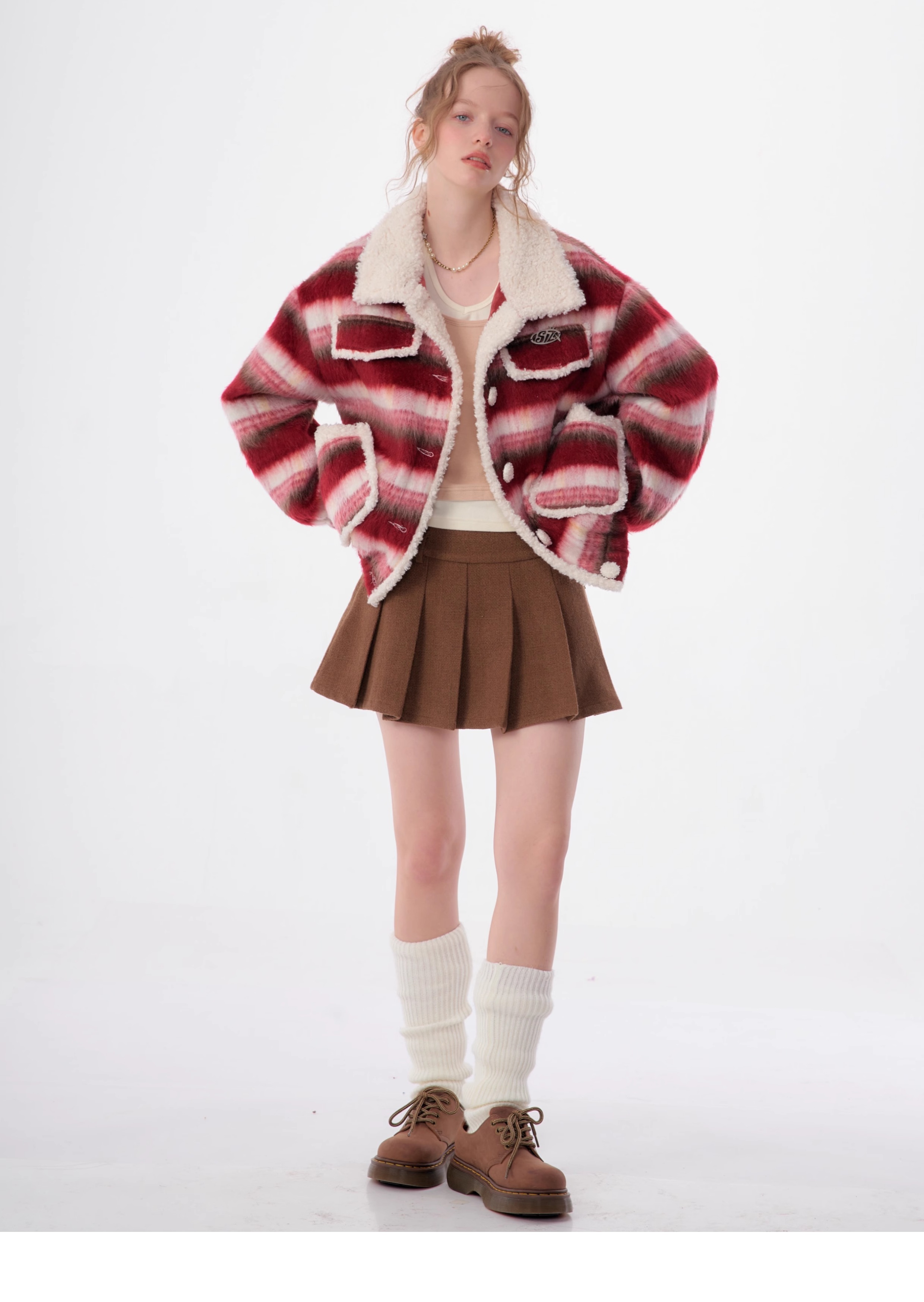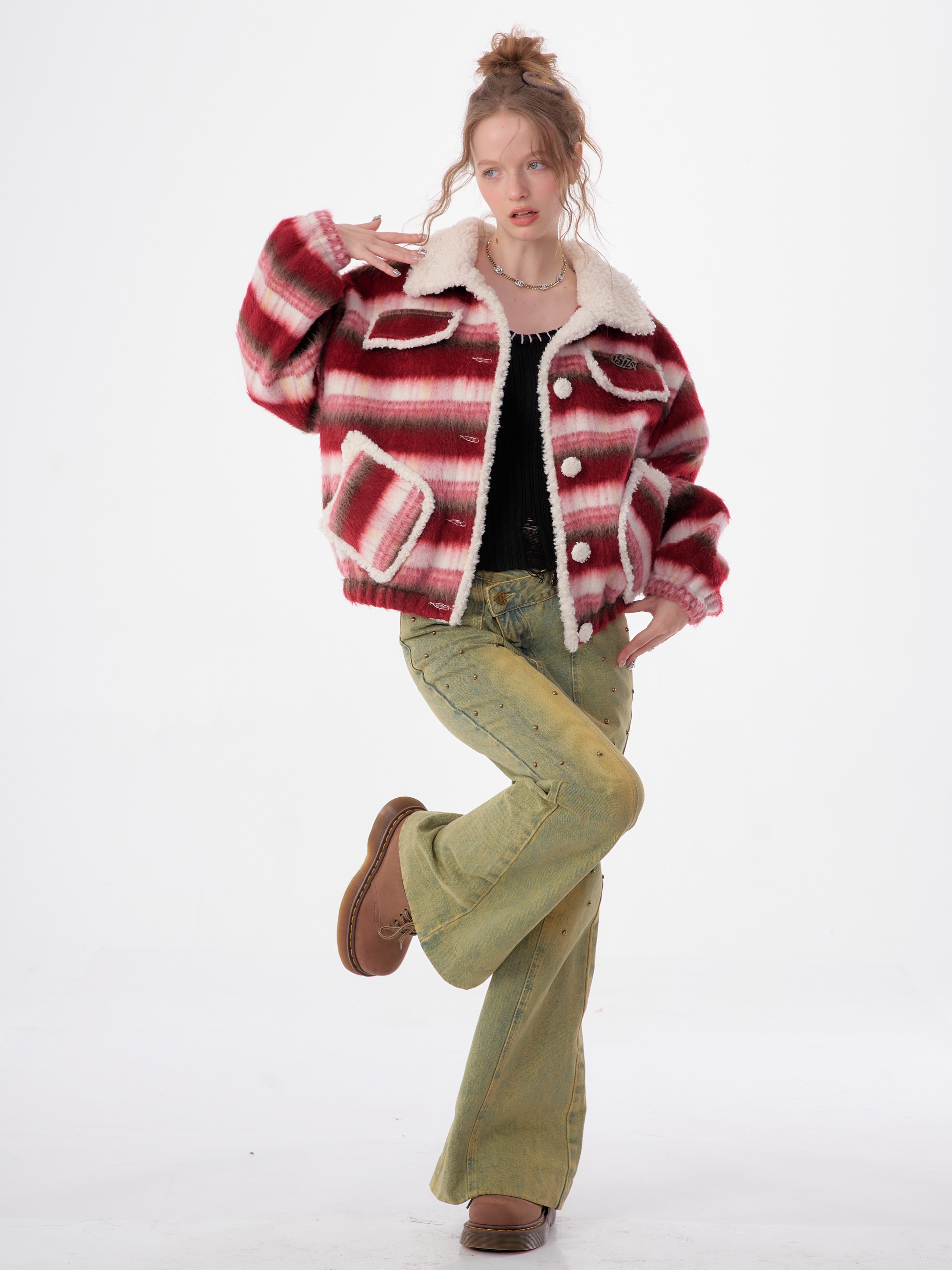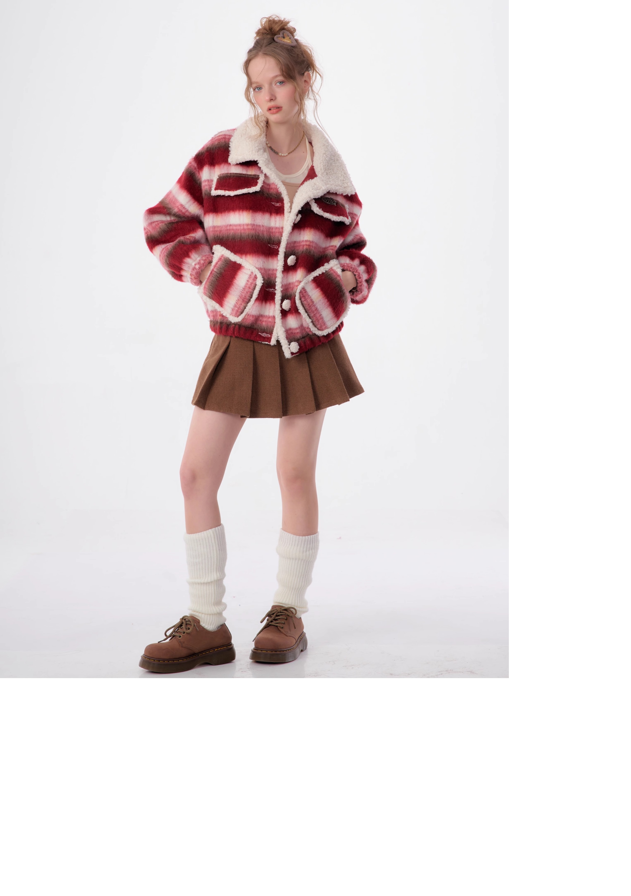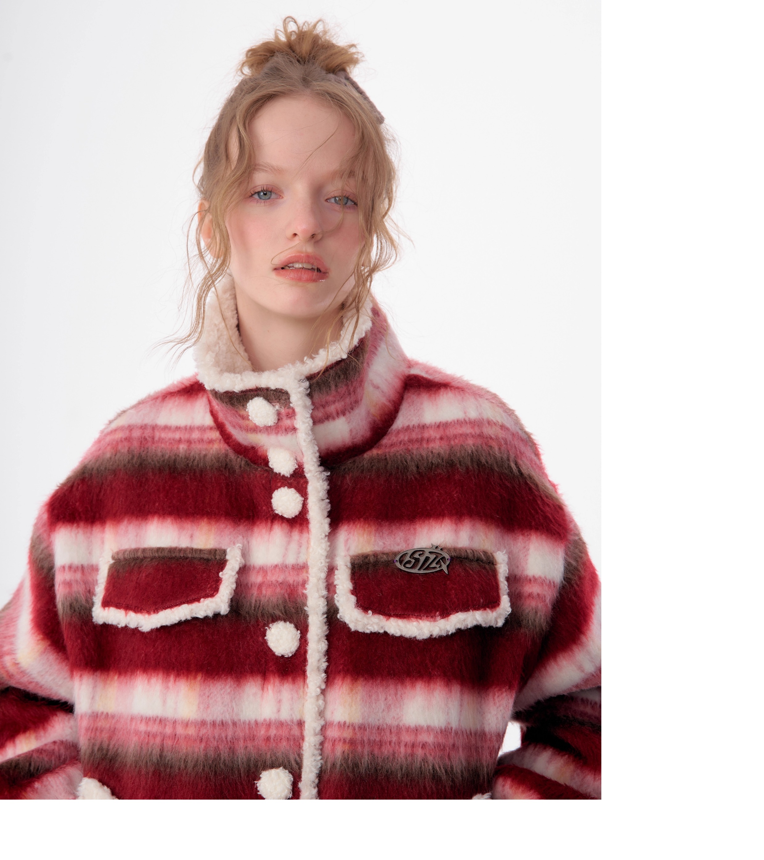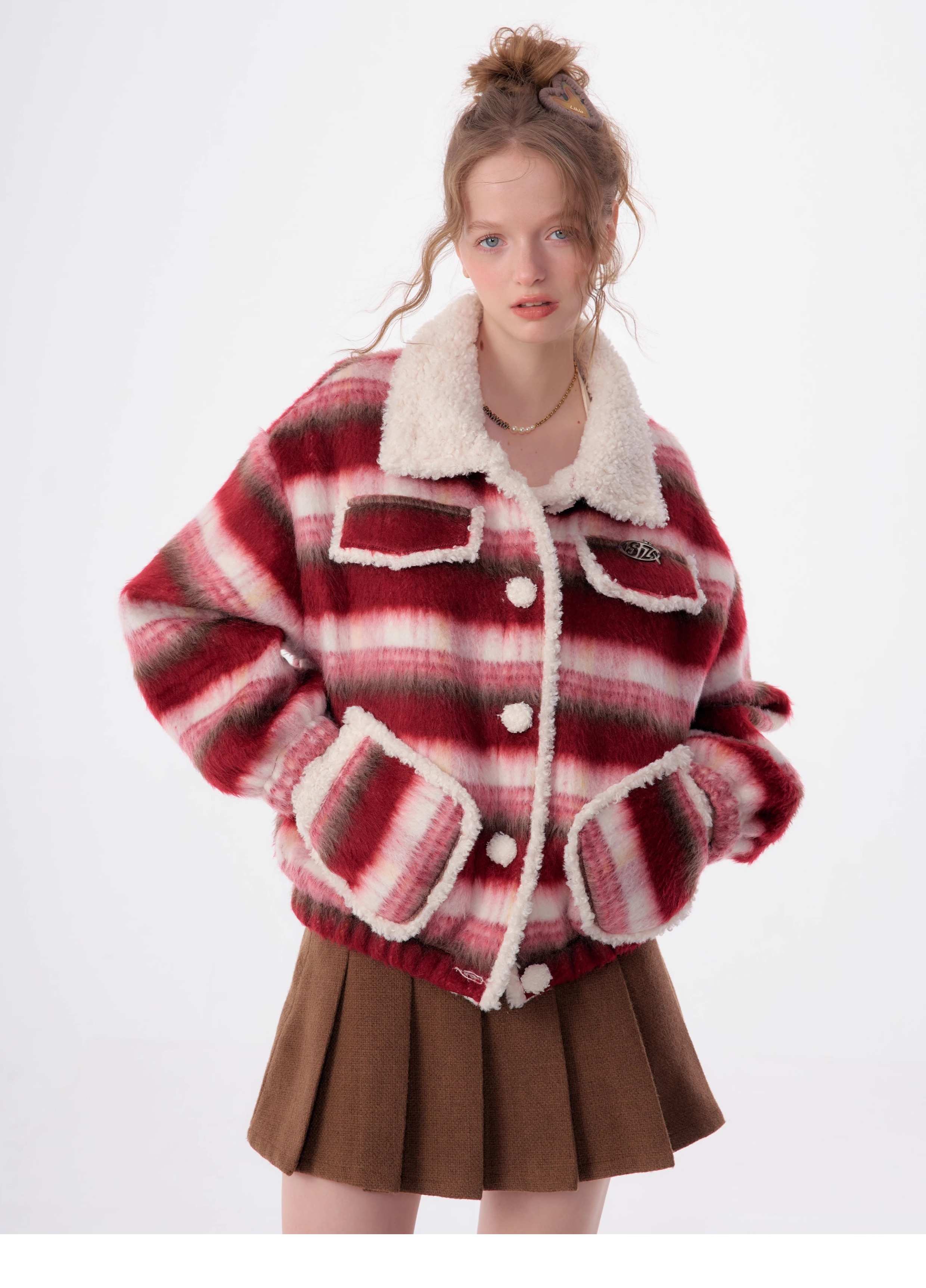 Red Striped Wool Coat | Retro Rabbit Pattern Christmas Design for Autumn/Winter