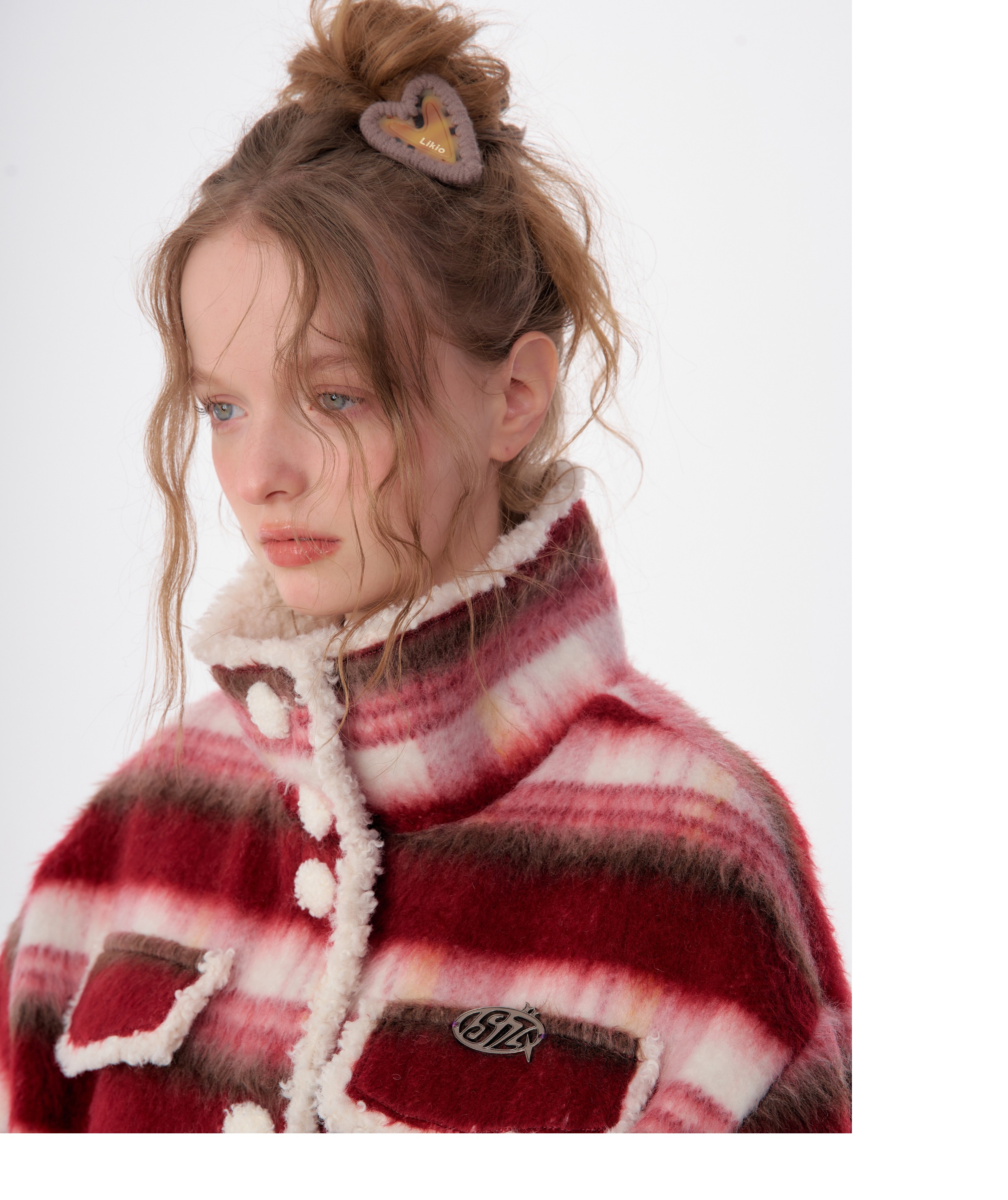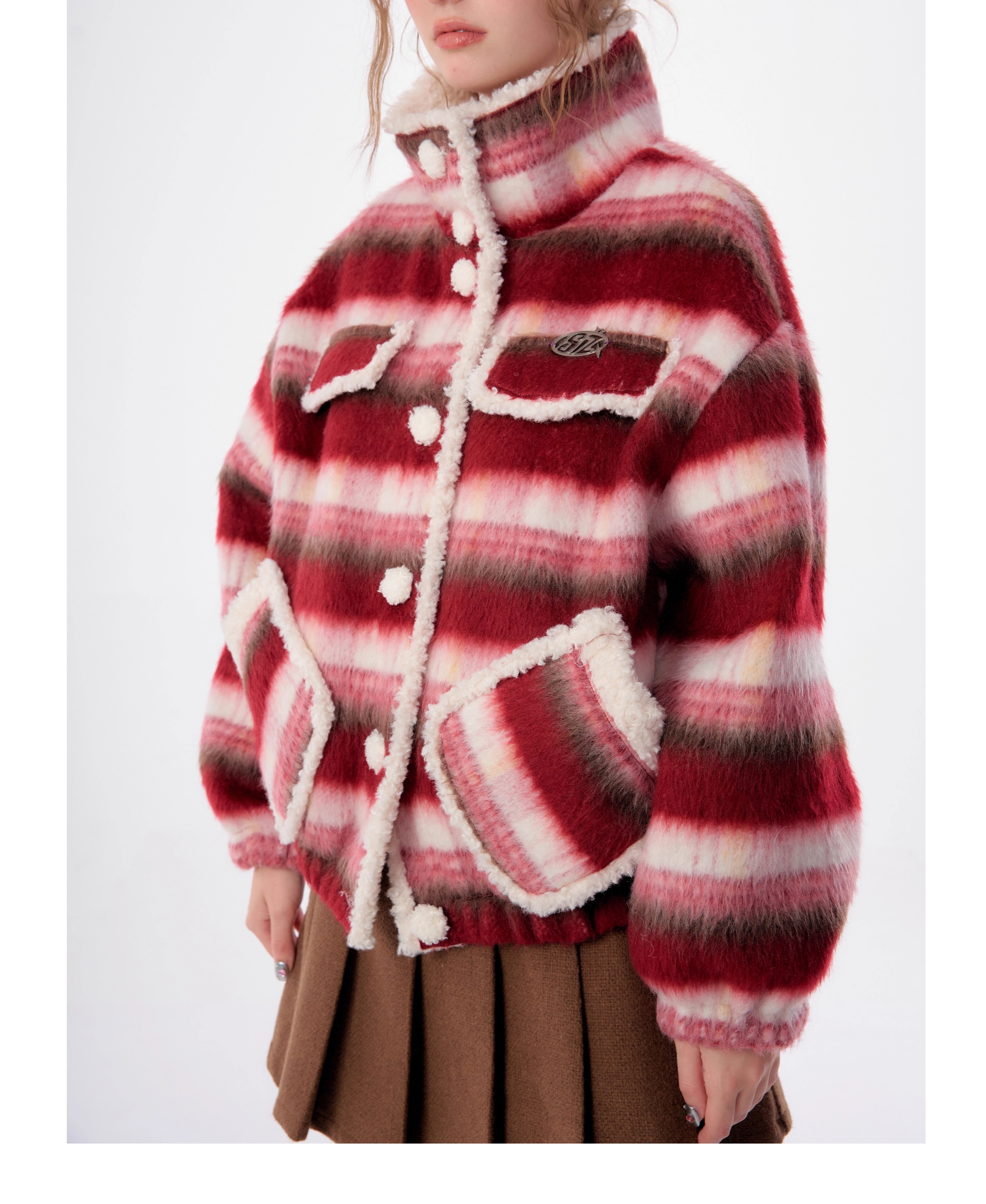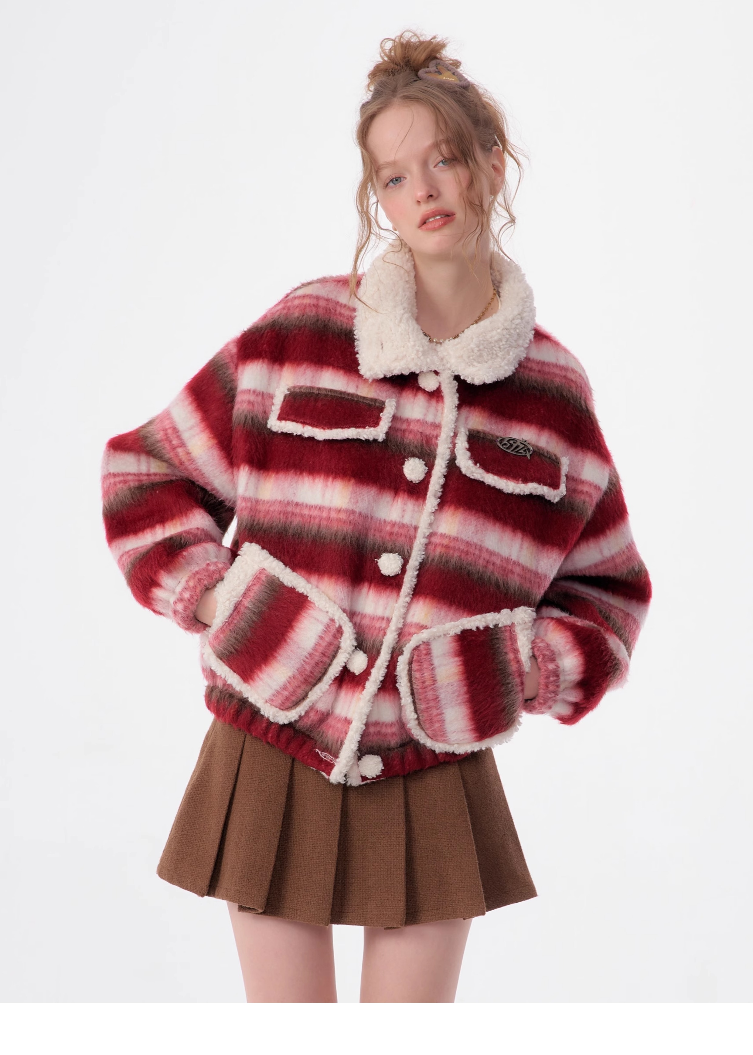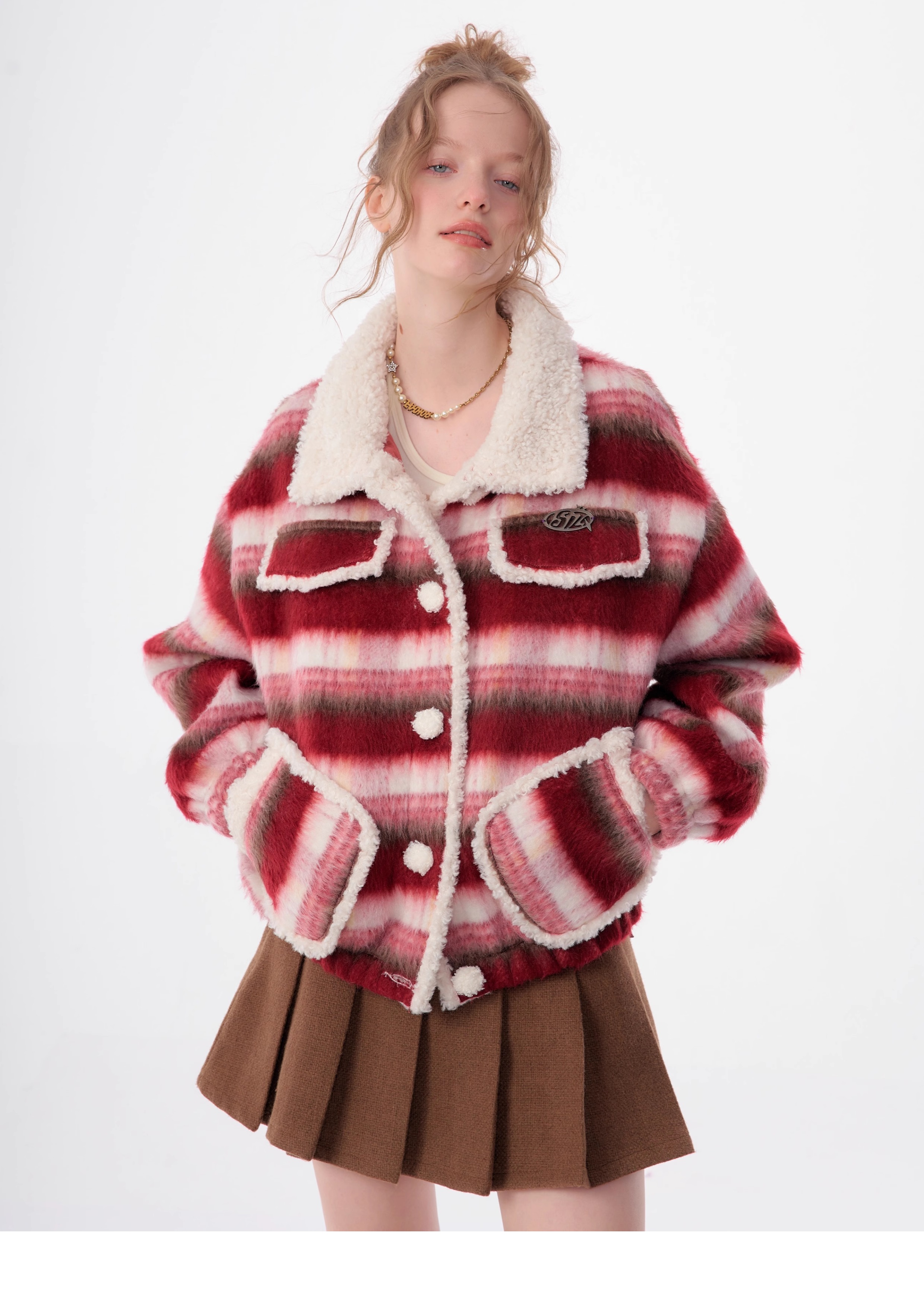 Red Striped Wool Coat | Retro Rabbit Pattern Christmas Design for Autumn/Winter