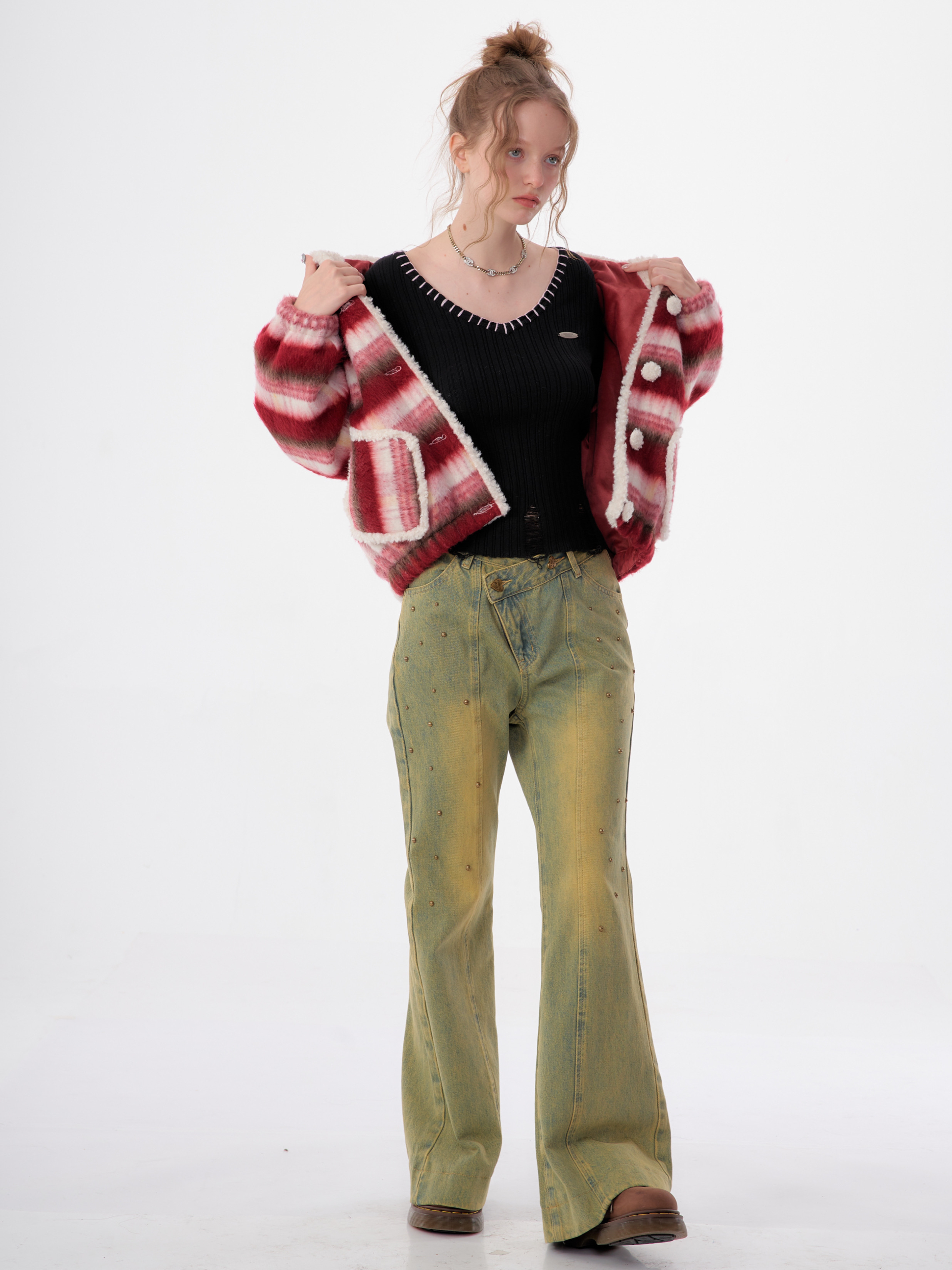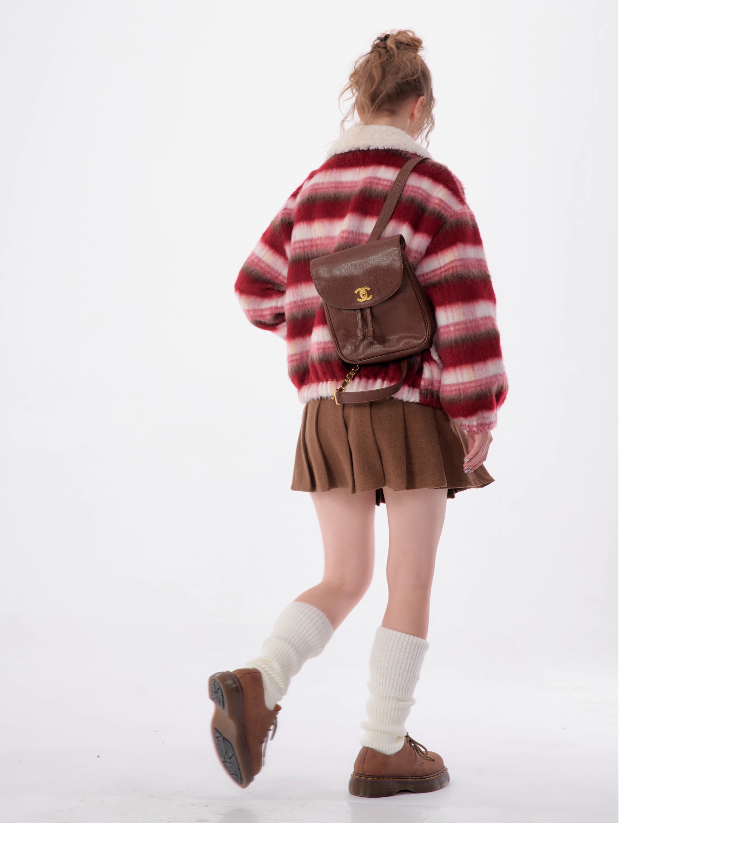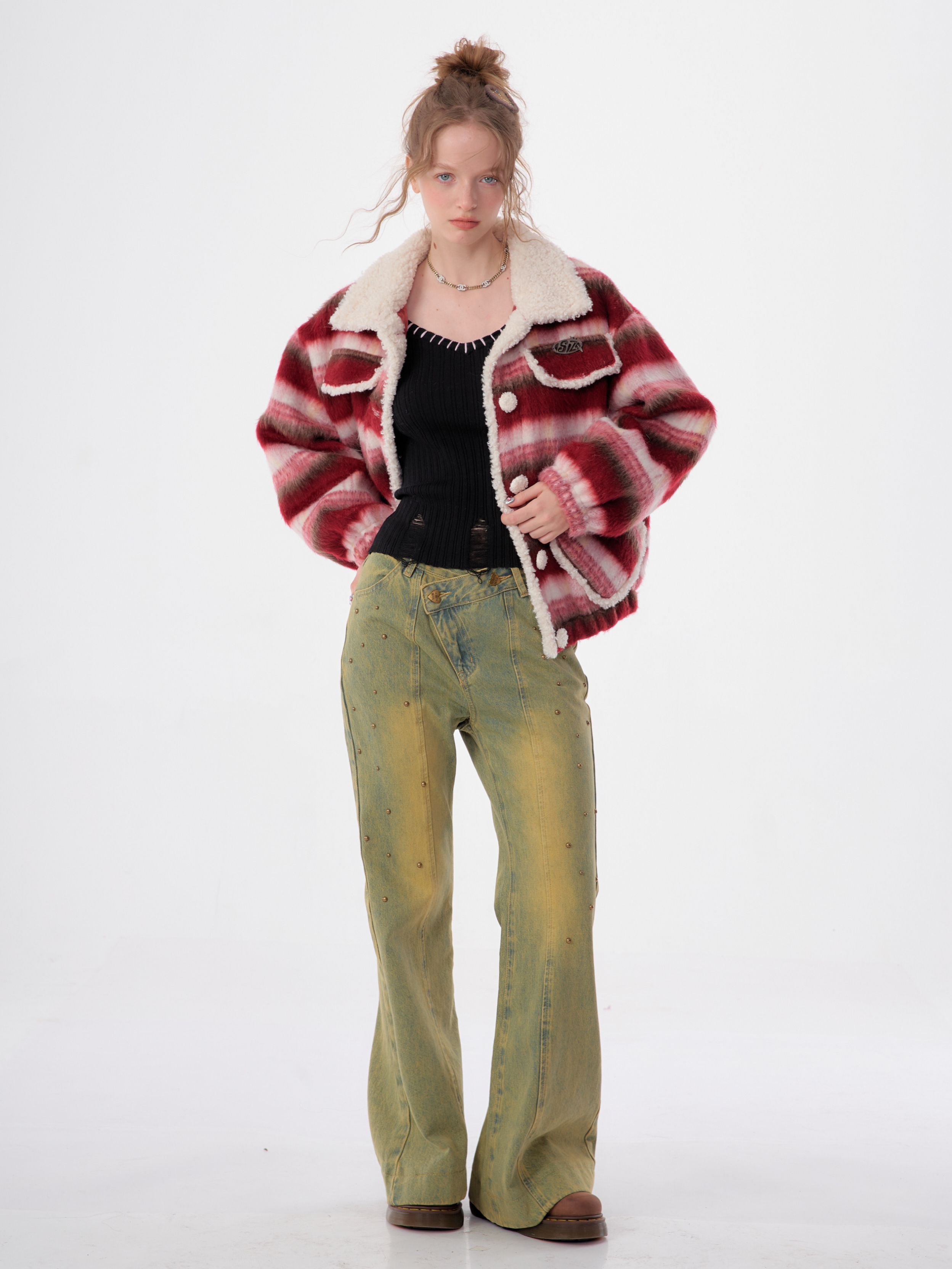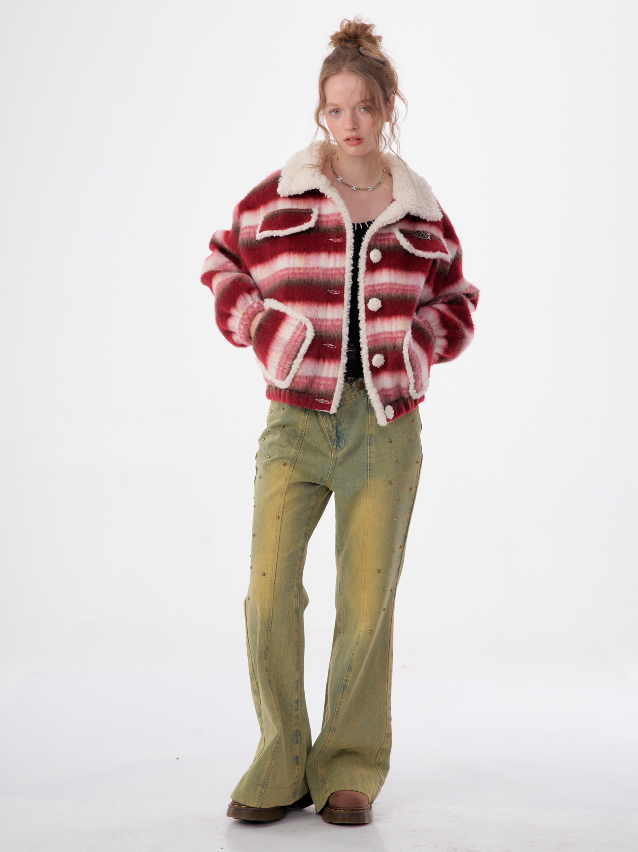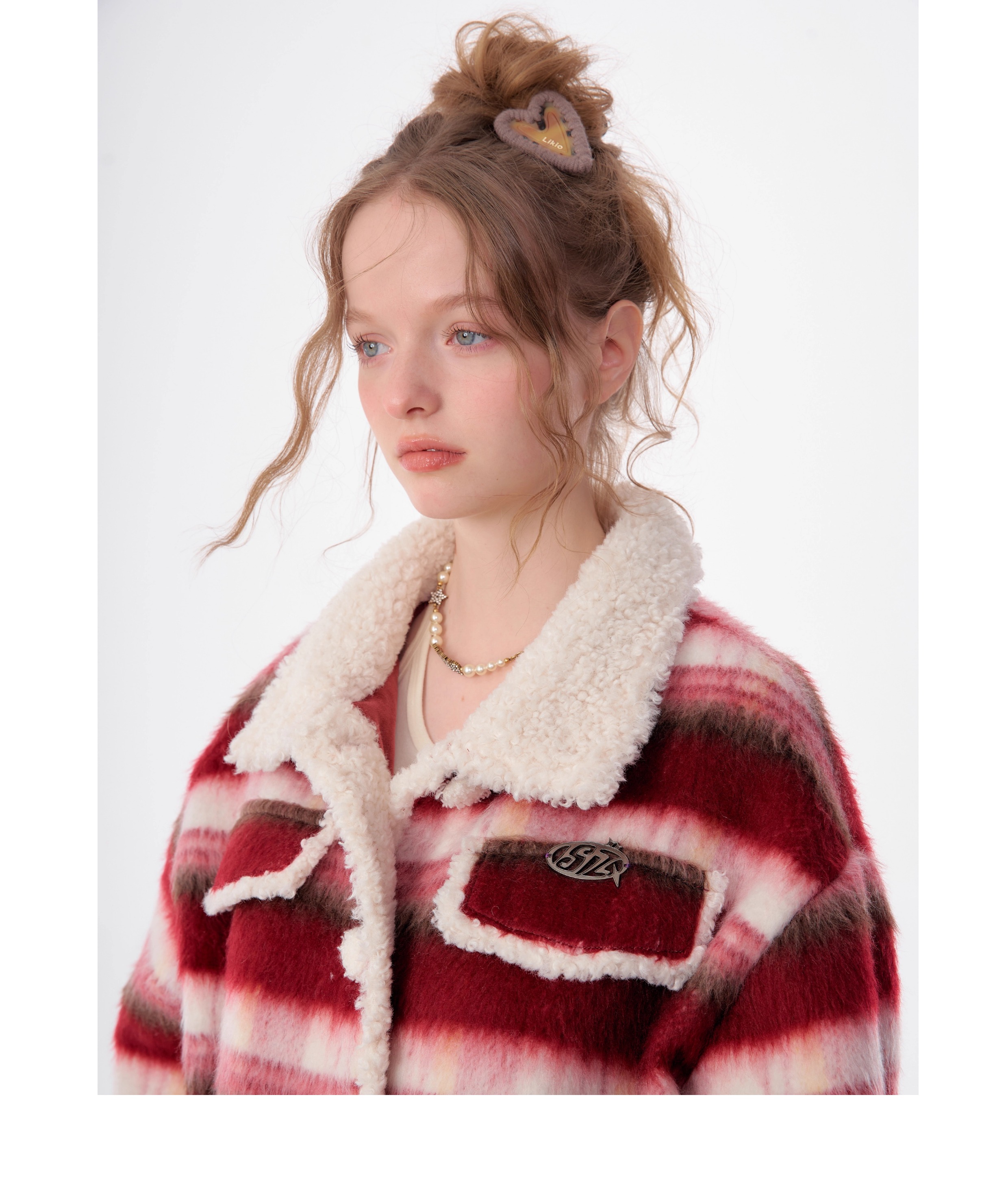 Red Striped Wool Coat | Retro Rabbit Pattern Christmas Design for Autumn/Winter