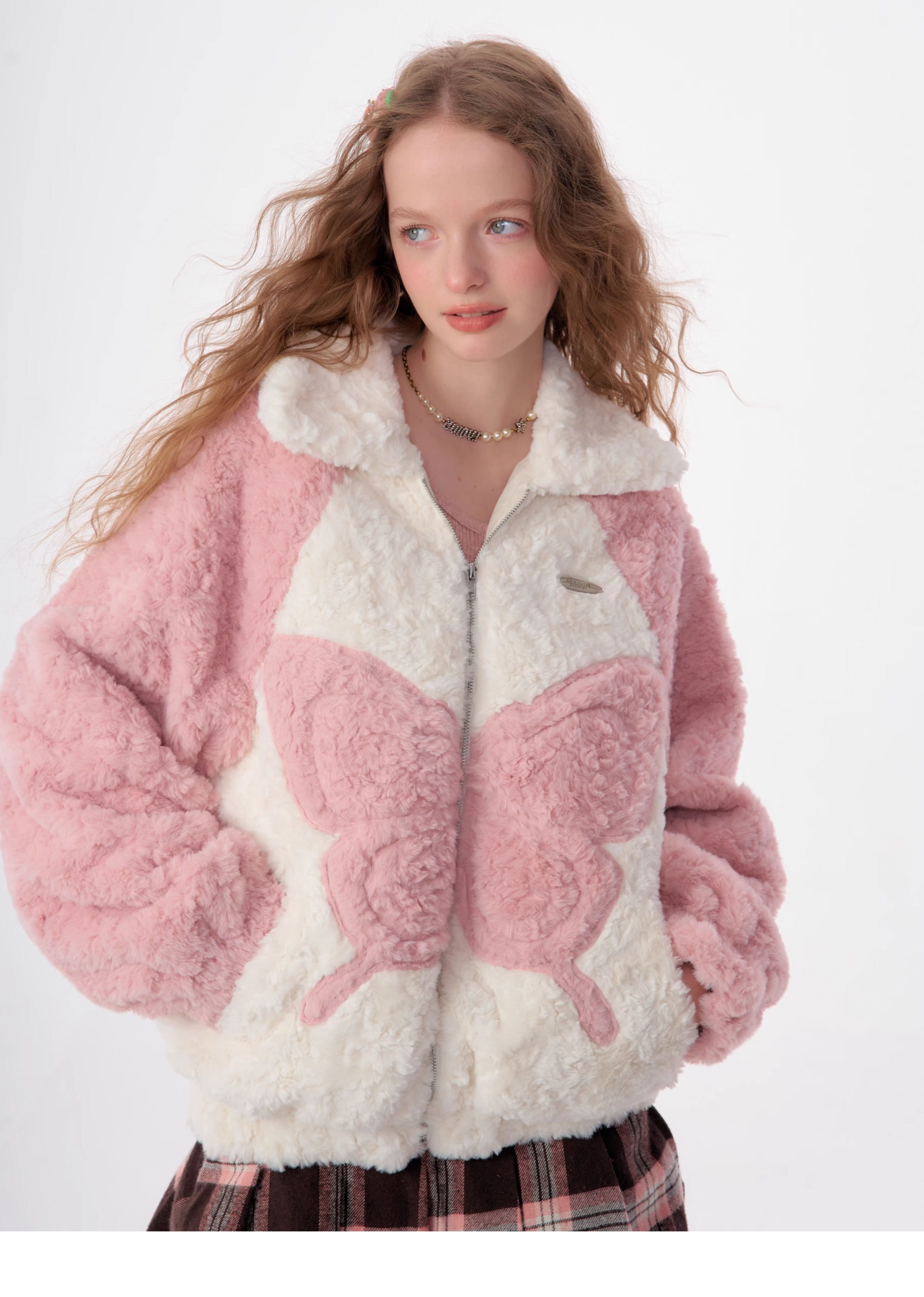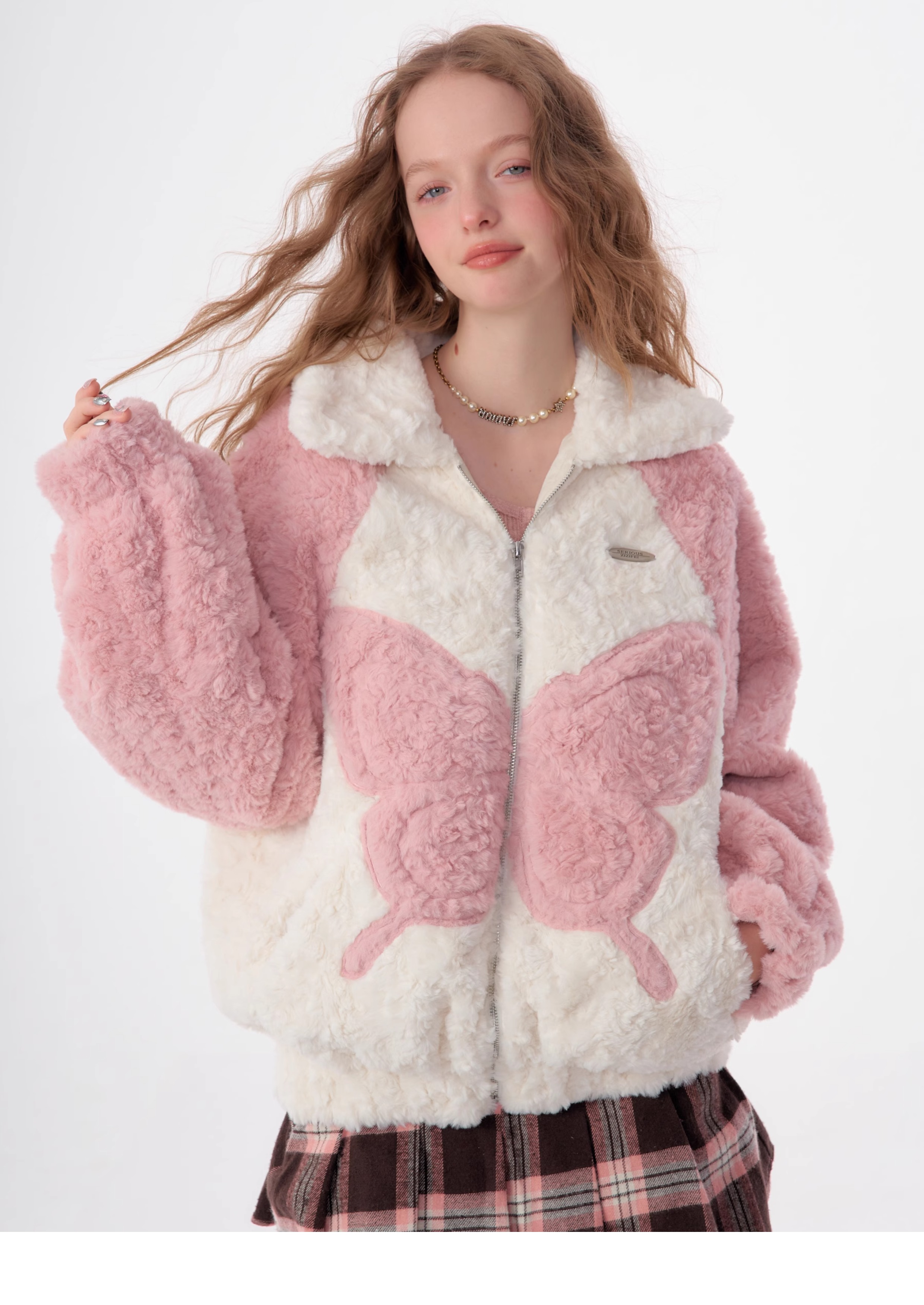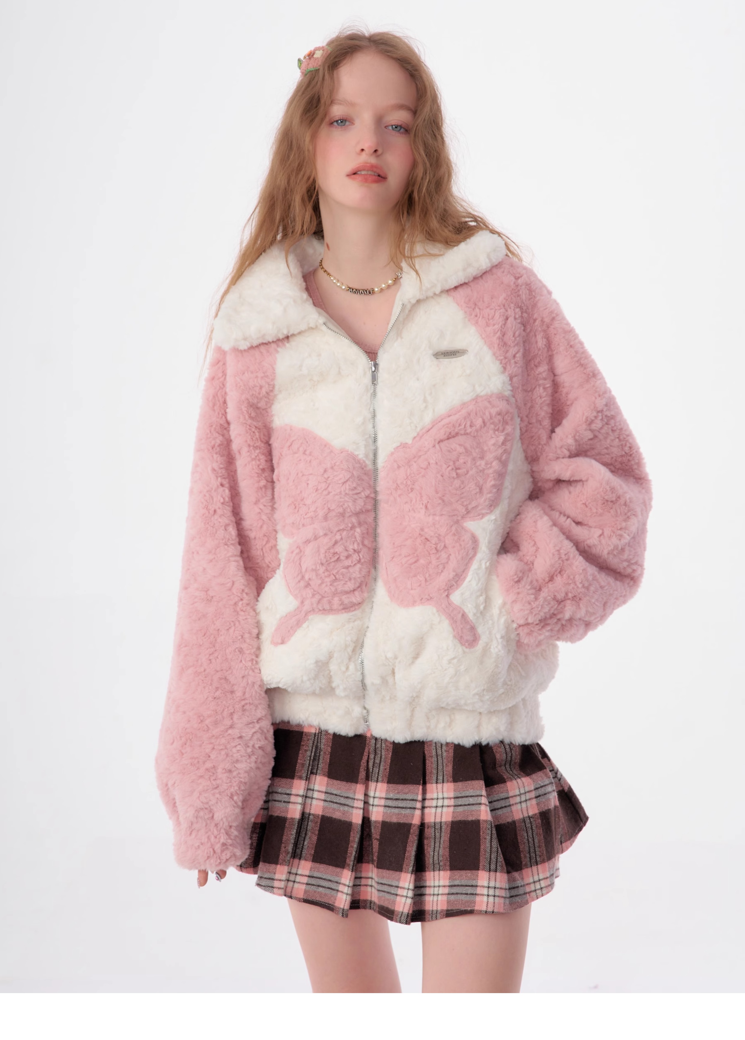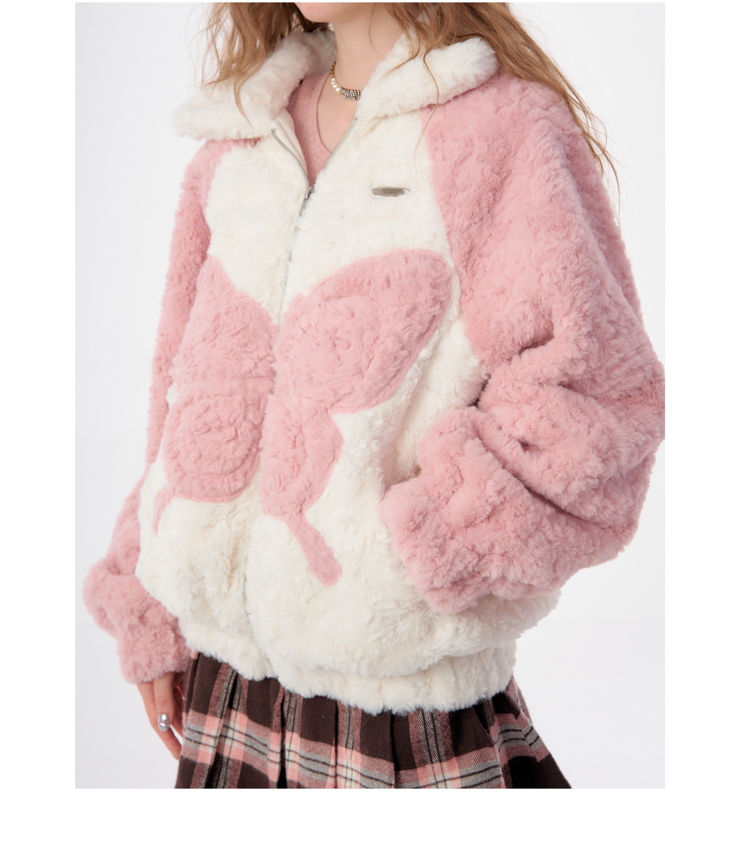 Contrast Color Butterfly Sherpa Jacket | Thick Velvet Pink-White Design for Autumn/Winter