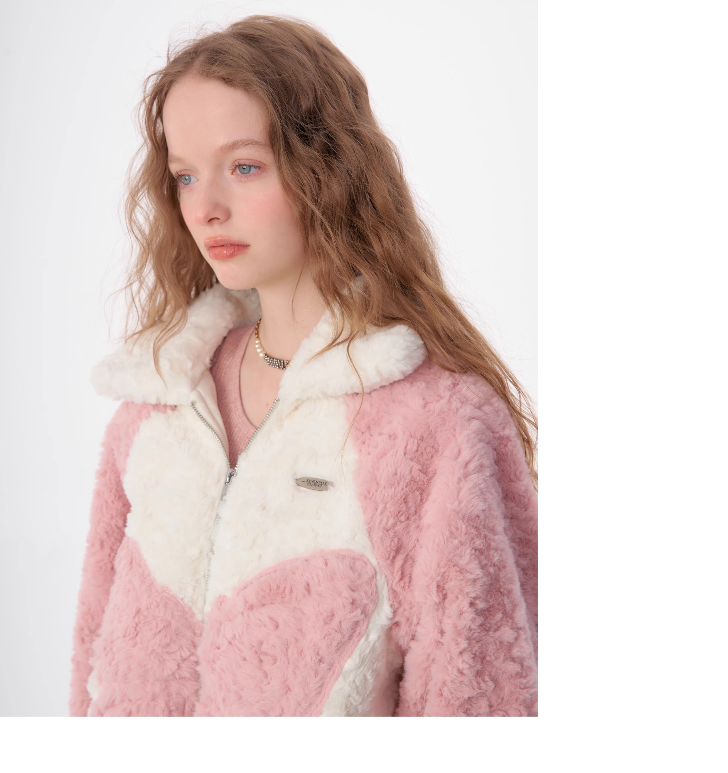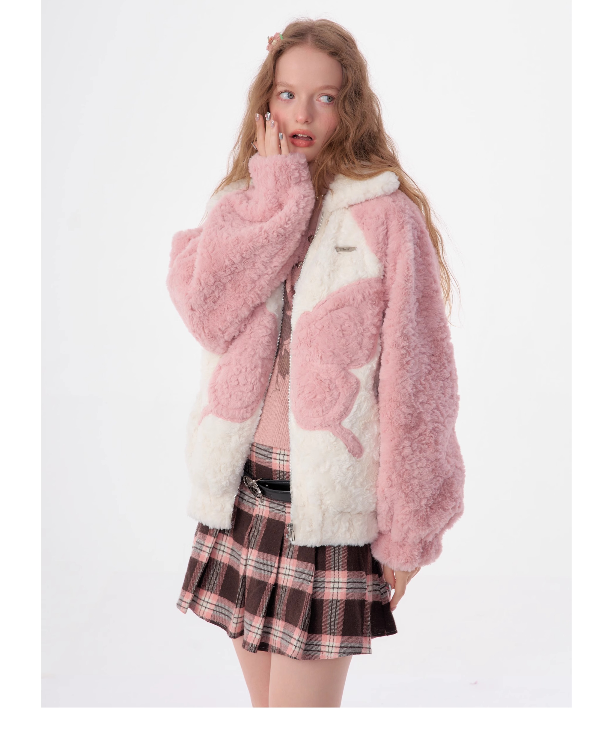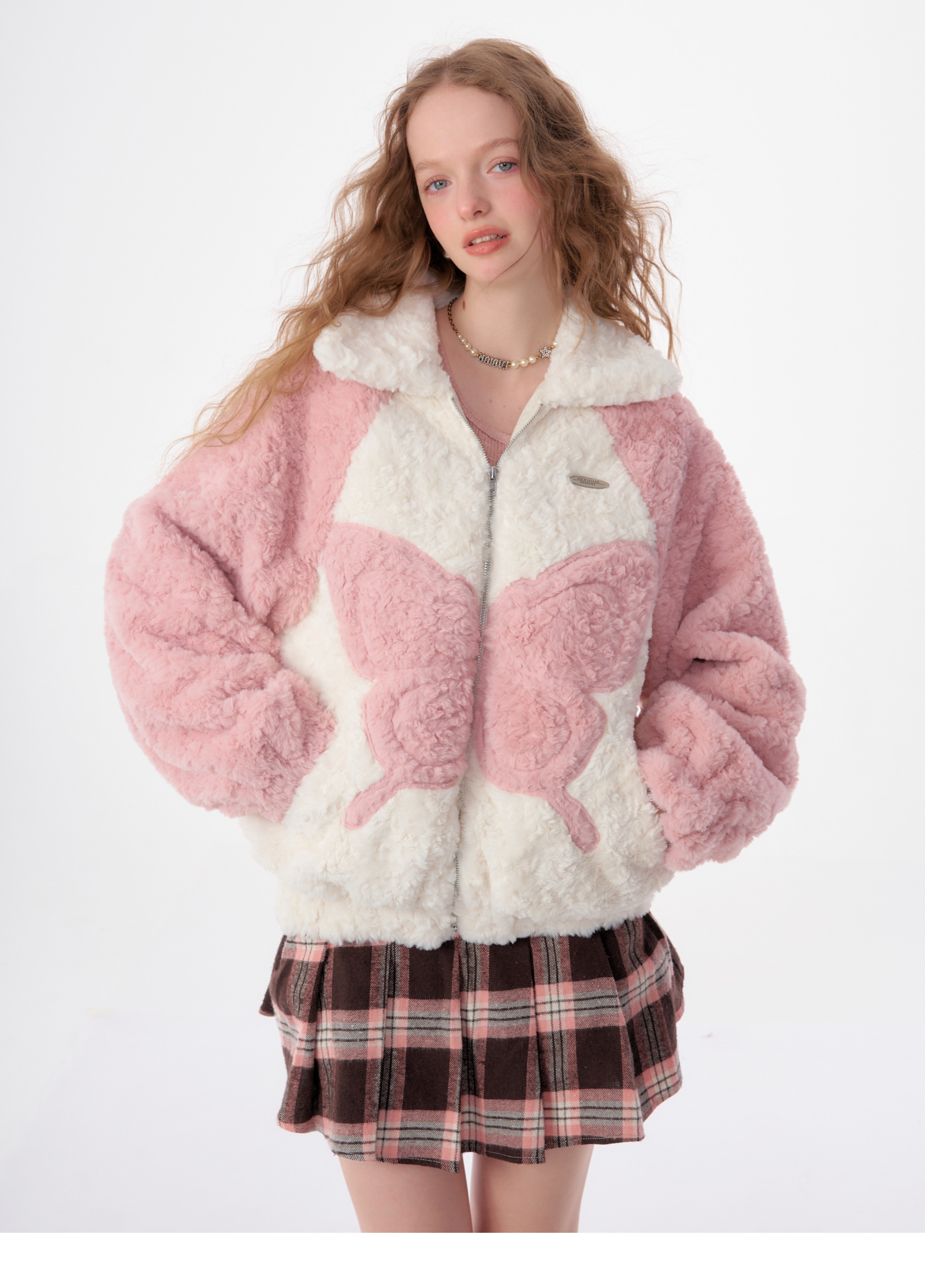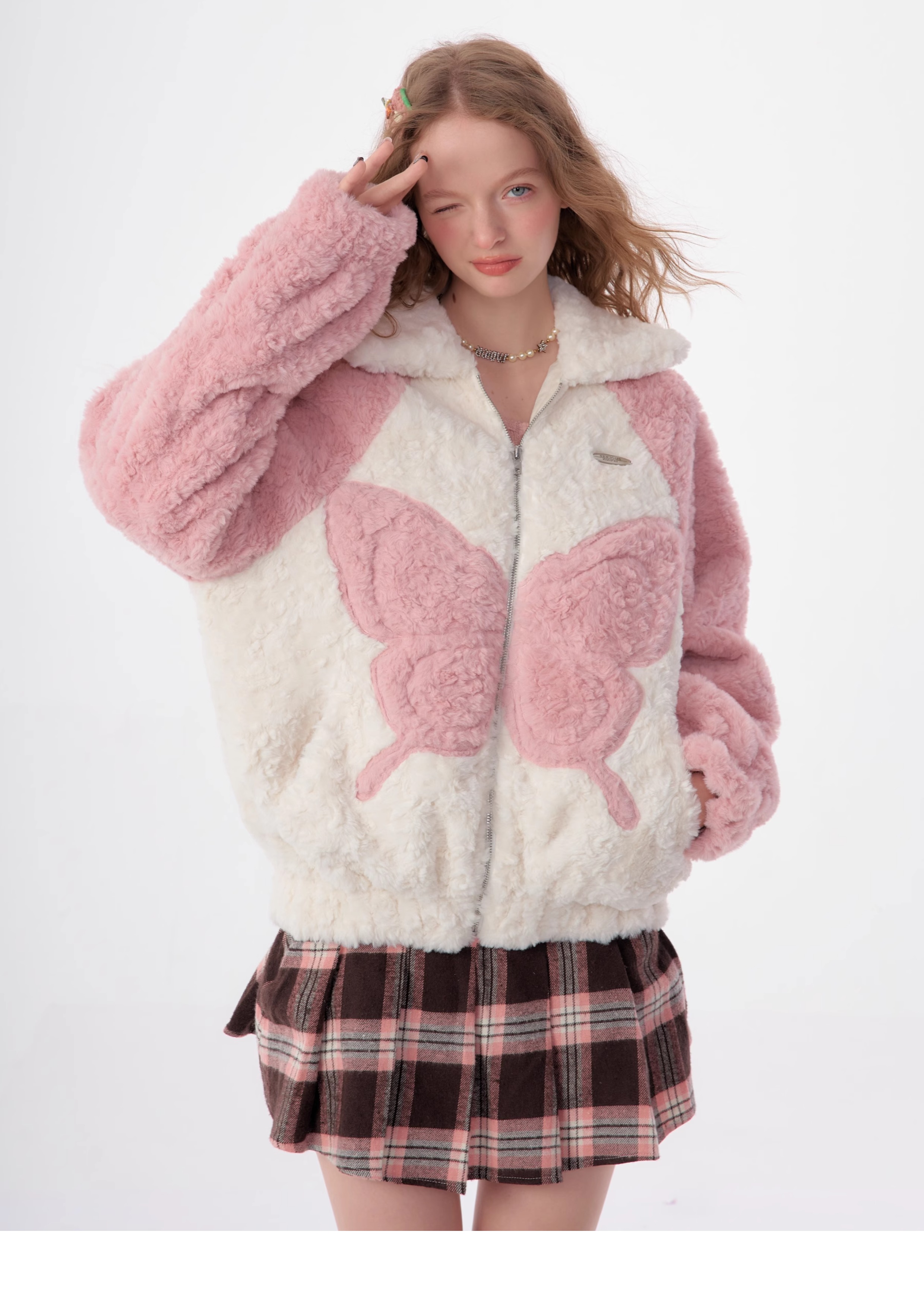 Contrast Color Butterfly Sherpa Jacket | Thick Velvet Pink-White Design for Autumn/Winter
