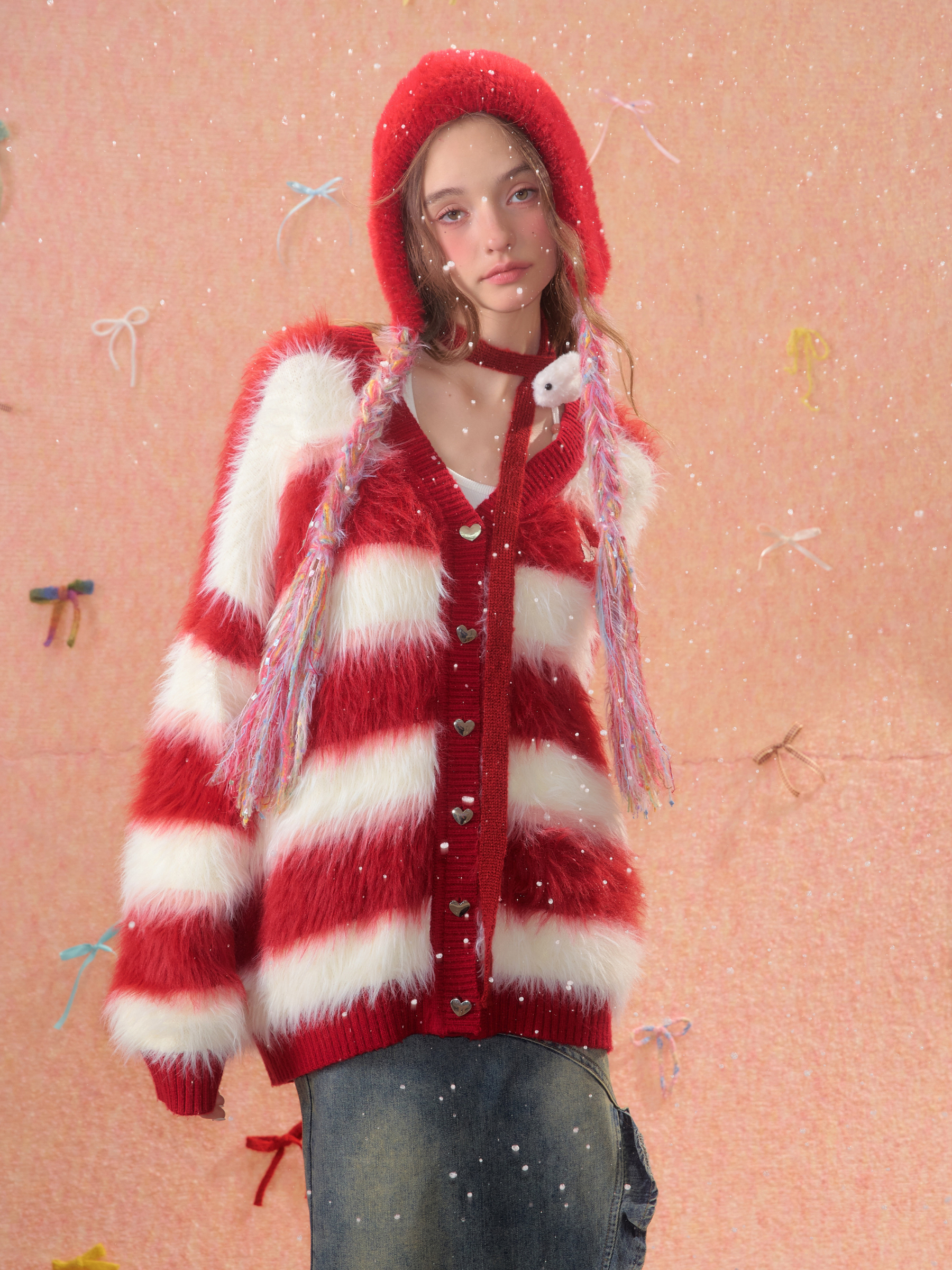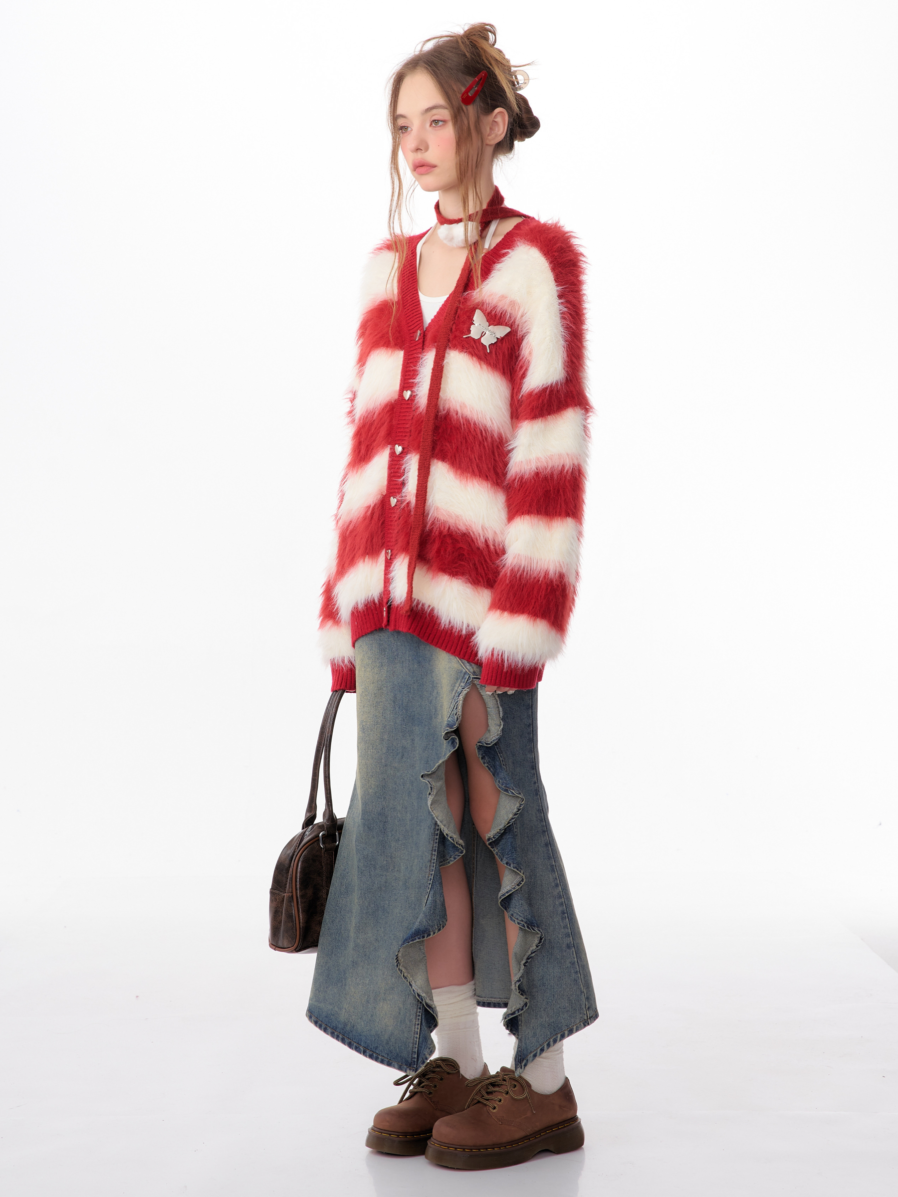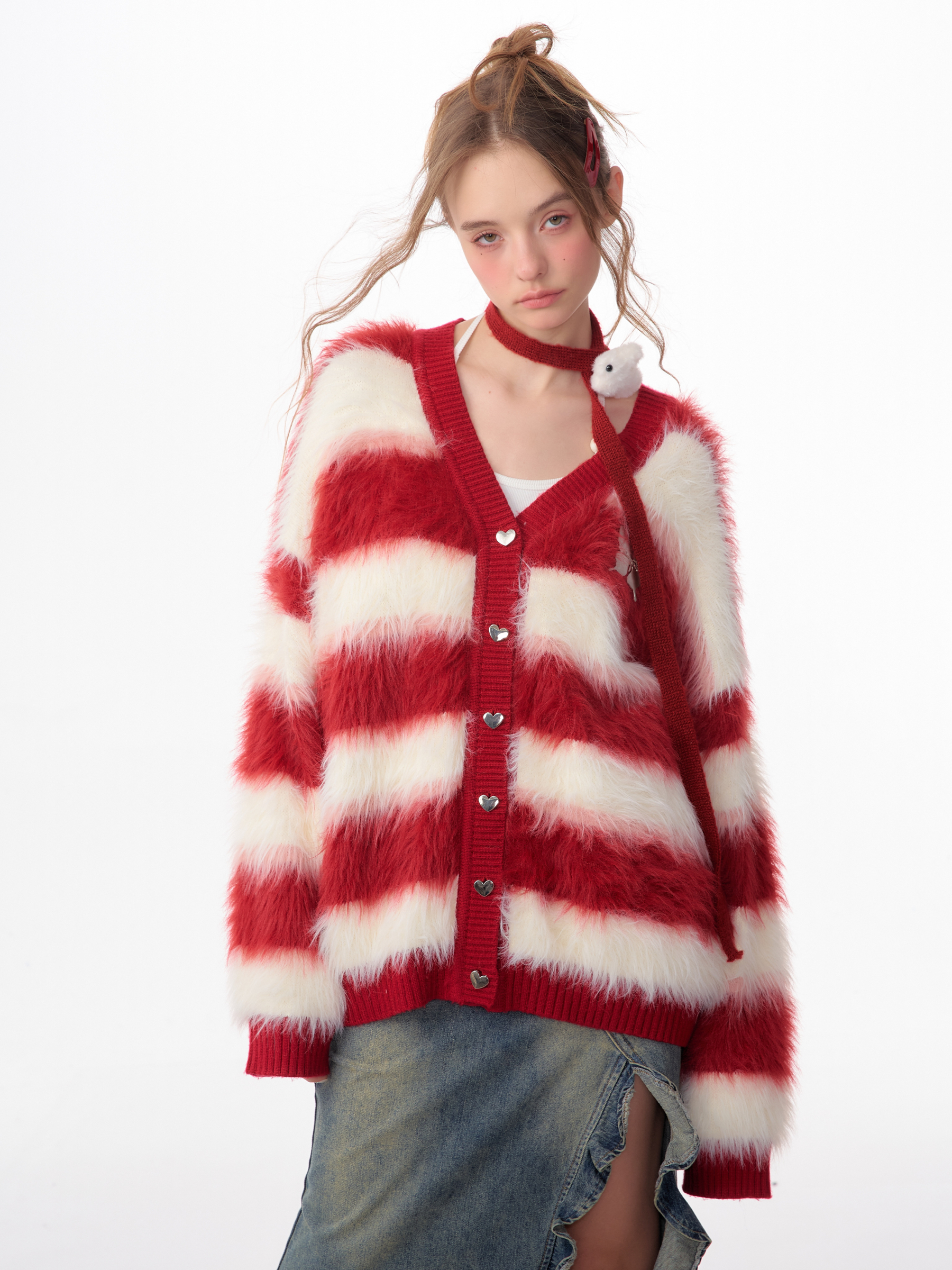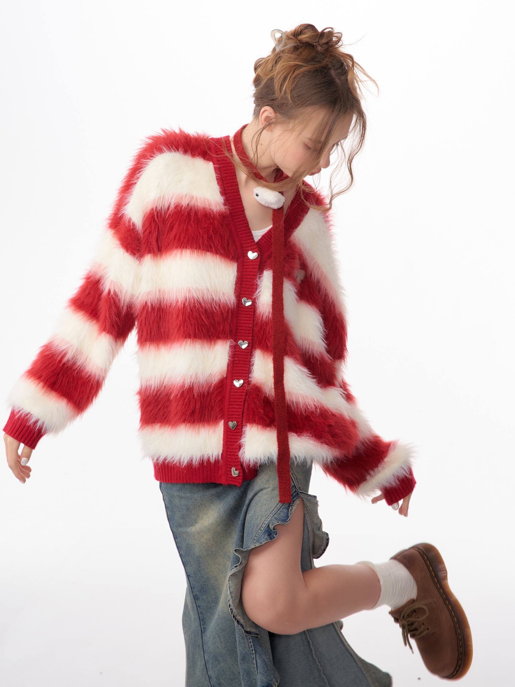 Red Christmas Stripe Knitted Sweater | Soft Thick New Year’s Open Cardigan for Autumn/Winter