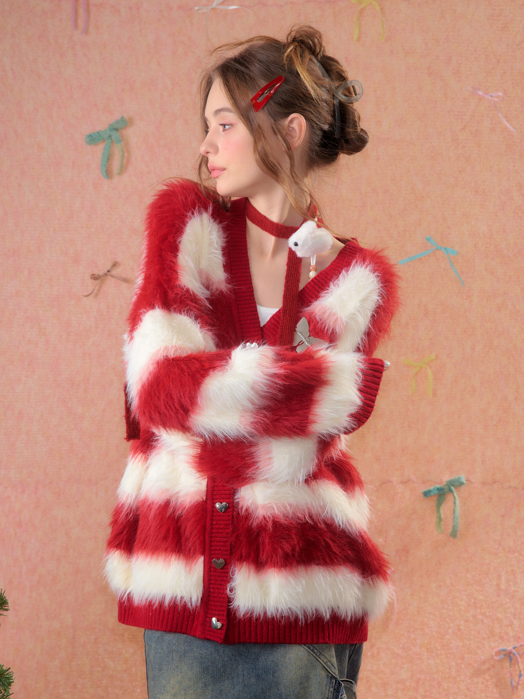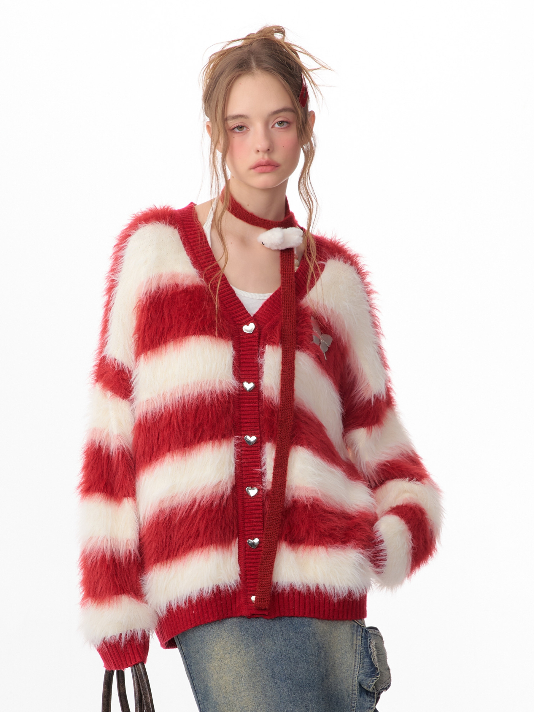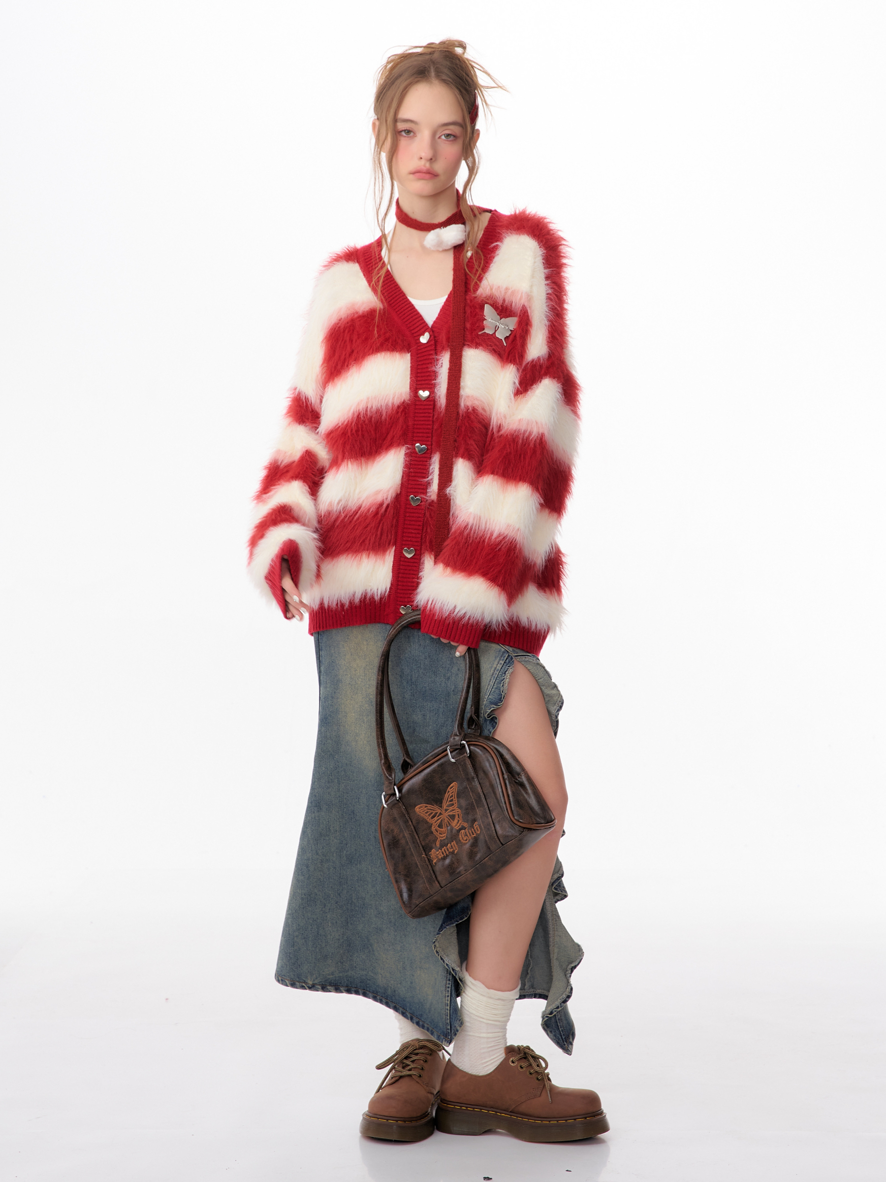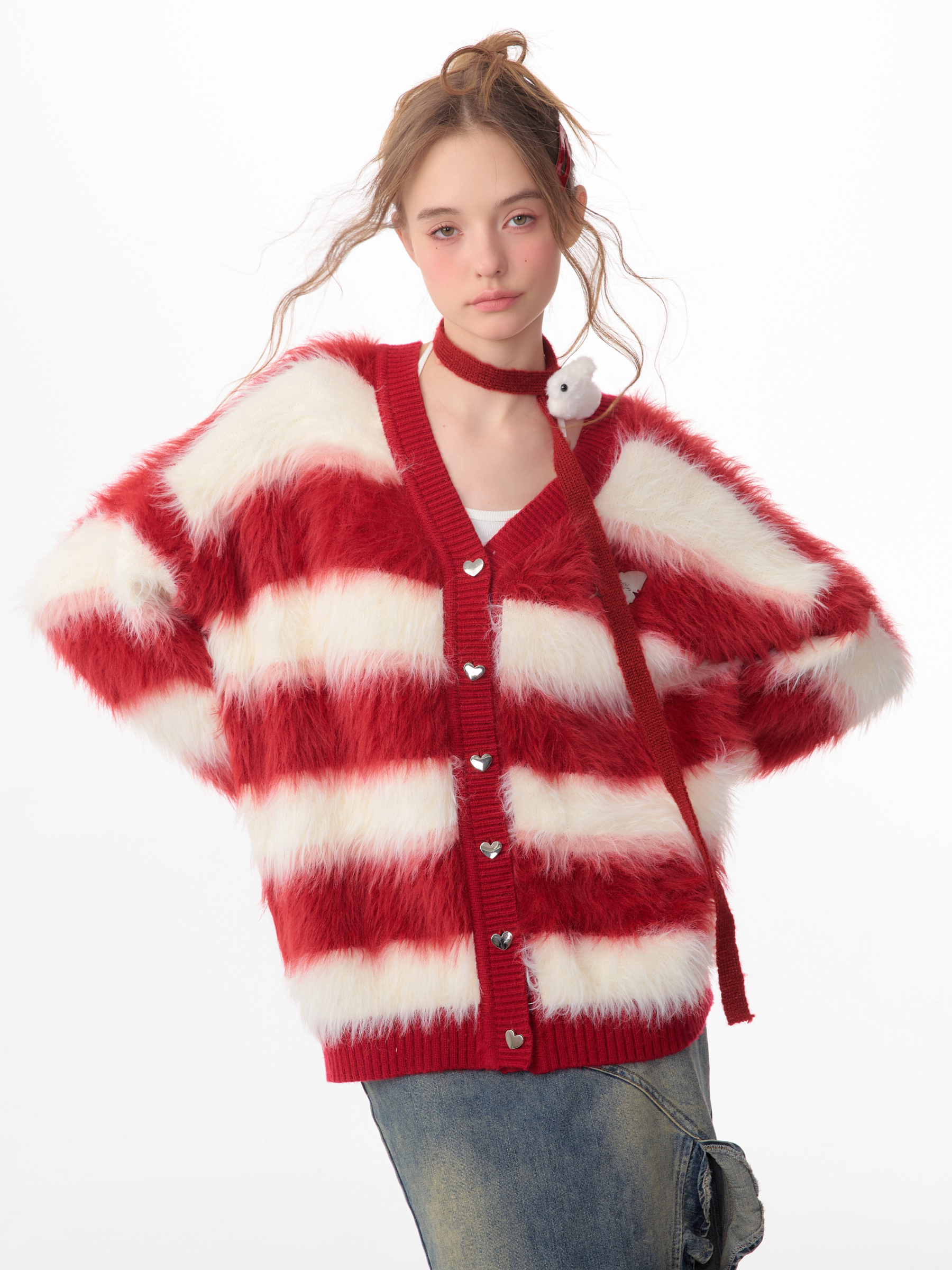 Red Christmas Stripe Knitted Sweater | Soft Thick New Year’s Open Cardigan for Autumn/Winter