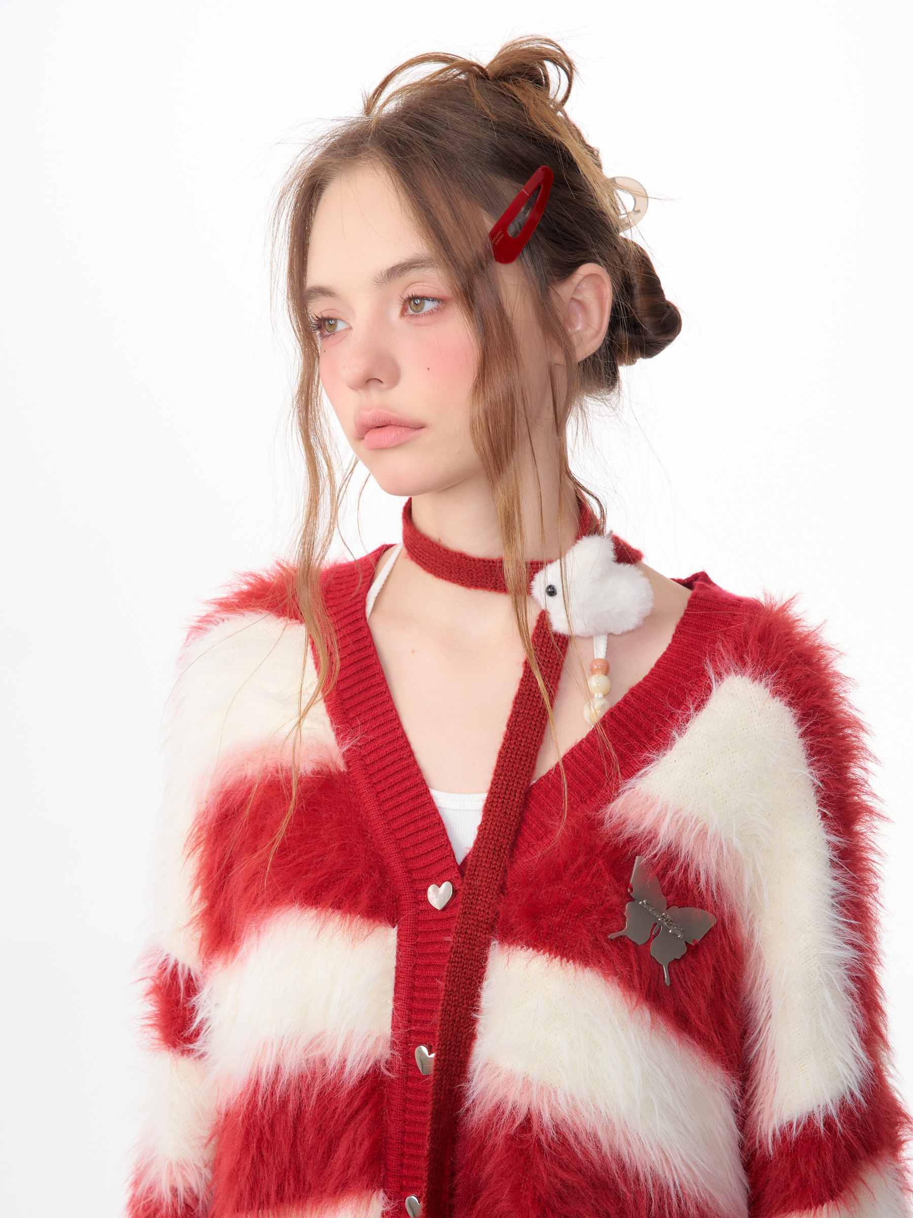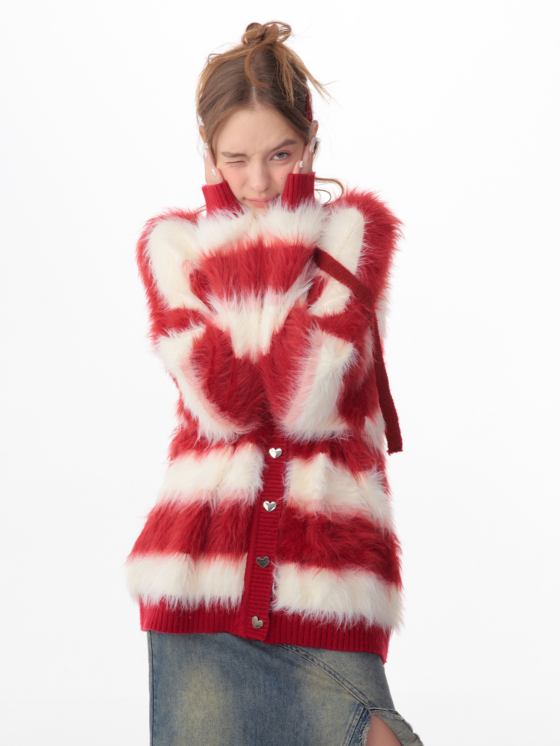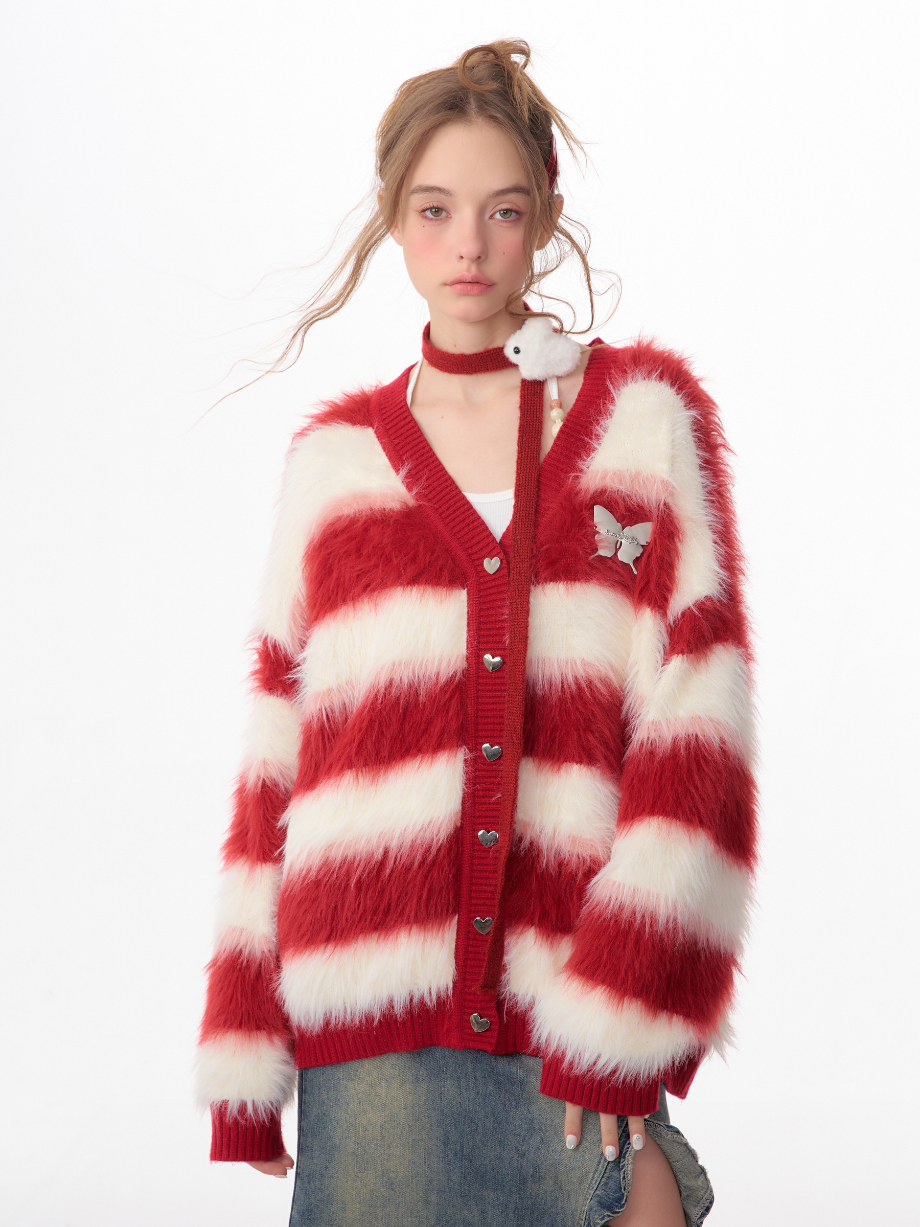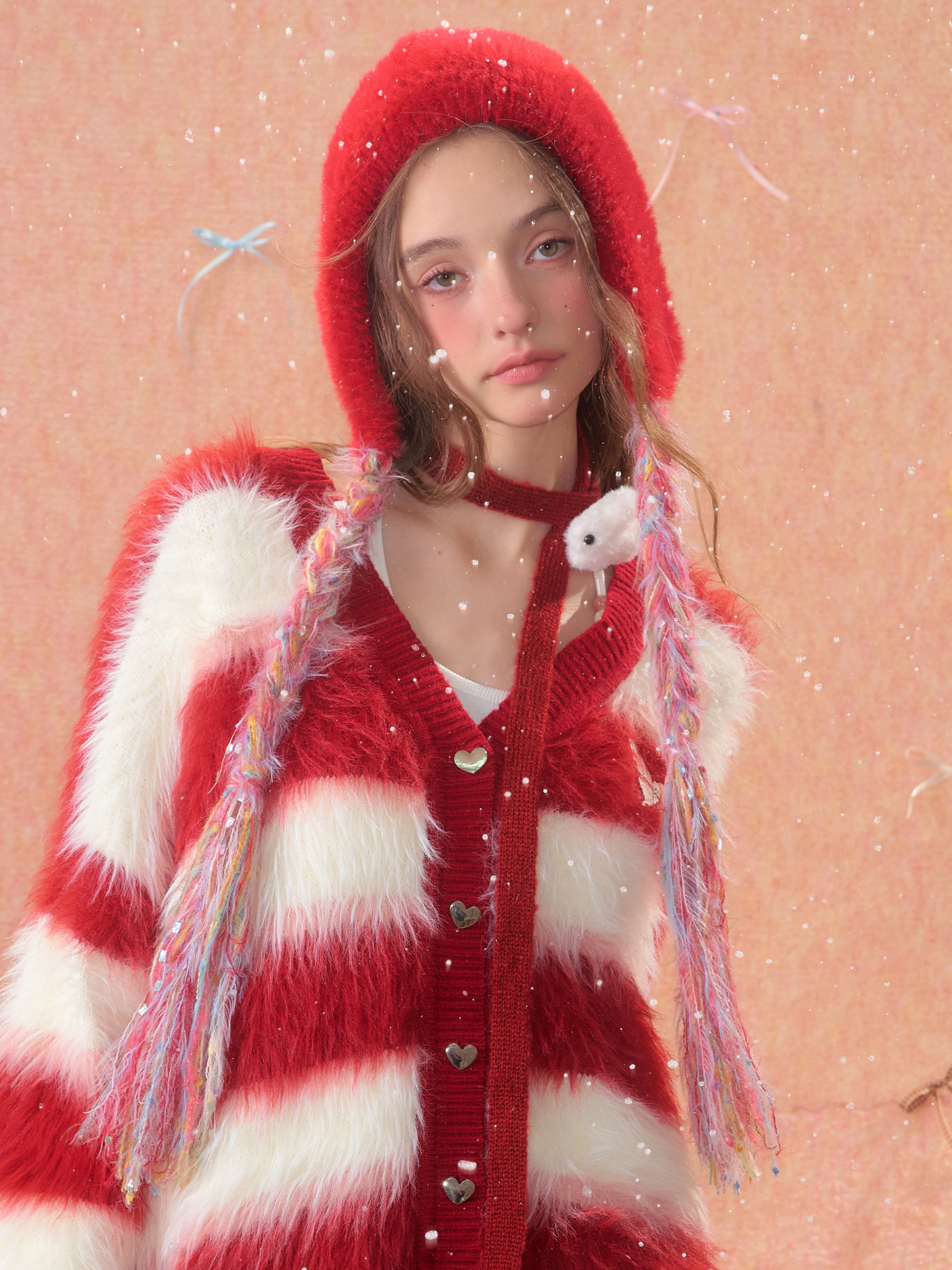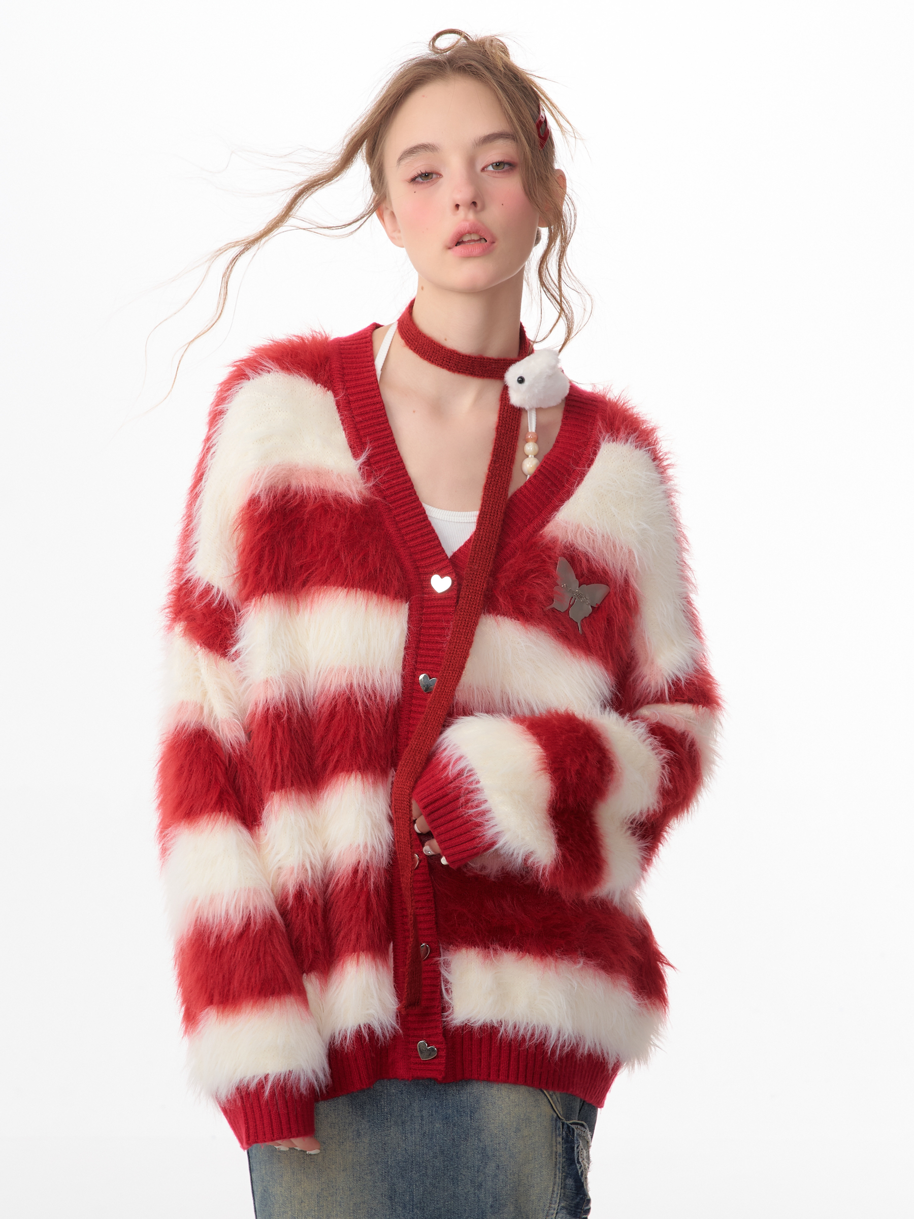 Red Christmas Stripe Knitted Sweater | Soft Thick New Year’s Open Cardigan for Autumn/Winter