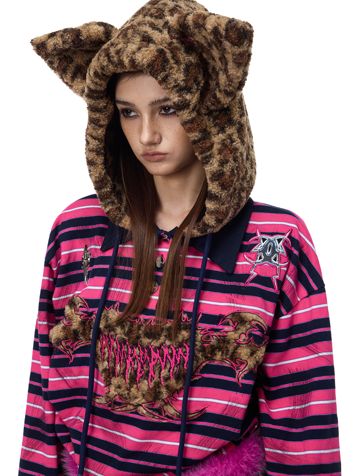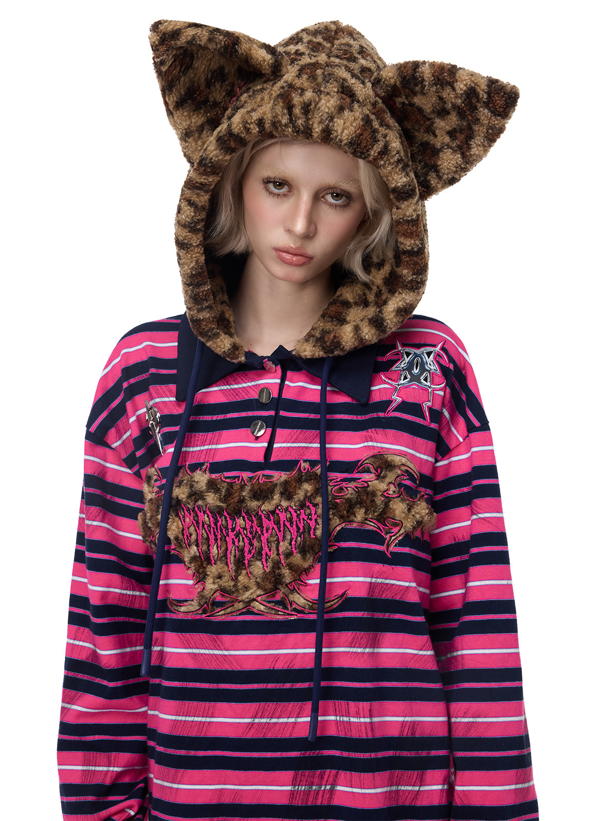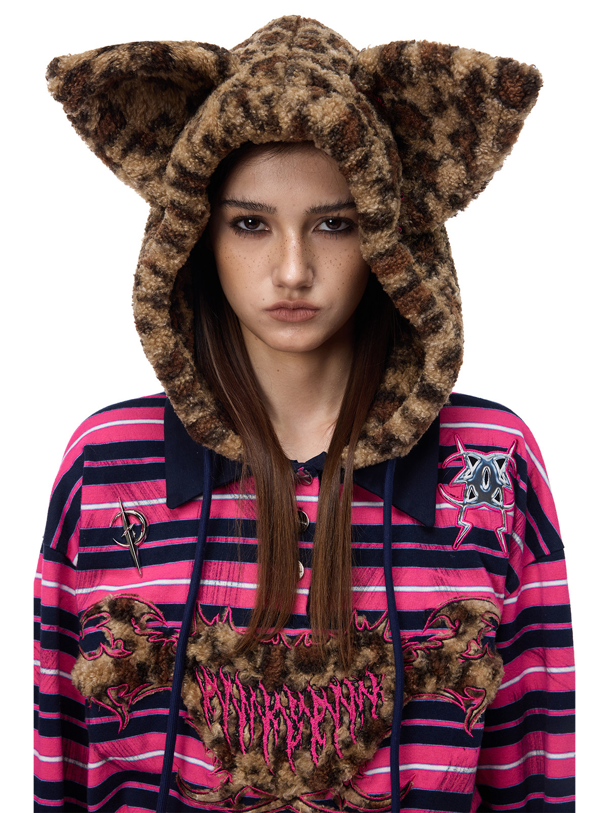 Black Metal Cat Ear Hooded Y2K Sweatshirt – Leopard Stripe