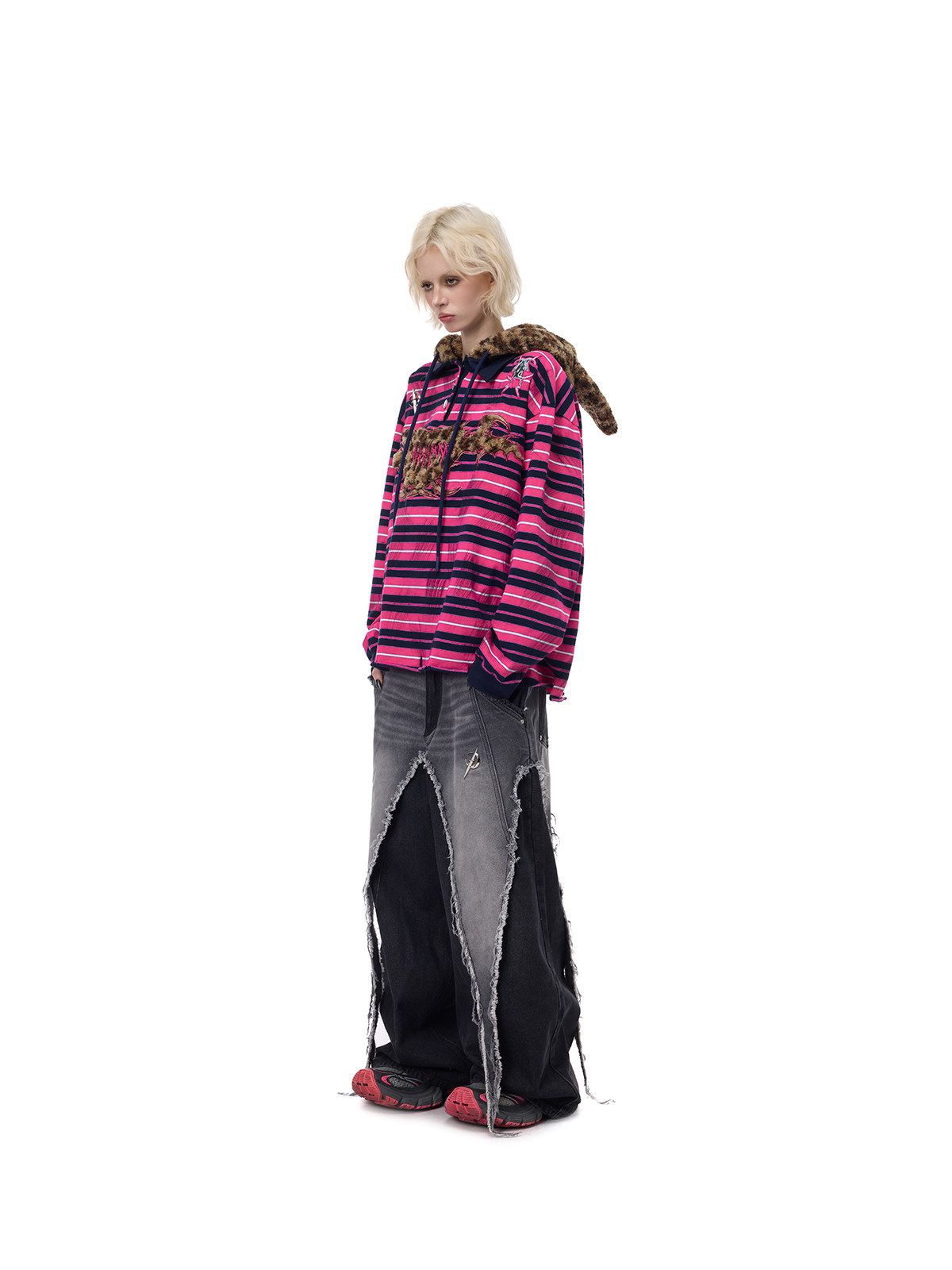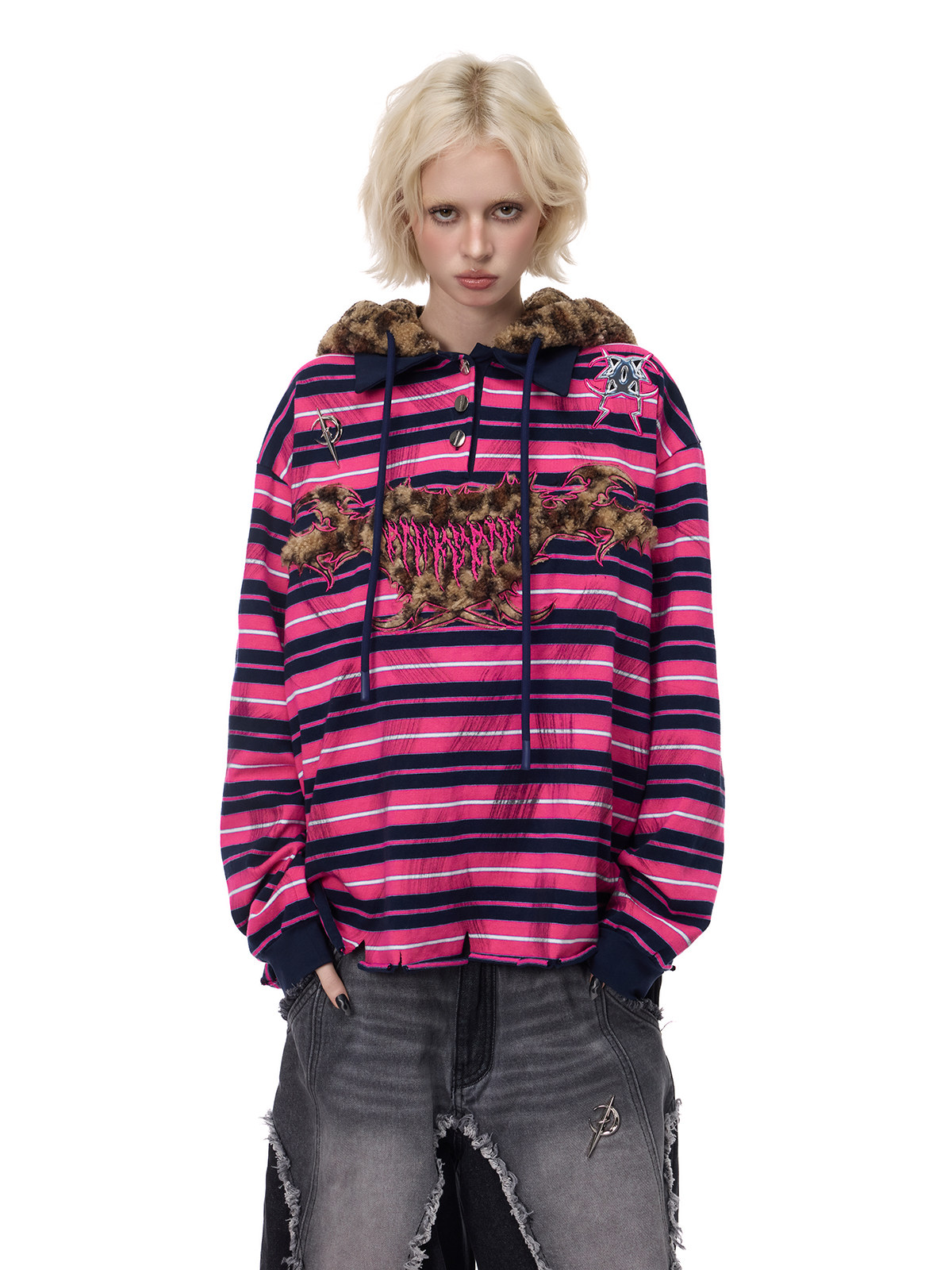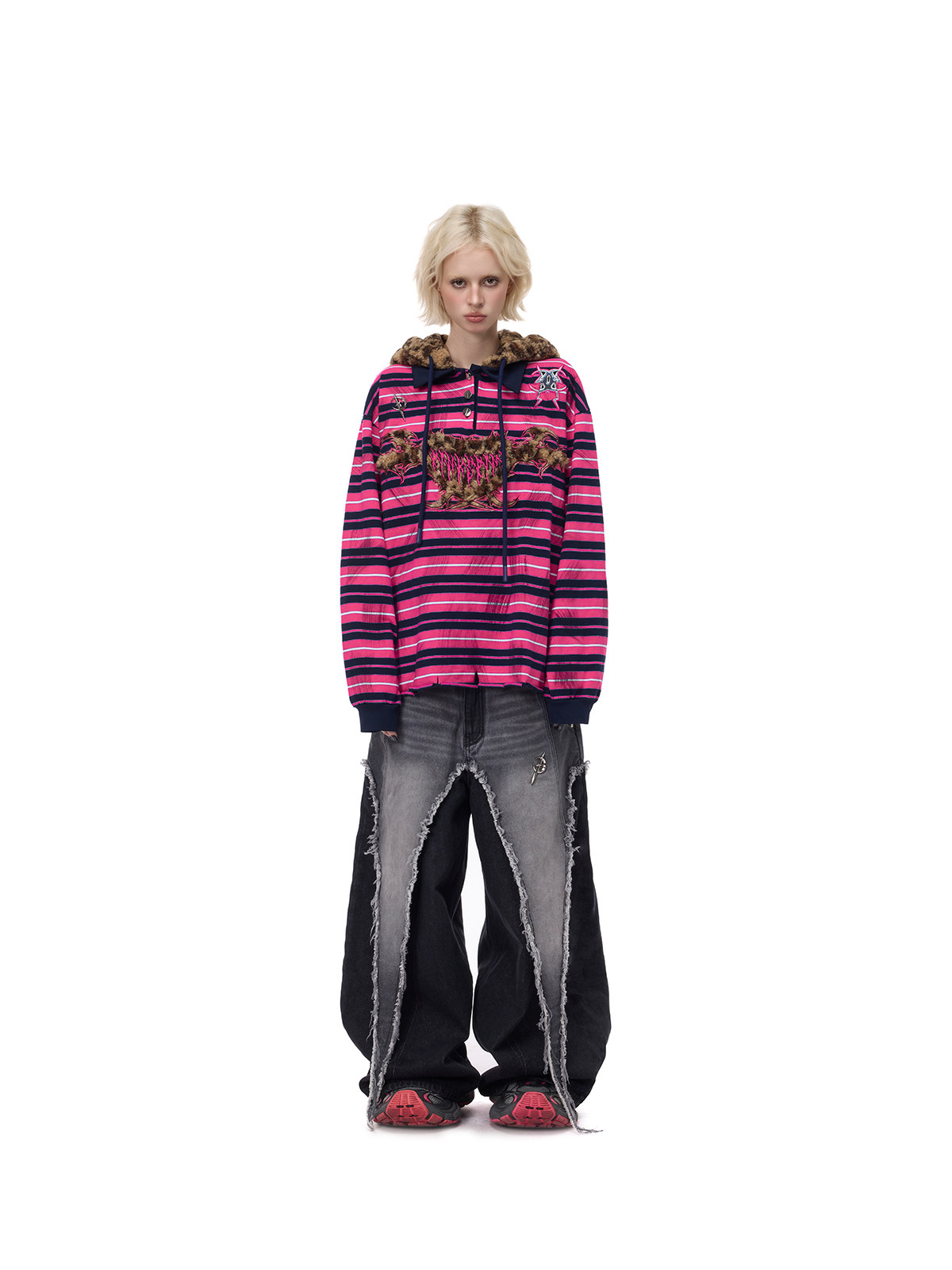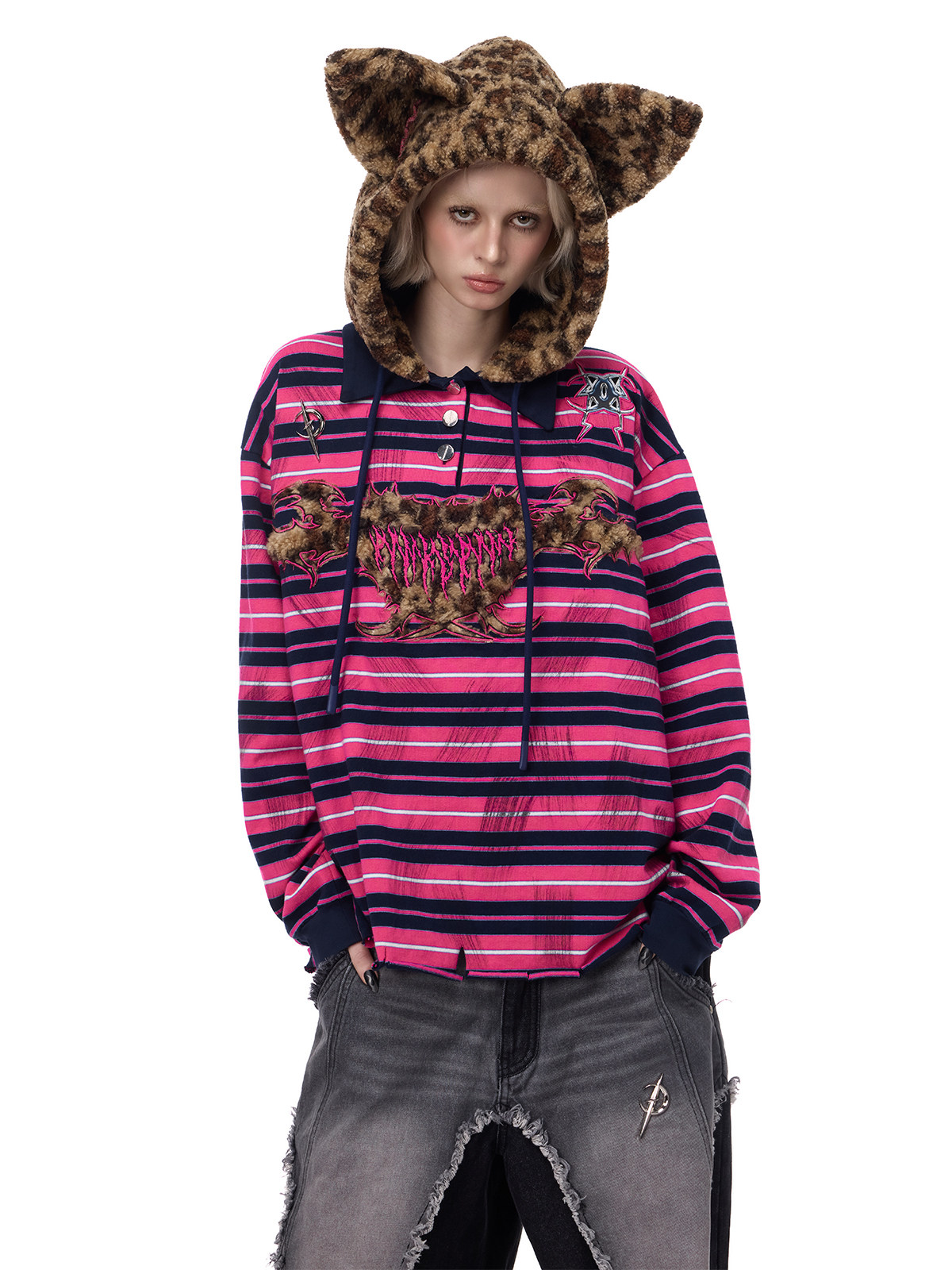 Black Metal Cat Ear Hooded Y2K Sweatshirt – Leopard Stripe