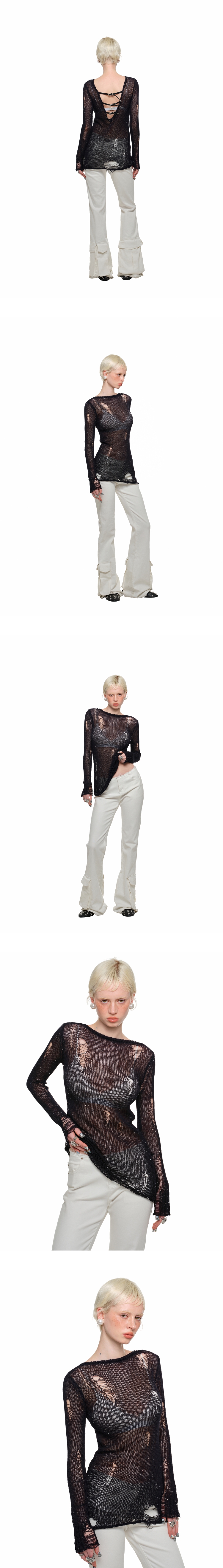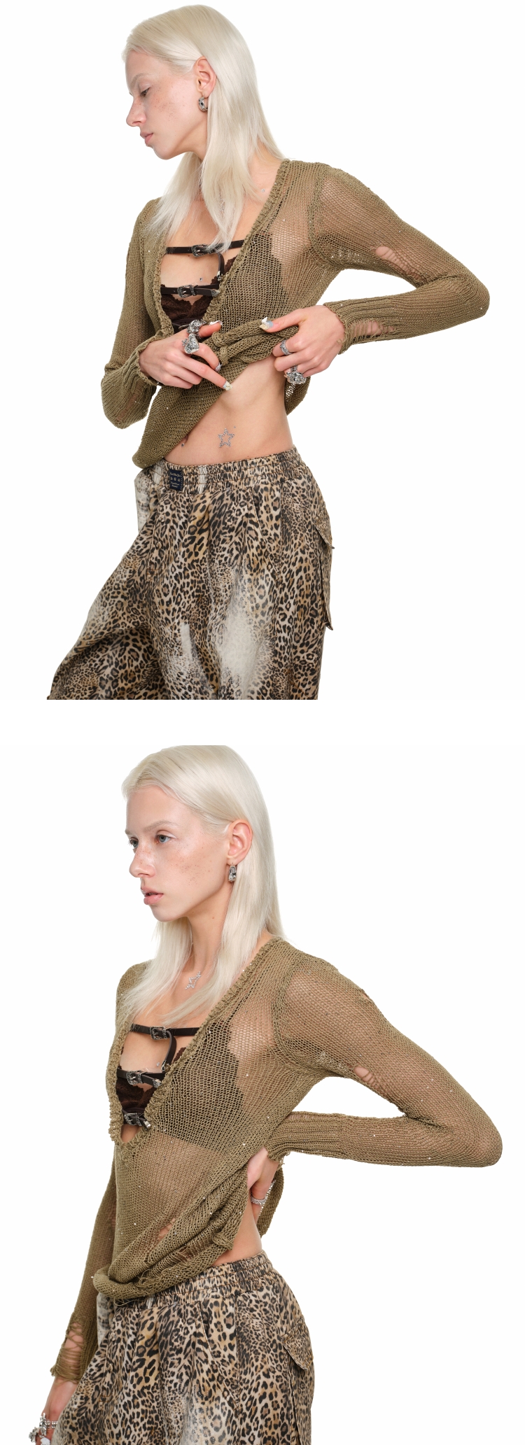 Beaded Cut-Out Knit Blouse – V-Neck Slim Semi-Sheer Knit