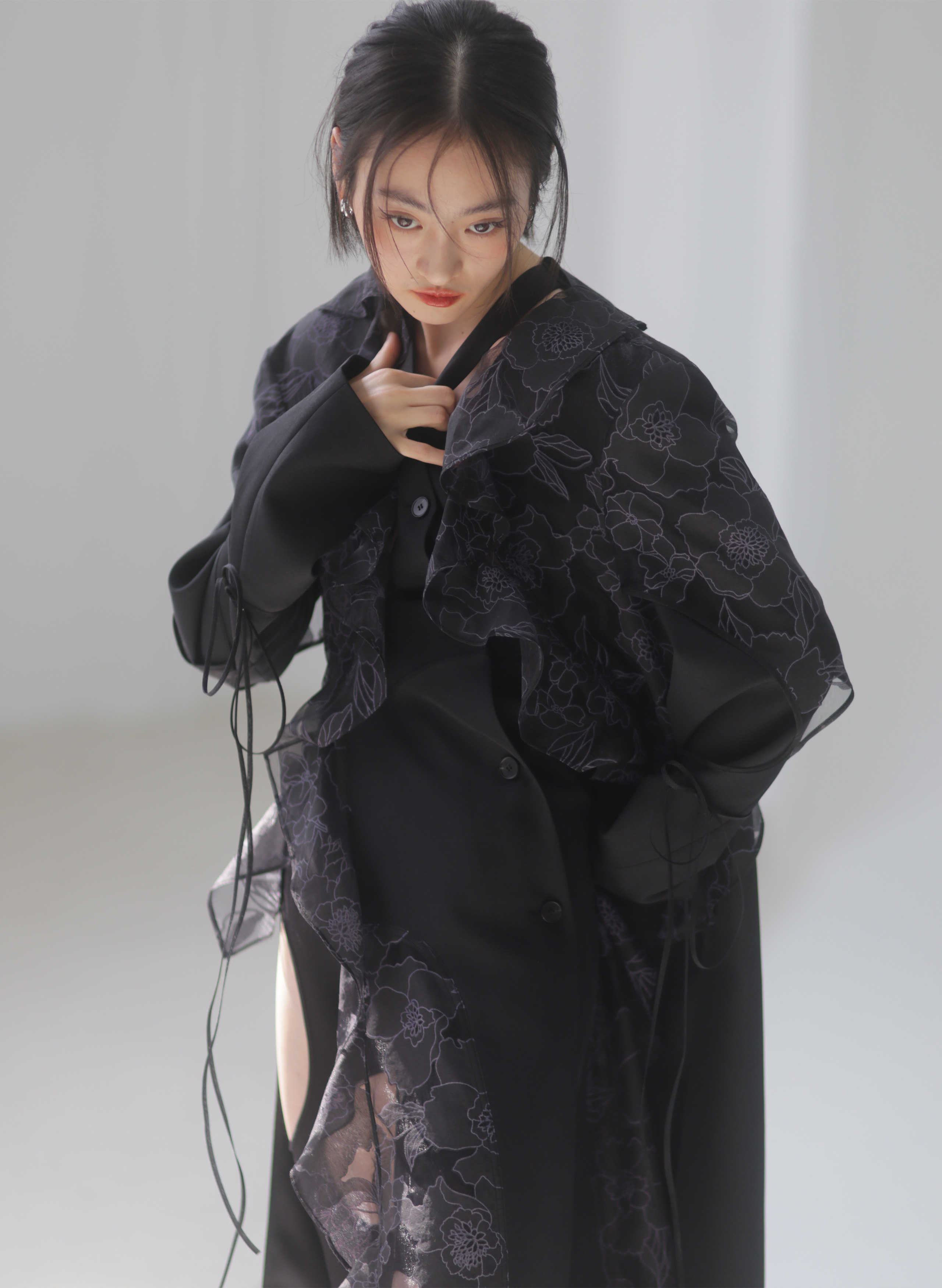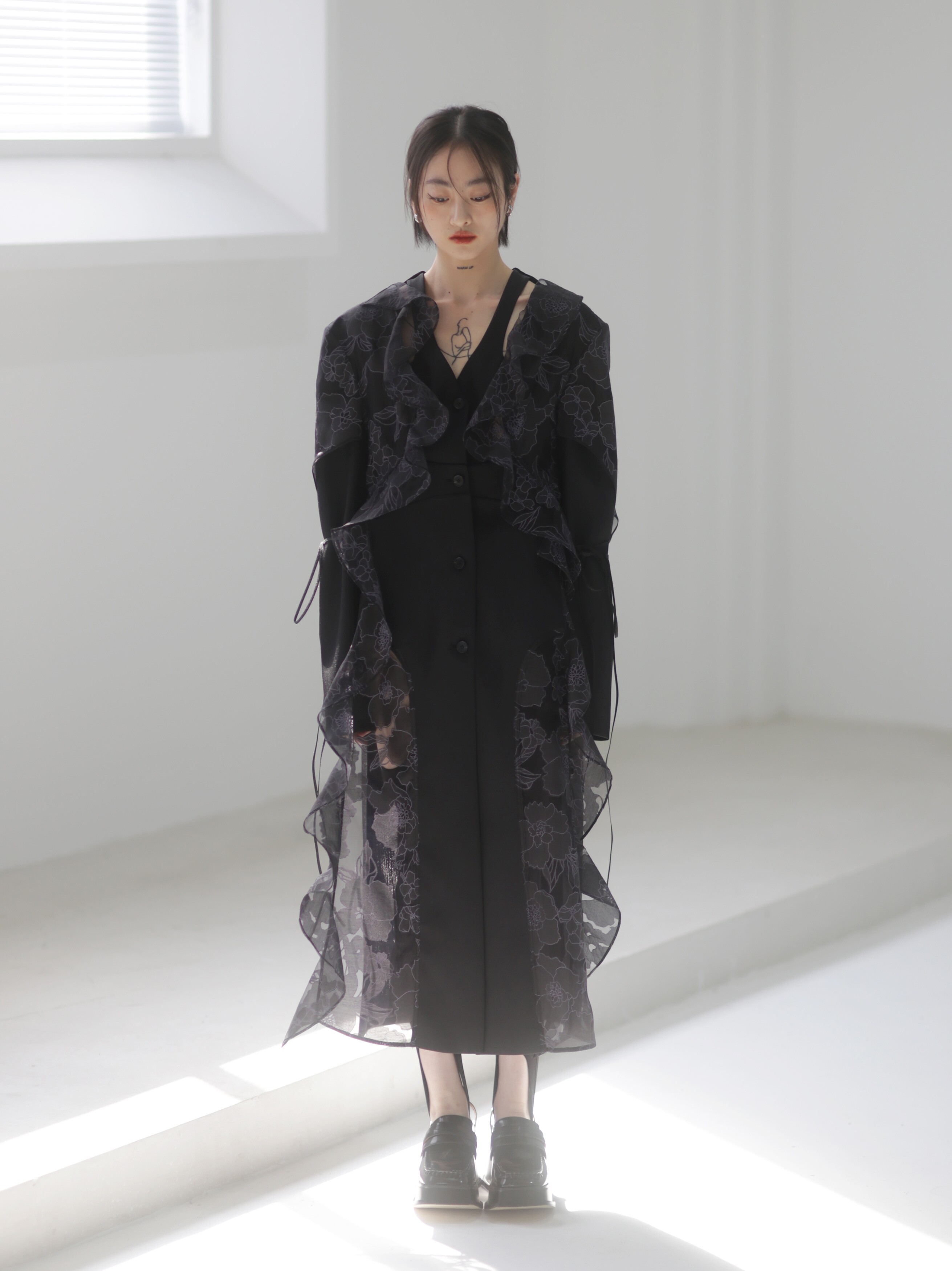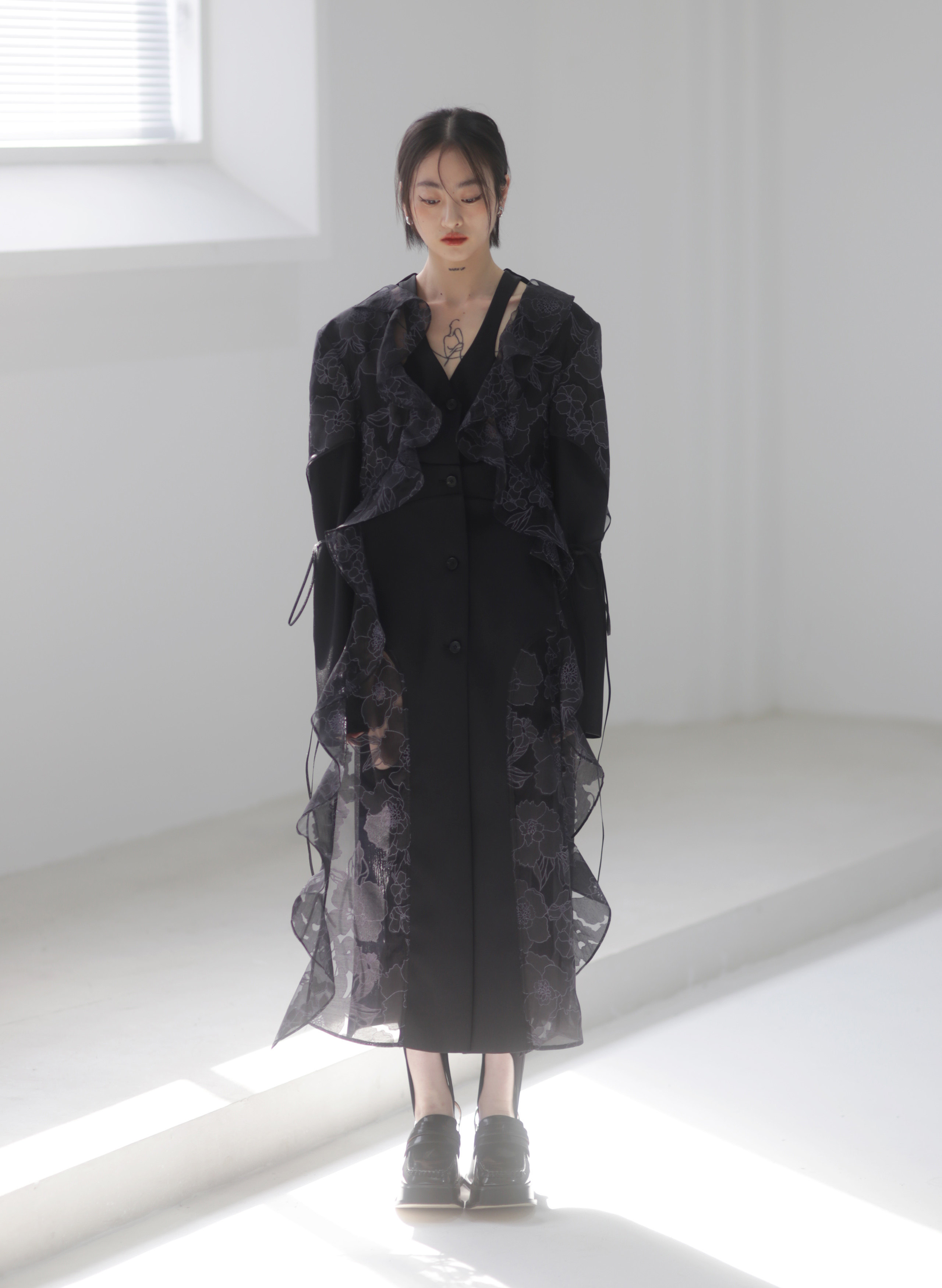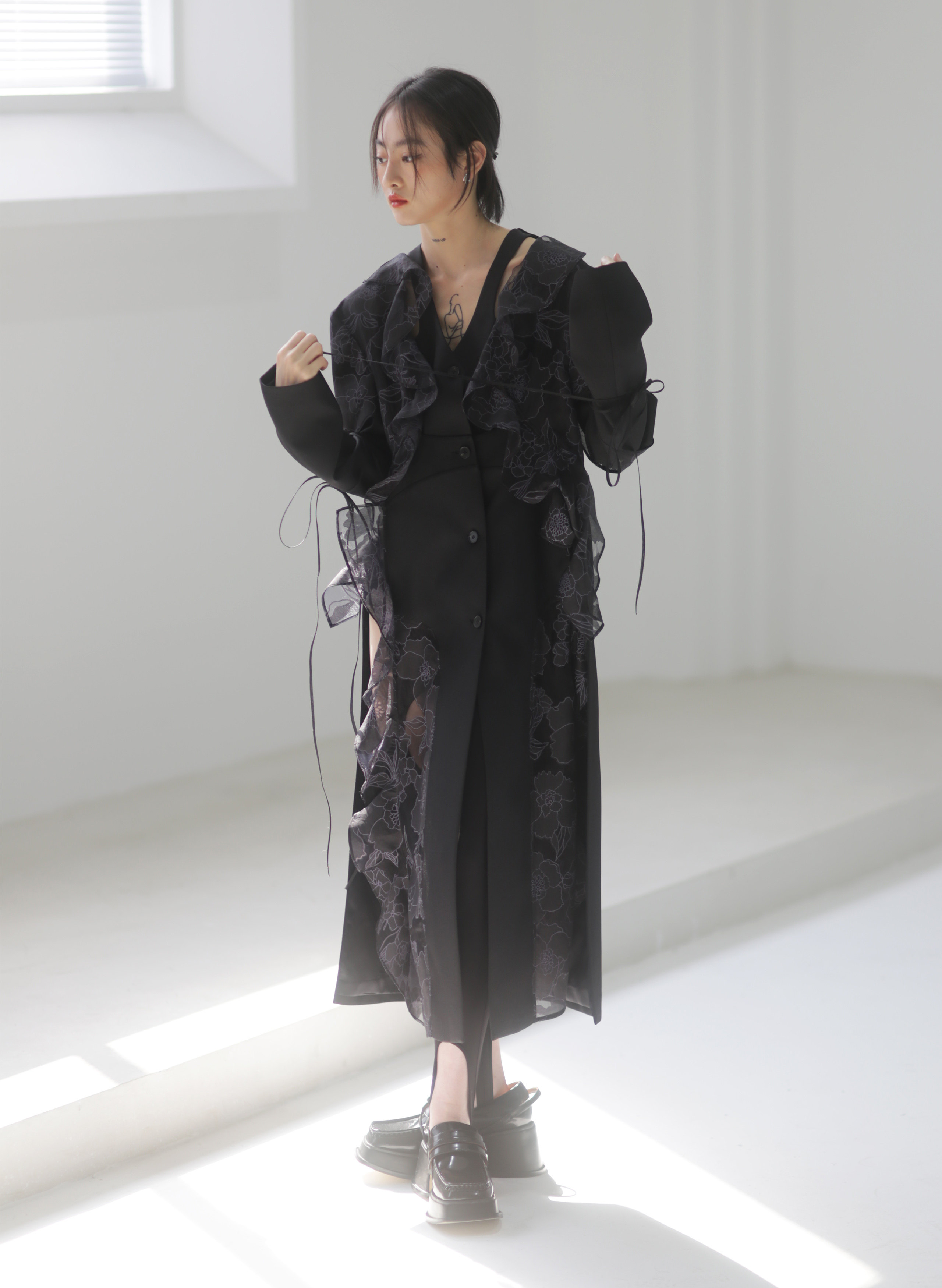 오간자 러플 엣지 패치워크 롱 트렌치코트