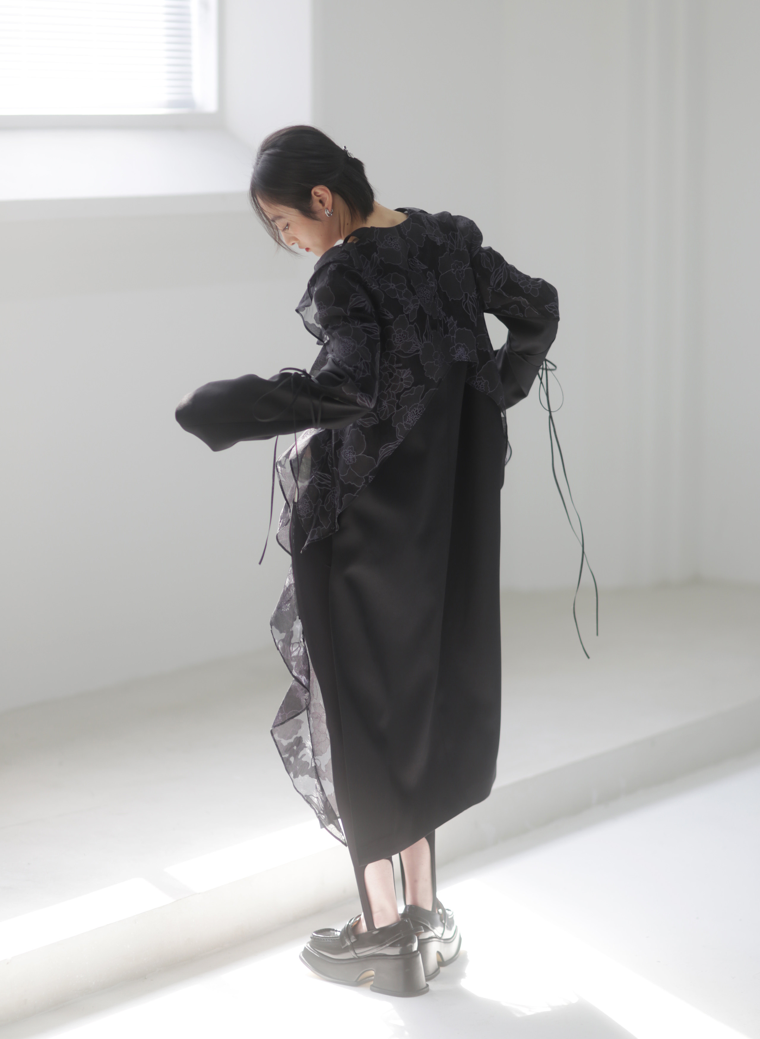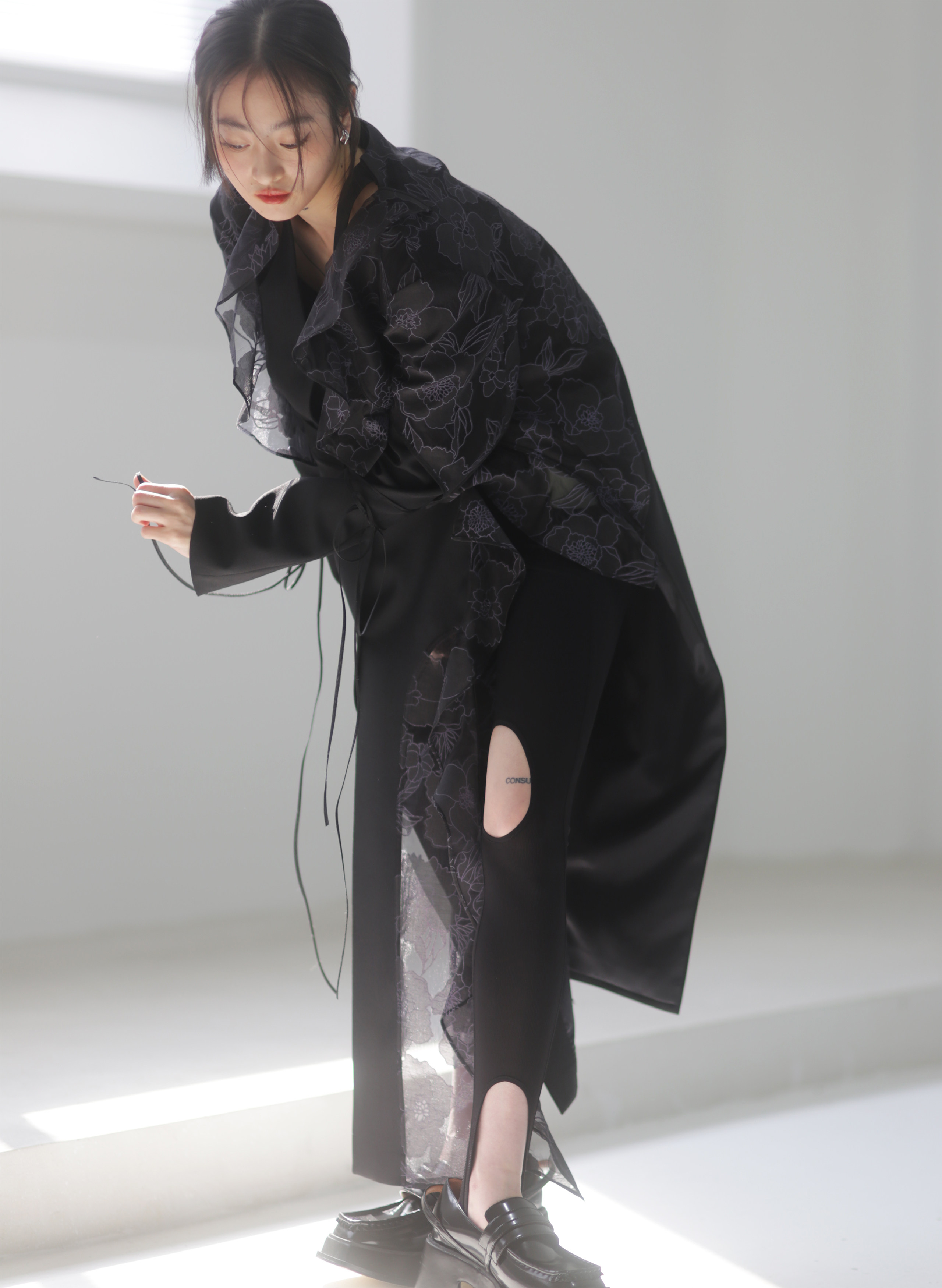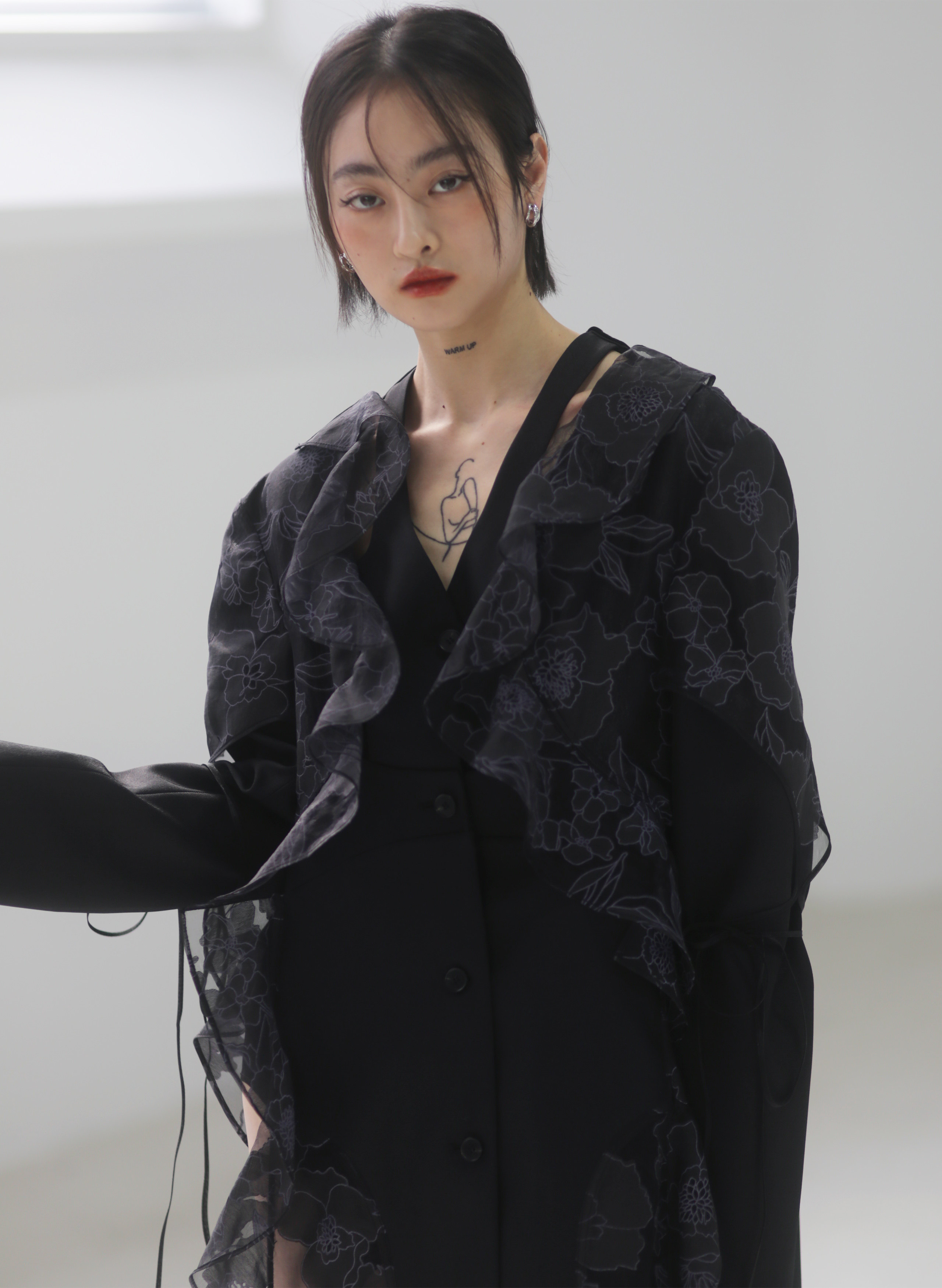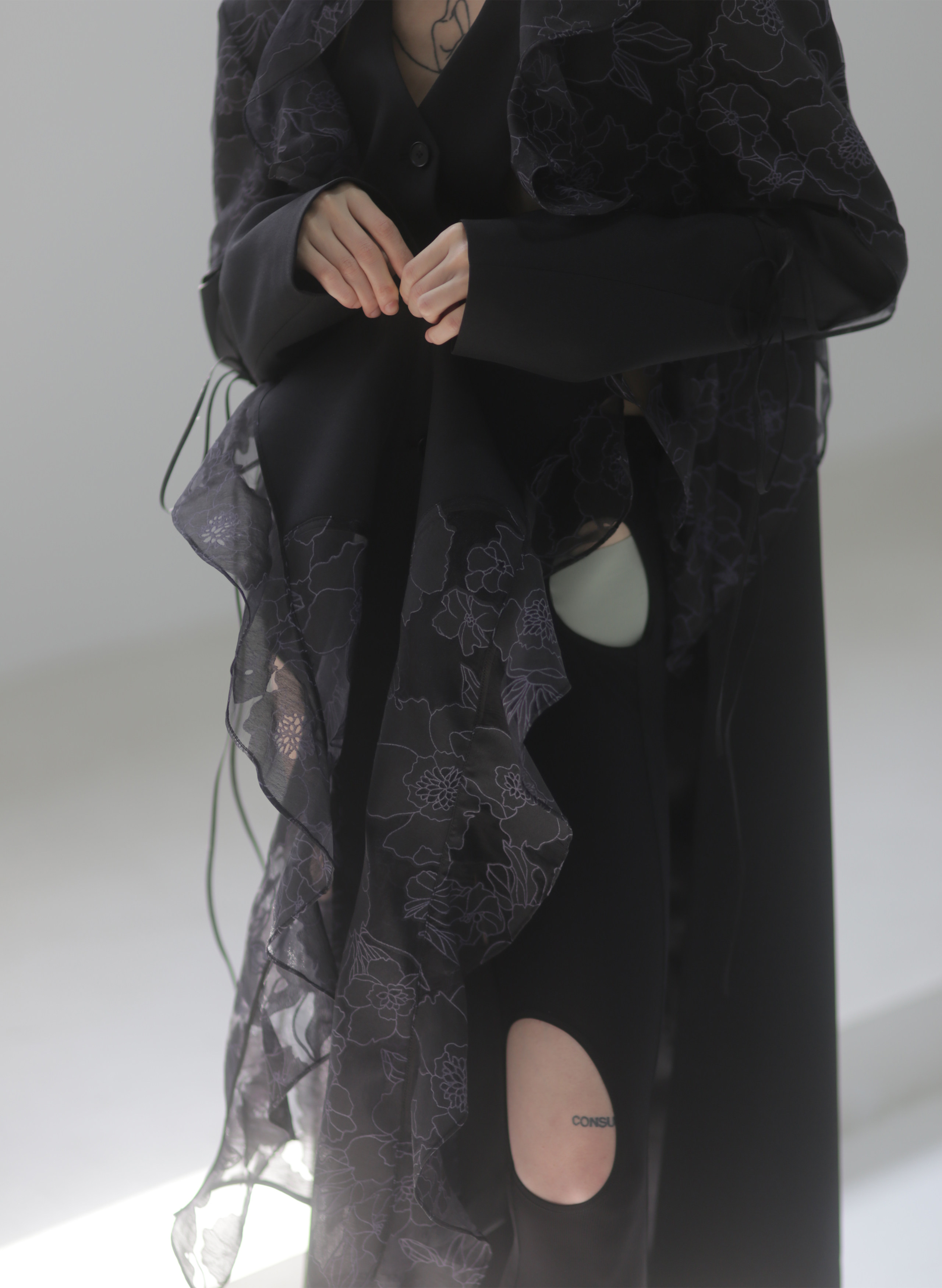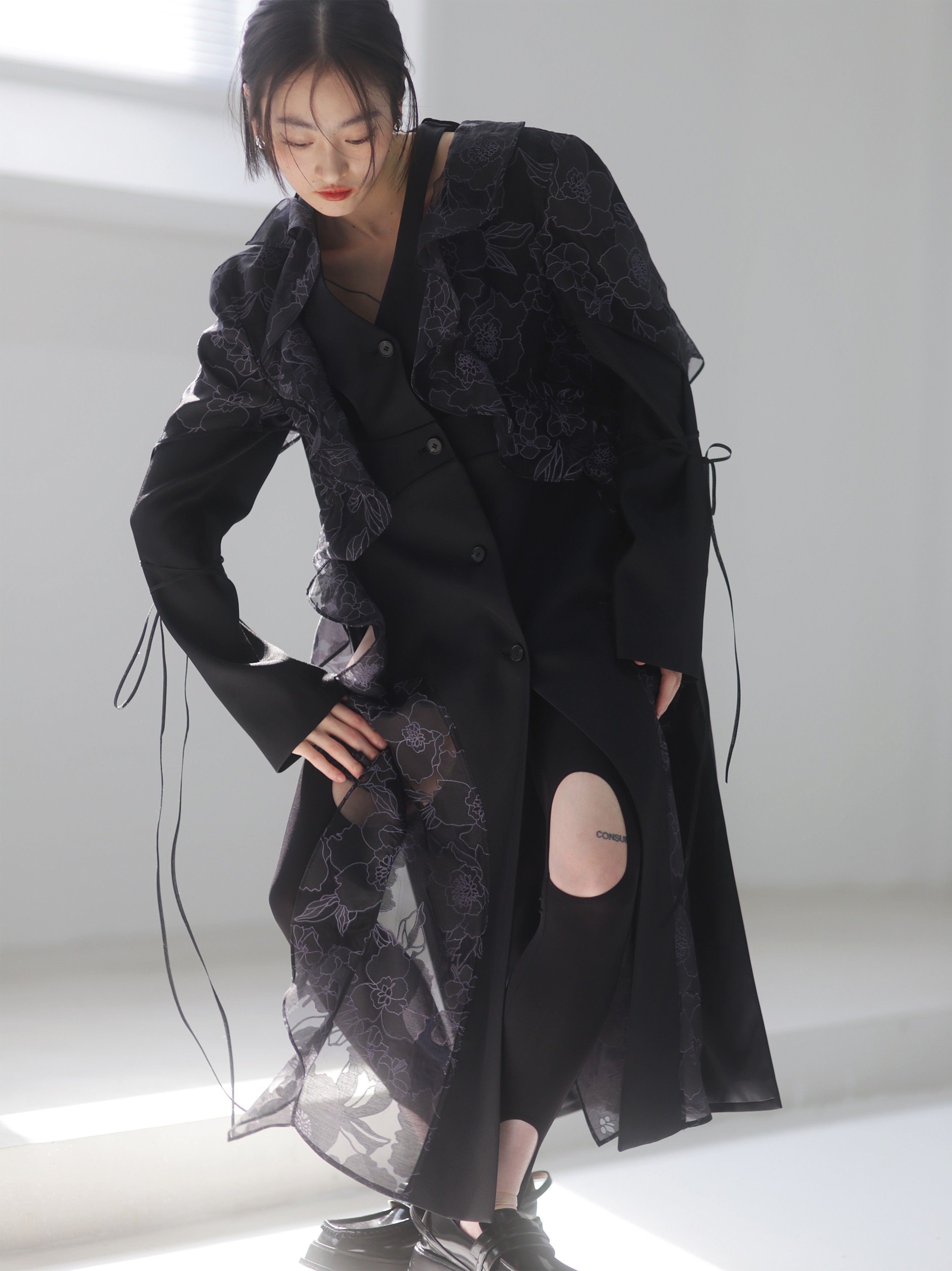 오간자 러플 엣지 패치워크 롱 트렌치코트