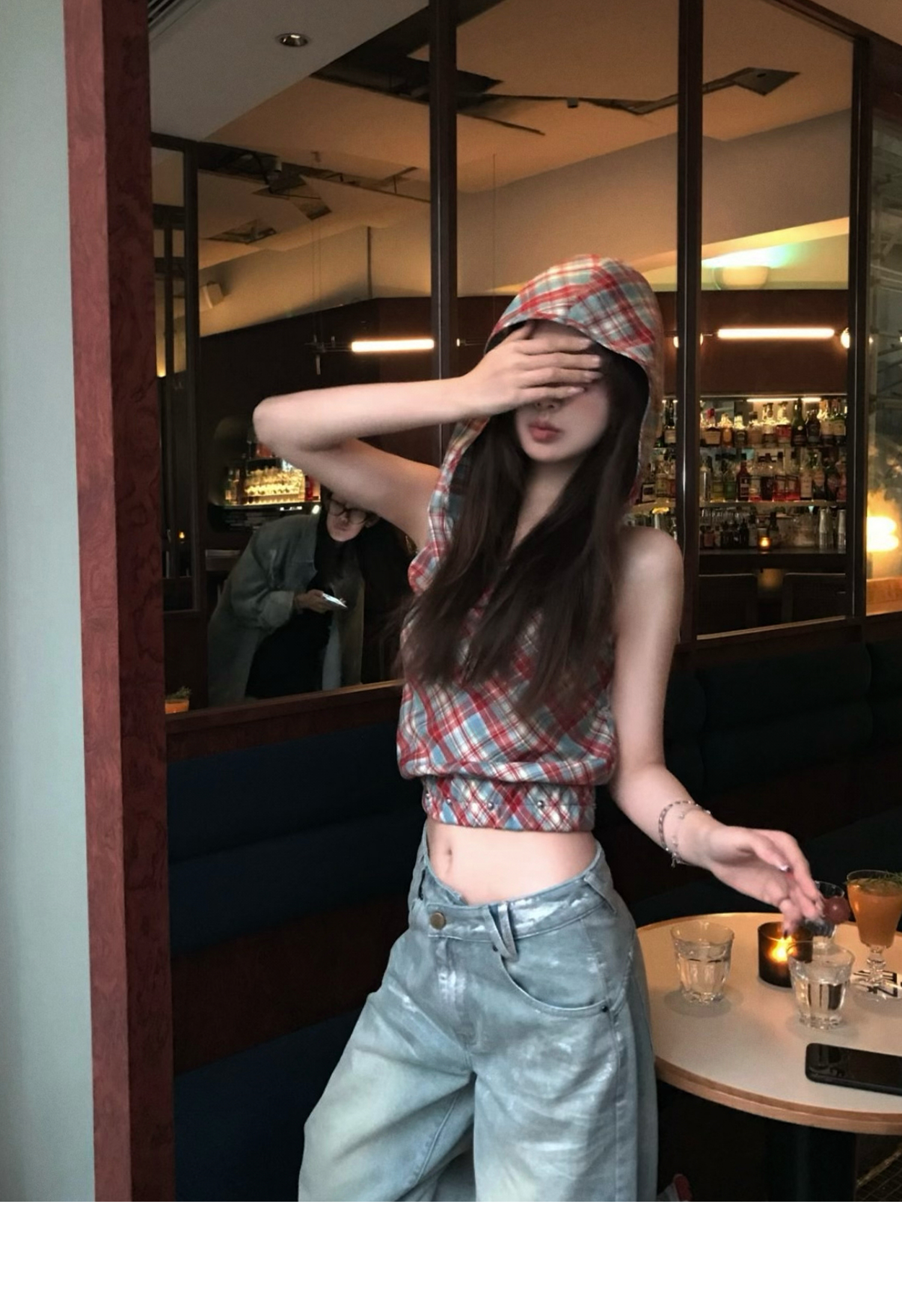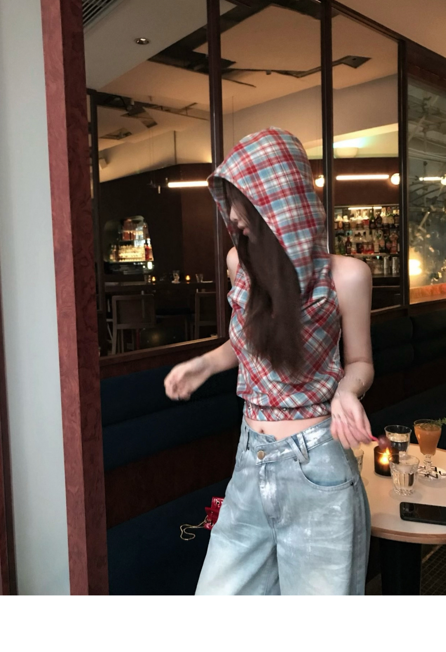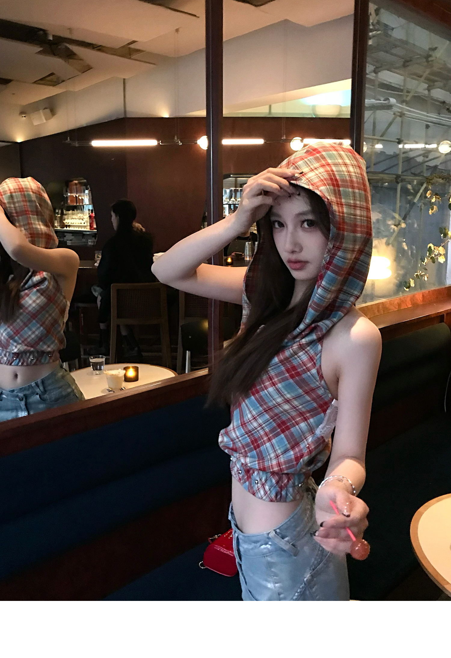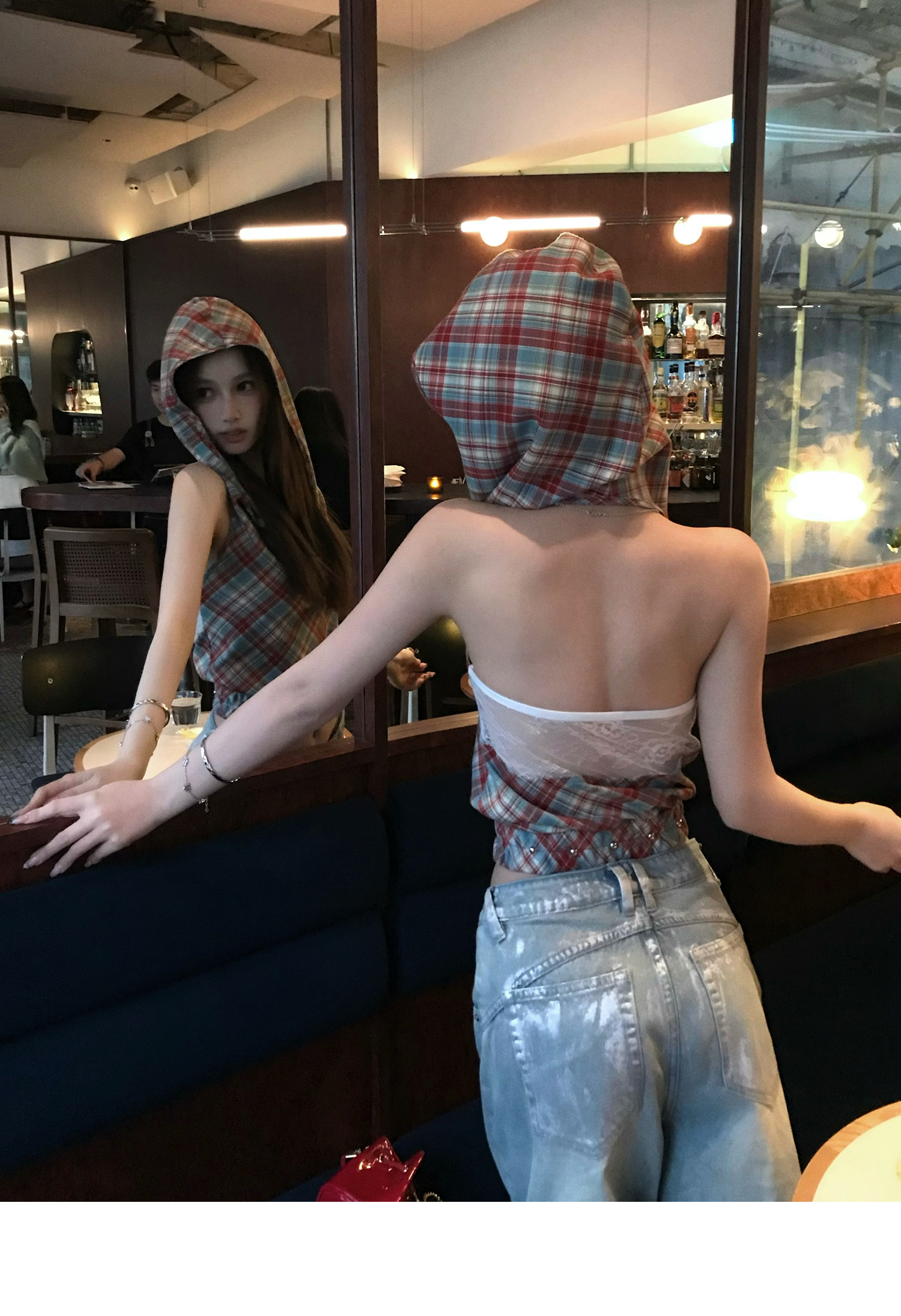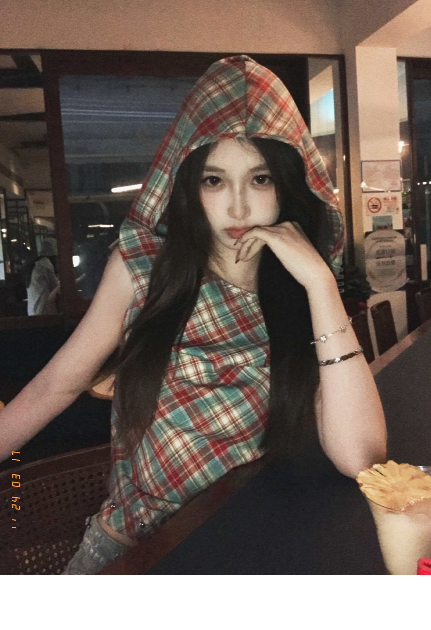 【Lost in Tokyo】 Red Checkered Sleeveless Hoodie Tank Top
