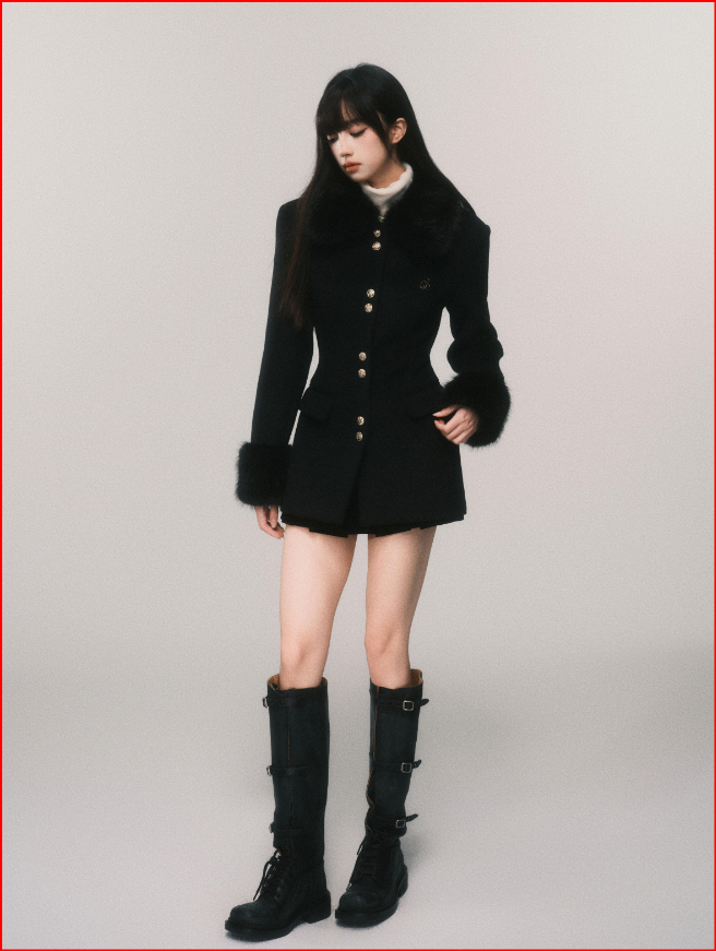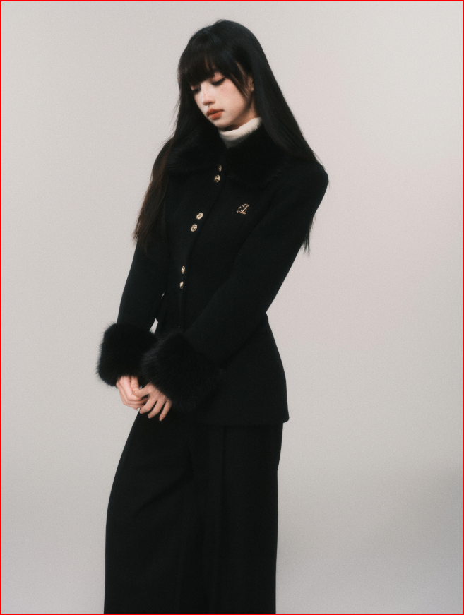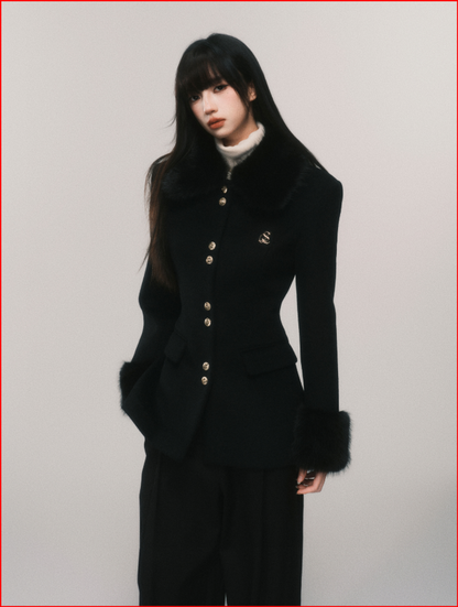 Black Retro Waist Slim Wool Jacket with Gold Buckle Fur Collar
