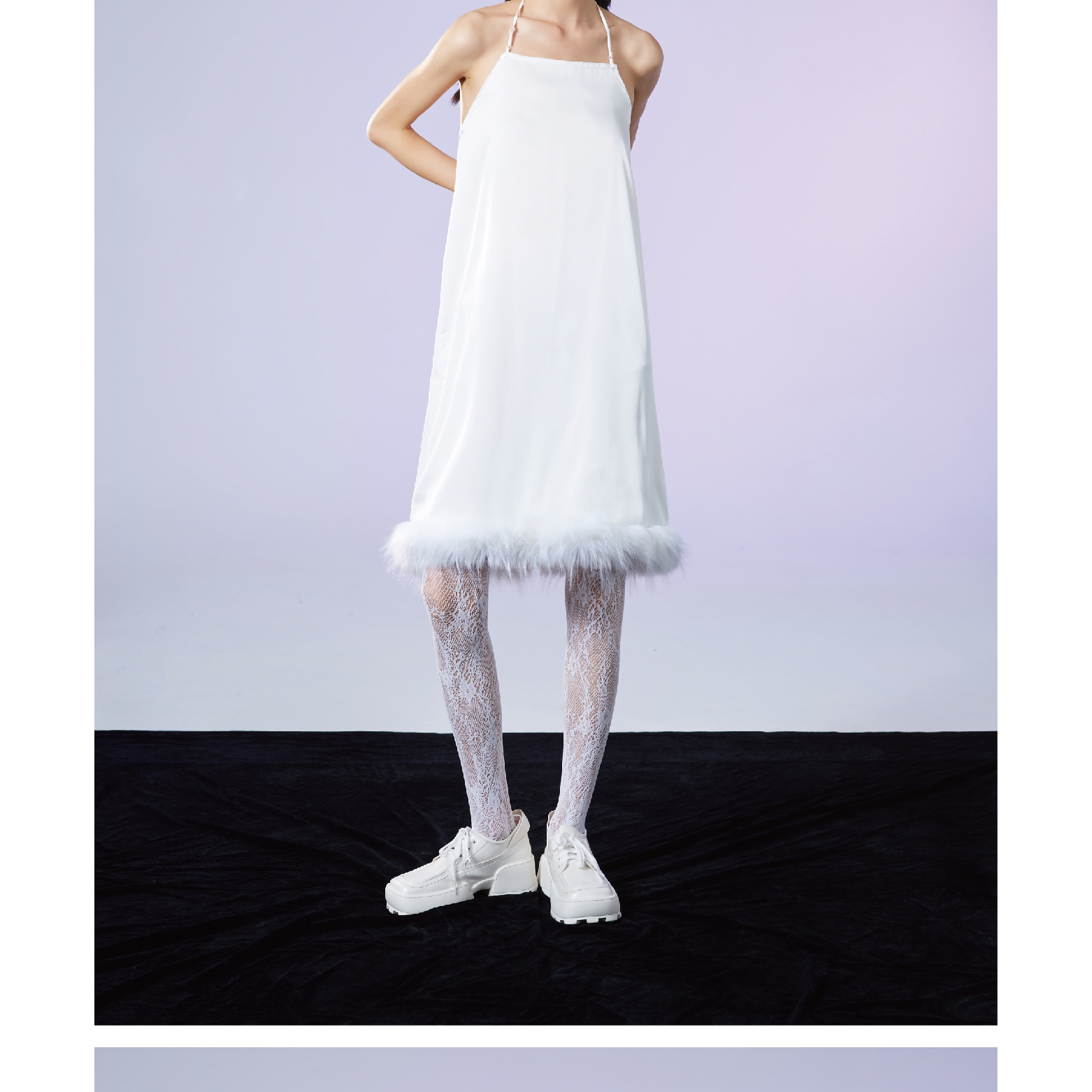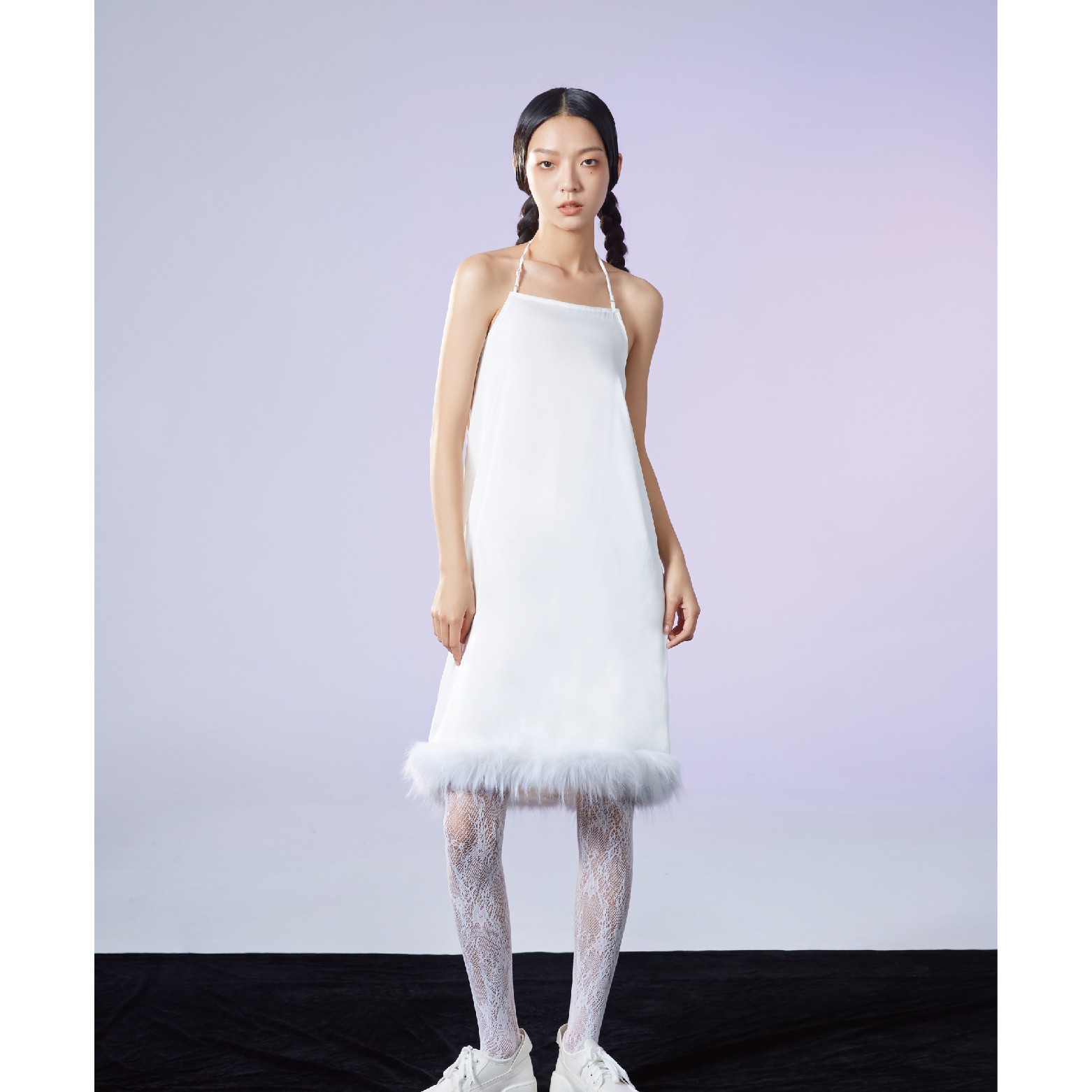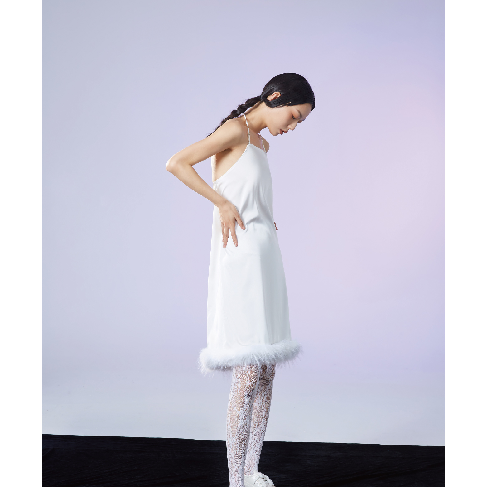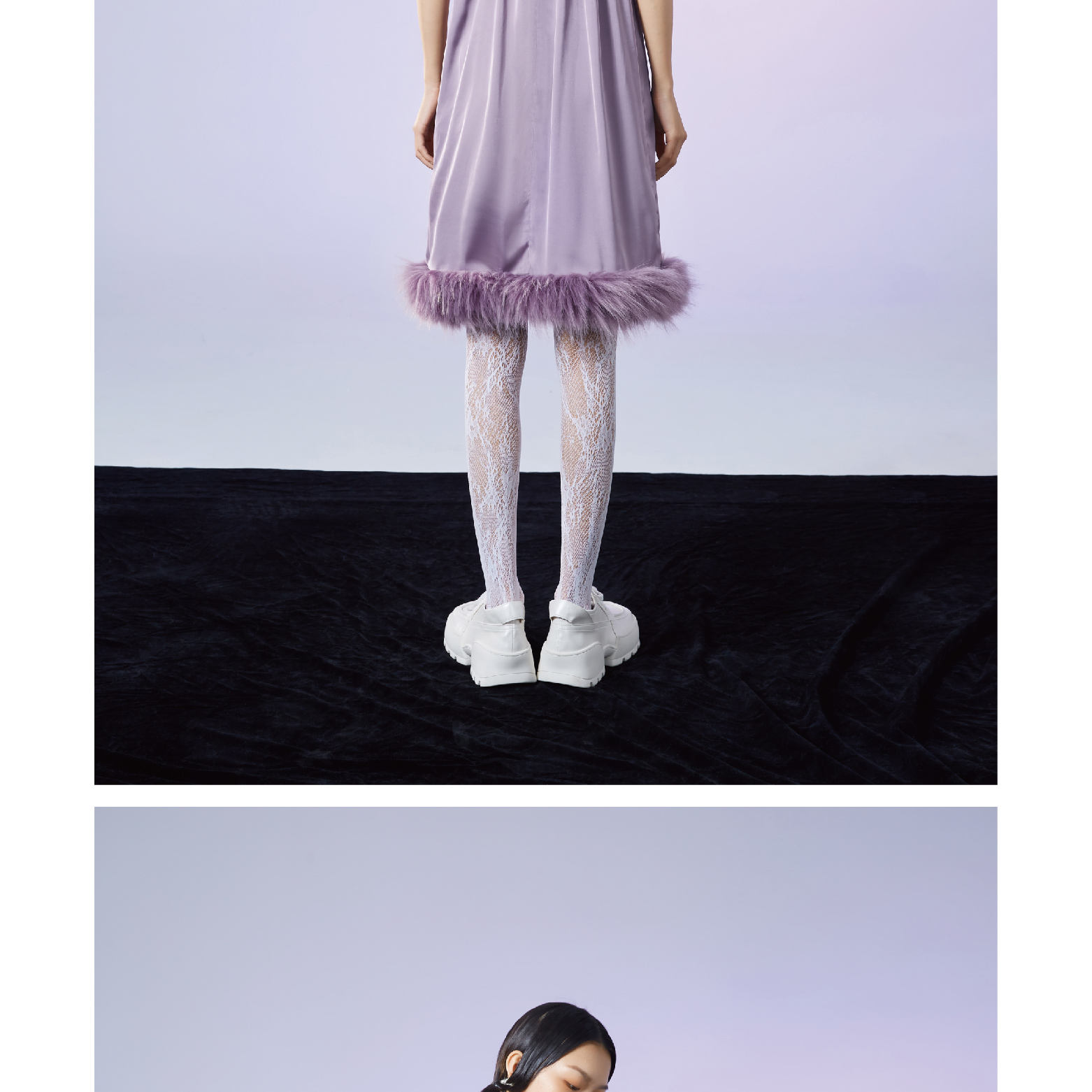 Early Spring Plush Hem Satin Faux Fur Suspender Skirt