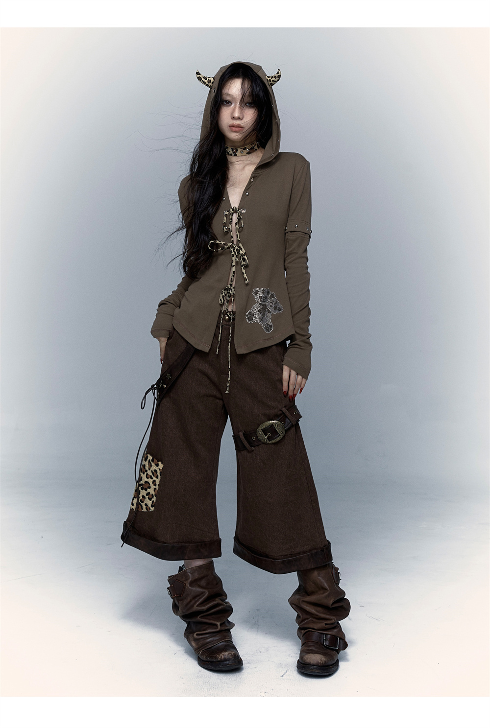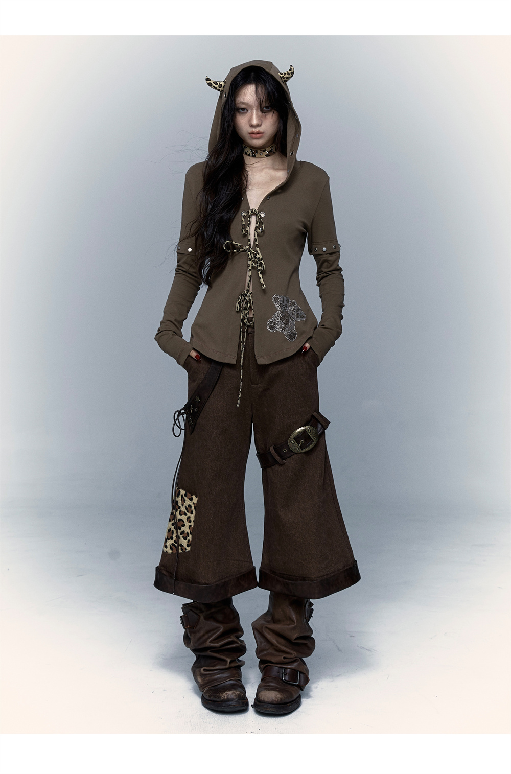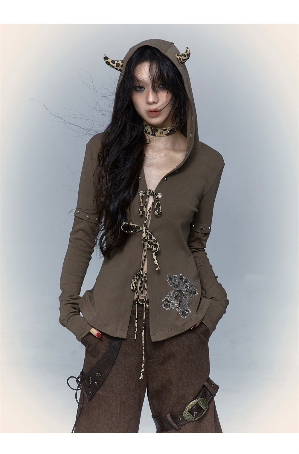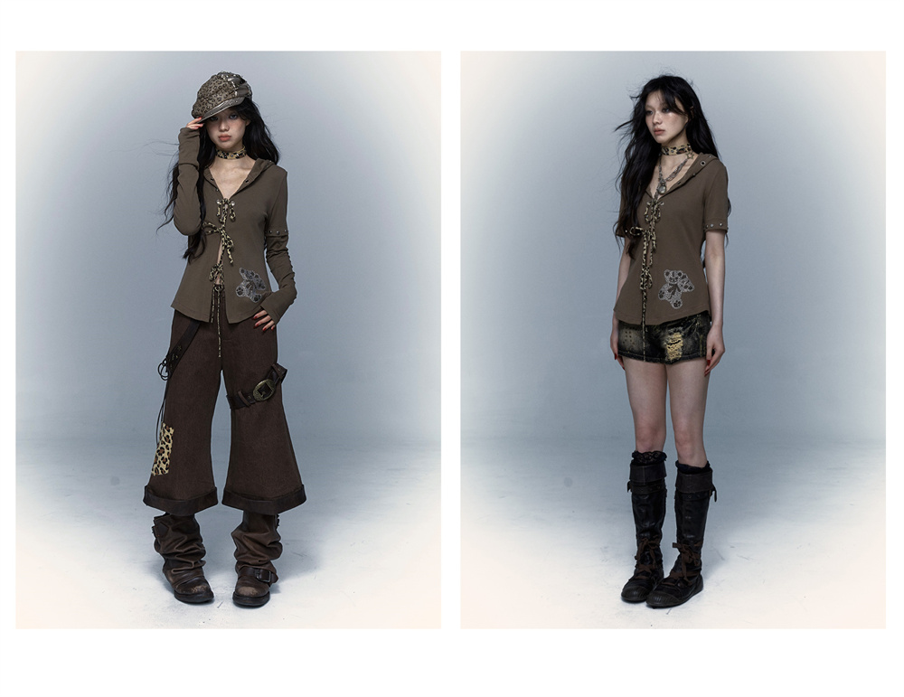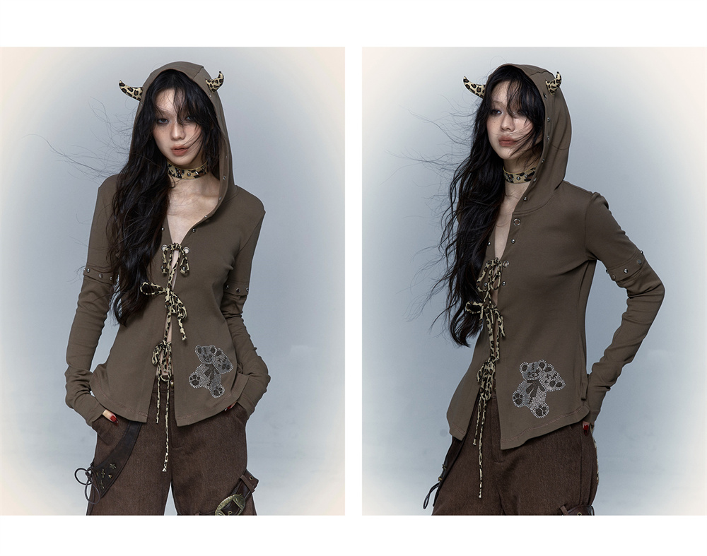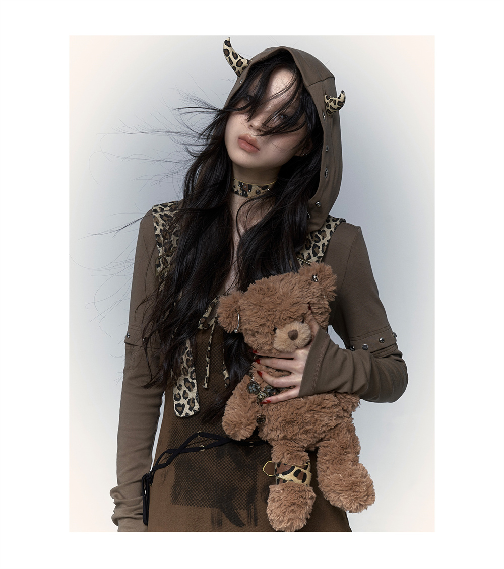 Devil Horn Bear Hoodie | Punk Hot Girl Detachable 롱 슬리브 T-shirt
